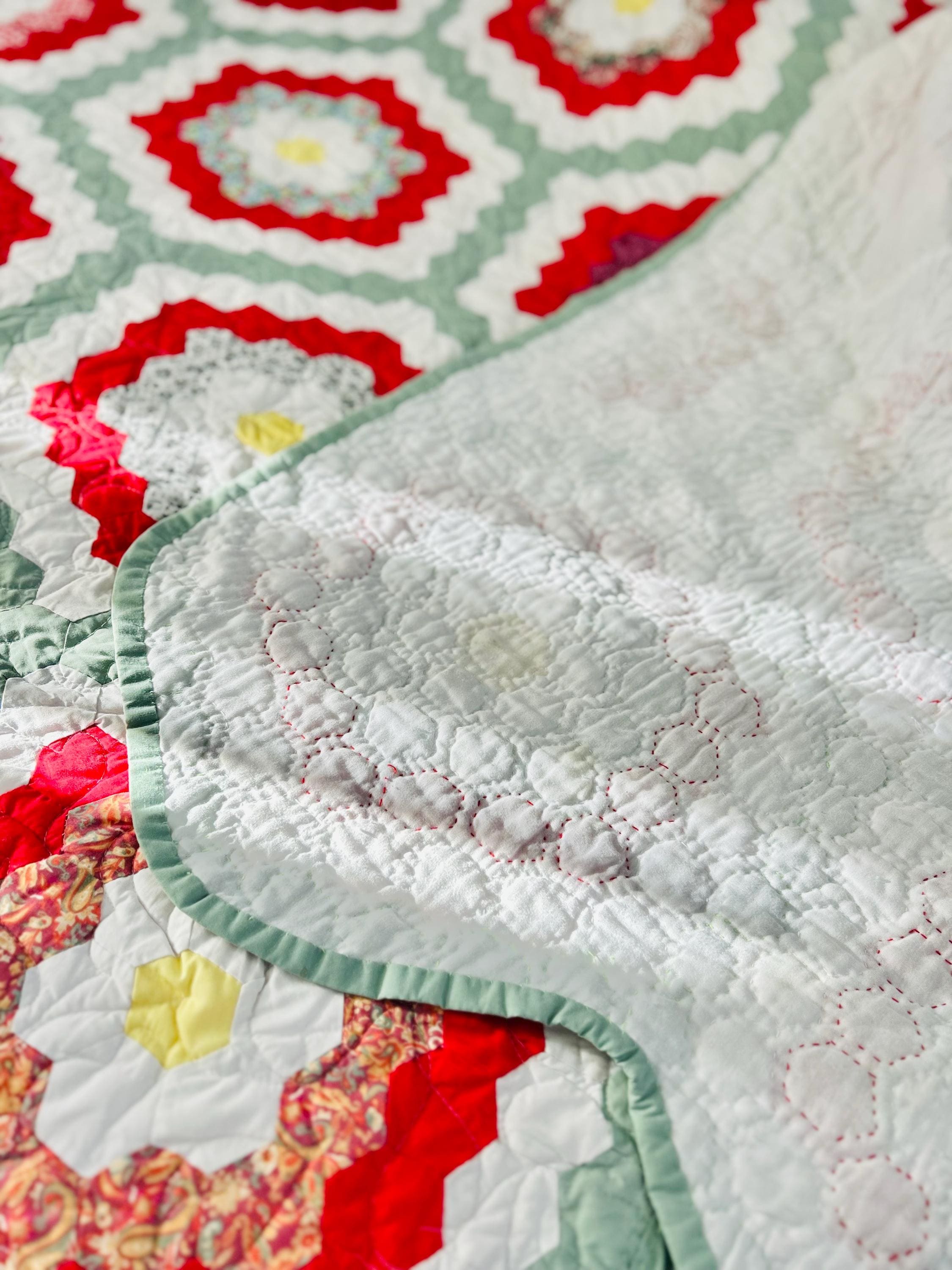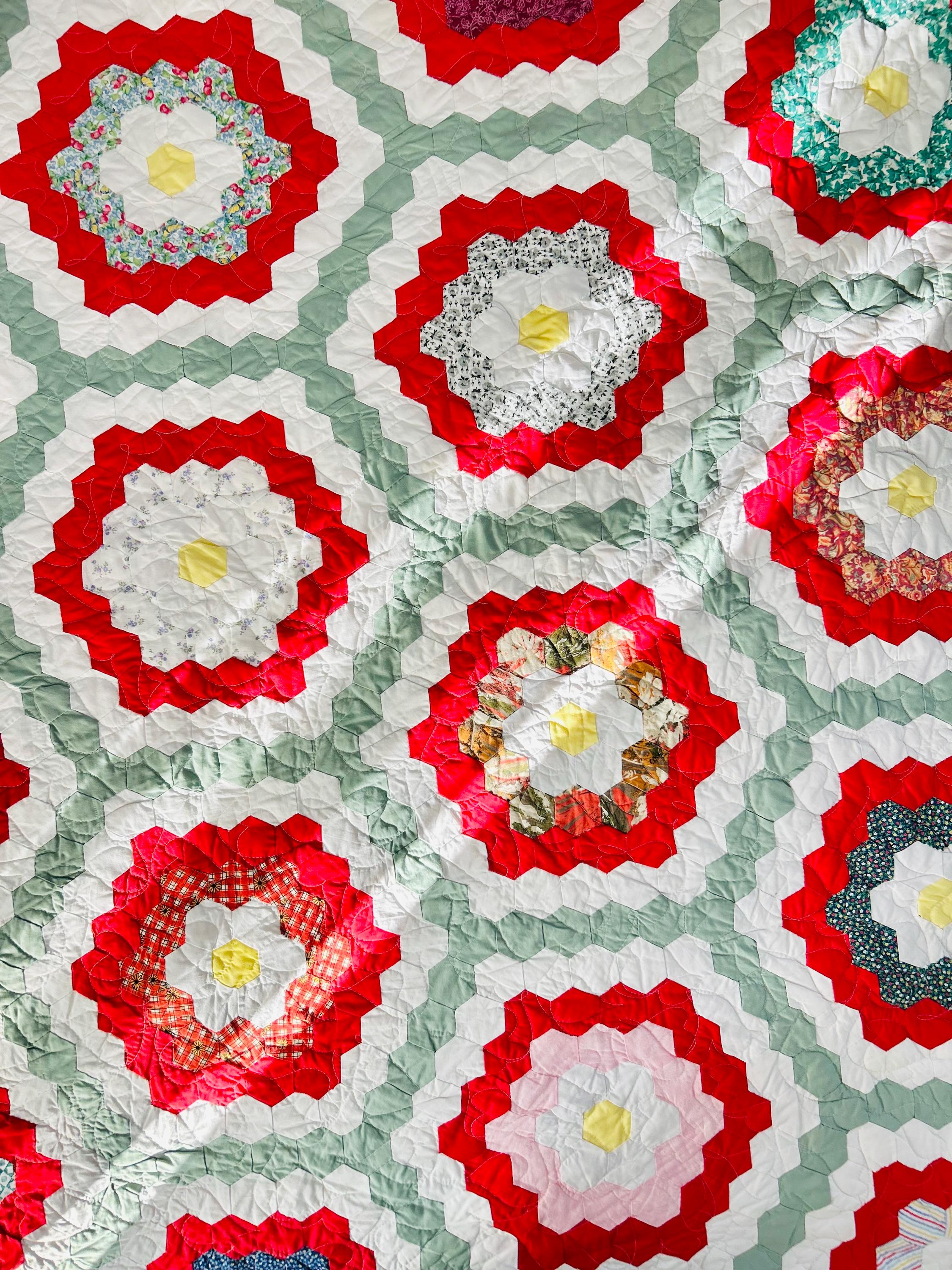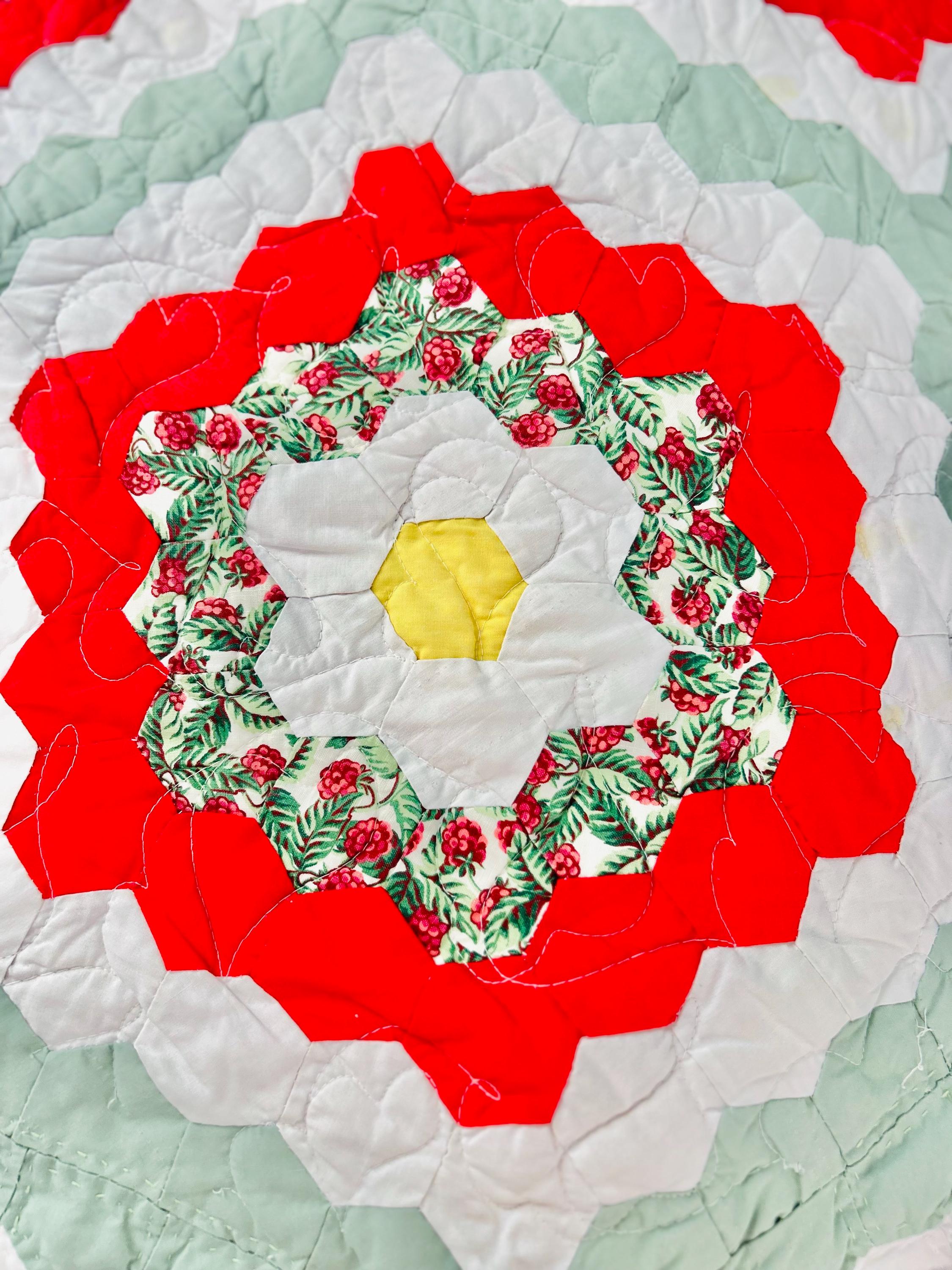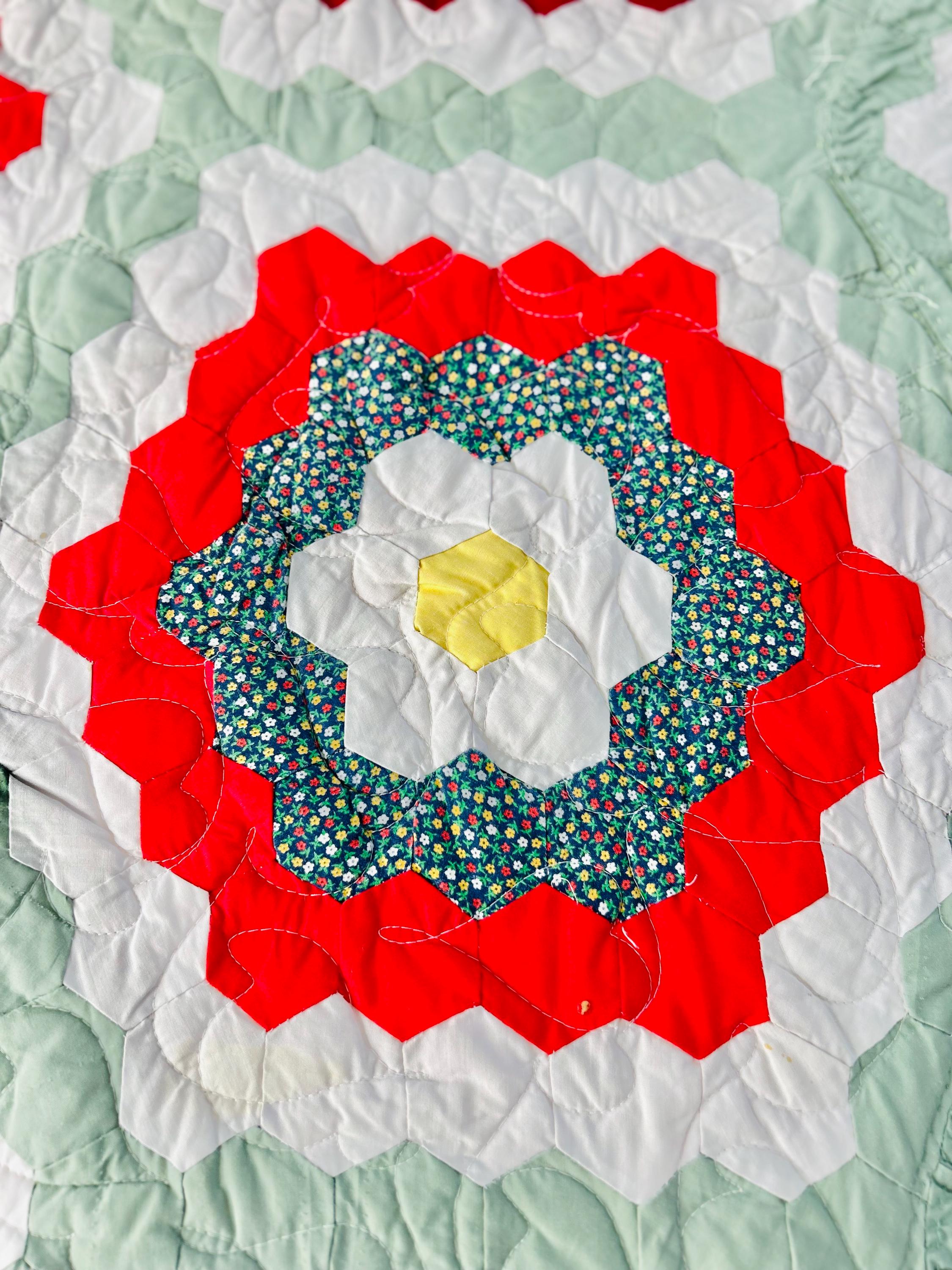 This is a unique and very large Grandmother's Flower Garden Quilt, circa 1940s, with hand-quilting on half and, more recently, long-arm quilting on the remainder. It is made of more than 5,000 2-inch hexagons with half-flower gardens finishing off the top and bottom while the sides follow the jagged lines of the whole flower gardens. The hand-quilting is in outlines of the hexagons, while the long-arm quilting is in curlicues.
