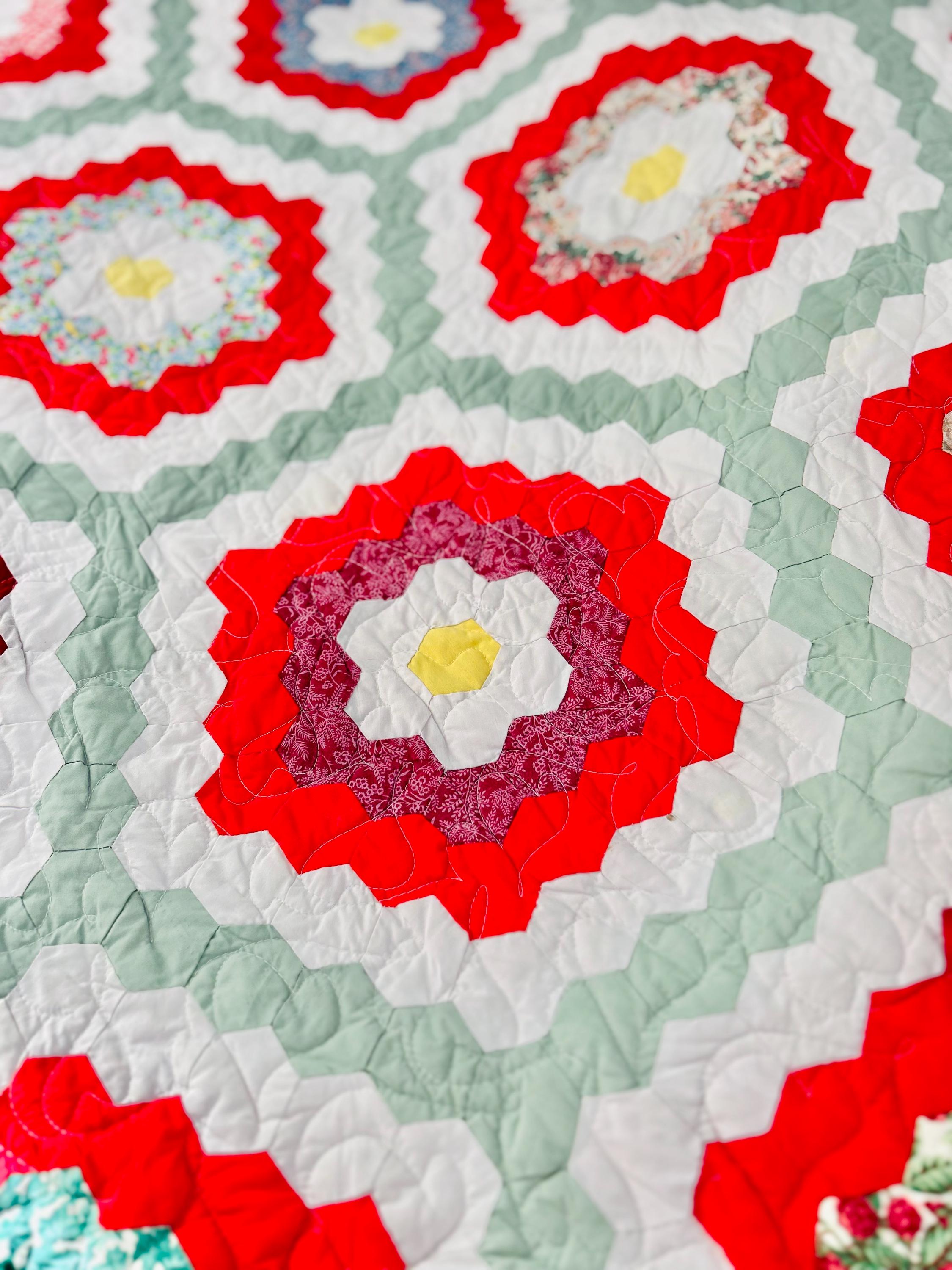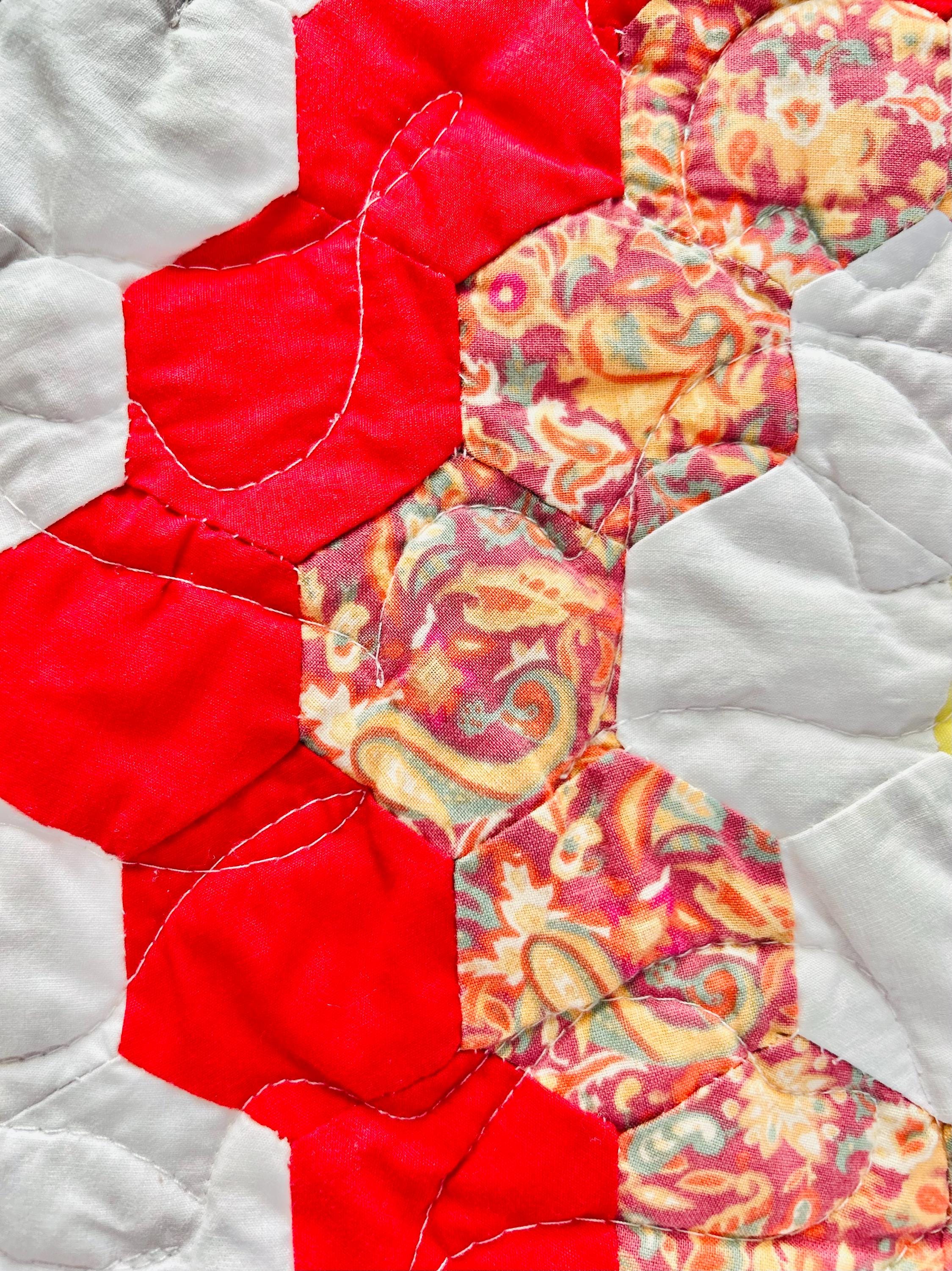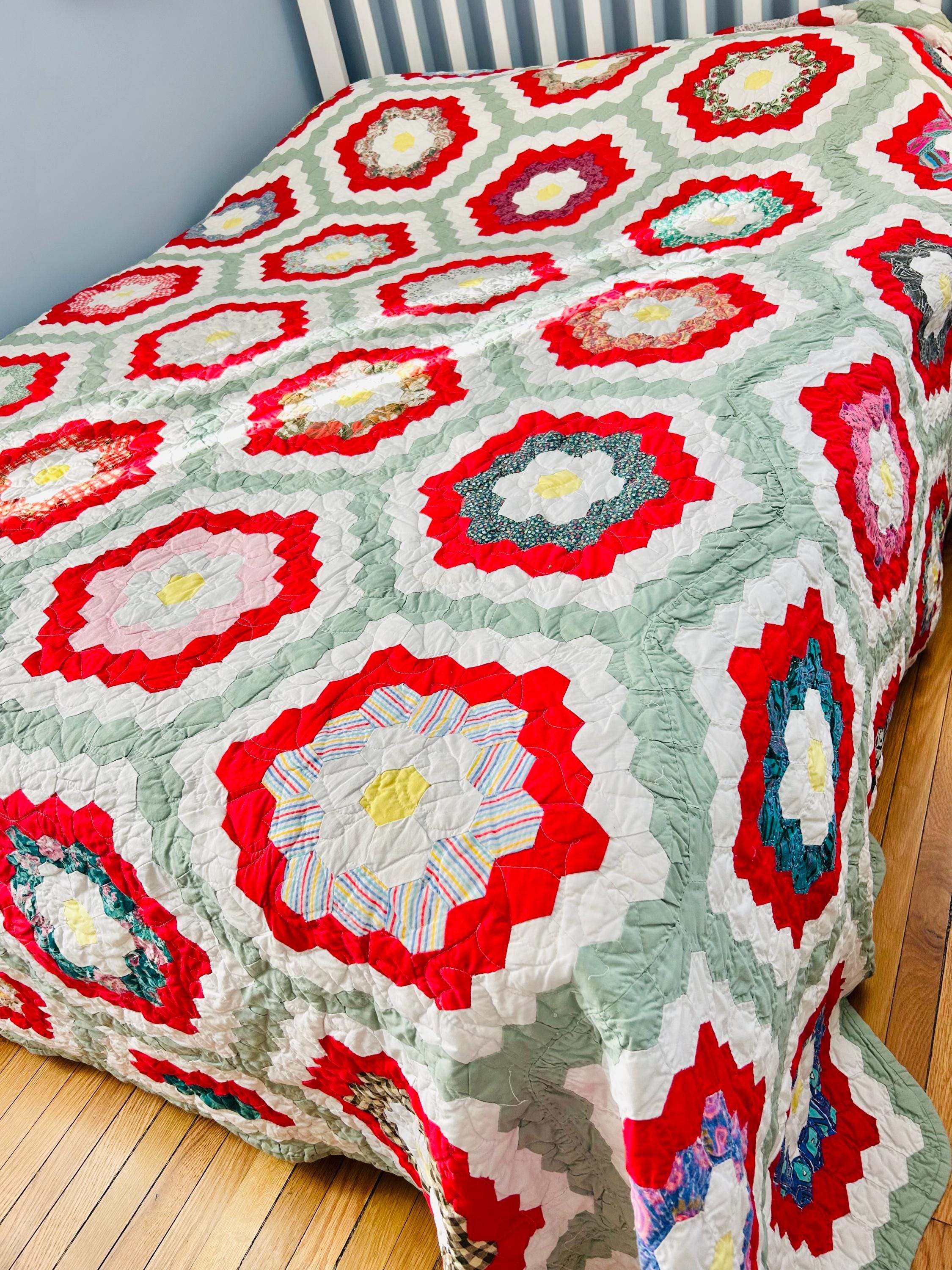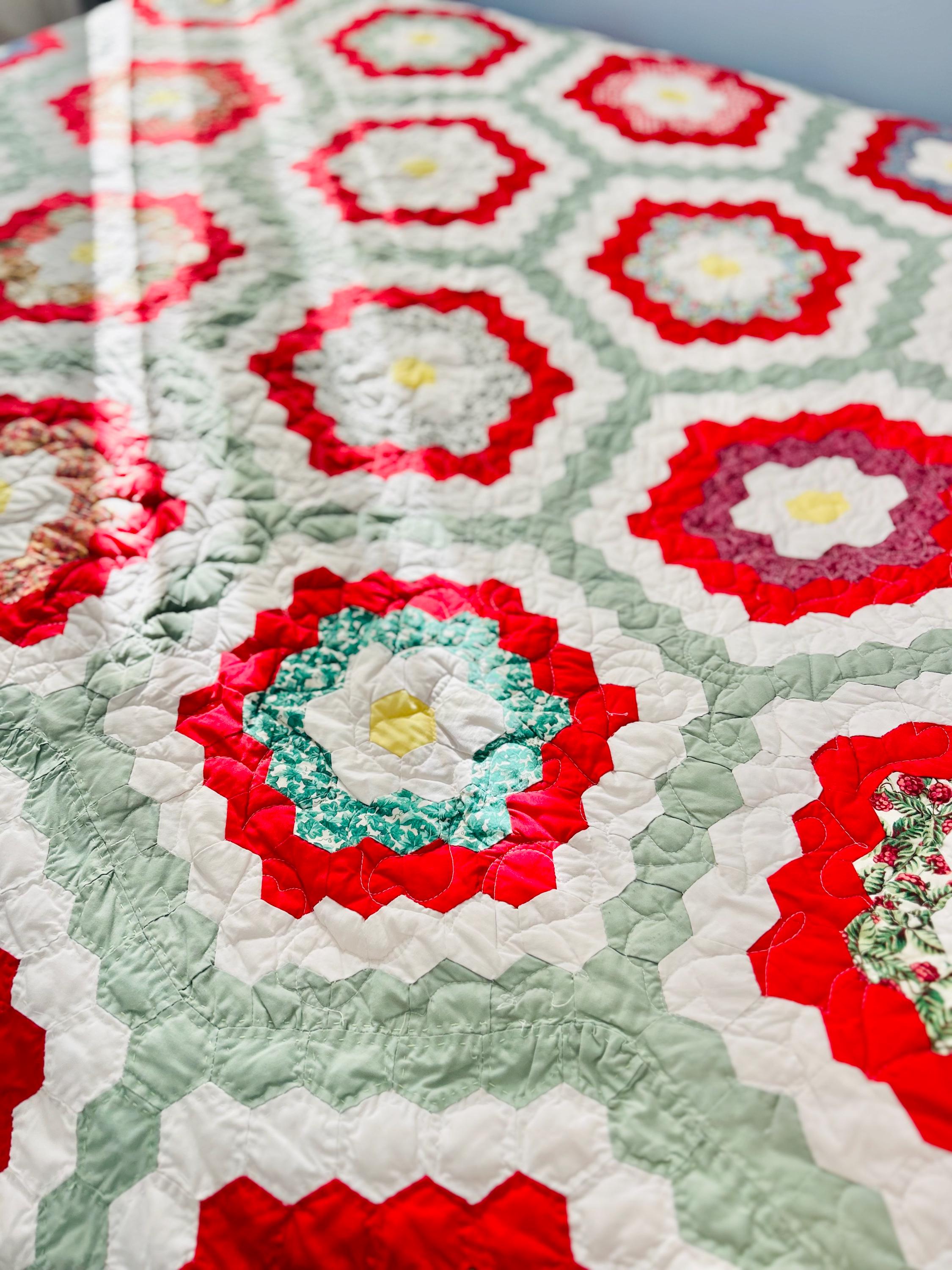This is a unique and very large Grandmother's Flower Garden Quilt, circa 1940s, with hand-quilting on half and, more recently, long-arm quilting on the remainder. It is made of more than 5,000 2-inch hexagons with half-flower gardens finishing off the top and bottom while the sides follow the jagged lines of the whole flower gardens. The hand-quilting is in outlines of the hexagons, while the long-arm quilting is in curlicues.