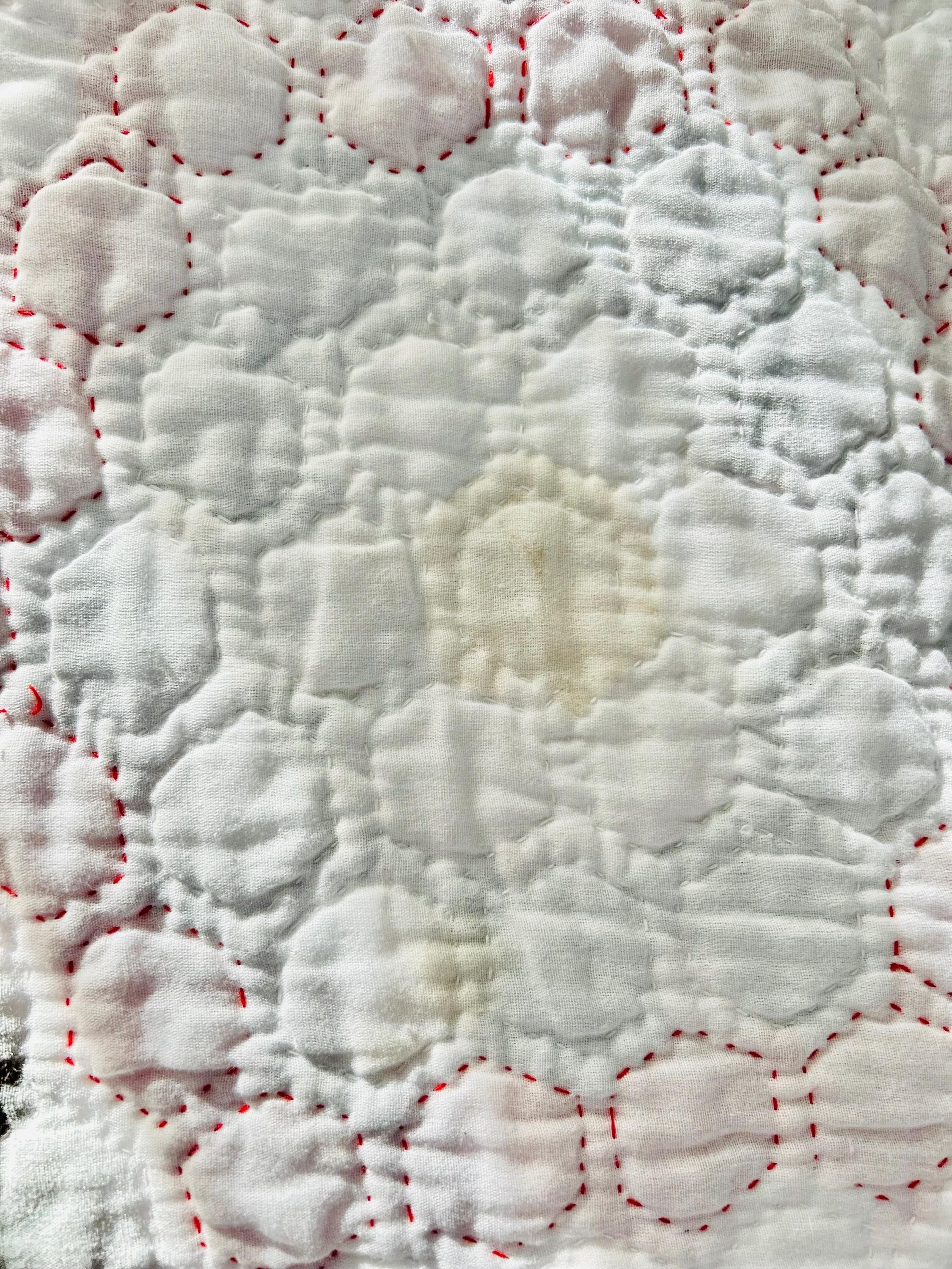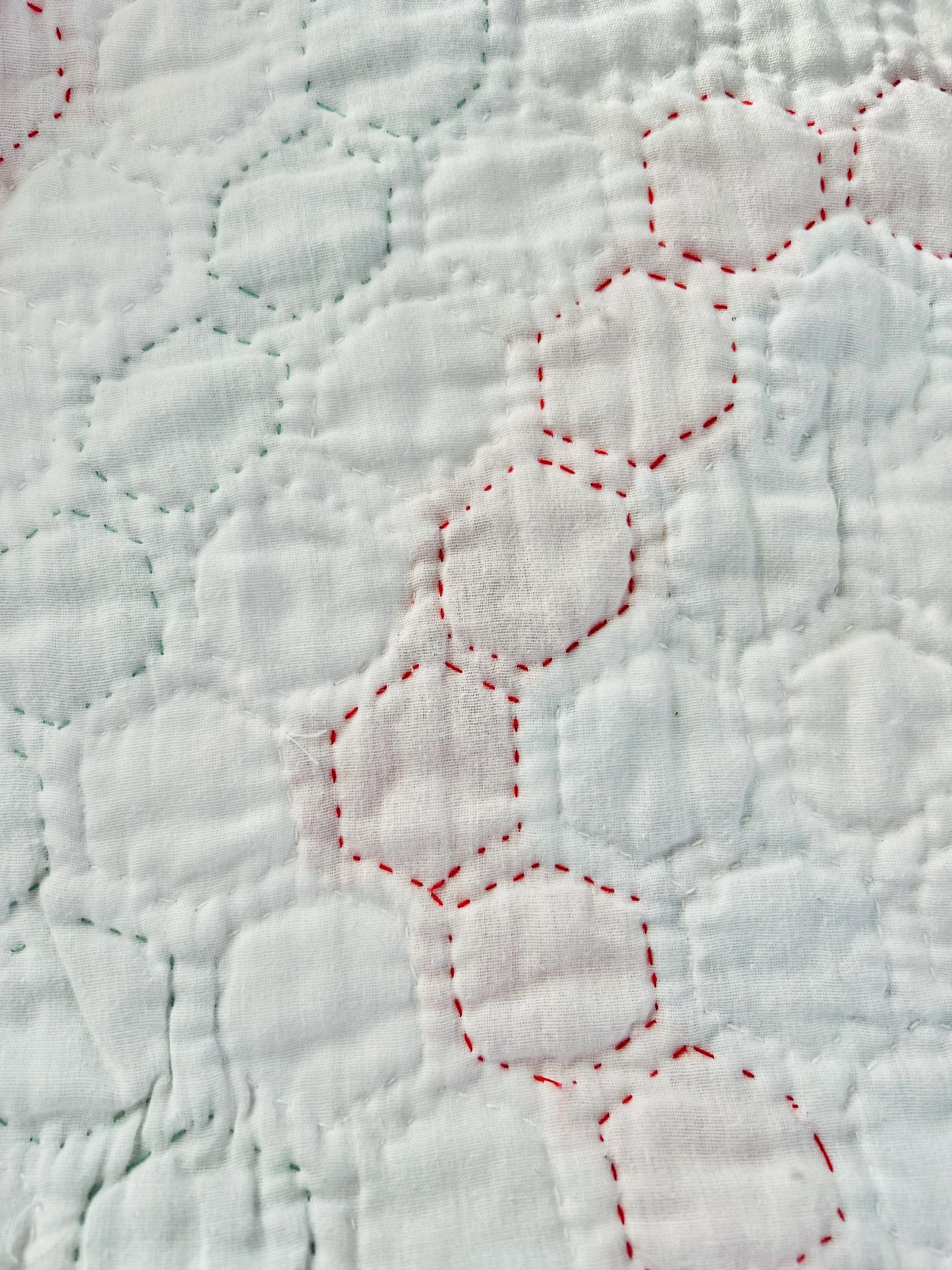 The back is white cotton while the binding is green cotton that has been machine stitched to the front and hand-stitched to the back.