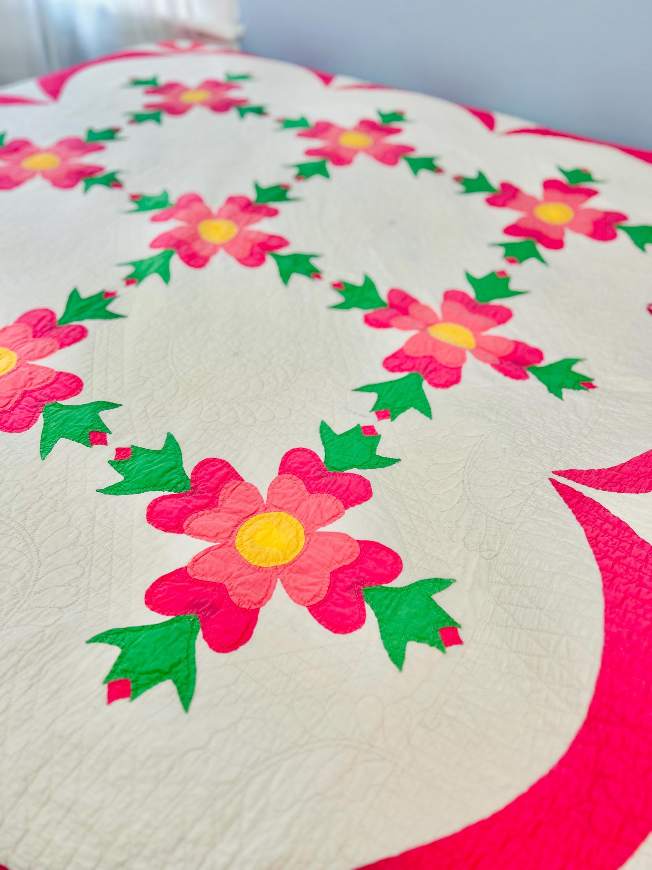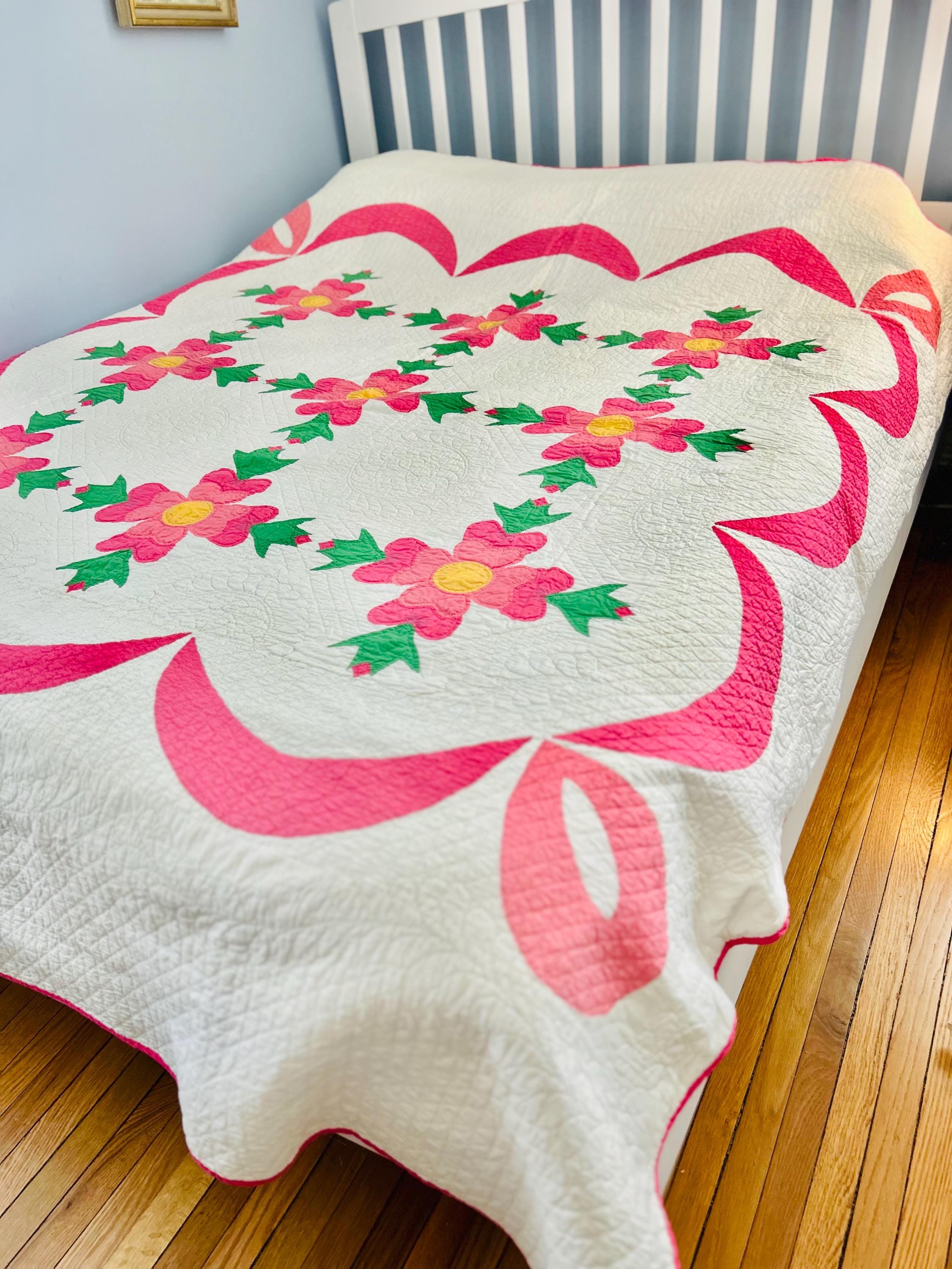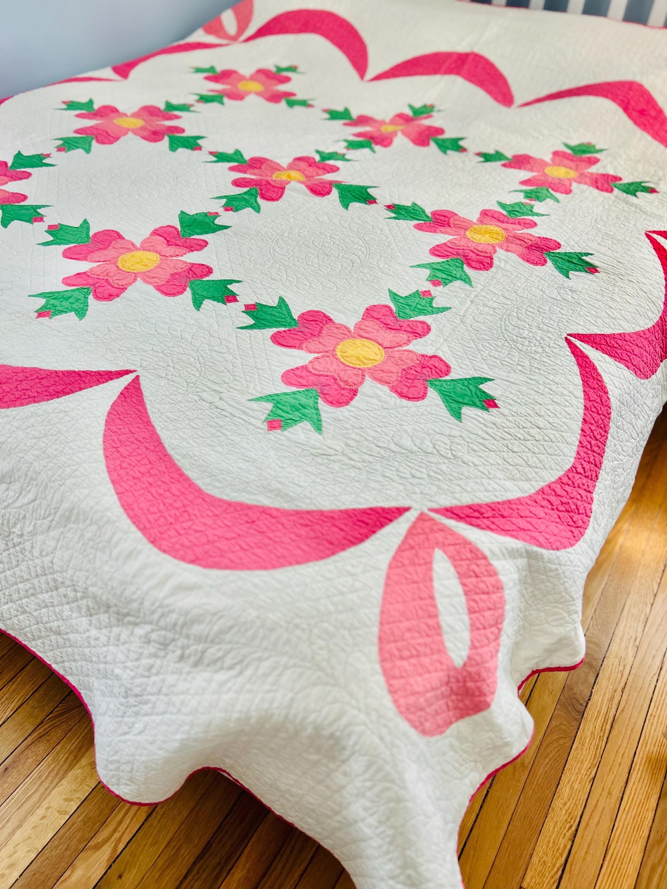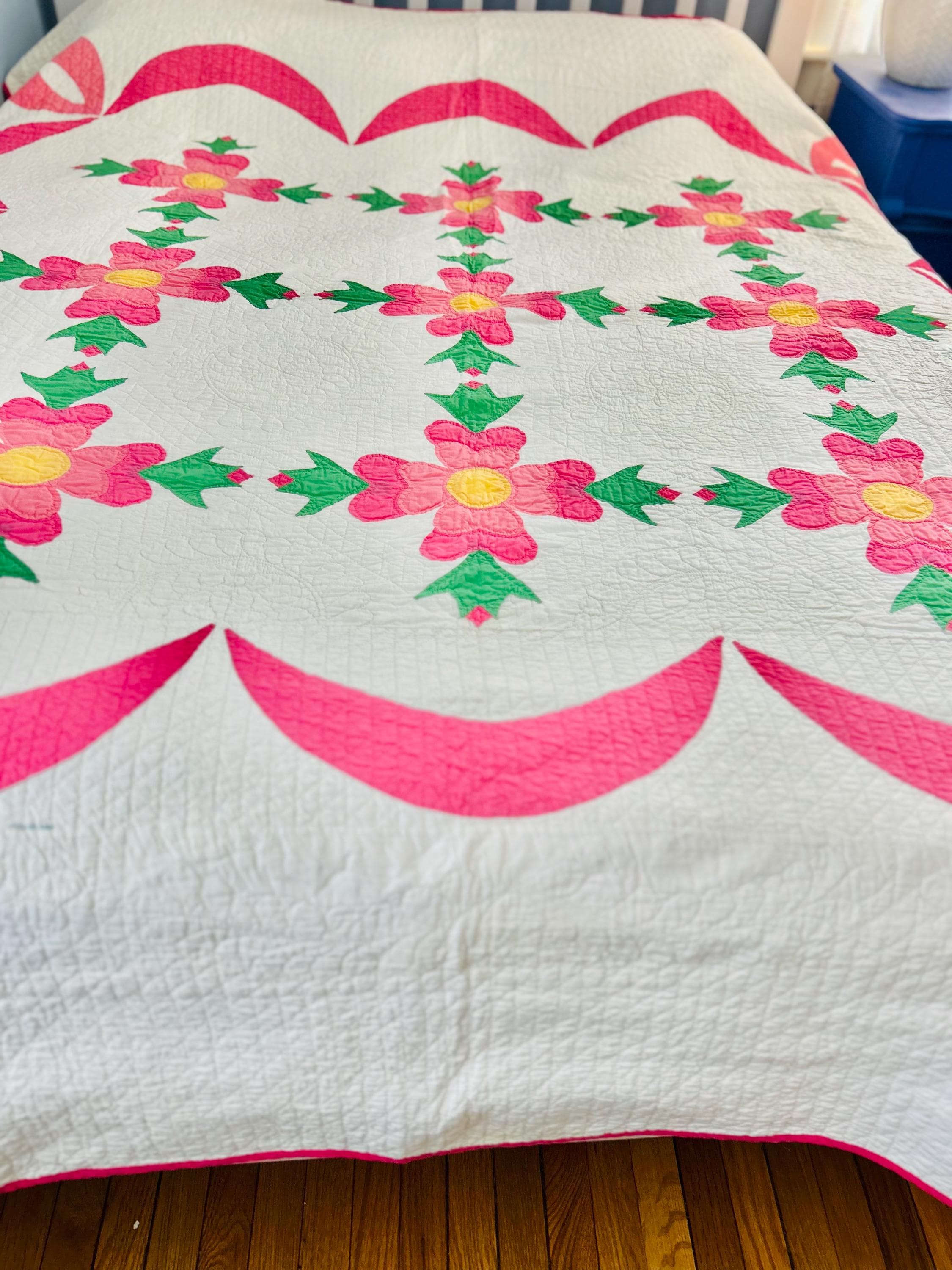 This Conventional Wild Rose Quilt with serpentine border is dated 1930 (see photos) and has been exquisitely hand-quilted in feathers, feather wreaths, diagonals and very tiny diamond patterns.