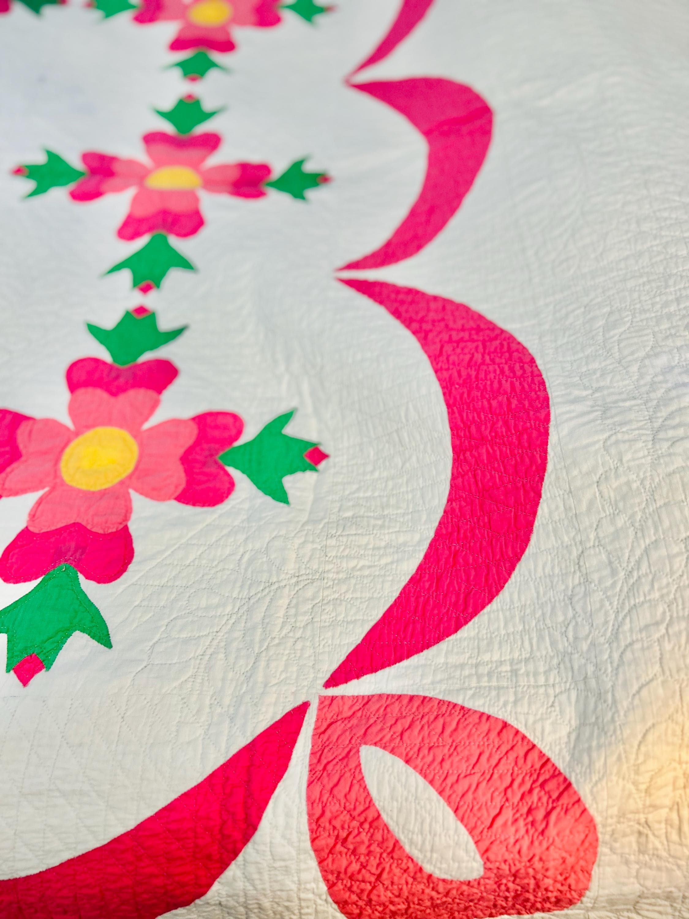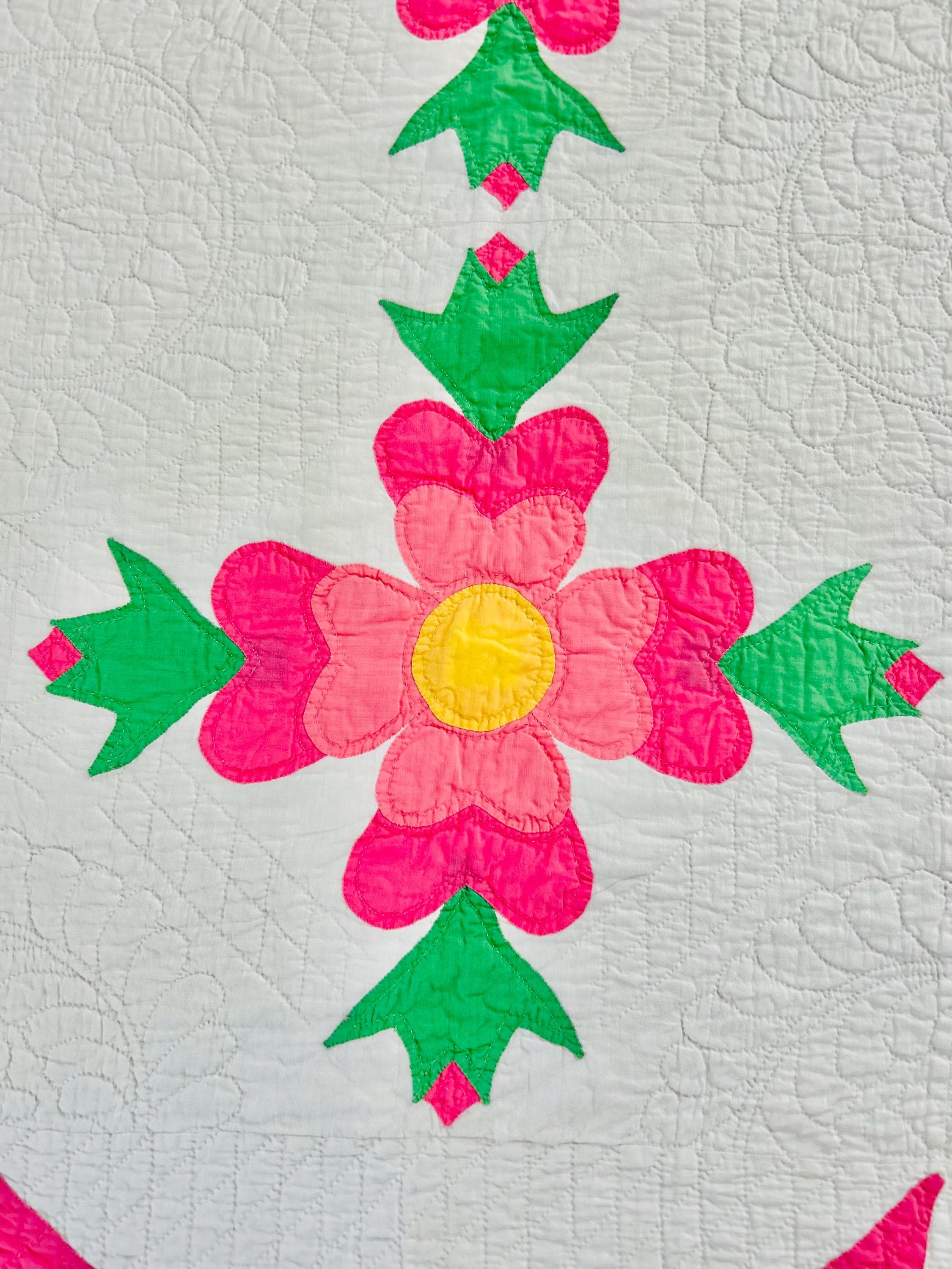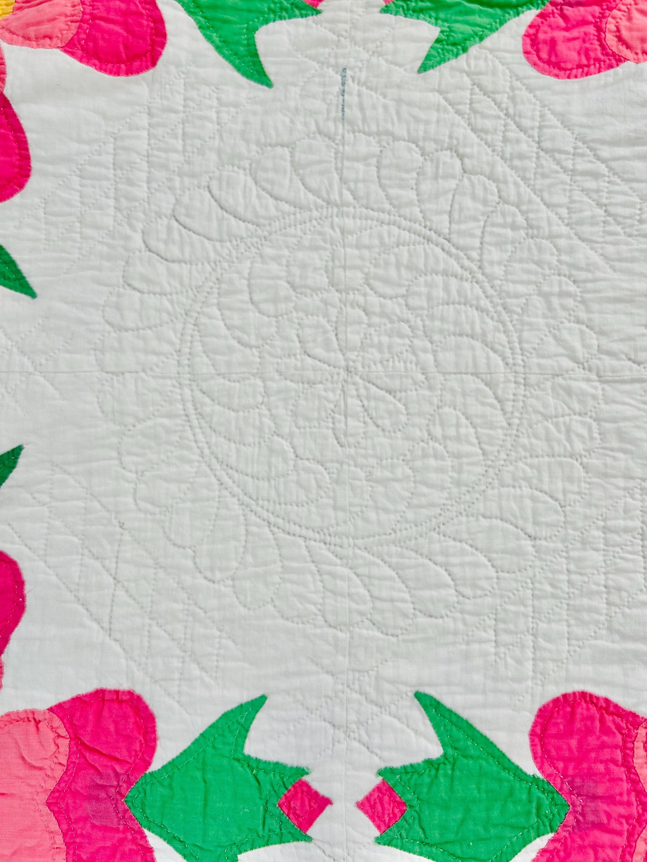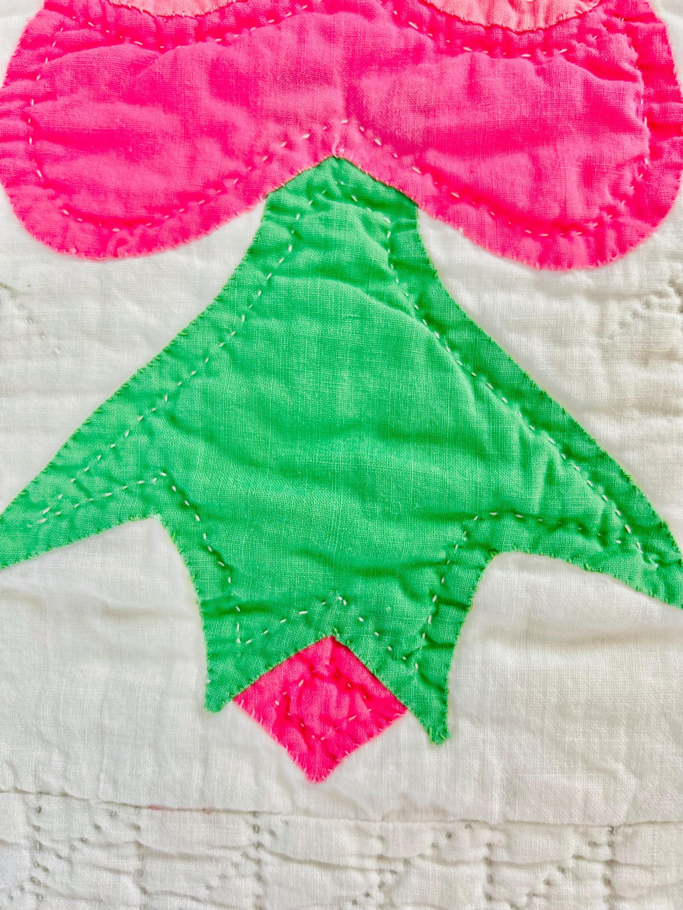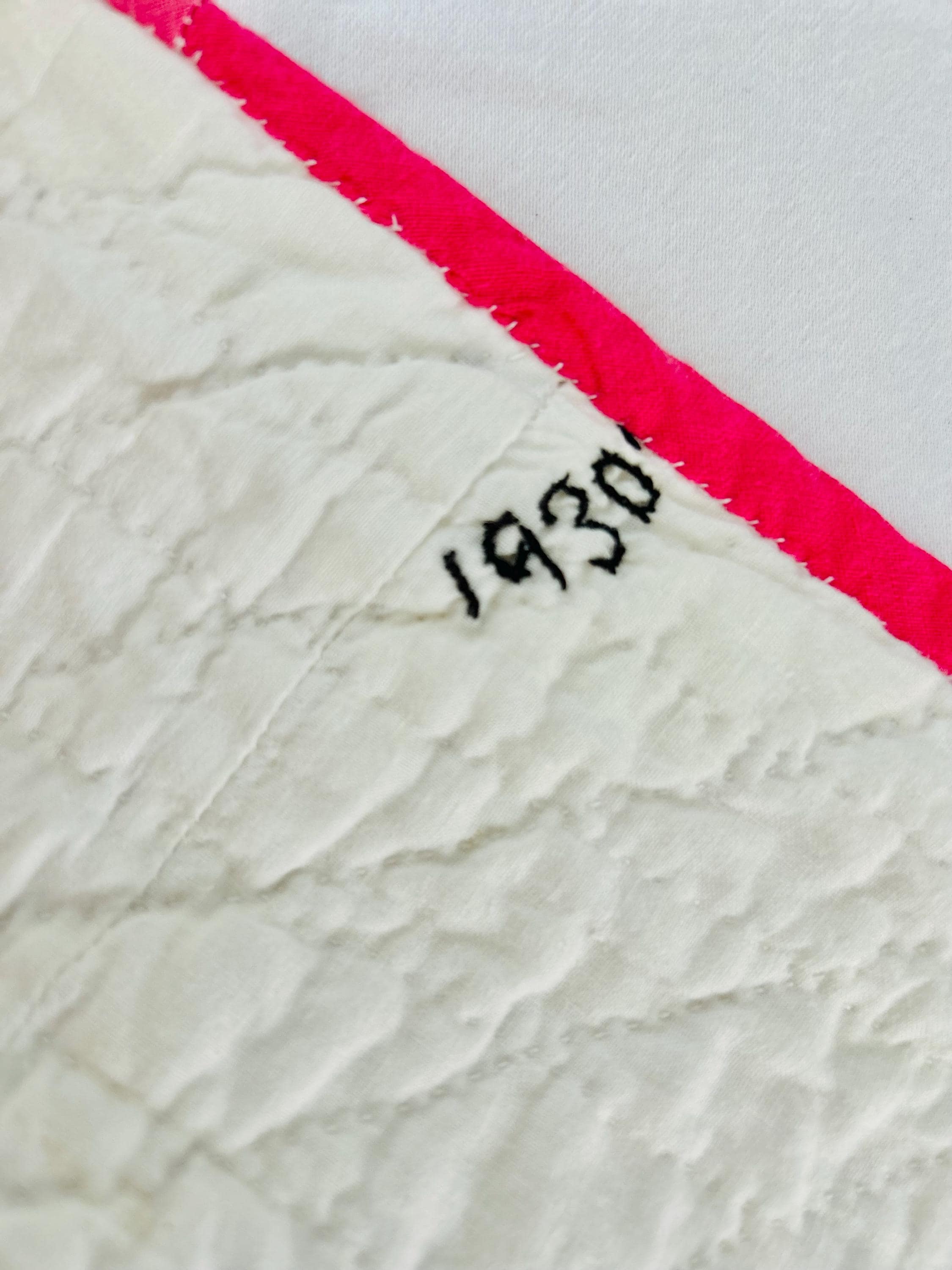 The back is white cotton while the binding is a bright pink cotton that has been machine stitched to the front and hand-stitched in very tiny stitches to the back. The cotton batting is lightweight.