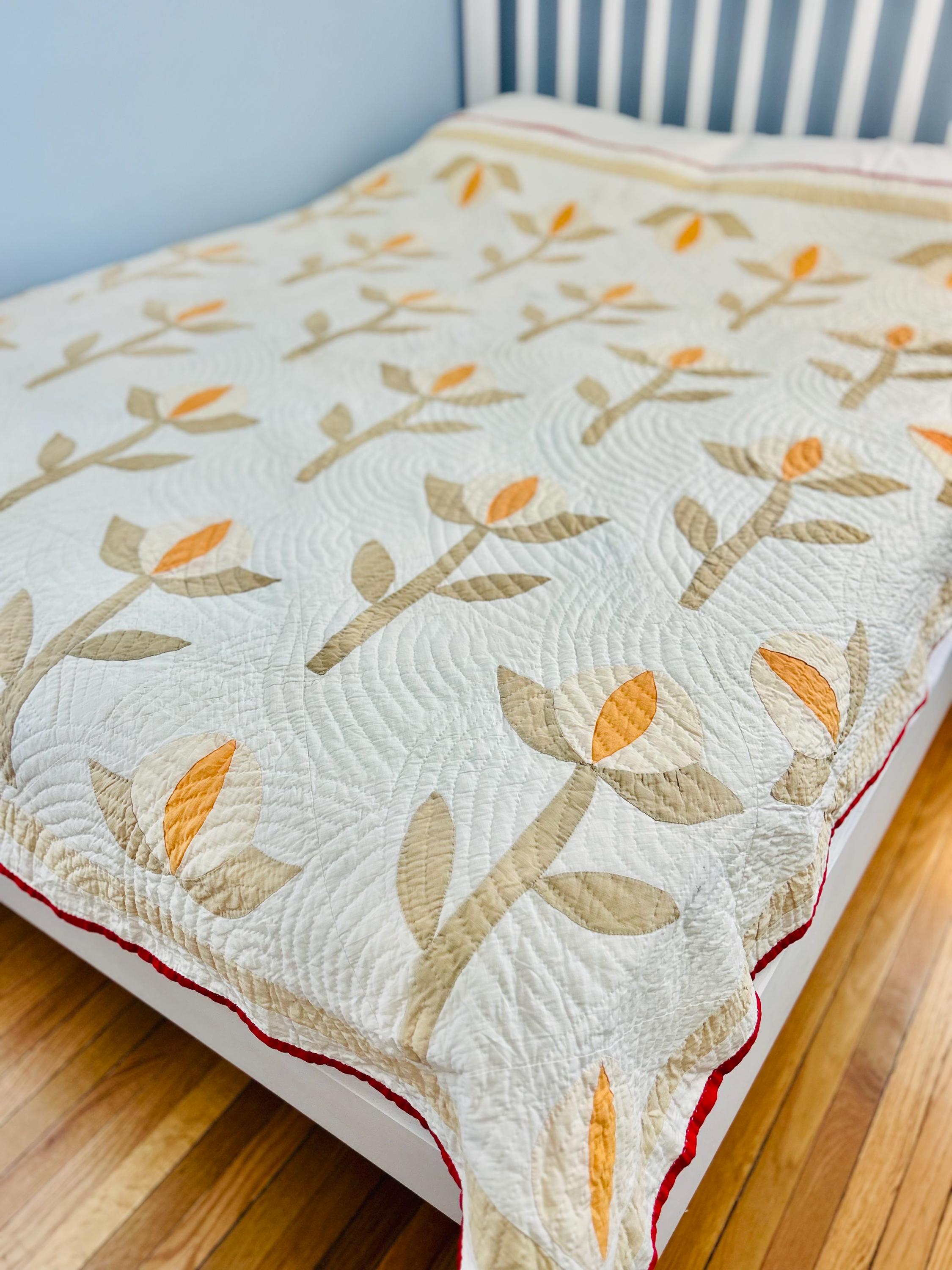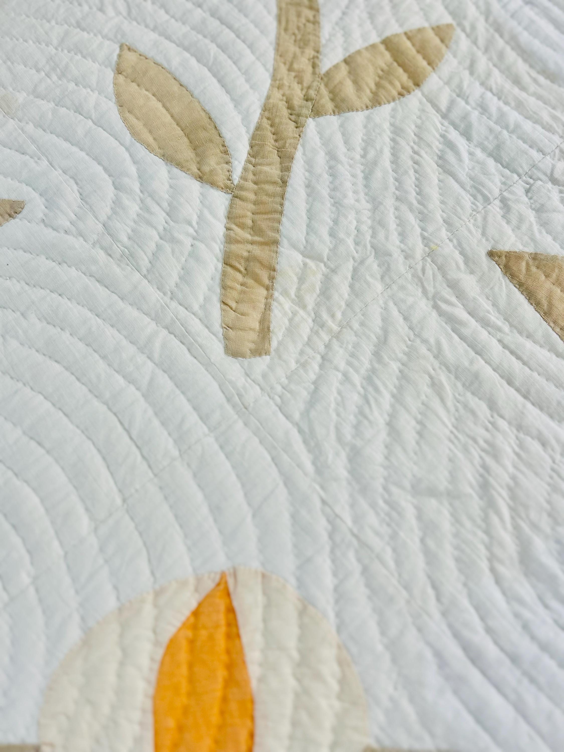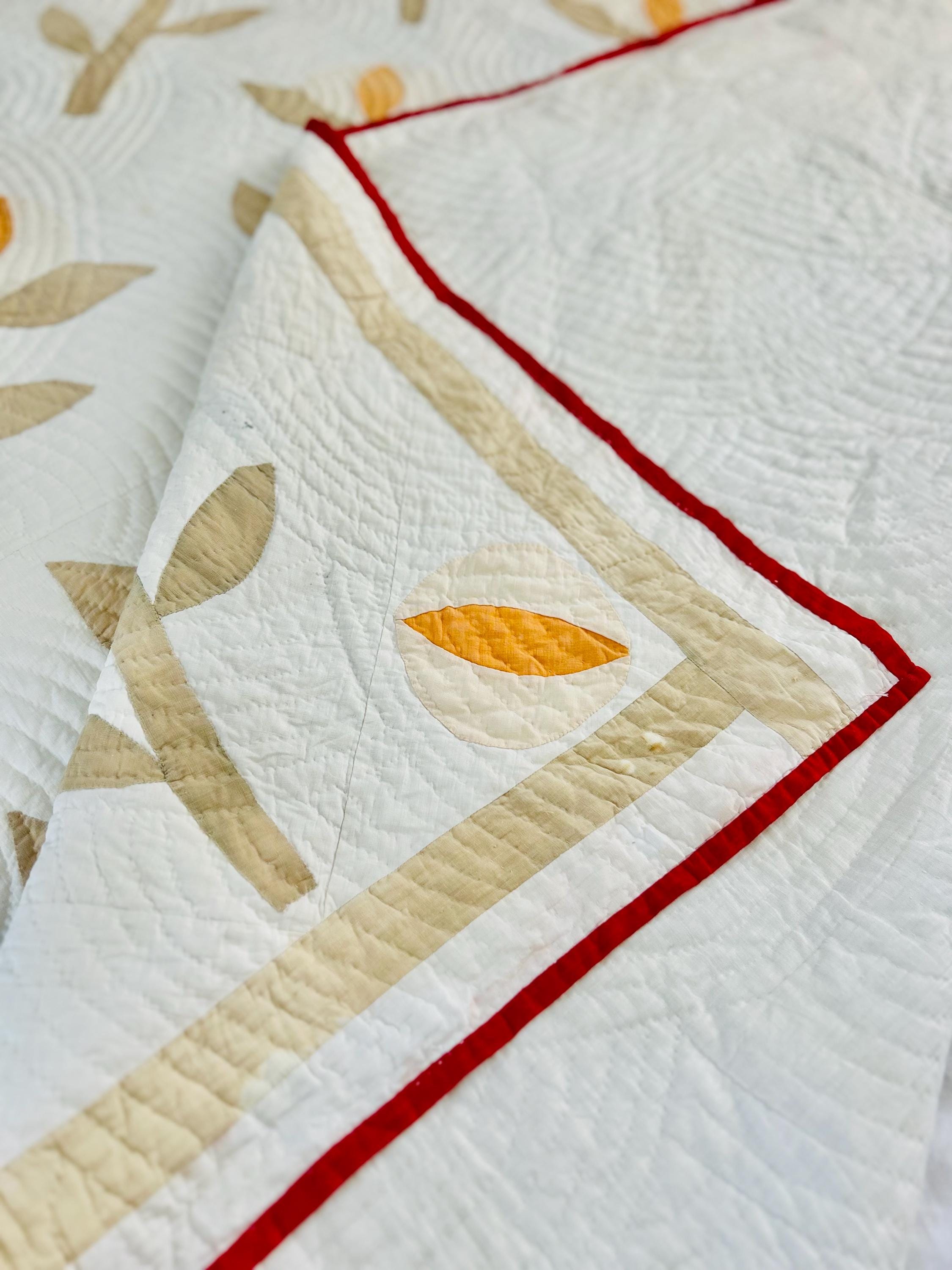 This Love Apple Antique Quilt is very rare pattern, circa 1870s-1890, that has been hand-pieced, hand-appliqued and hand-quilted. The hand-stitching, especially in the applique work, is impossibly tiny, while the quilting is very precise and in a shell pattern throughout the quilt. There is a four-sided tan and white striped border that is also quilted in a shell pattern.