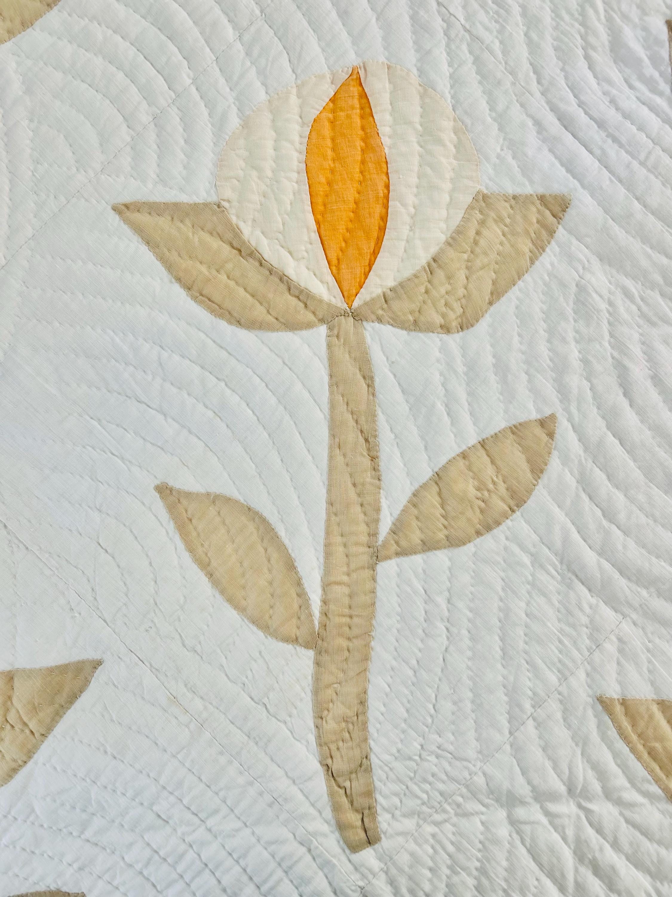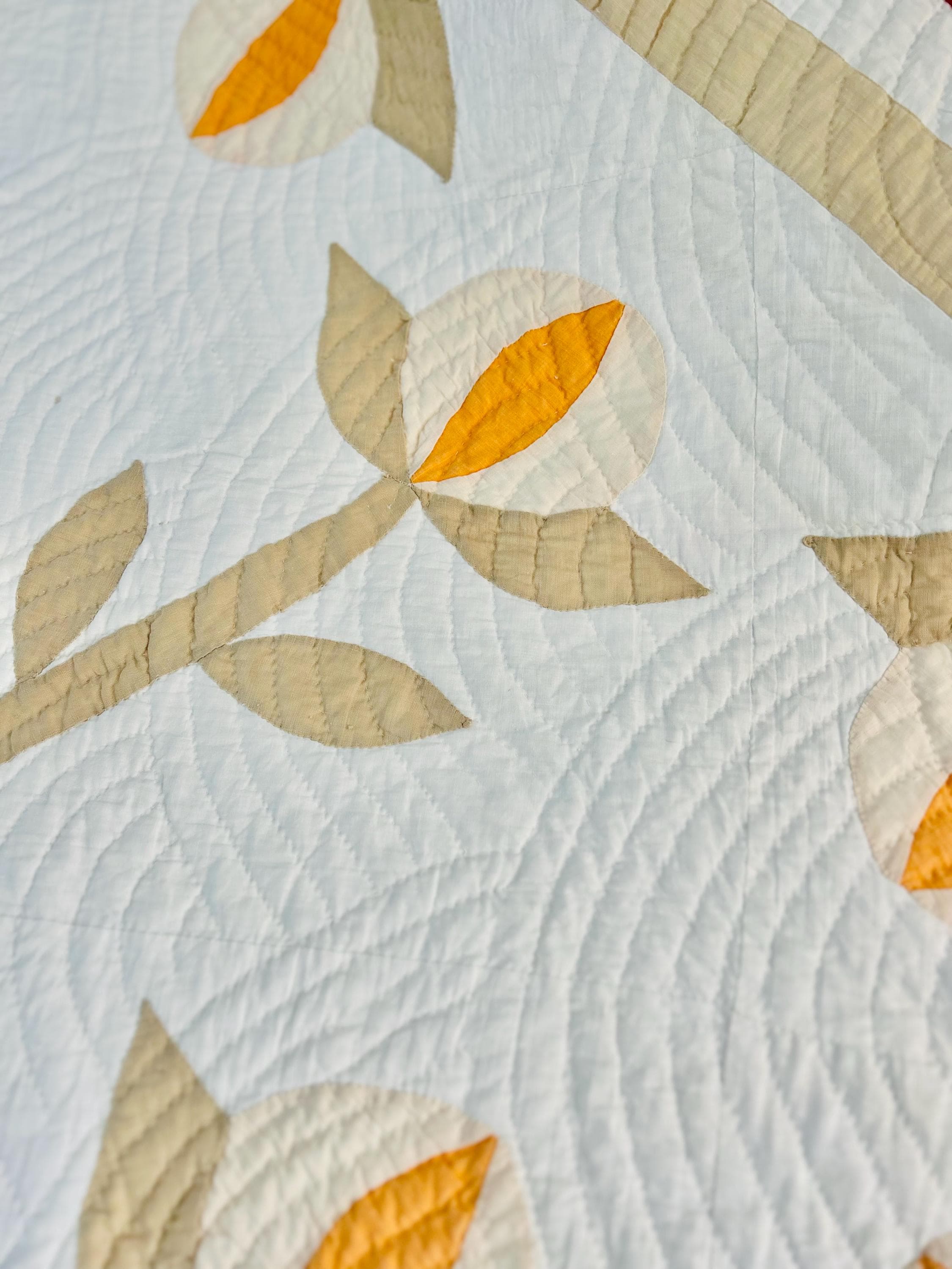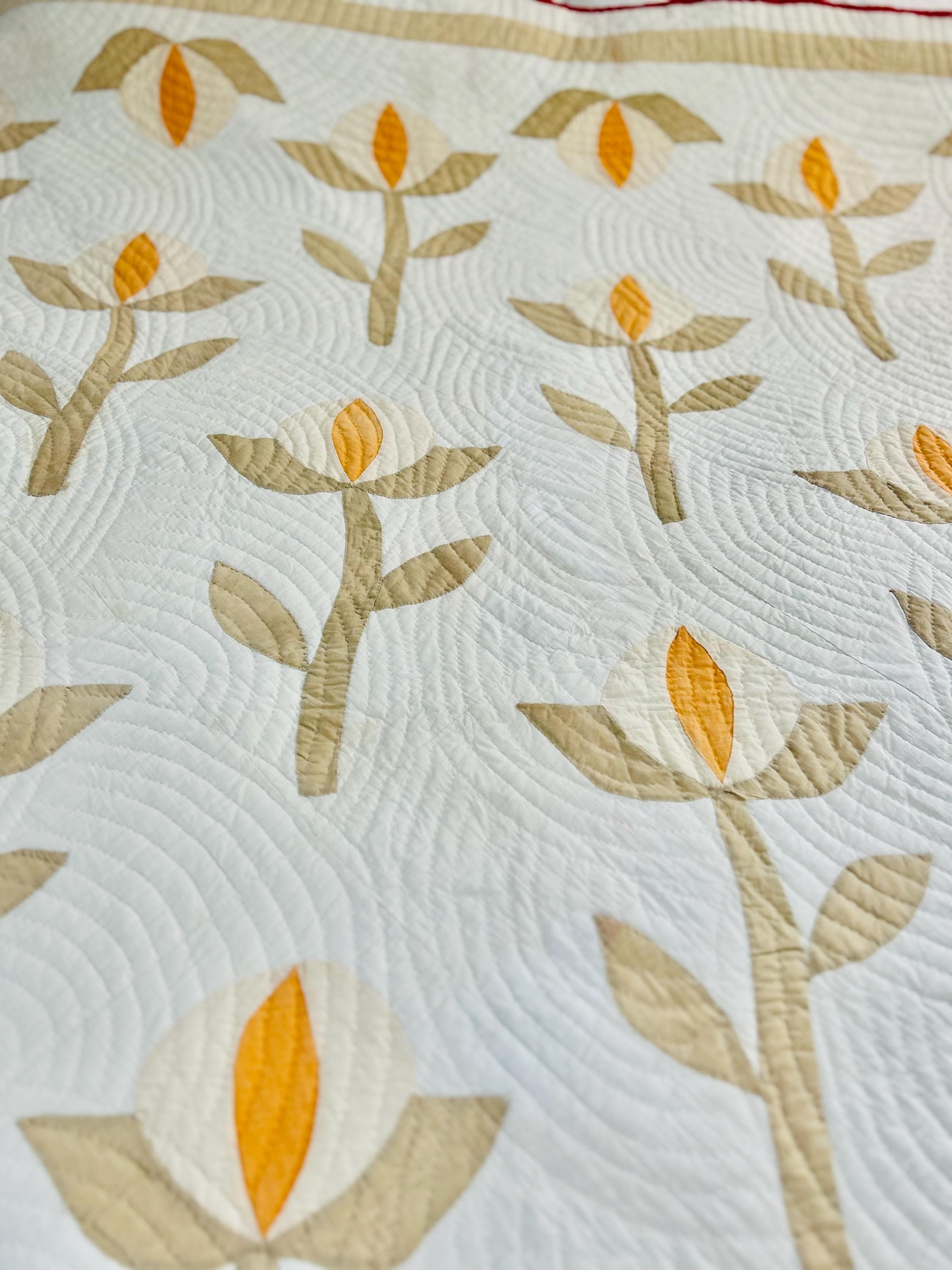This Love Apple Antique Quilt is very rare pattern, circa 1870s-1890, that has been hand-pieced, hand-appliqued and hand-quilted. The hand-stitching, especially in the applique work, is impossibly tiny, while the quilting is very precise and in a shell pattern throughout the quilt. There is a four-sided tan and white striped border that is also quilted in a shell pattern.