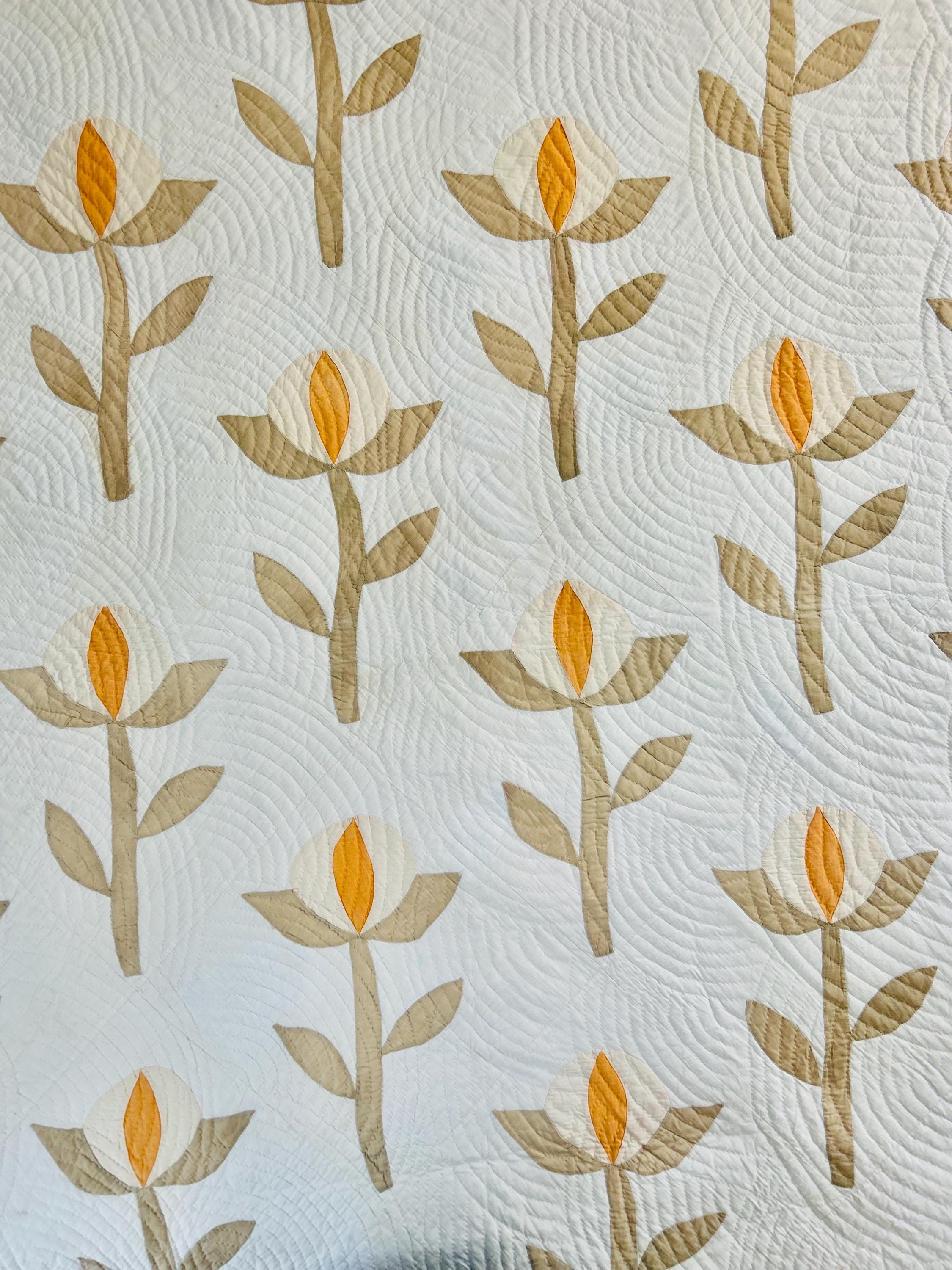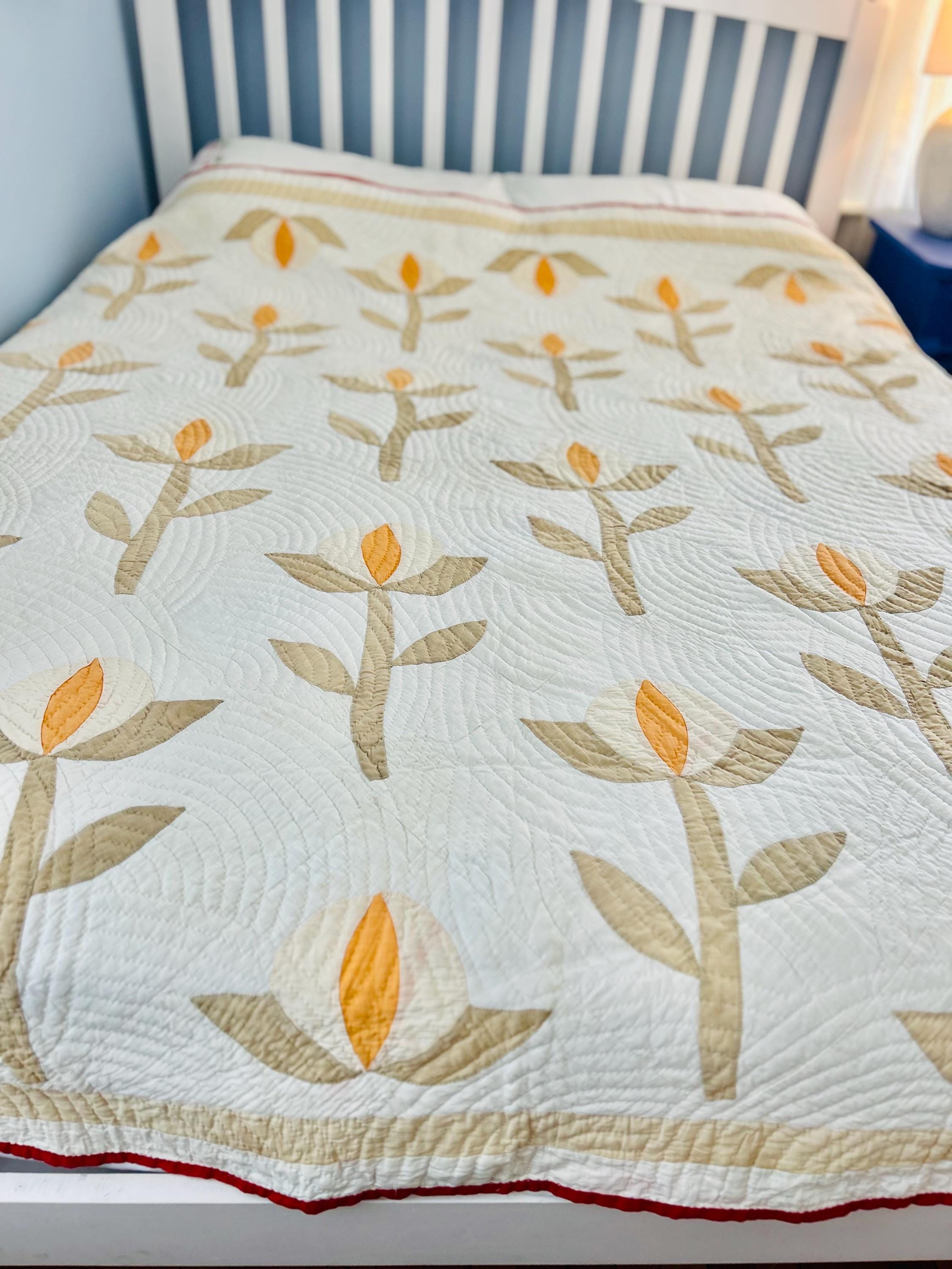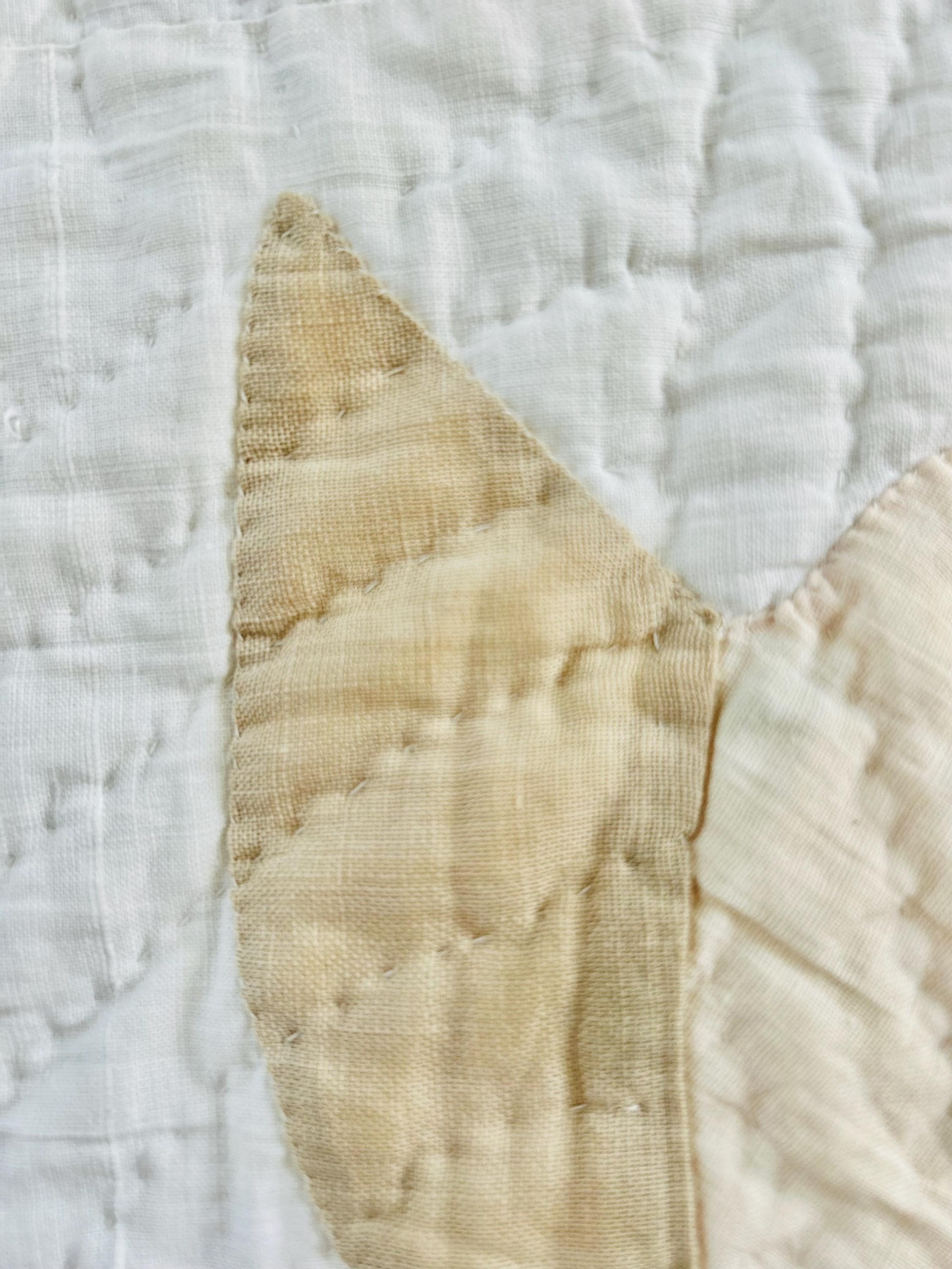 The back is white cotton, while the binding - which appears to be newer than the rest of the quilt - is a red cotton that has been machine stitched to the front and hand-stitched to the back. The cotton batting is very lightweight.