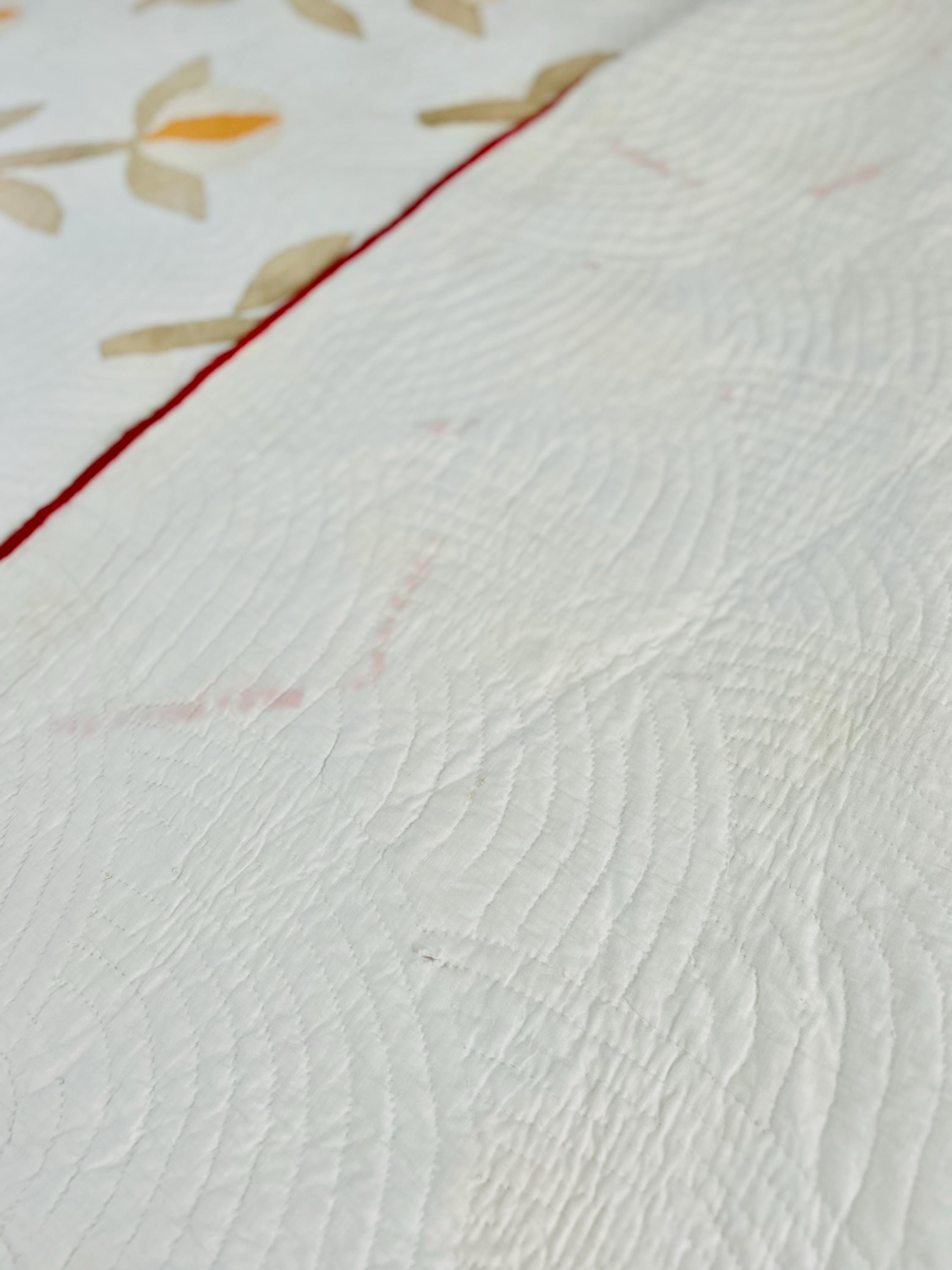 The quilt is in excellent antique condition, with overall fading of the fabrics that have changed color over more than 100 years as a result of the colors being made from plant dyes. There is some old color transfer from the red border that has resulted in several very, very light color transfer spots on the the front near the binding and darker streaks of color transfer on the back that do not go through to the front (see photos). Though the binding is in generally good shape, in one spot there is a small (1/4 inch) notch/tear.