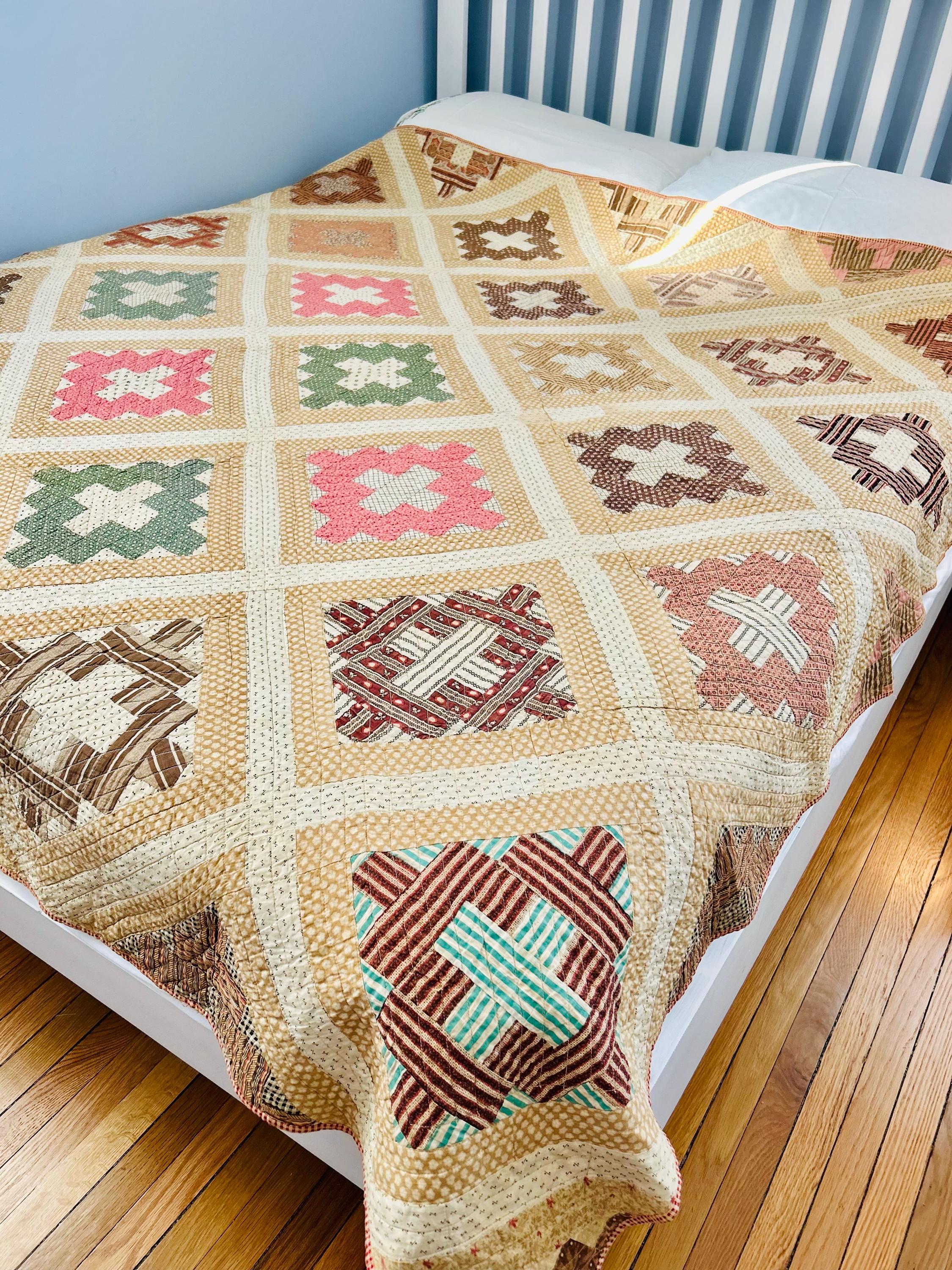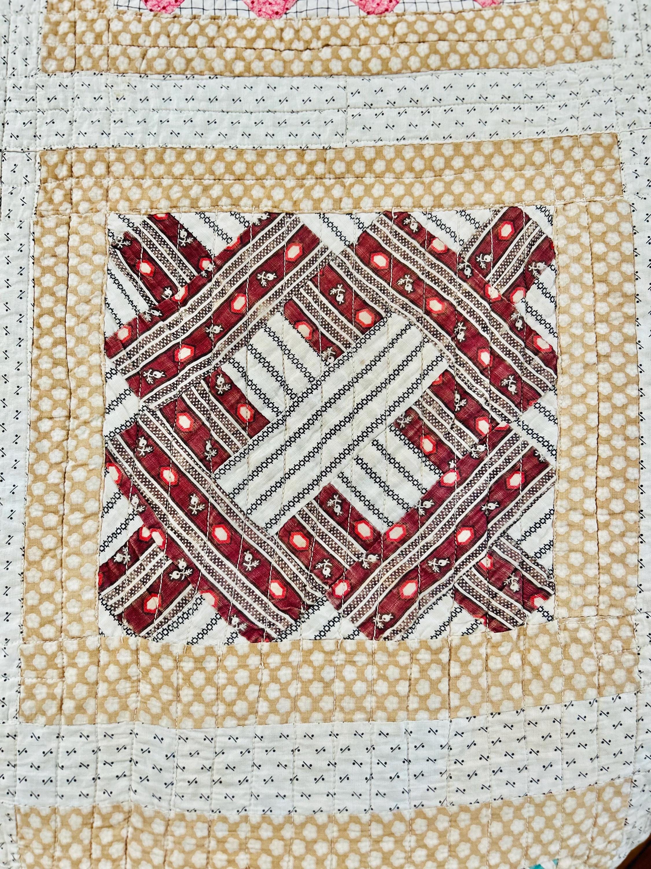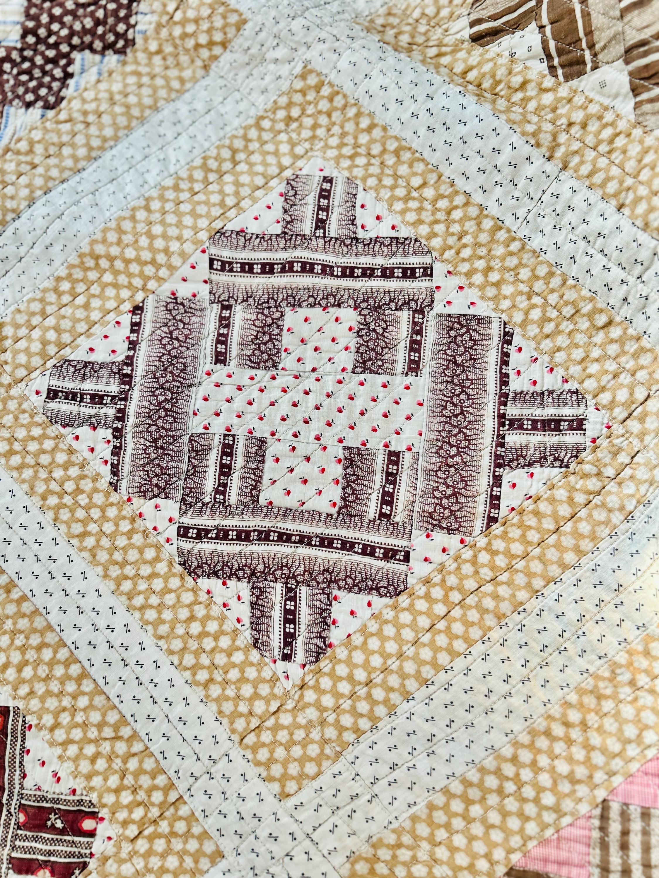 This is a Courthouse Square Quilt from the 1870s-1880s that is made from a beautiful combination of antique cotton prints and has been machine-quilted with a sewing machines. Sewing machines became available to consumers in the early 1800s and by the 1860s were fairly common. By the end of the 19th Century they were considered a "must-have."