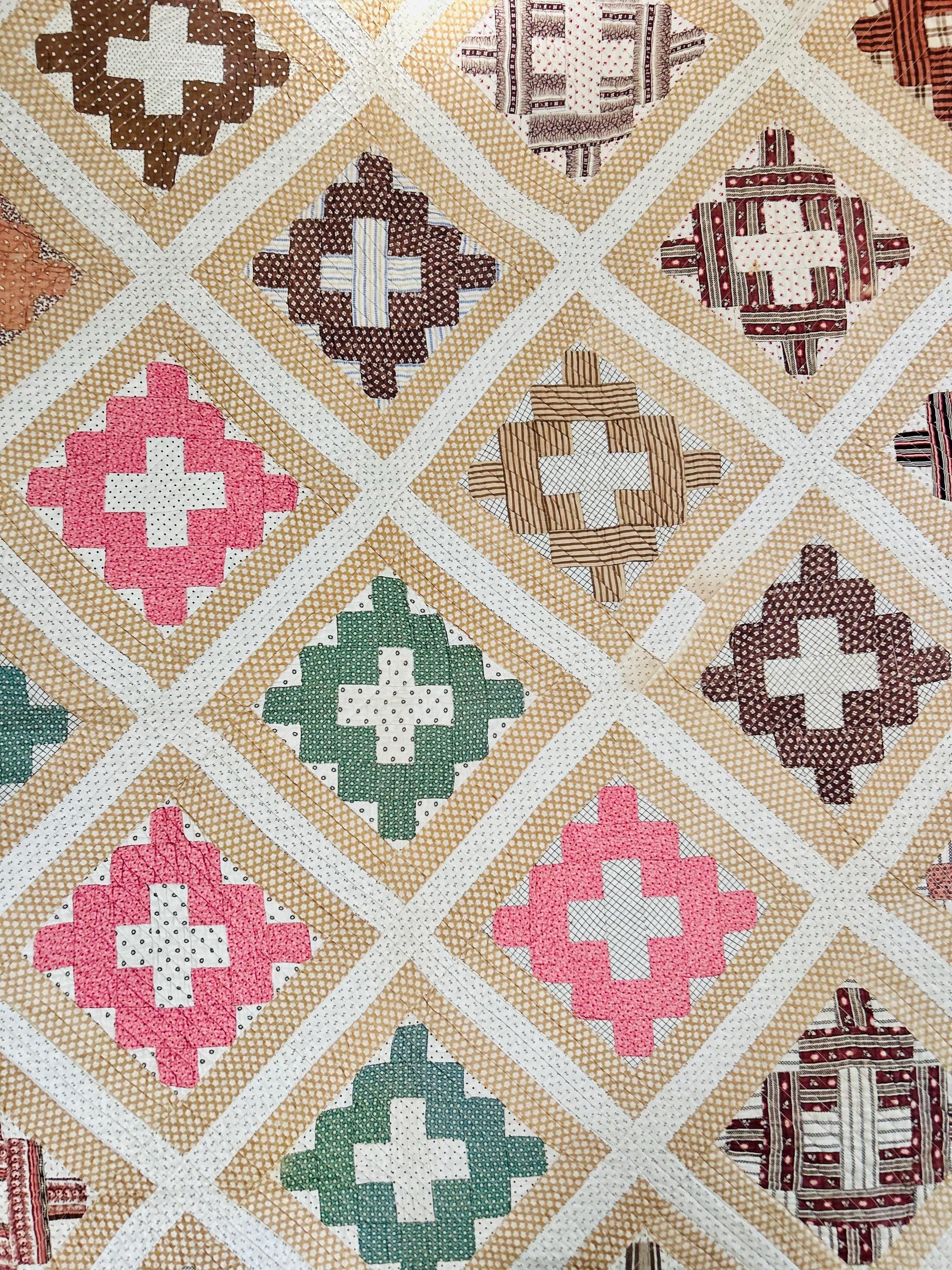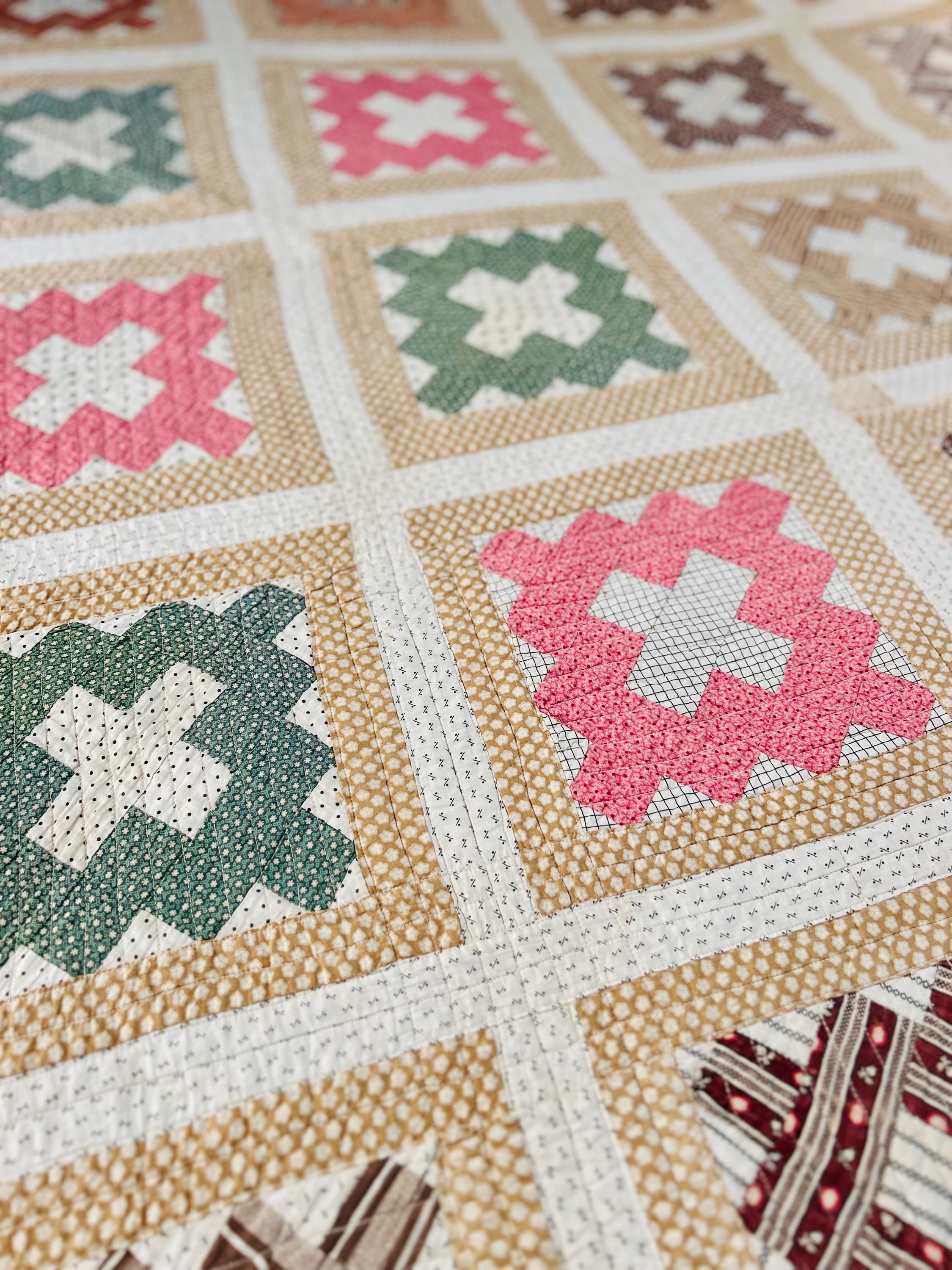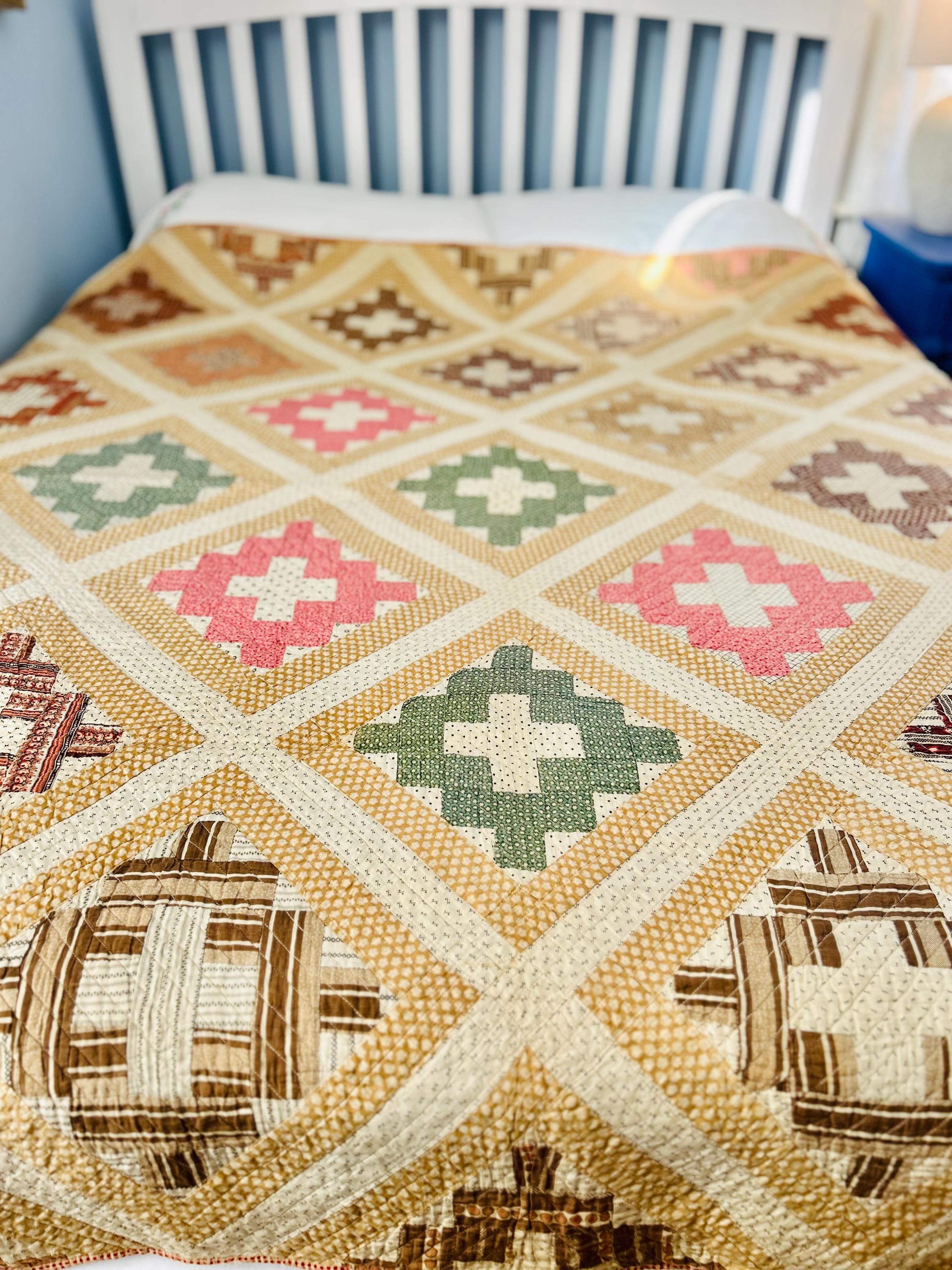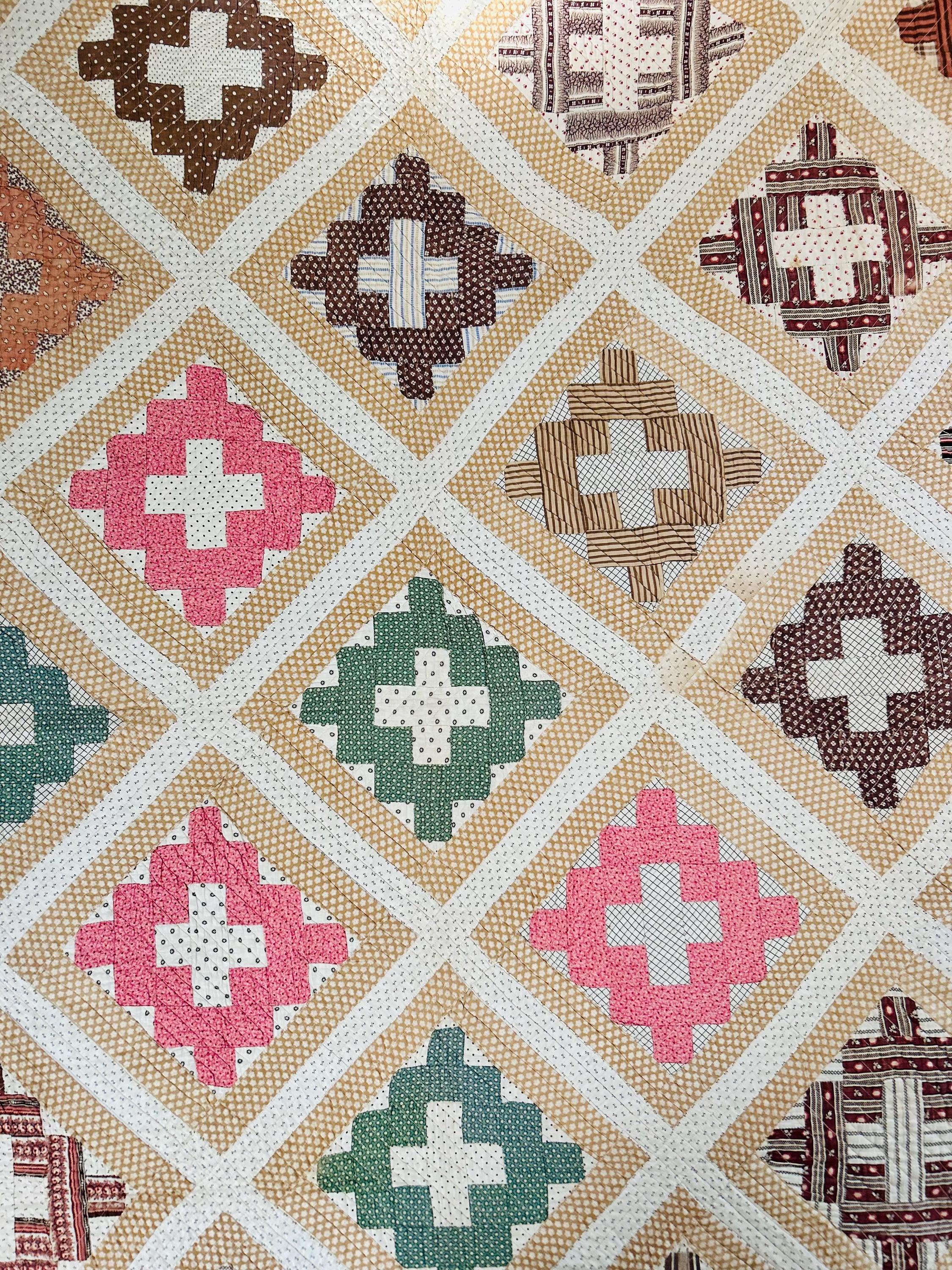 This is a Courthouse Square Quilt from the 1870s-1880s that is made from a beautiful combination of antique cotton prints and has been machine-quilted with a sewing machines. Sewing machines became available to consumers in the early 1800s and by the 1860s were fairly common. By the end of the 19th Century they were considered a "must-have."