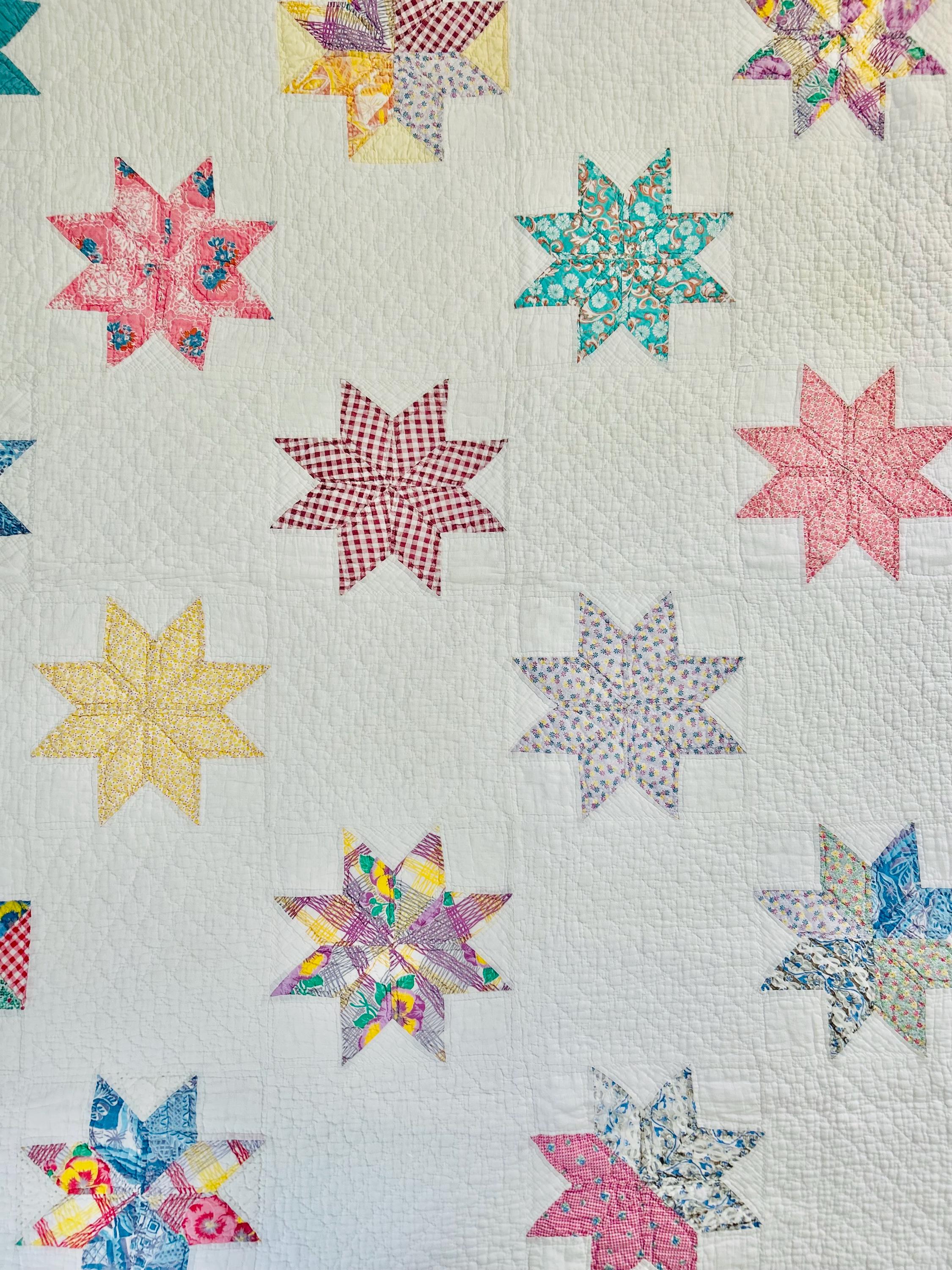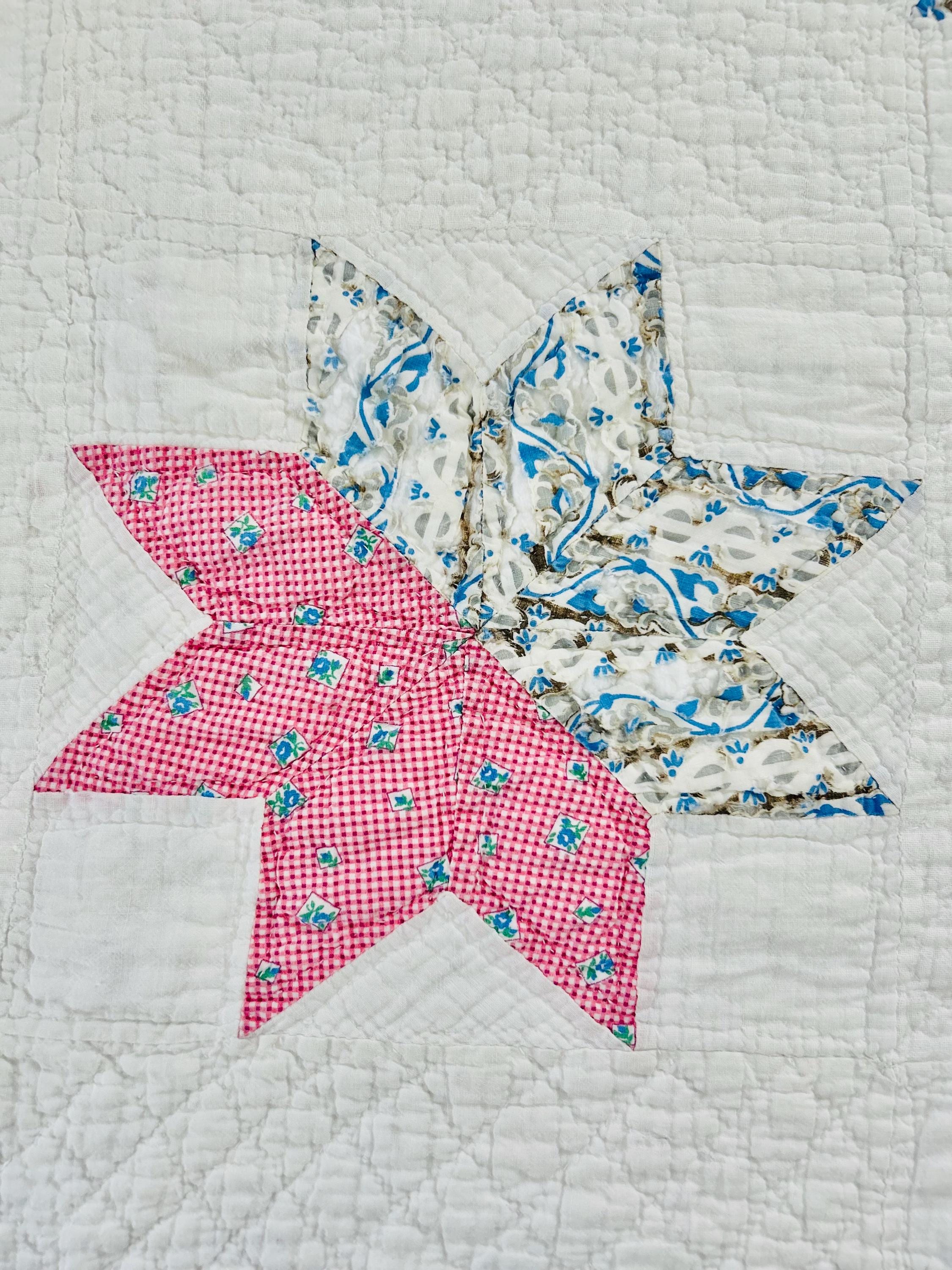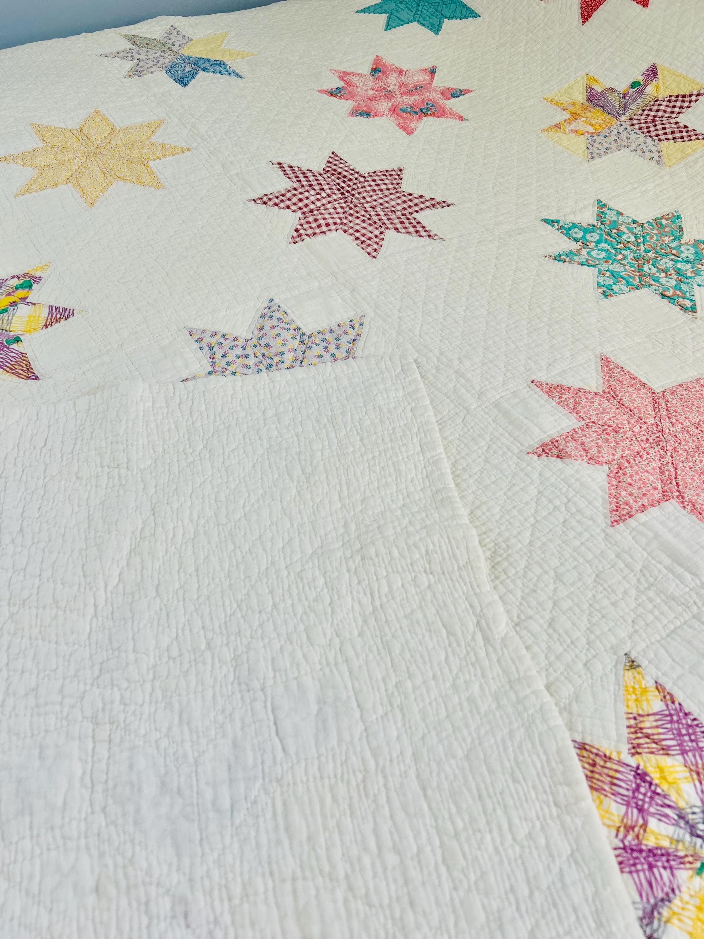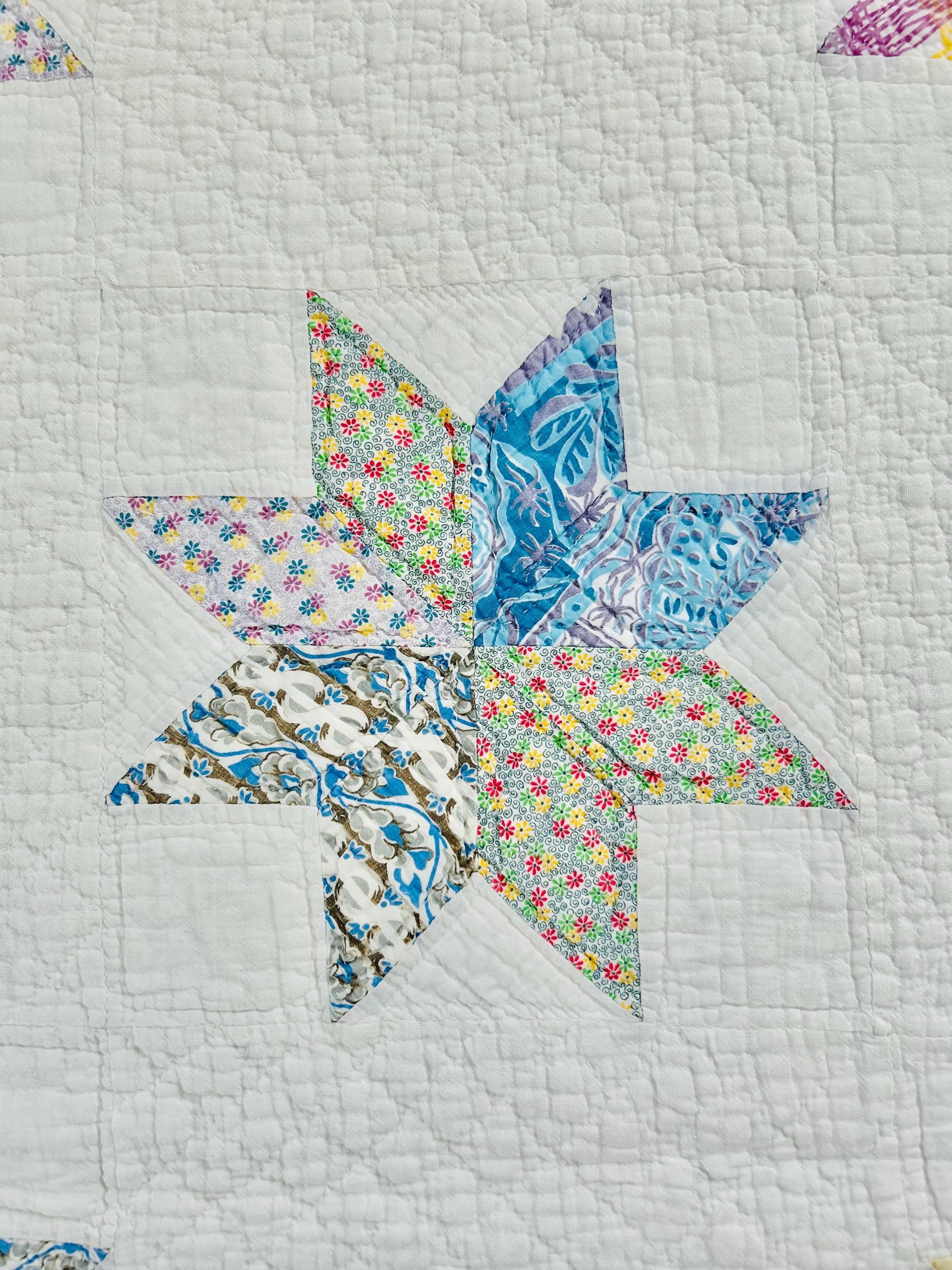 This LeMoyne Star Quilt is circa 1930-1940s and has been pieced in blocks comprising the eight-pointed stars and hand-quilted in outlines of the stars. It has also been neatly quilted in diamonds in the body of the quilt and along the four-sided border.
