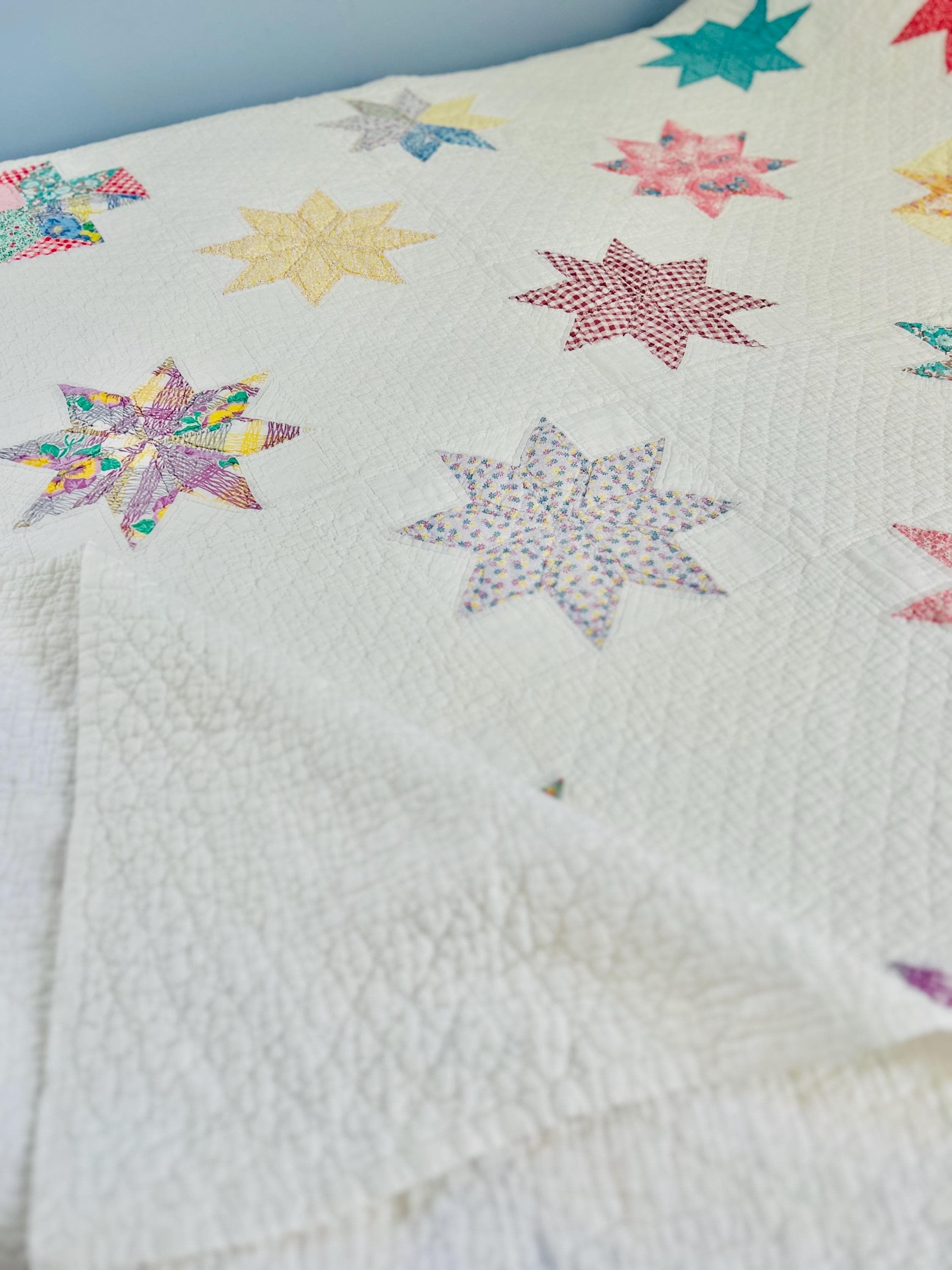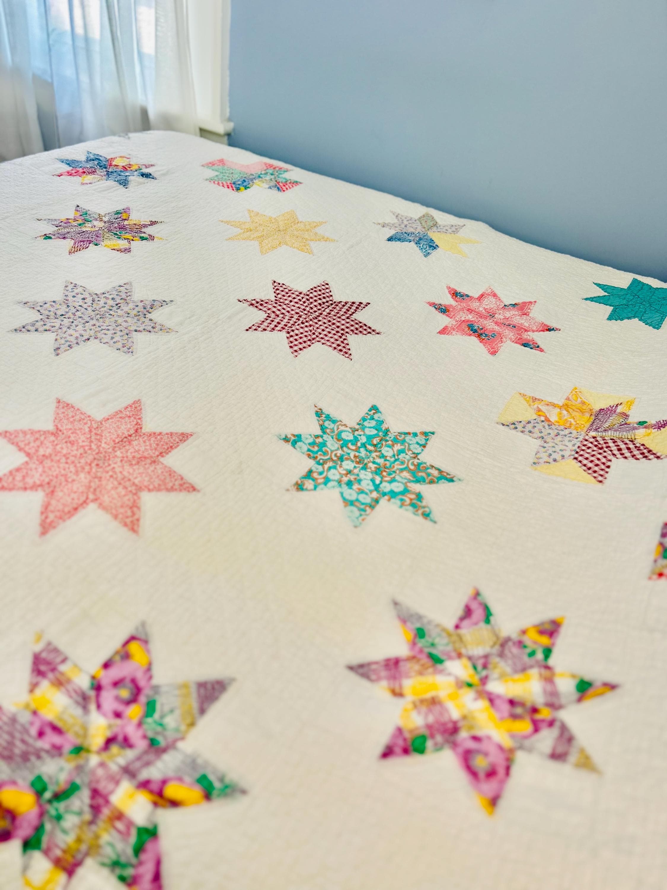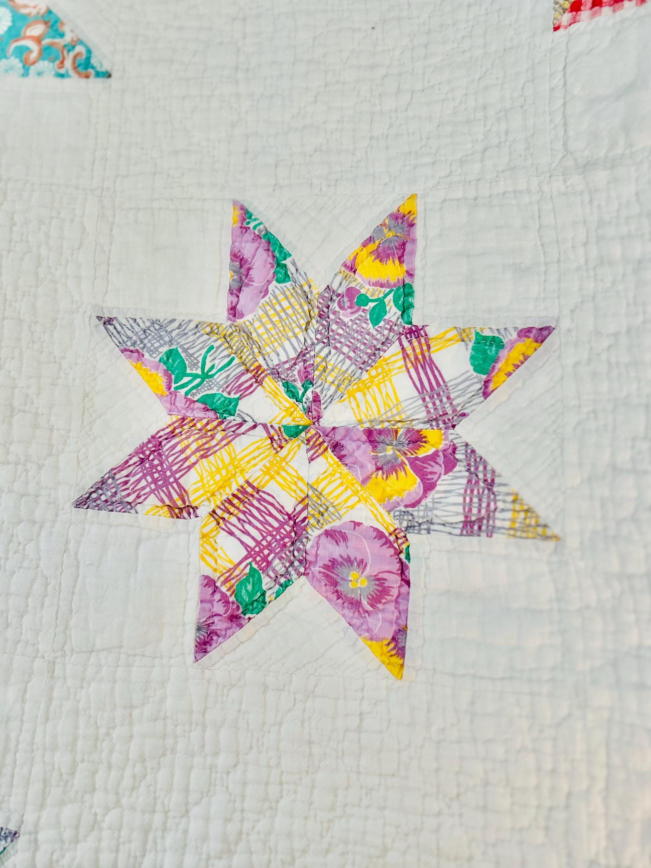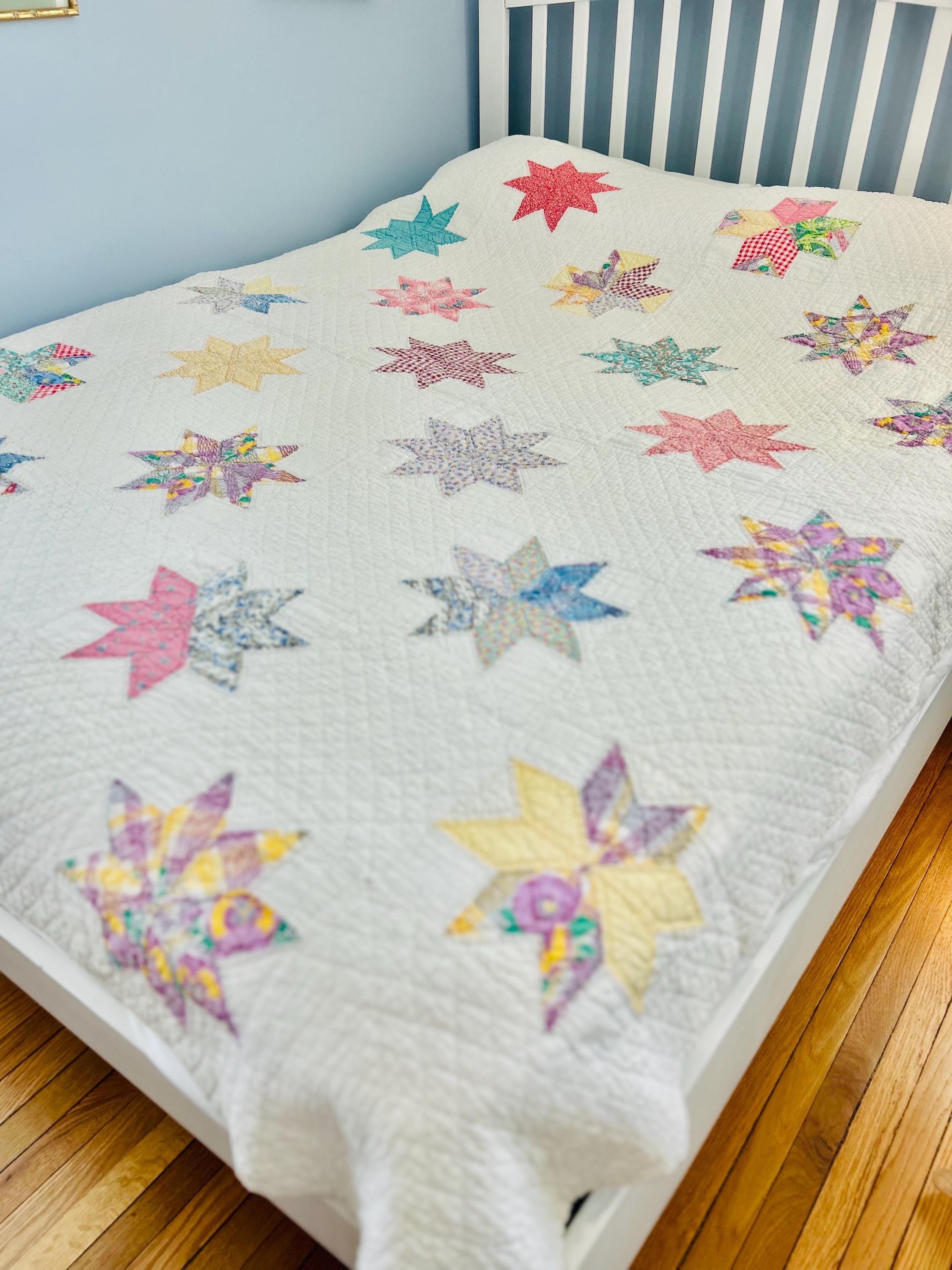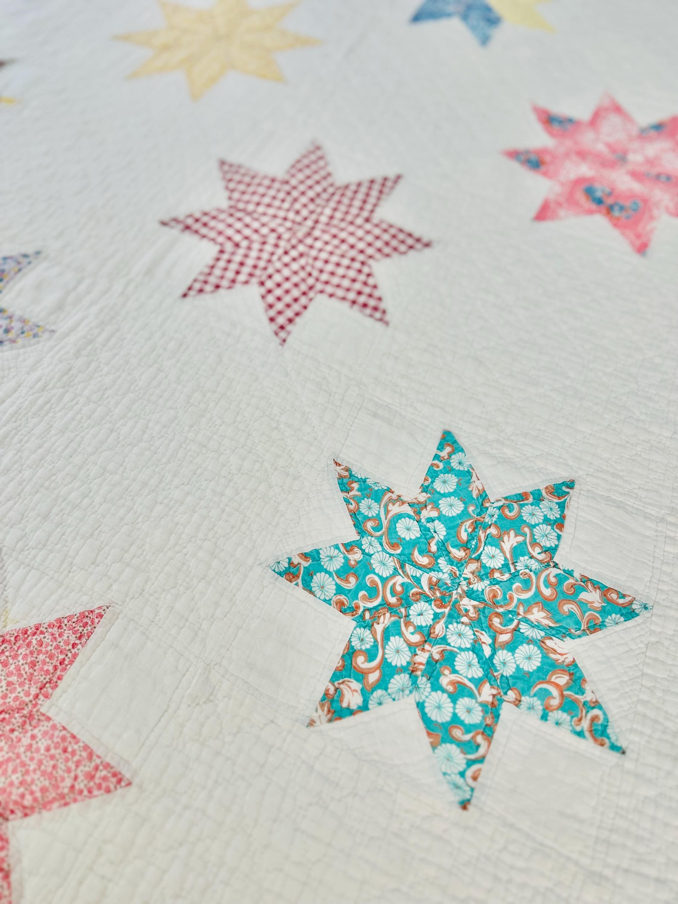 This LeMoyne Star Quilt is circa 1930-1940s and has been pieced in blocks comprising the eight-pointed stars and hand-quilted in outlines of the stars. It has also been neatly quilted in diamonds in the body of the quilt and along the four-sided border.