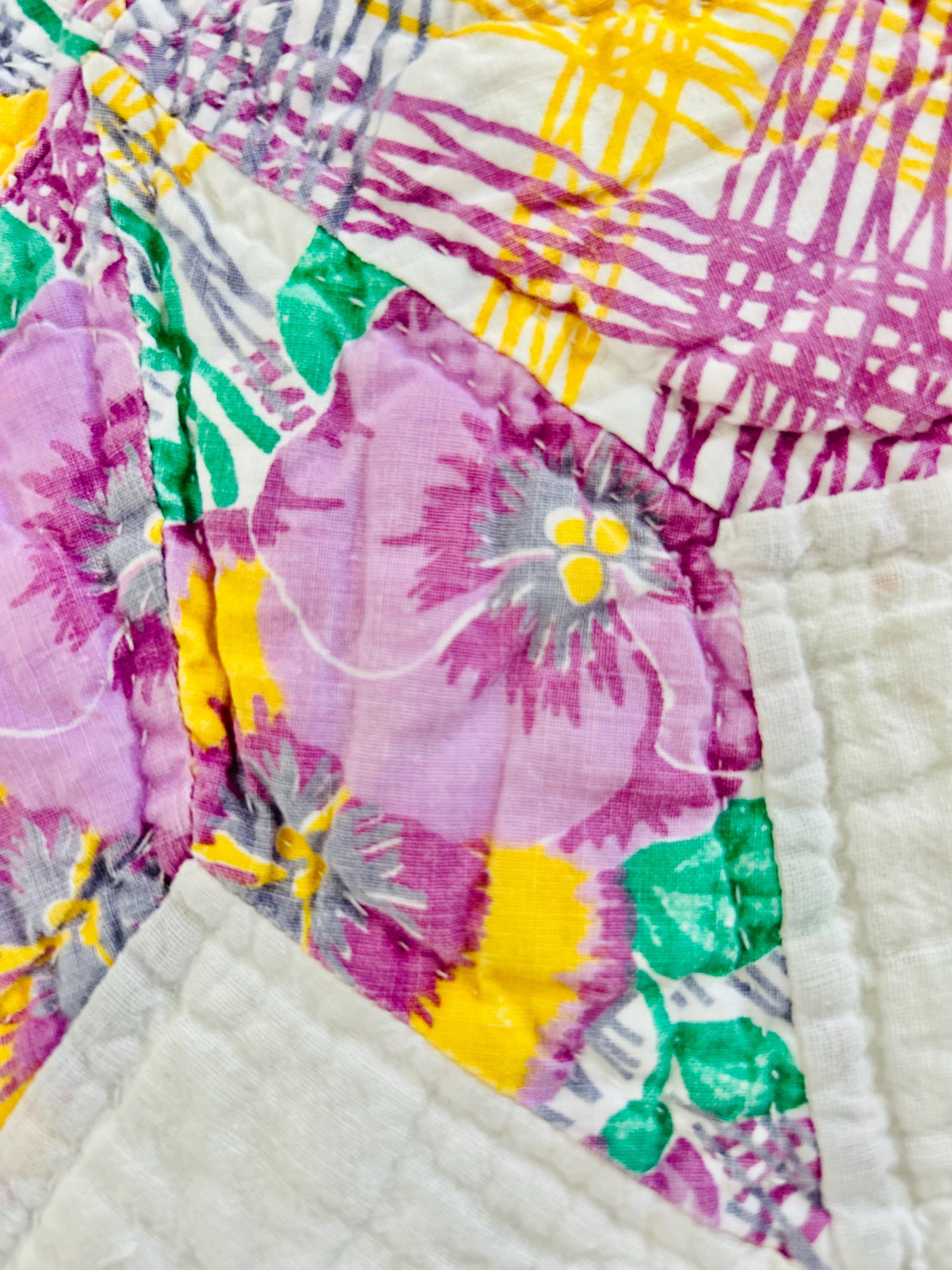 The back is a bright white cotton that has been turned to the front and hand-stitched to form the binding. The cotton batting is lightweight.
