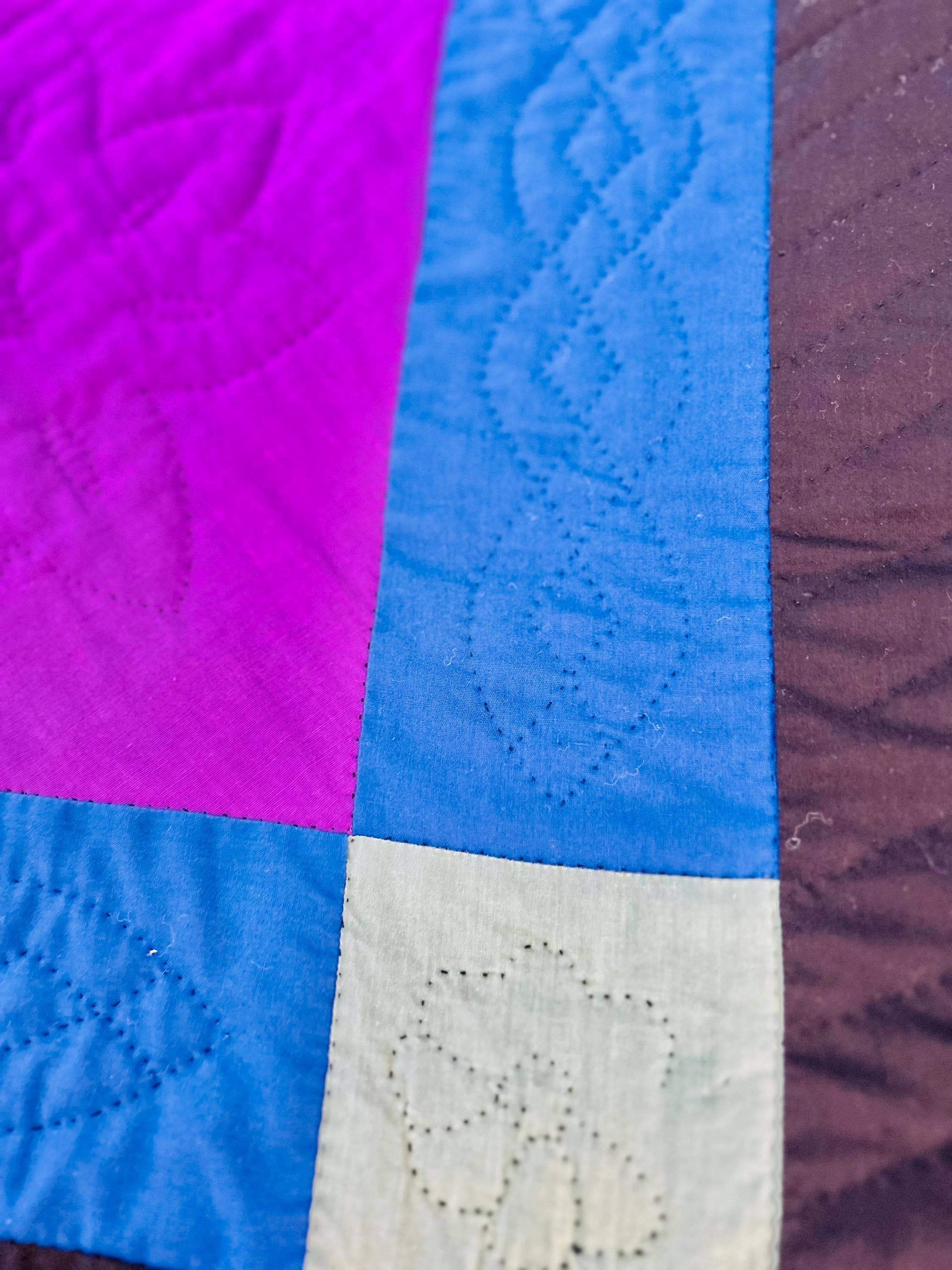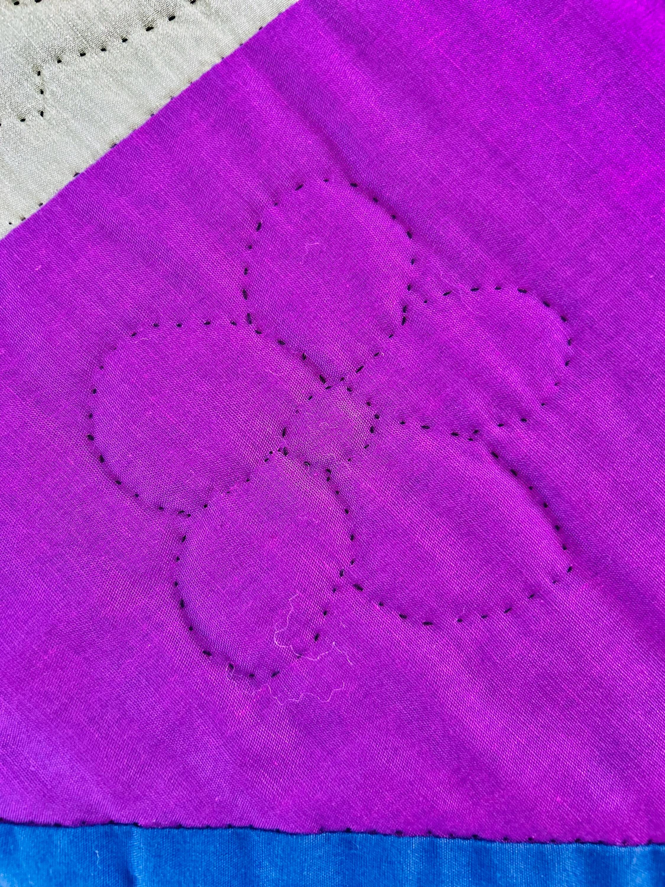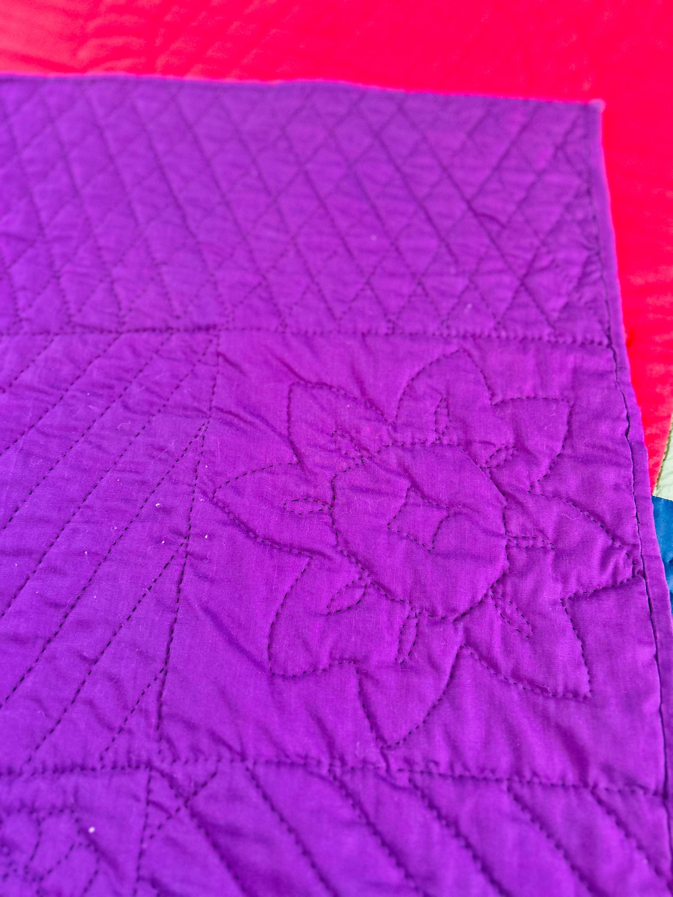 The back is a purple cotton that has been turned to the front and hand-stitched to form the binding. The cotton batting is lightweight.