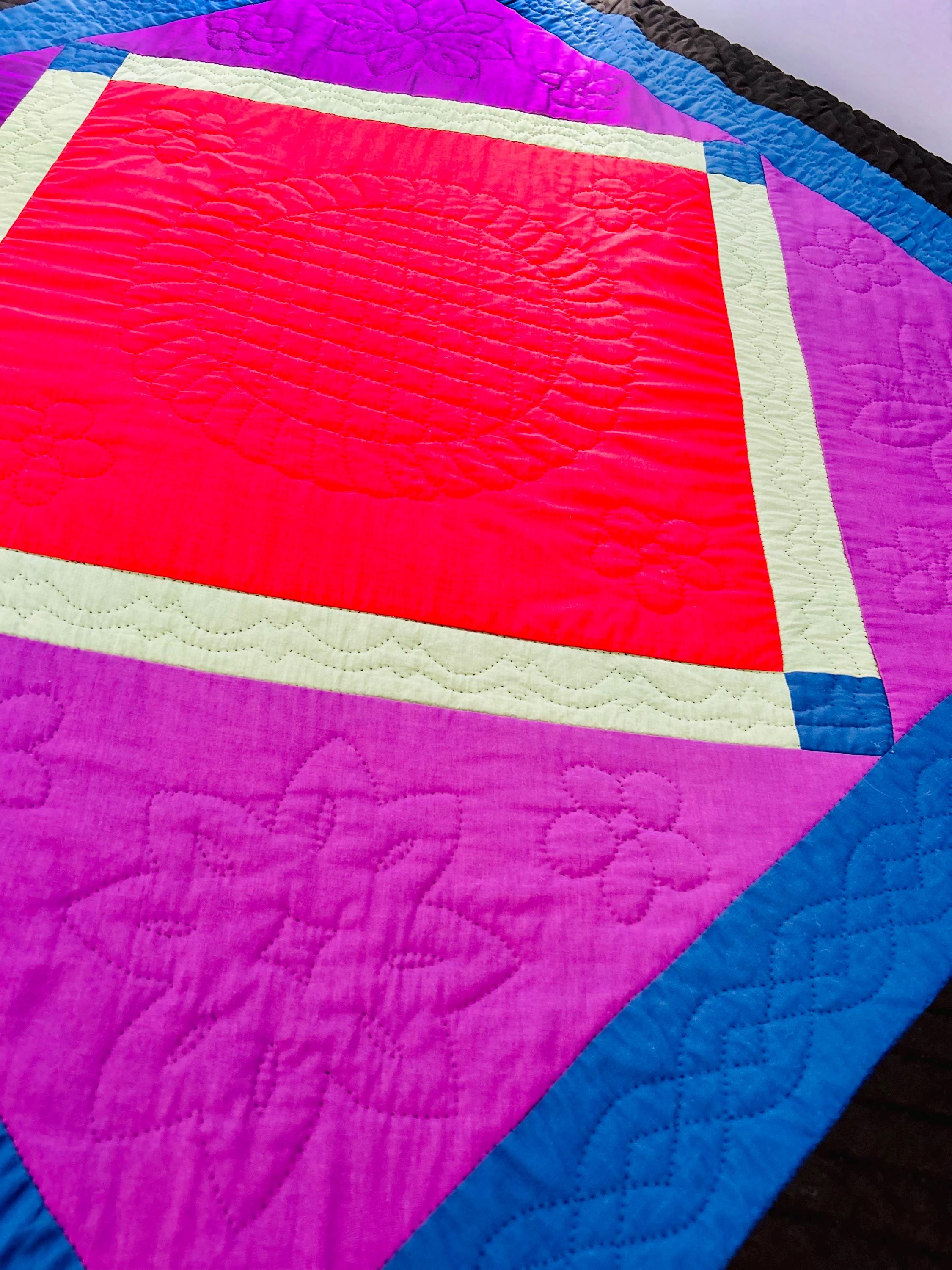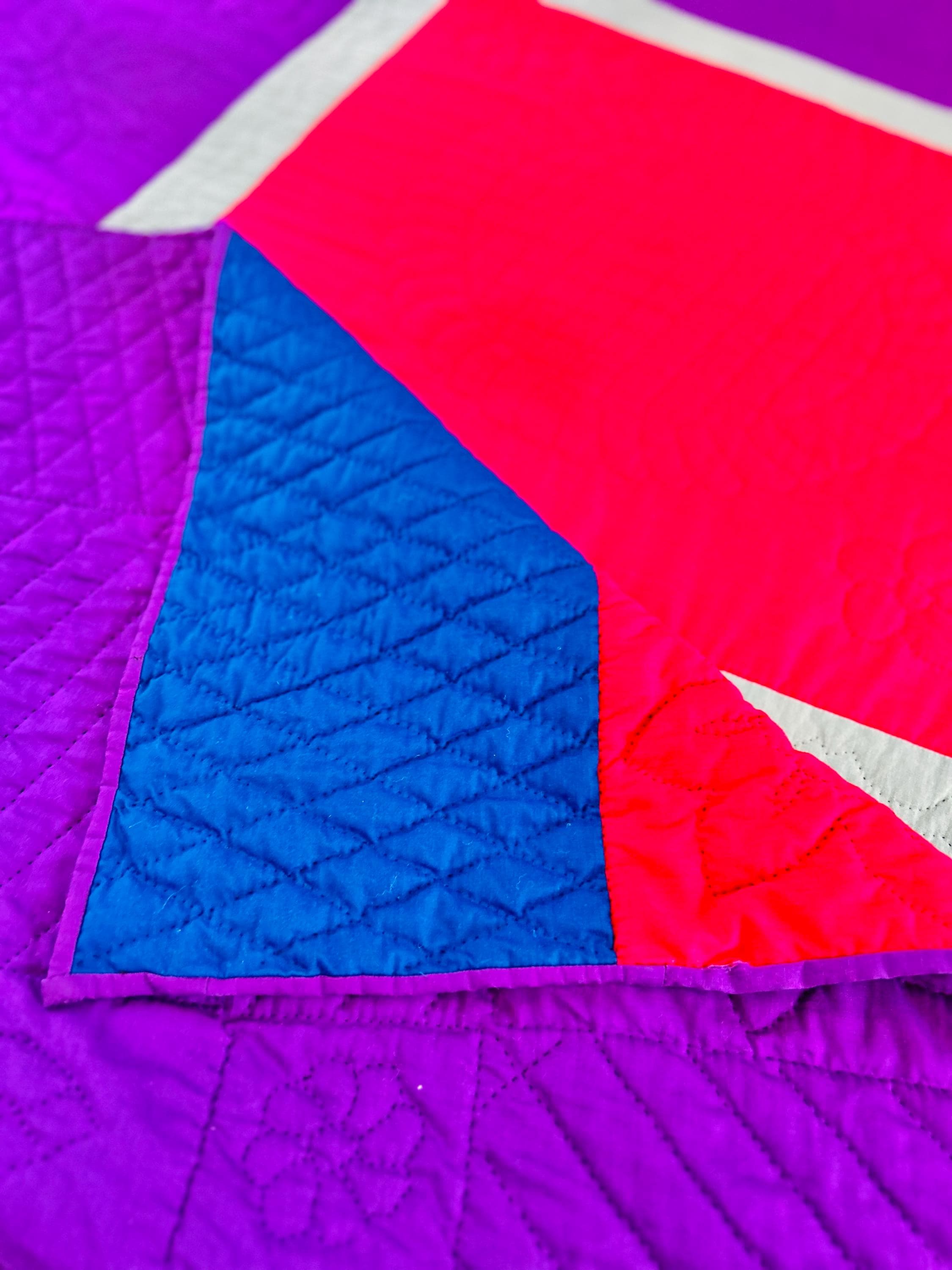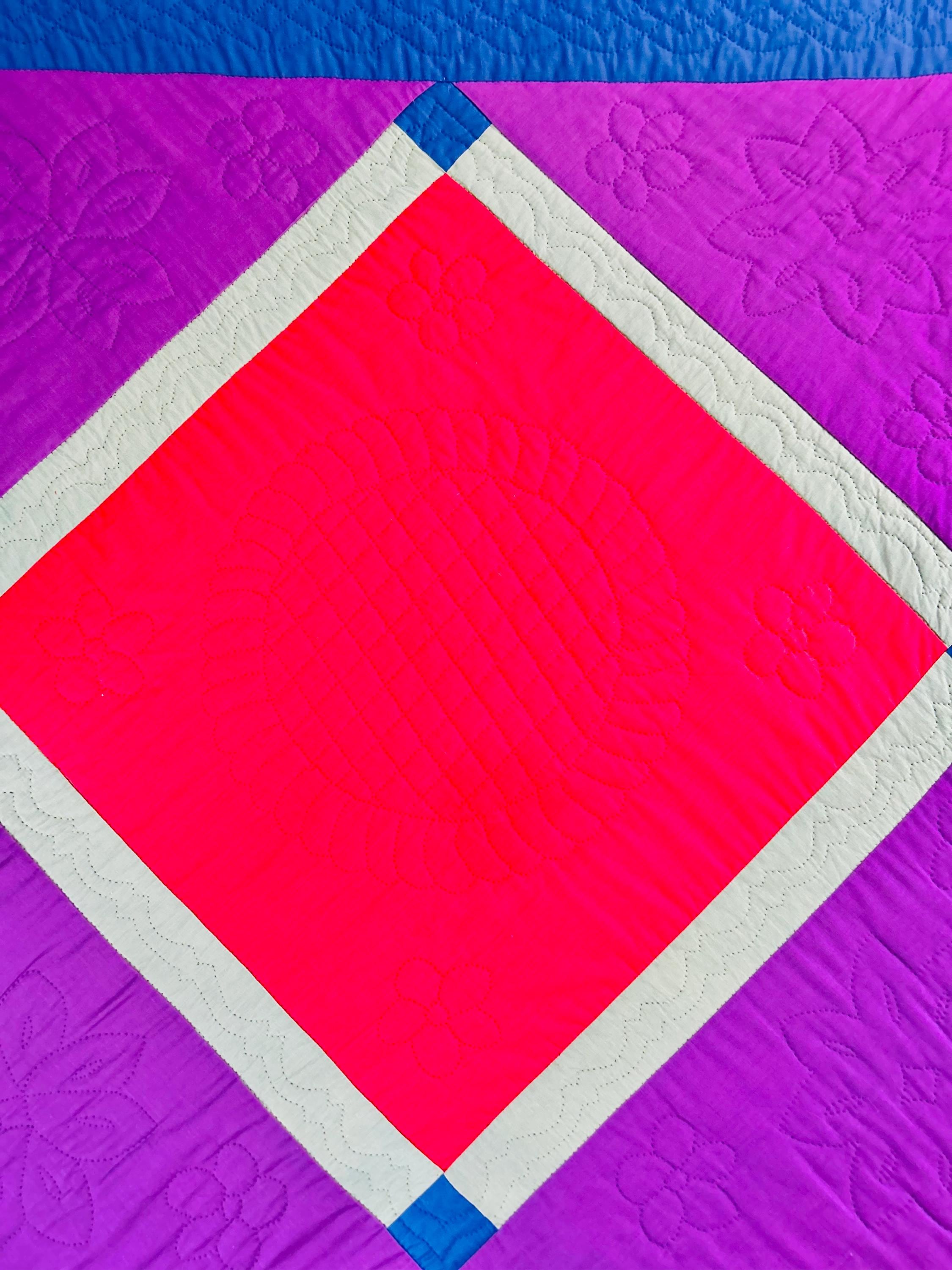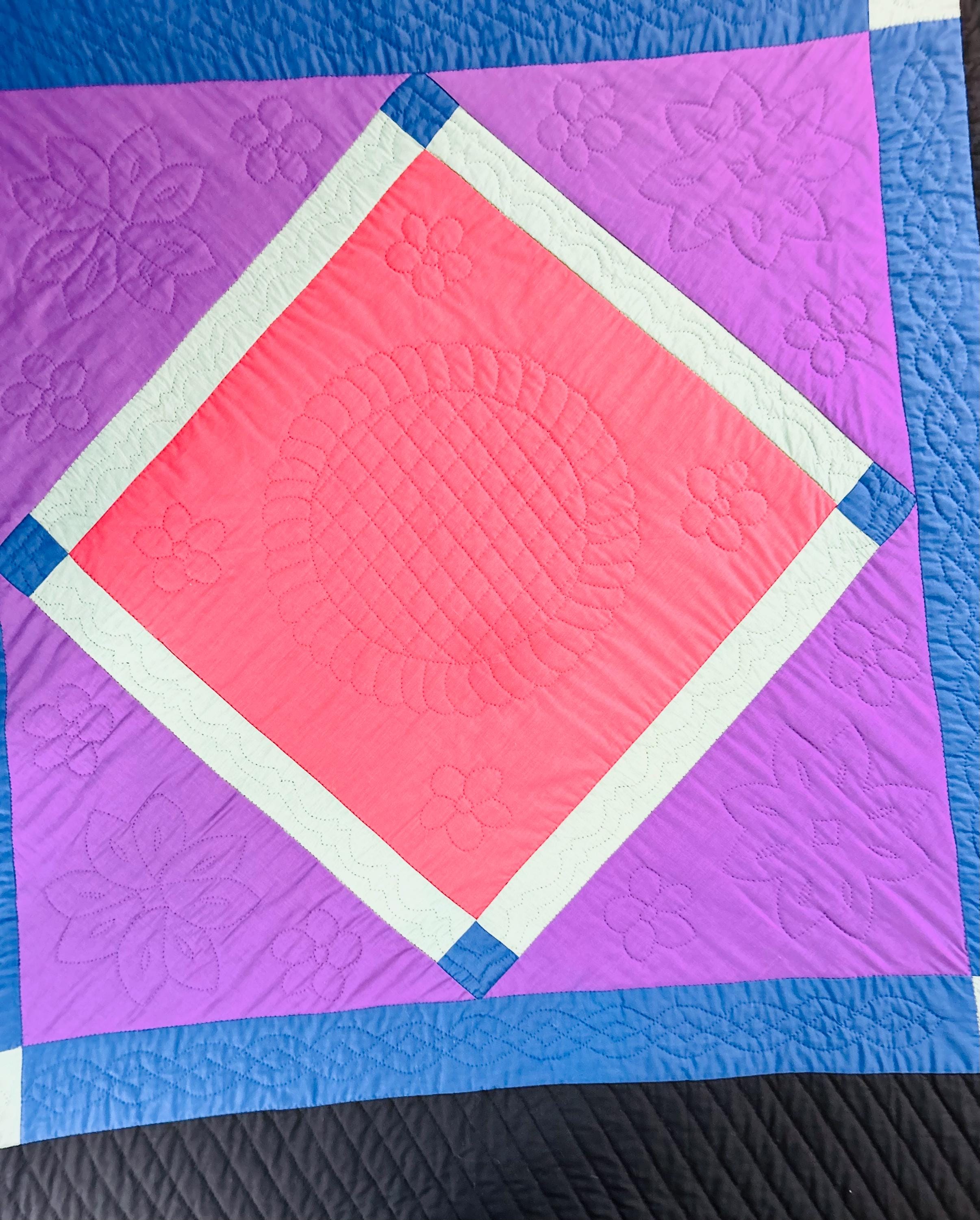 The back is a purple cotton that has been turned to the front and hand-stitched to form the binding. The cotton batting is lightweight.