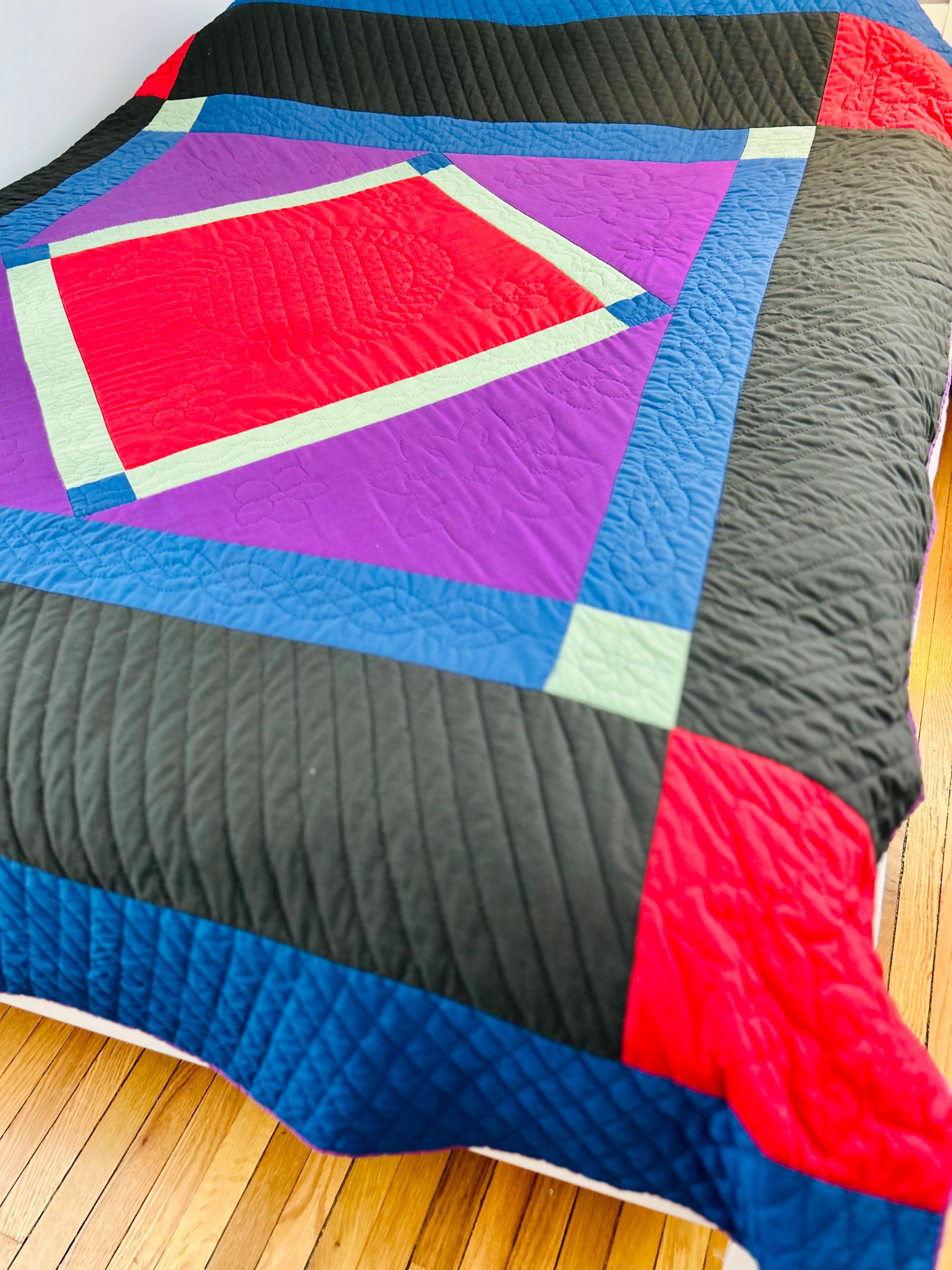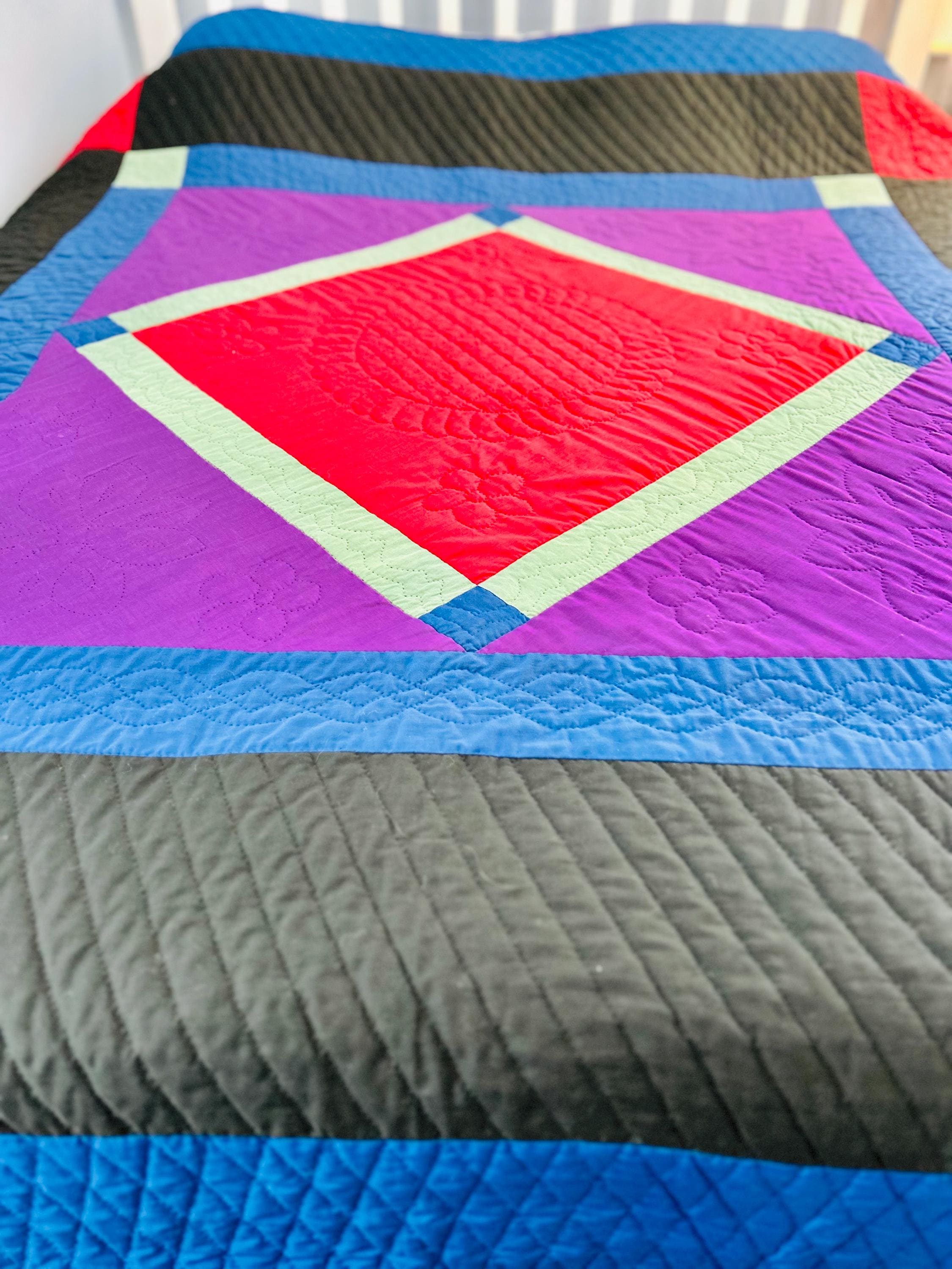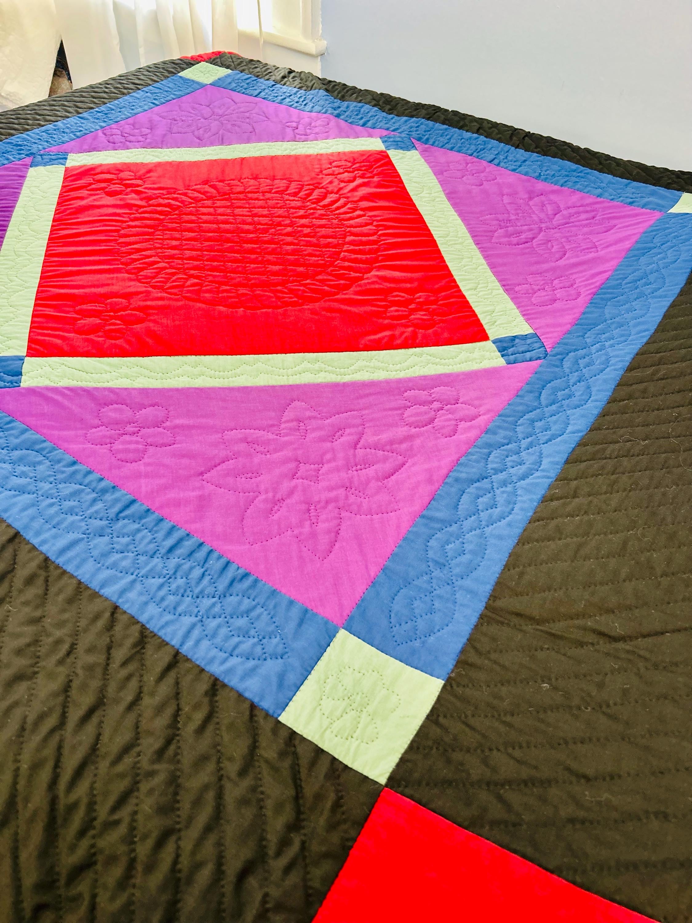 This Center Diamond Amish Quilt comes from Pennsylvania, circa 1940s, and is entirely hand-stitched and hand-quilted. The hand quilting is in black thread and is done in patterns of diamonds, flowers, bows, twisted rope, and a feather wreath in the middle diamond.