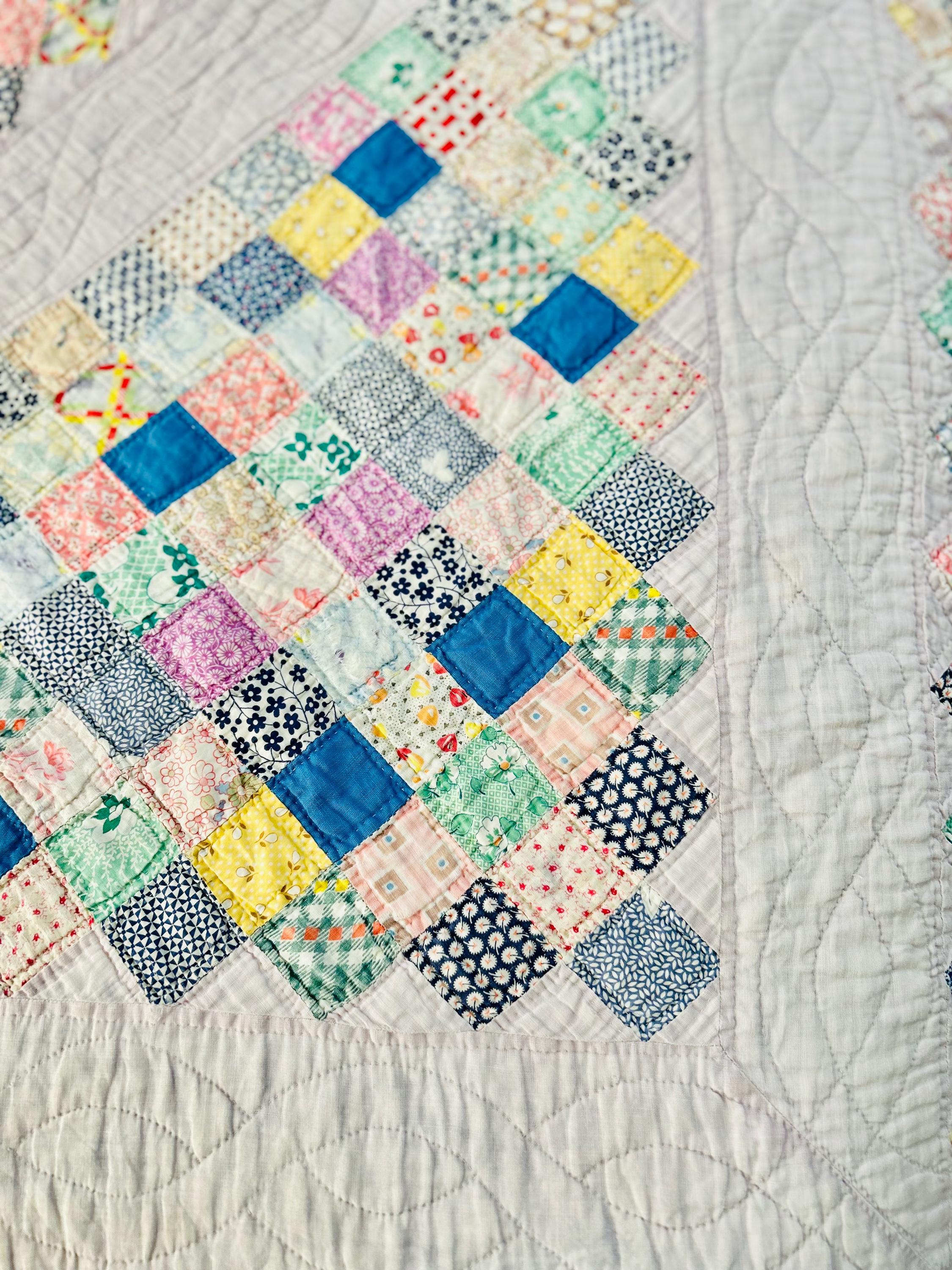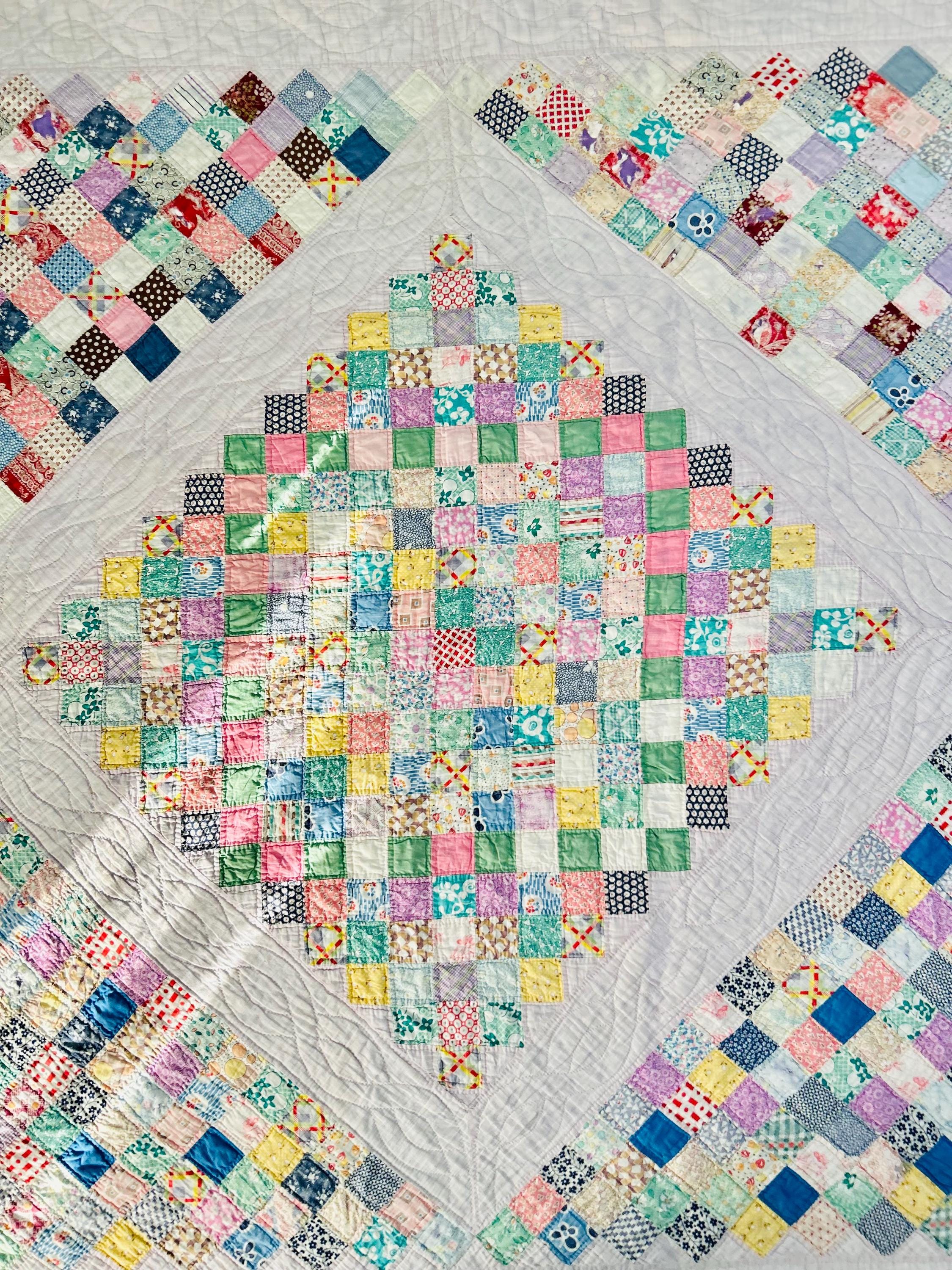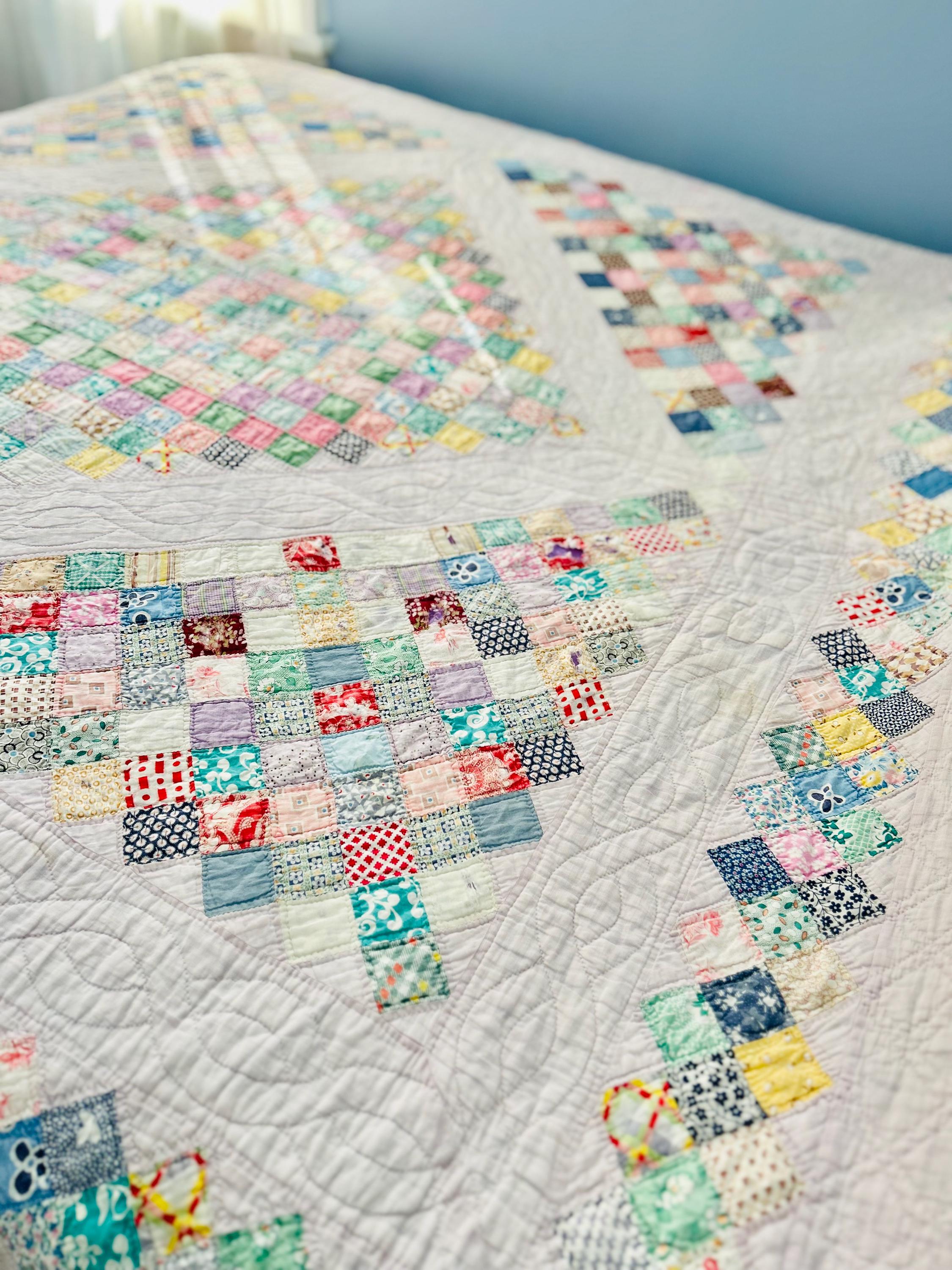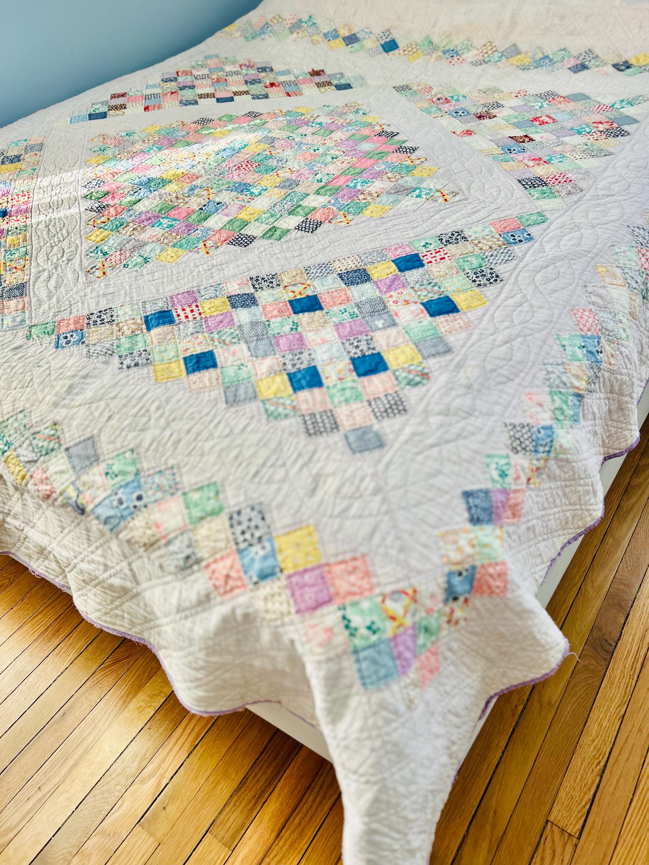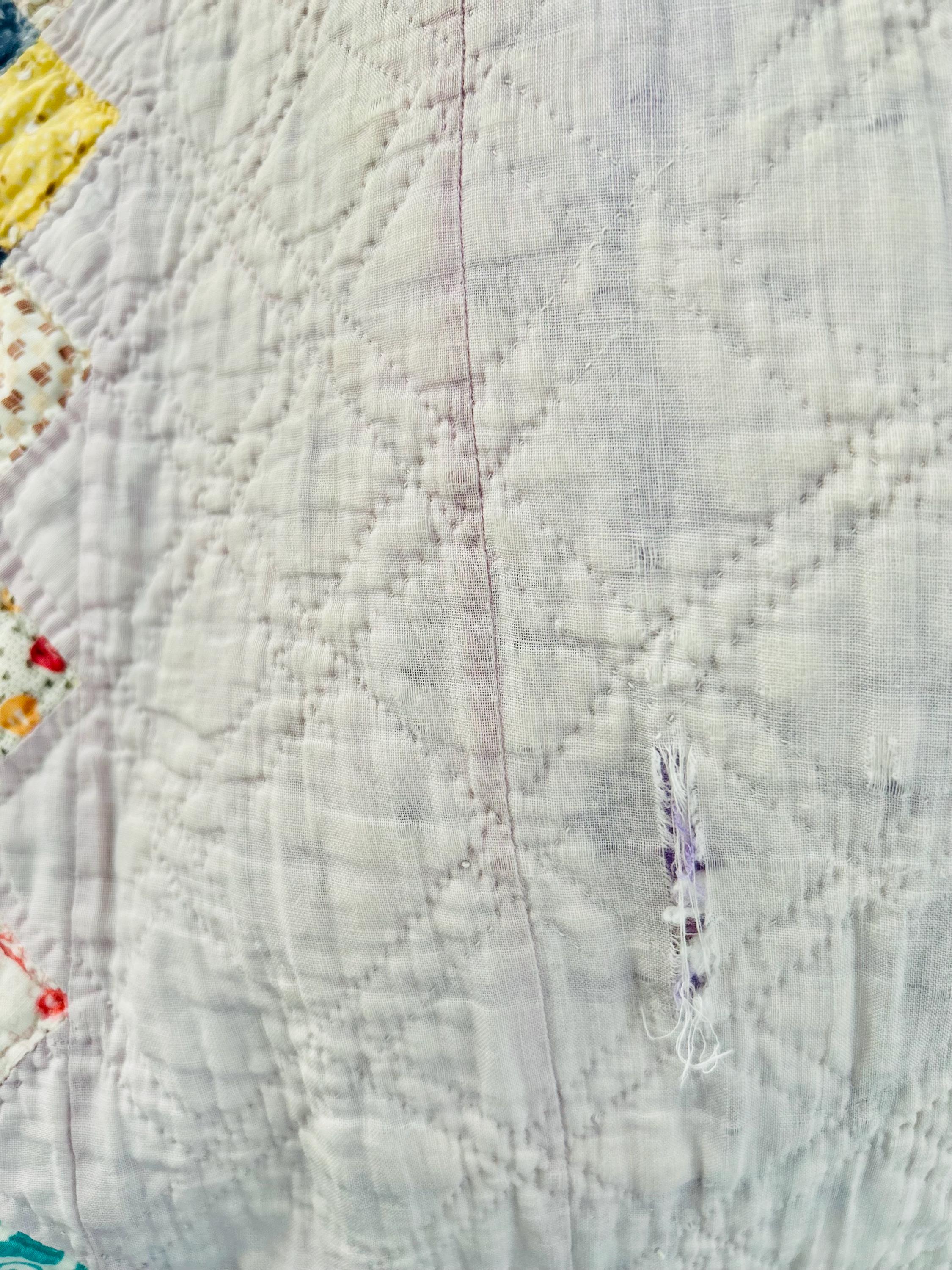 This Boston Commons Quilt is circa 1920s-1930s and has been hand-stitched and hand-quilted. Unfortunately, it has experienced fabric loss that in some spots has turned into holes (see photos), Though about 90 percent of the quilt is completely intact, areas along the borders have deteriorated extensively and there is also fabric loss and several small (1/4 inch) holes in other areas that do not go through to the back.