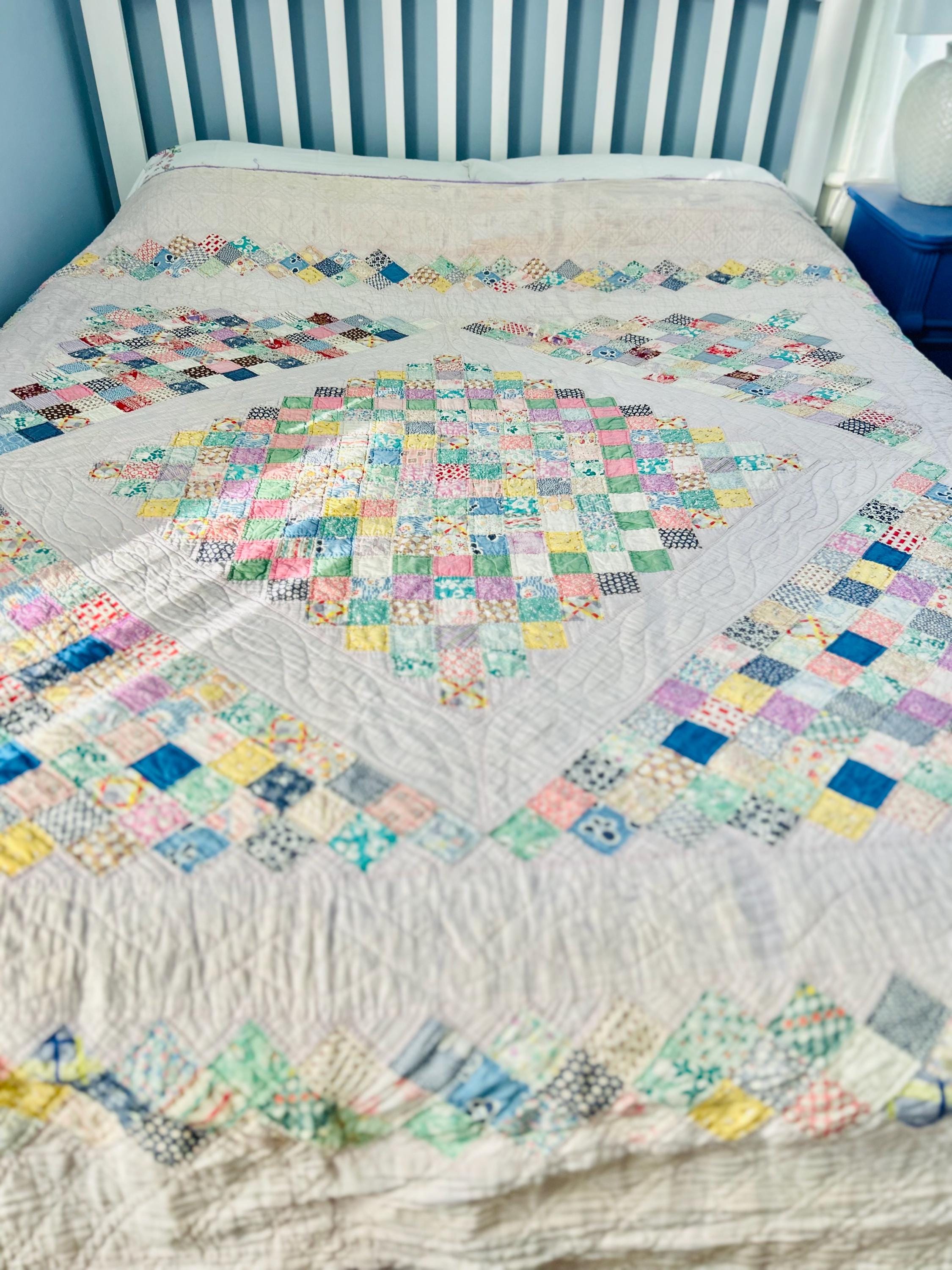 The quilt is clean, soft and comes from a smoke-free and pet-free home. It measures 75 inches by 78 inches. Shown on a queen-size bed.