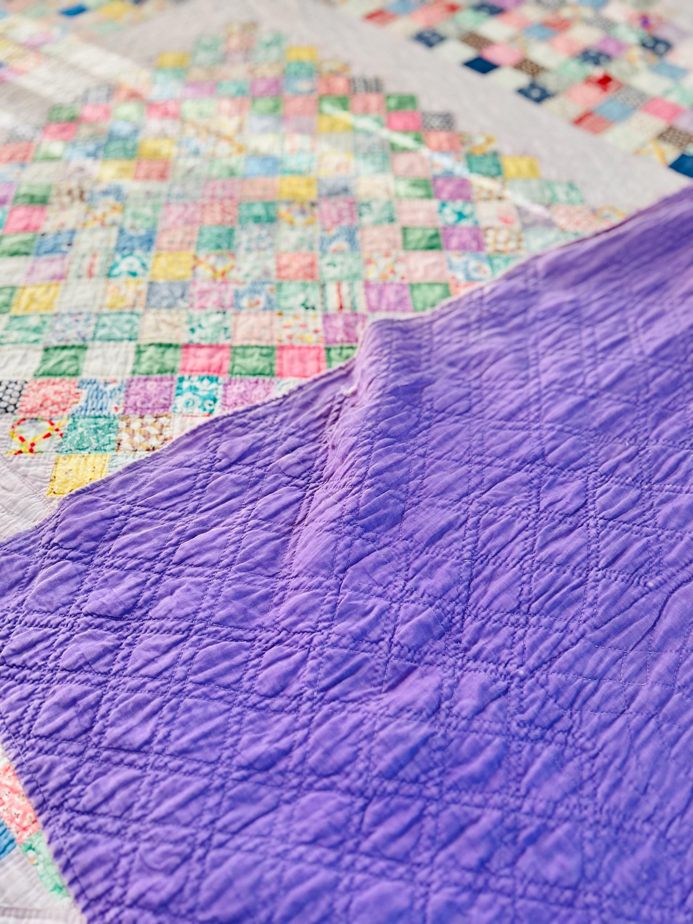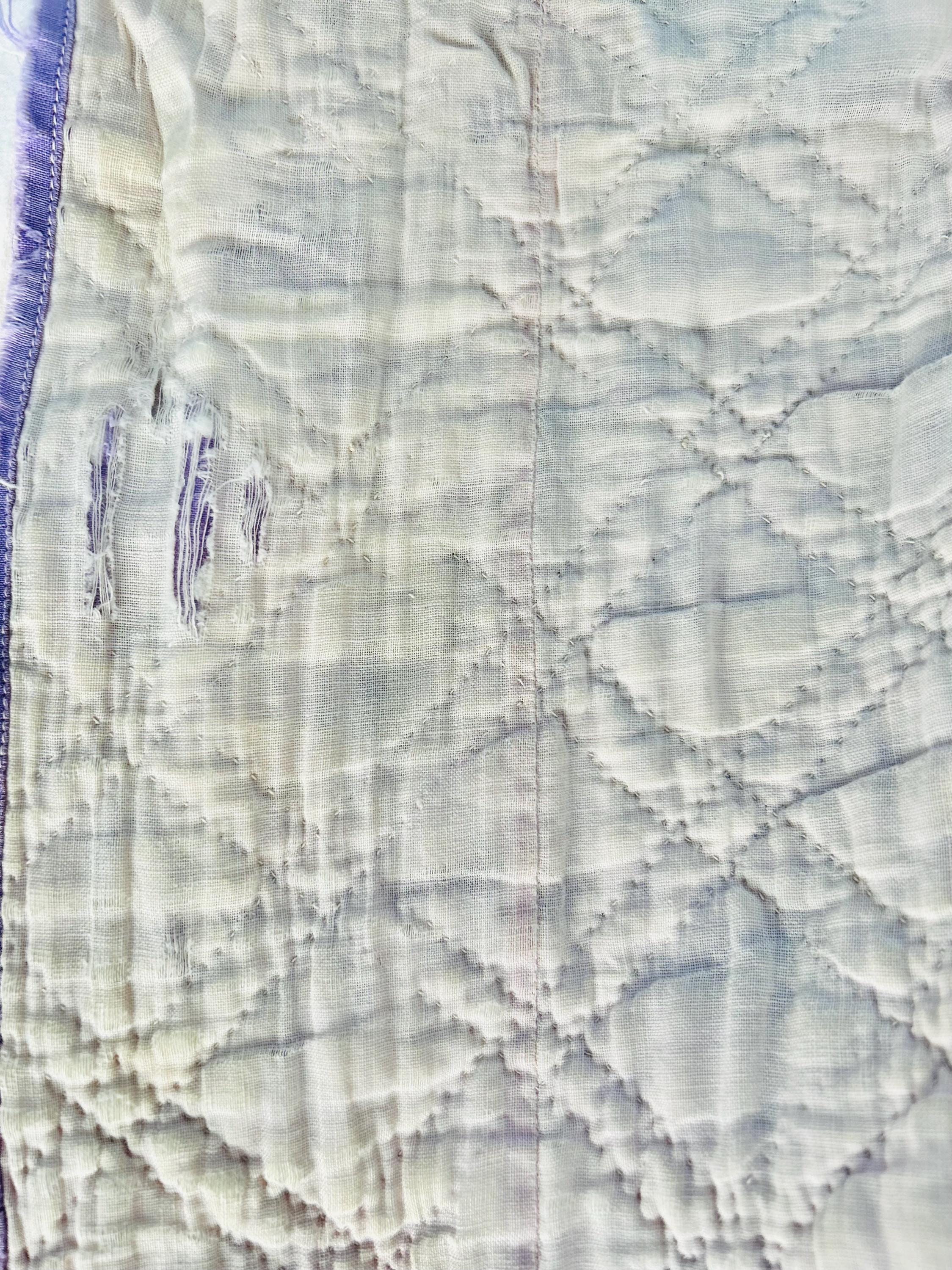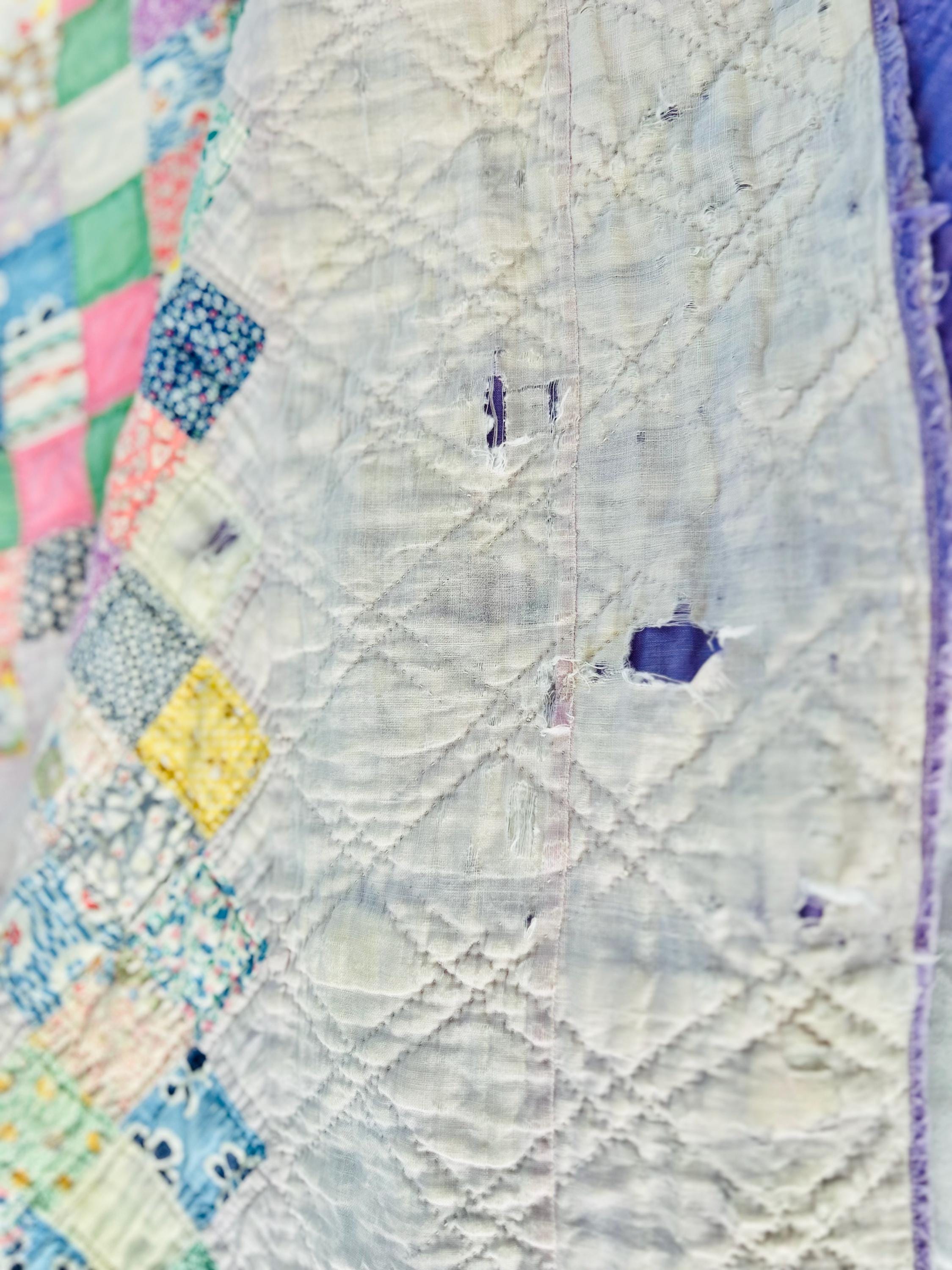 The back is a deep purple that has also experienced some fabric loss in several locations, but has been turned to the front and machine stitched to form the binding which is intact and not fraying. The cotton batting is very lightweight.