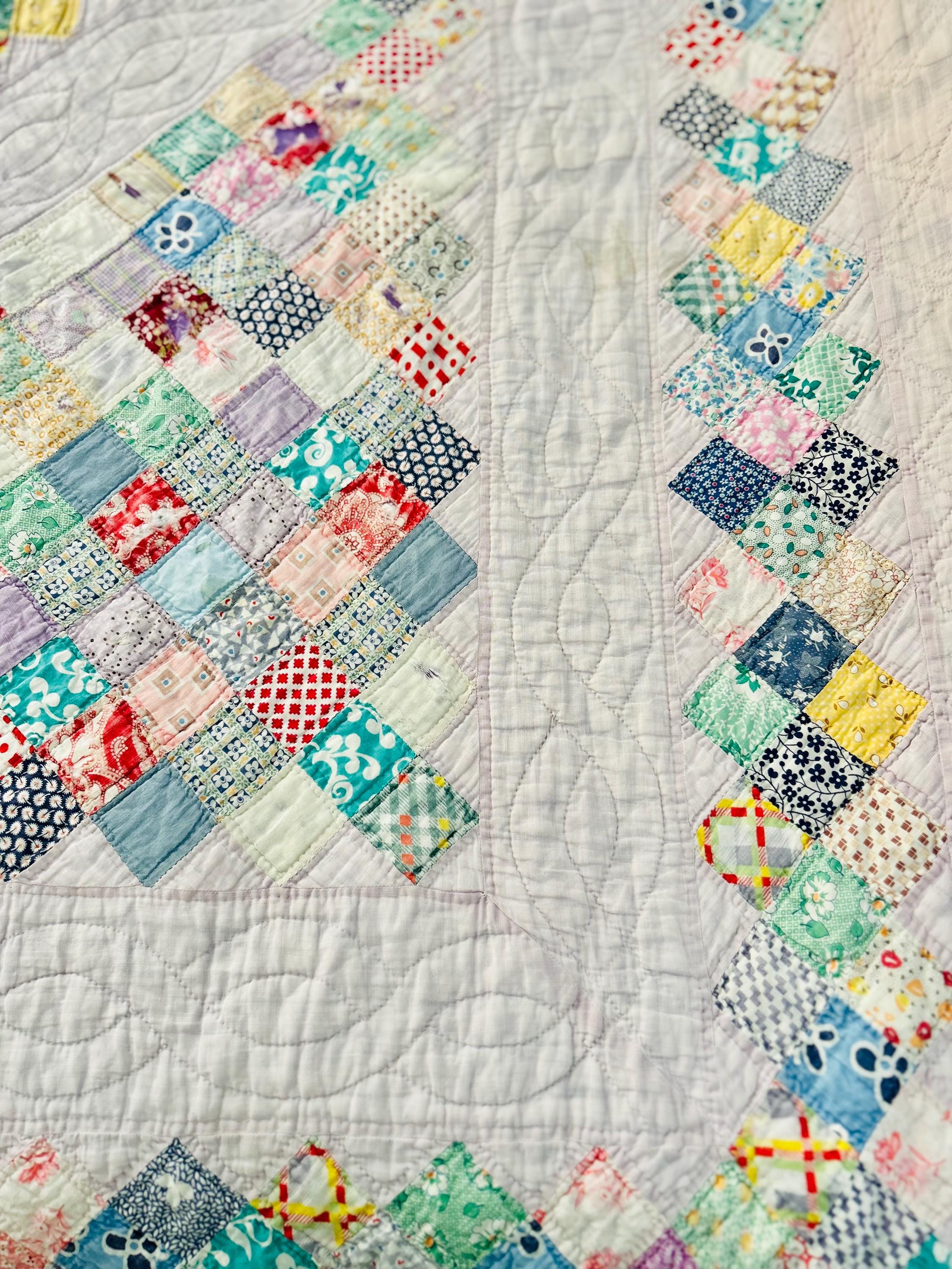 The quilting is in double diagonals along the four-sided border and well as in outlines of the patchwork and twisted rope patterns in the body of the quilt.