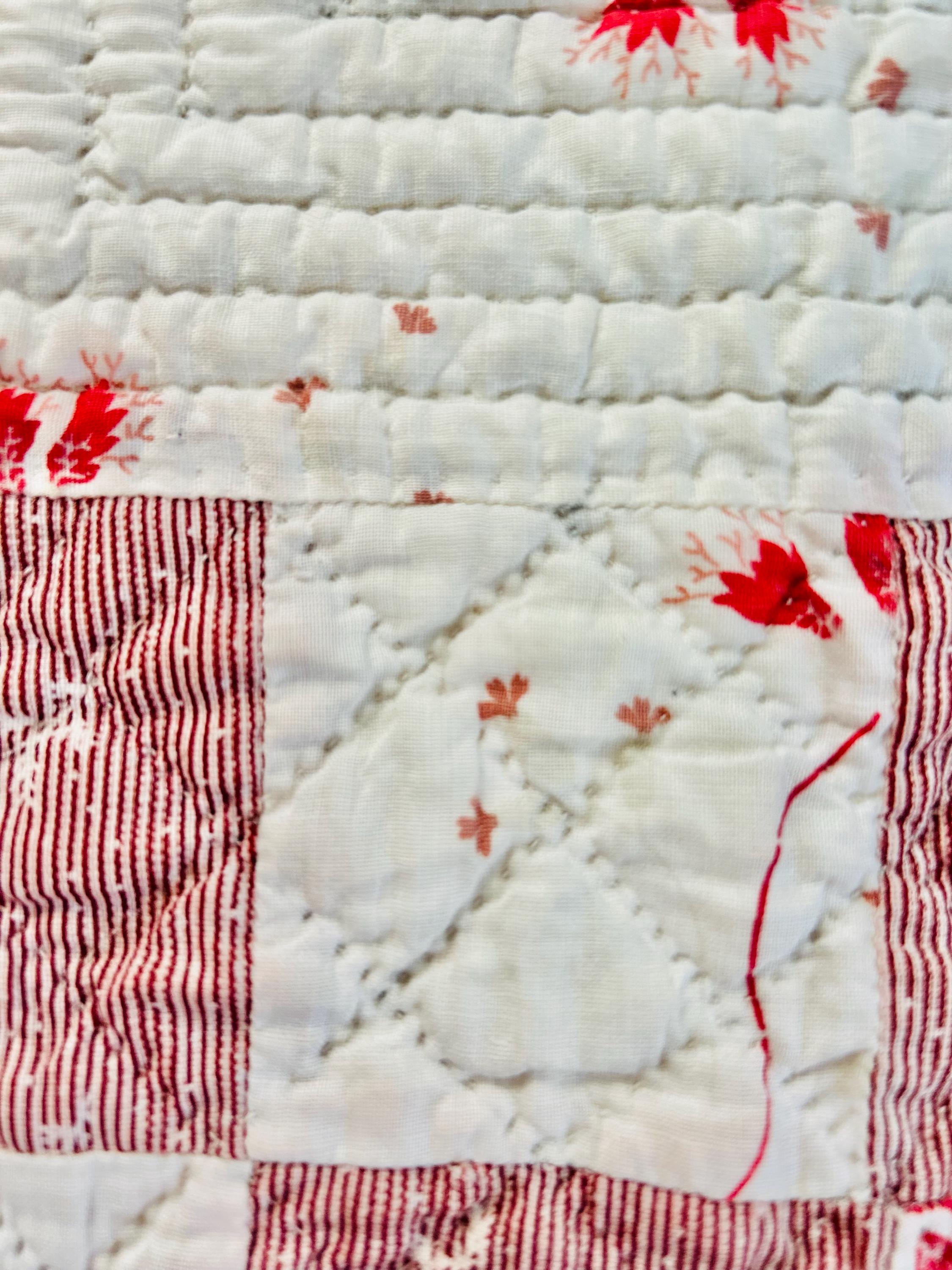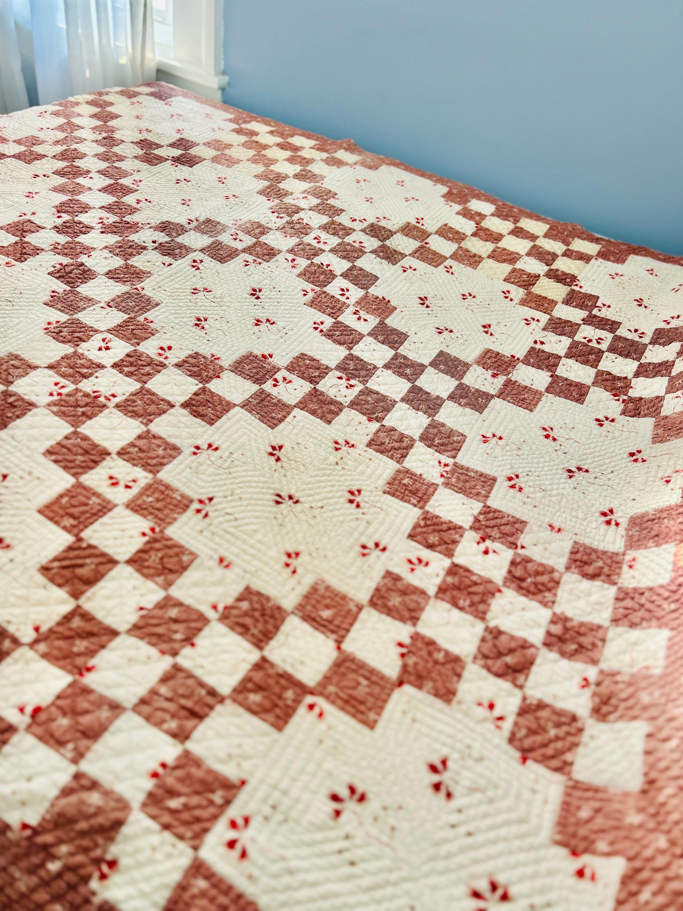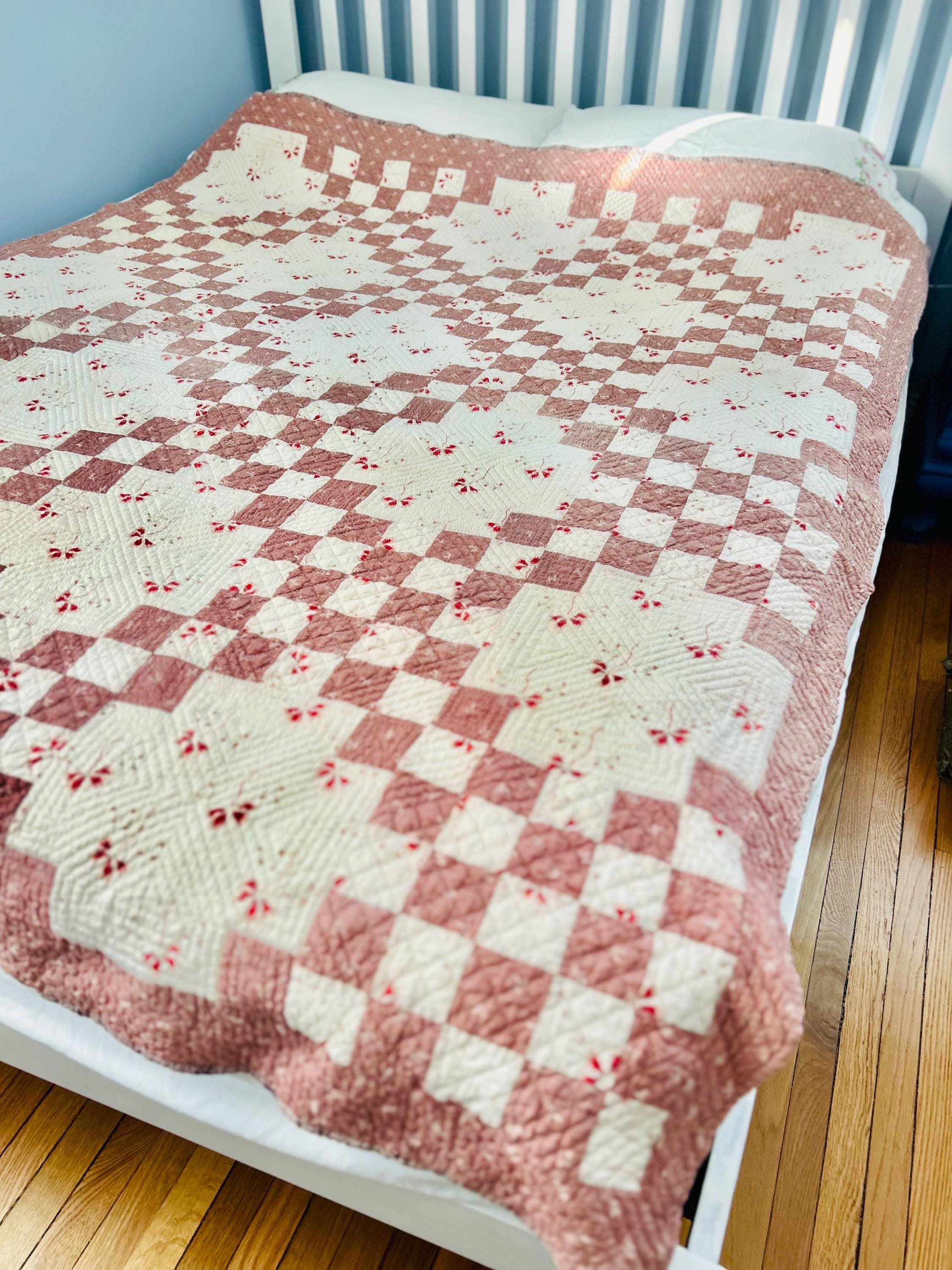 This lovely Double Irish Chain Quilt is circa 1870s-1890s and has been intricately and impressively hand-quilted in tiny diamonds, very narrow lines, double diagonals and concentric triangles. See photos.