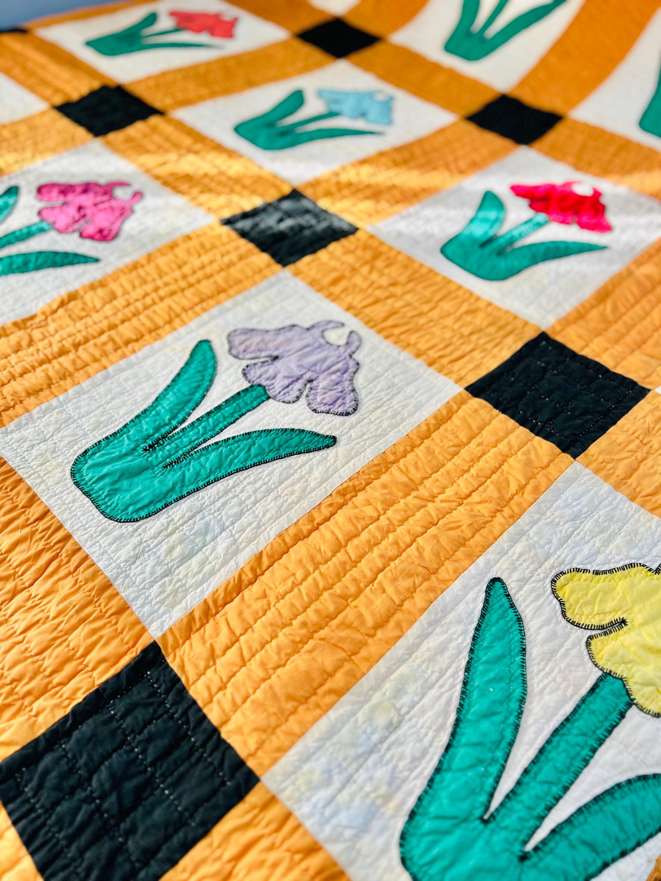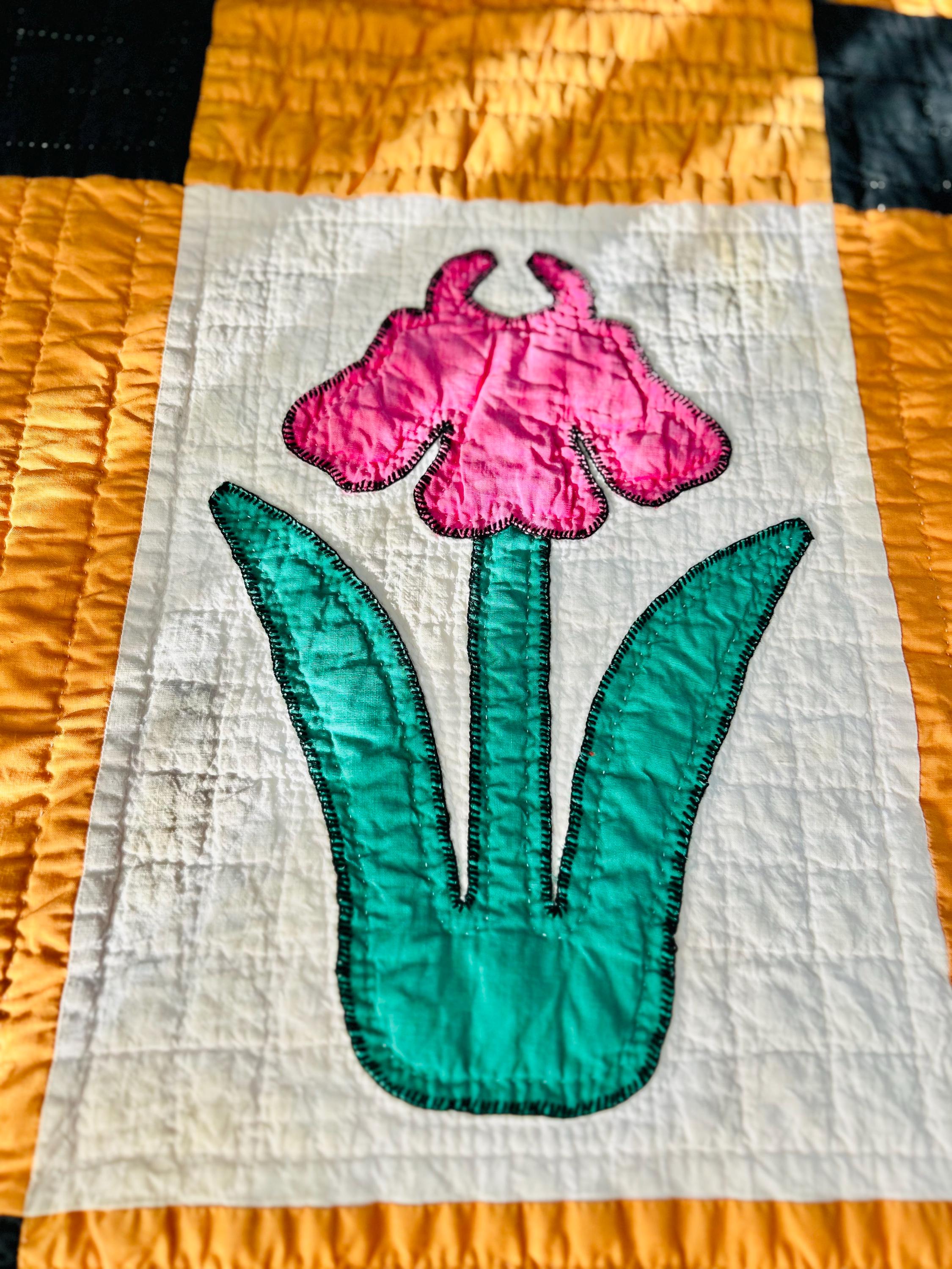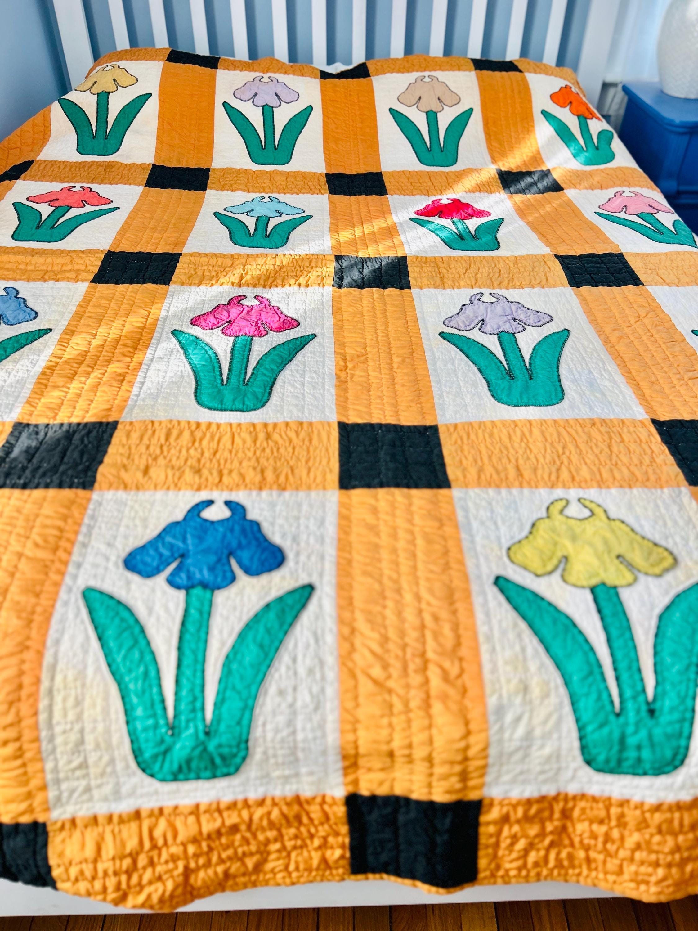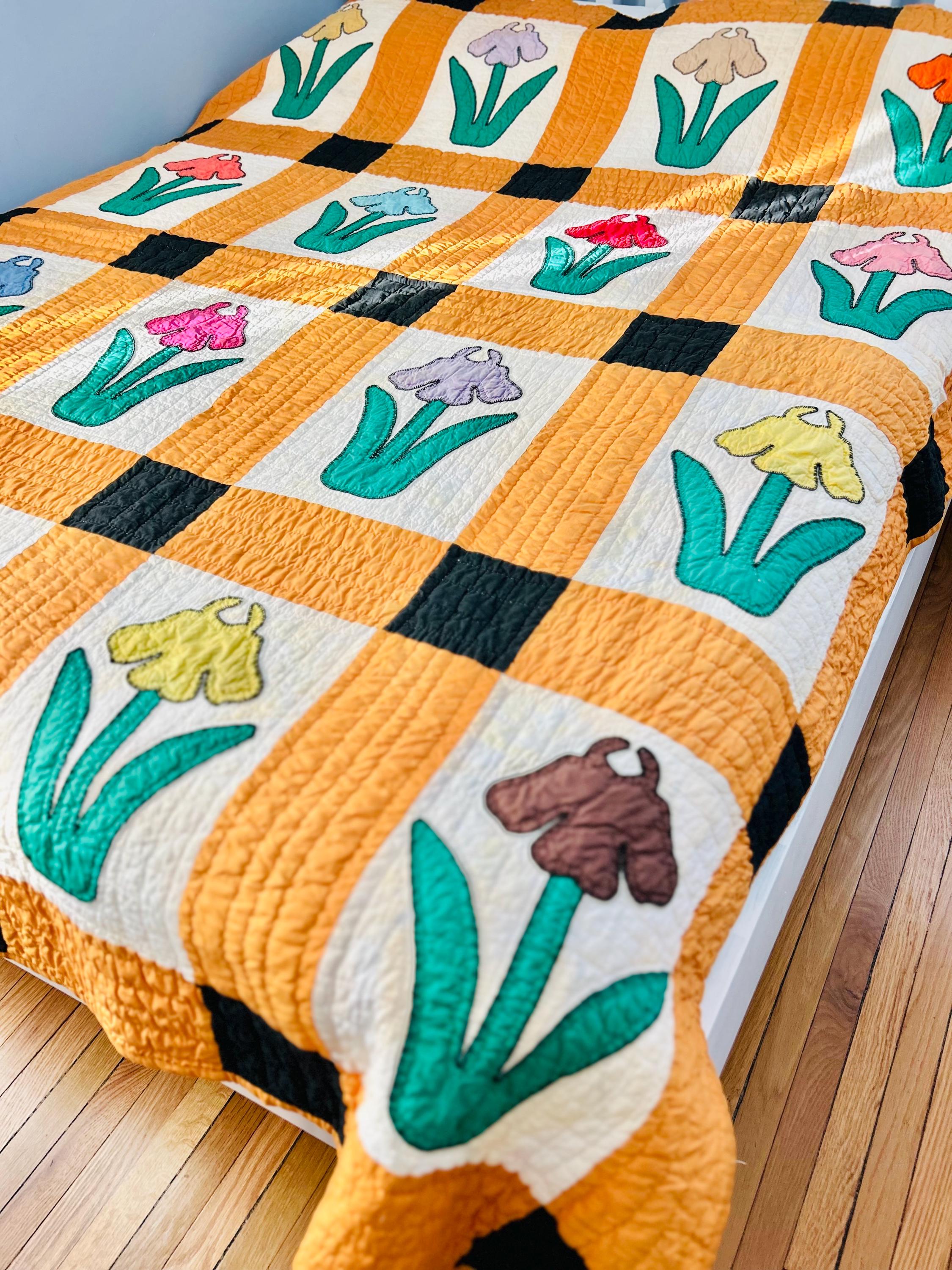 This Iris Flower Quilt, circa 1930s-1940s, has been meticulously hand-quilted and hand-embroidered. The quilting is in tiny stitches and in patterns of diamonds and parallel lines and in outlines of the hand-appliqued Irises. There is a four-sided cheddar and black border that has also been quilted in diamonds and parallel lines.