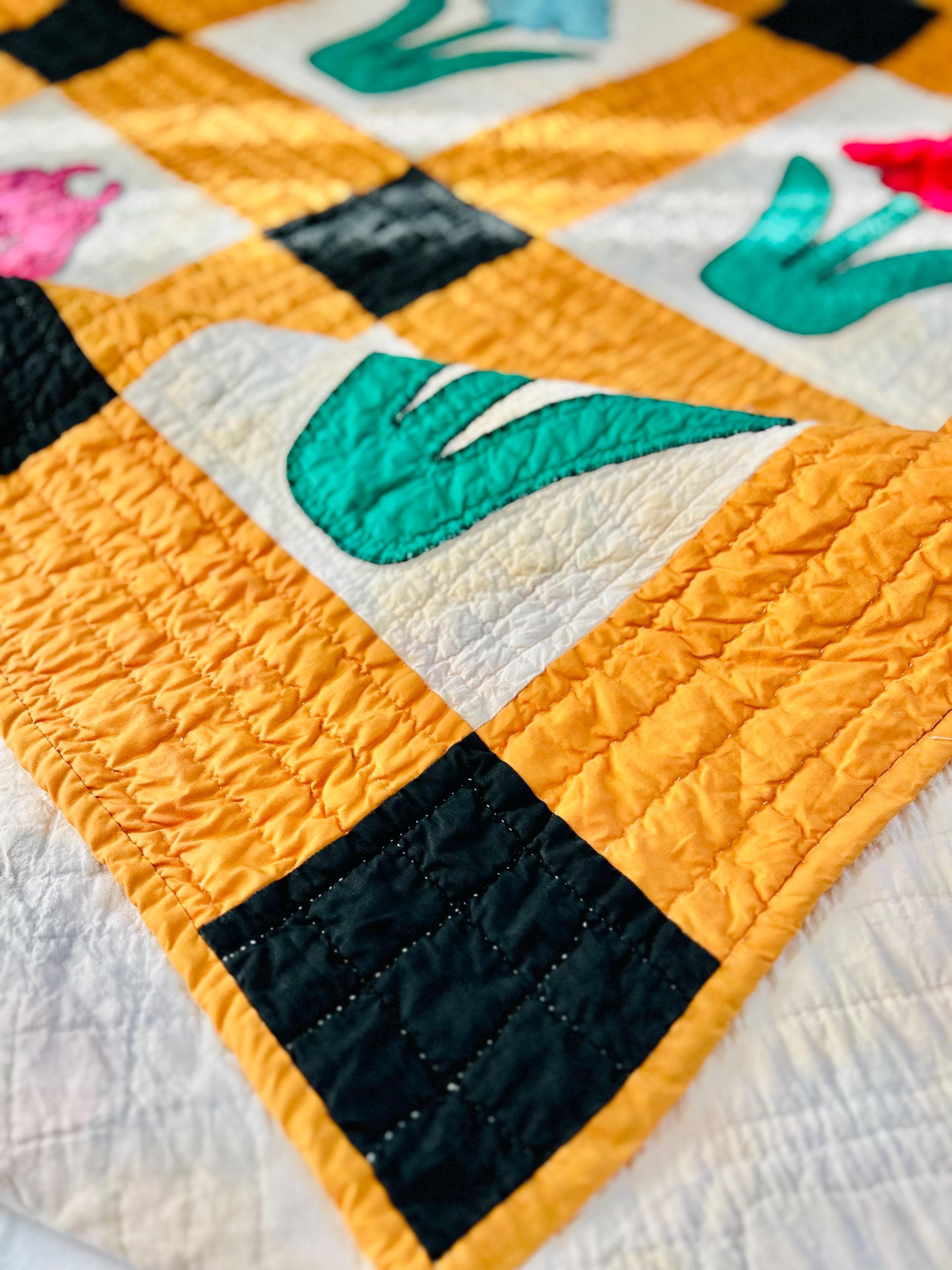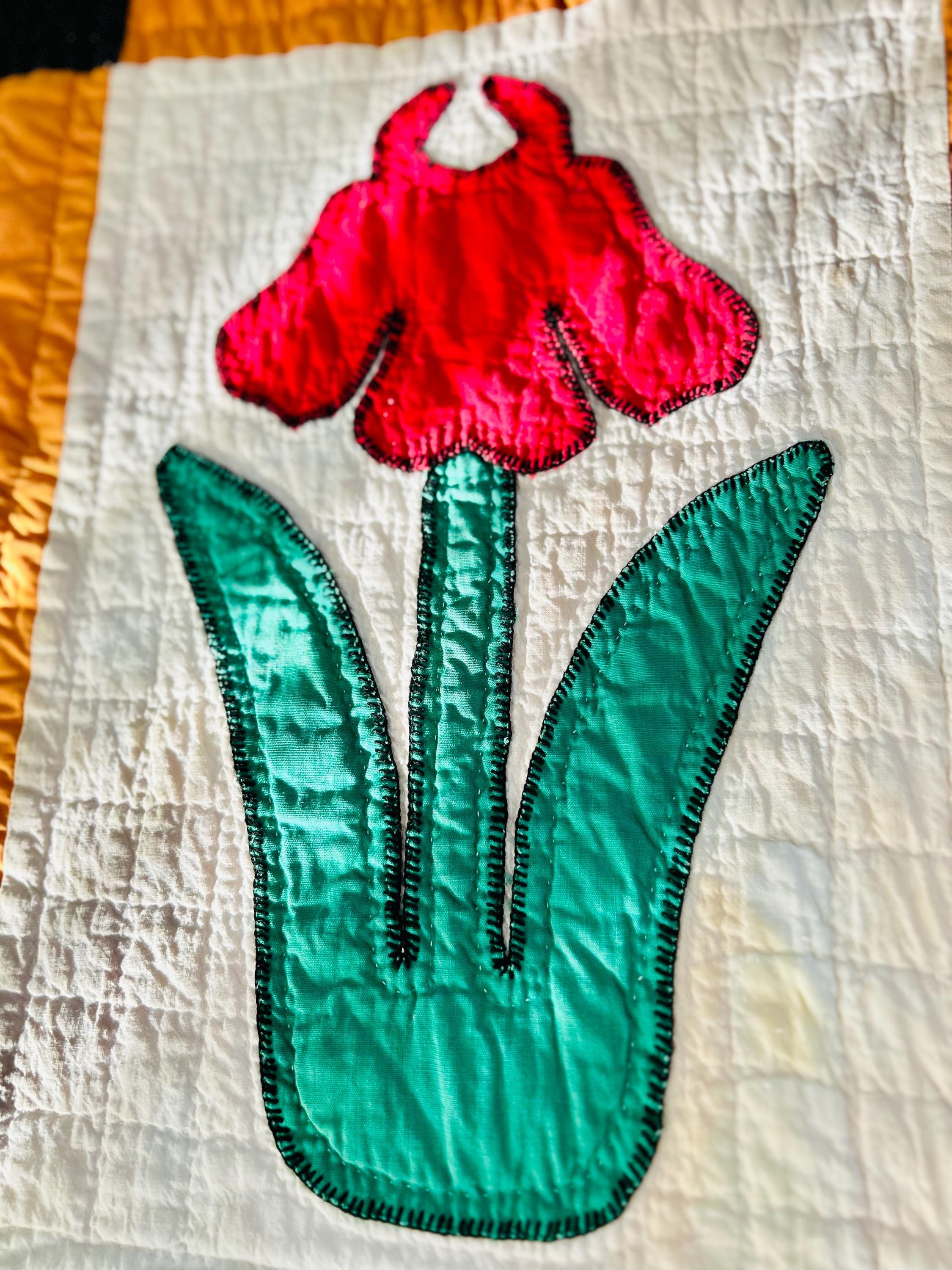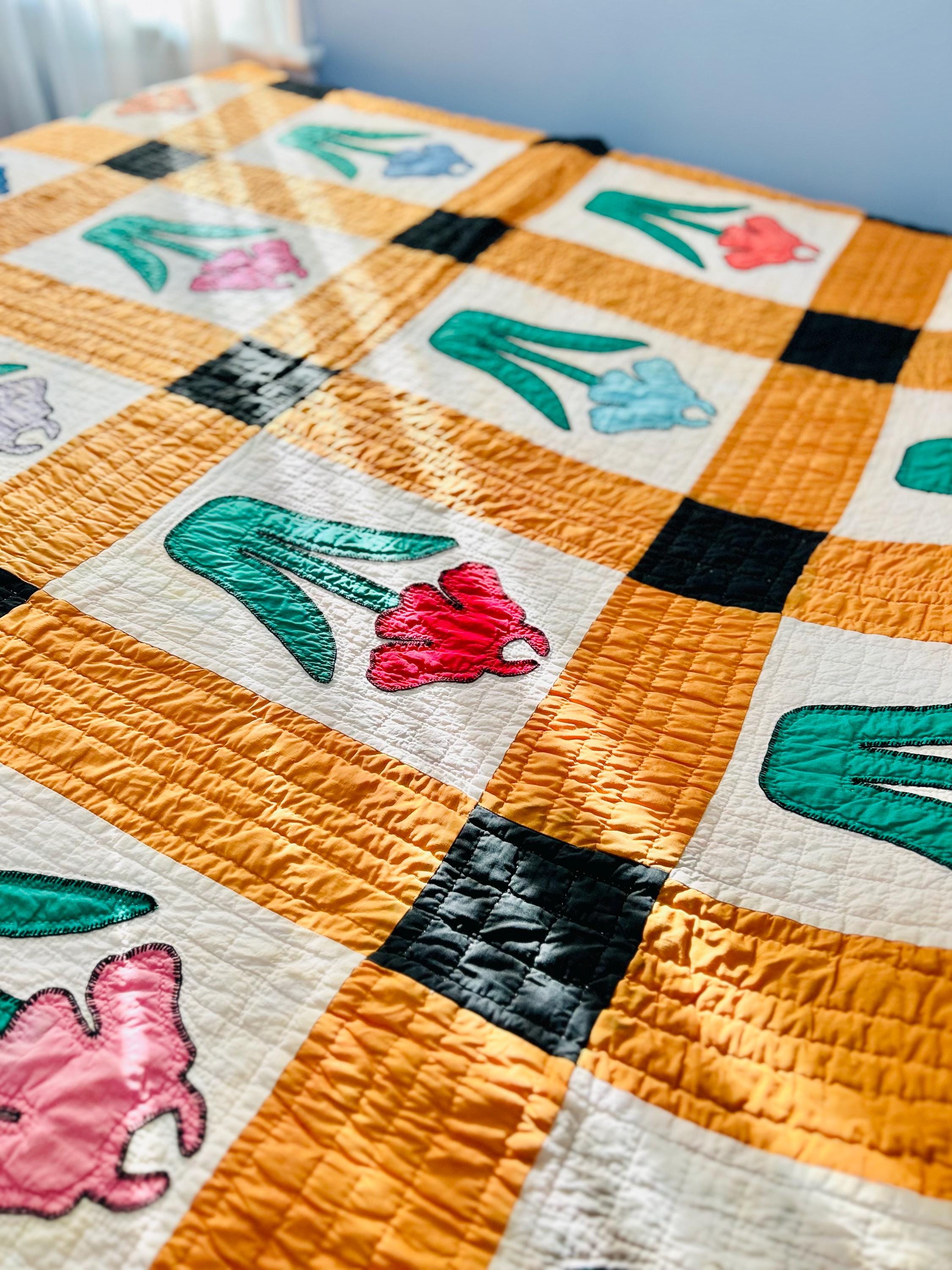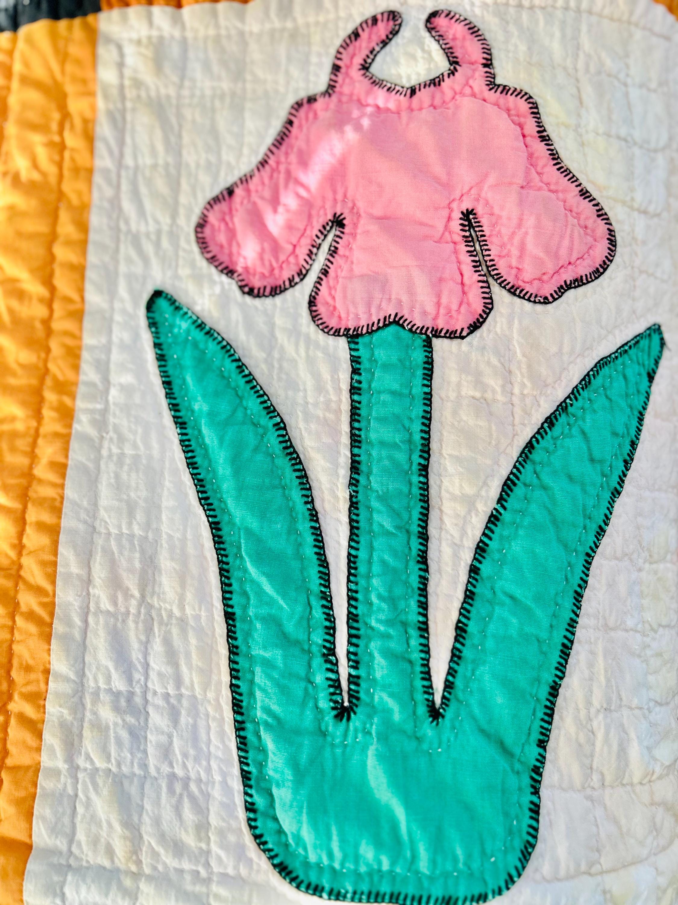 This Iris Flower Quilt, circa 1930s-1940s, has been meticulously hand-quilted and hand-embroidered. The quilting is in tiny stitches and in patterns of diamonds and parallel lines and in outlines of the hand-appliqued Irises. There is a four-sided cheddar and black border that has also been quilted in diamonds and parallel lines.