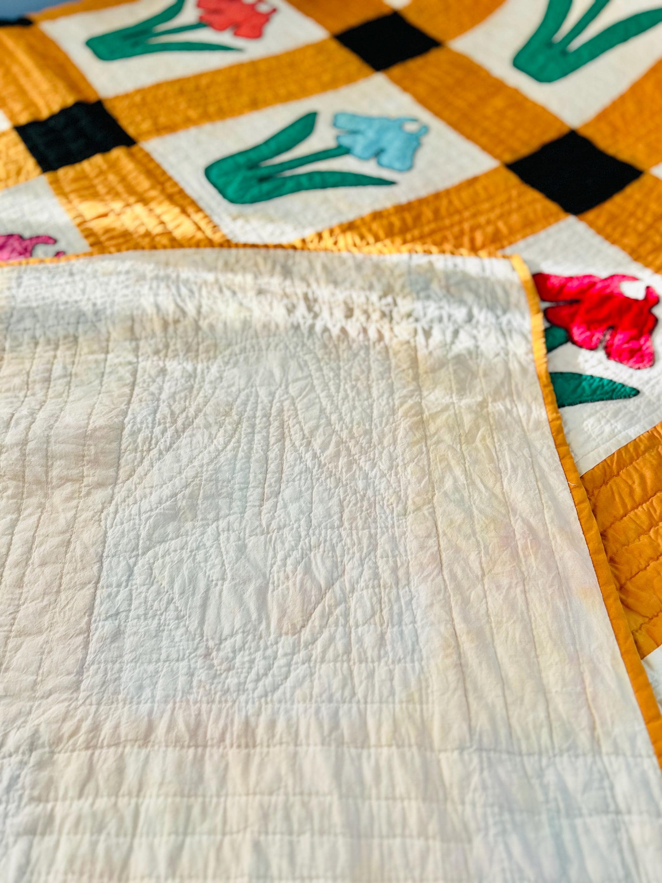 The quilt is in excellent condition with some very light orange color transfer to some of the flower blocks and what appears to be spots of black color transfer to the back in one corner.