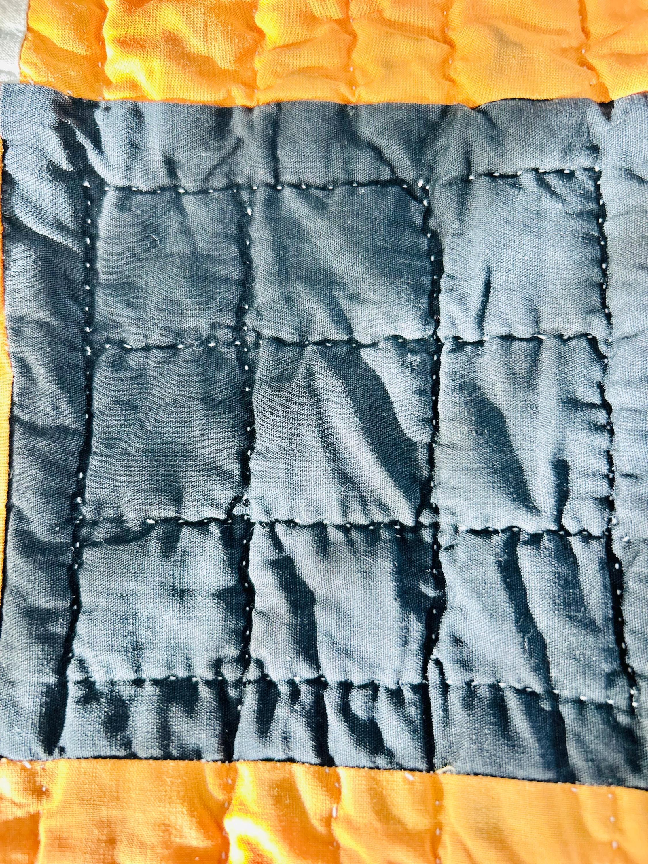 The back is white cotton while the binding is cheddar cotton that has been machine stitched to the front and hand-stitched to the back. The cotton batting is lightweight.