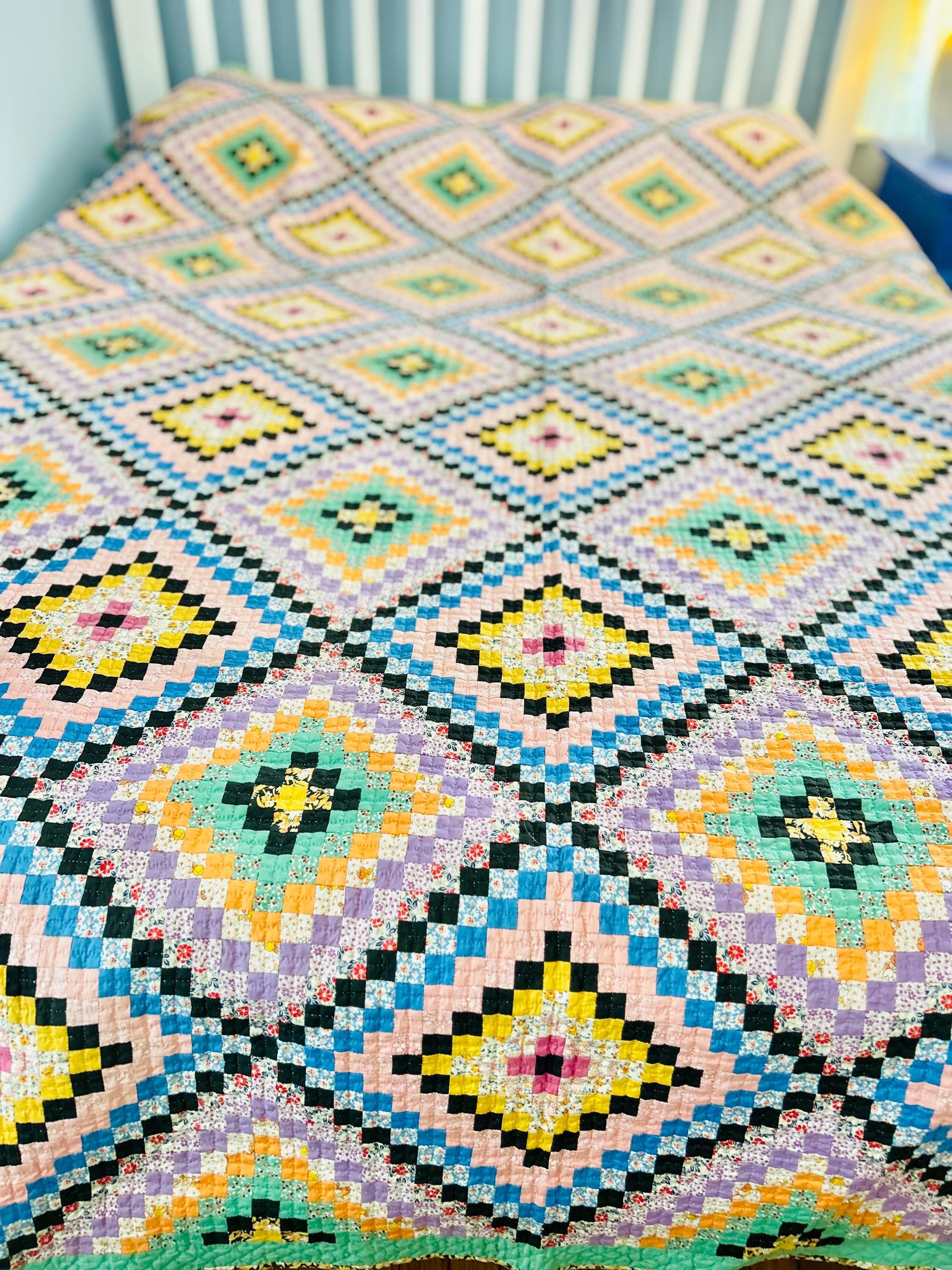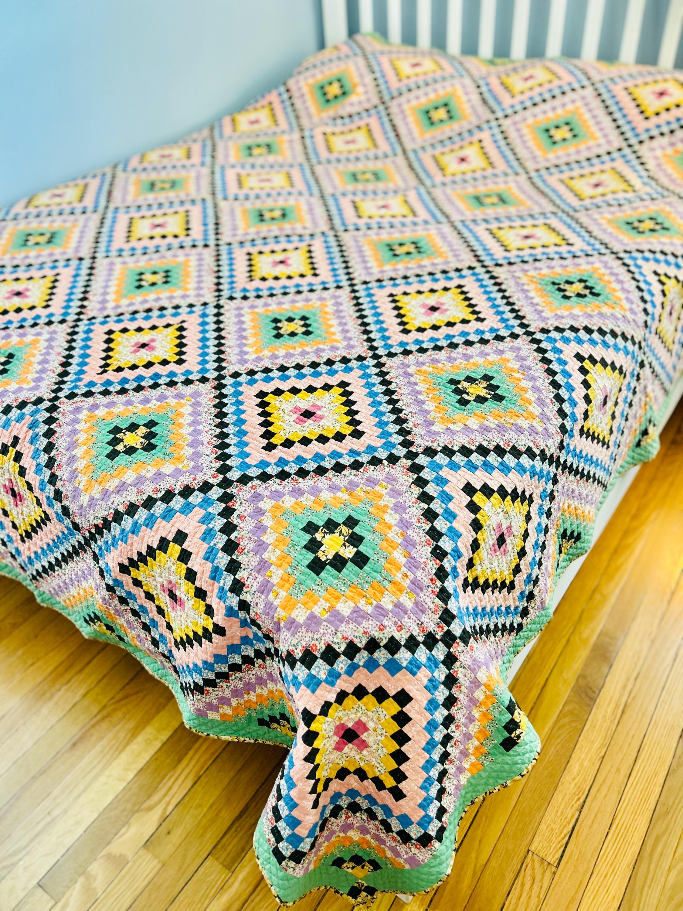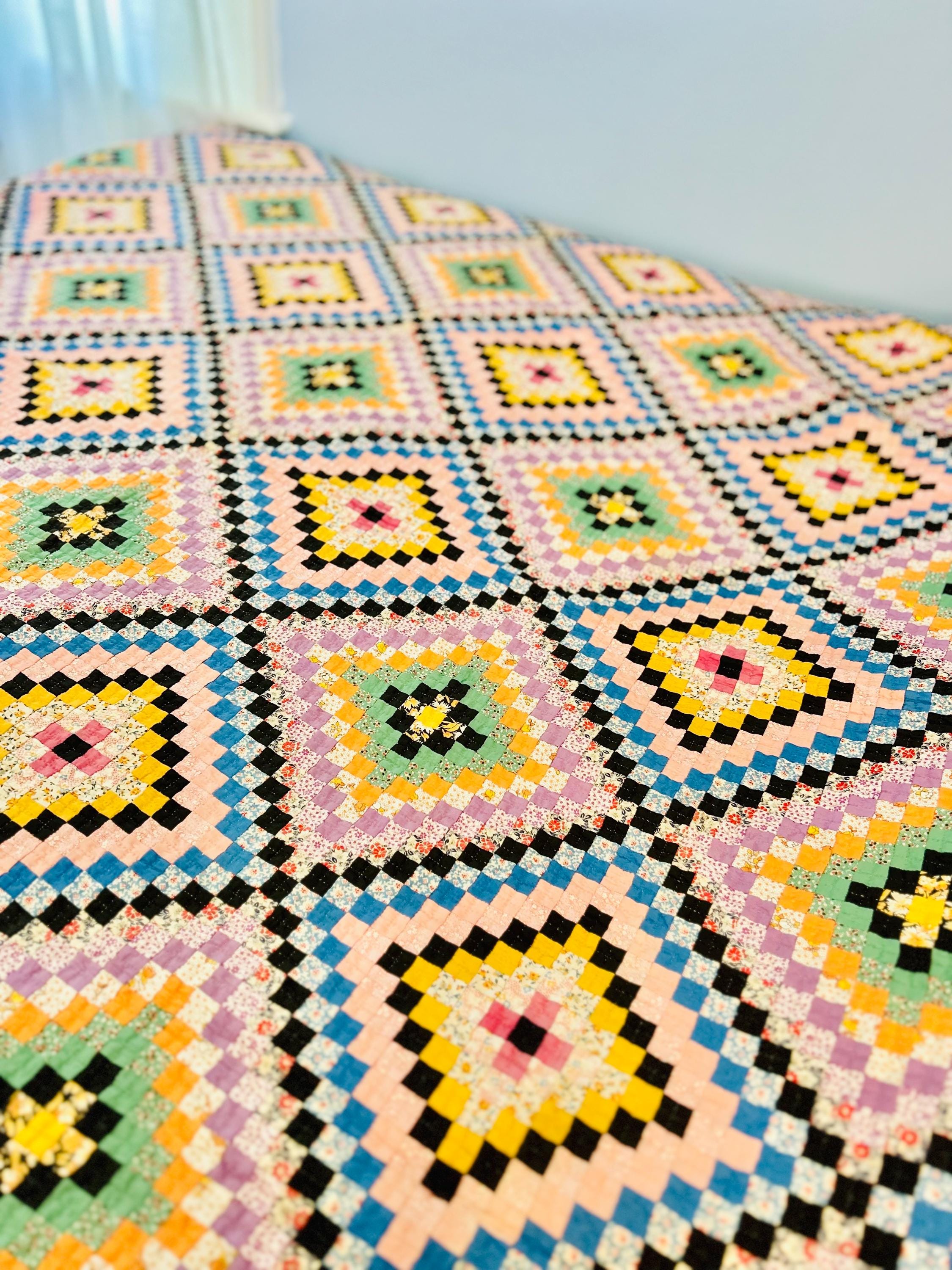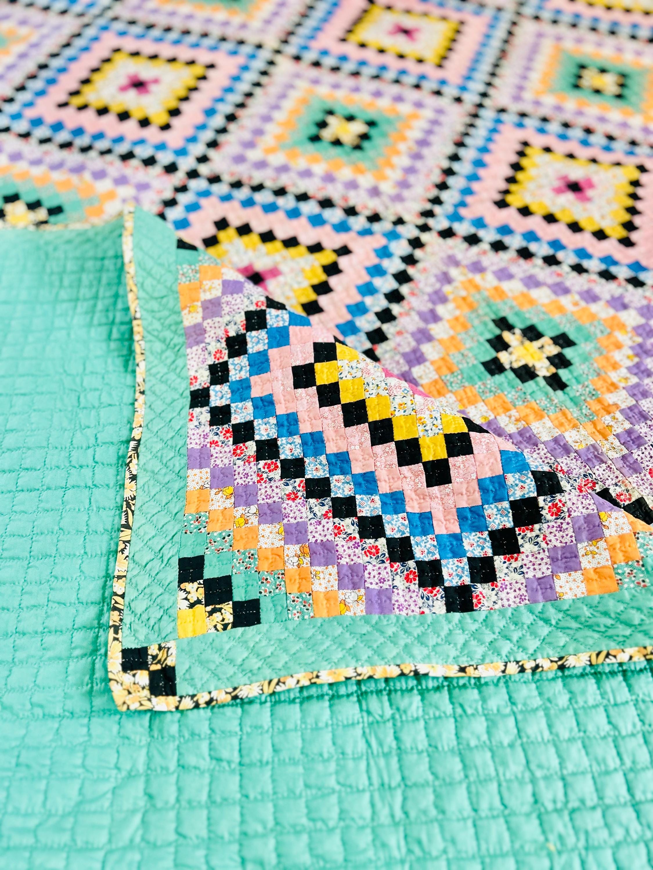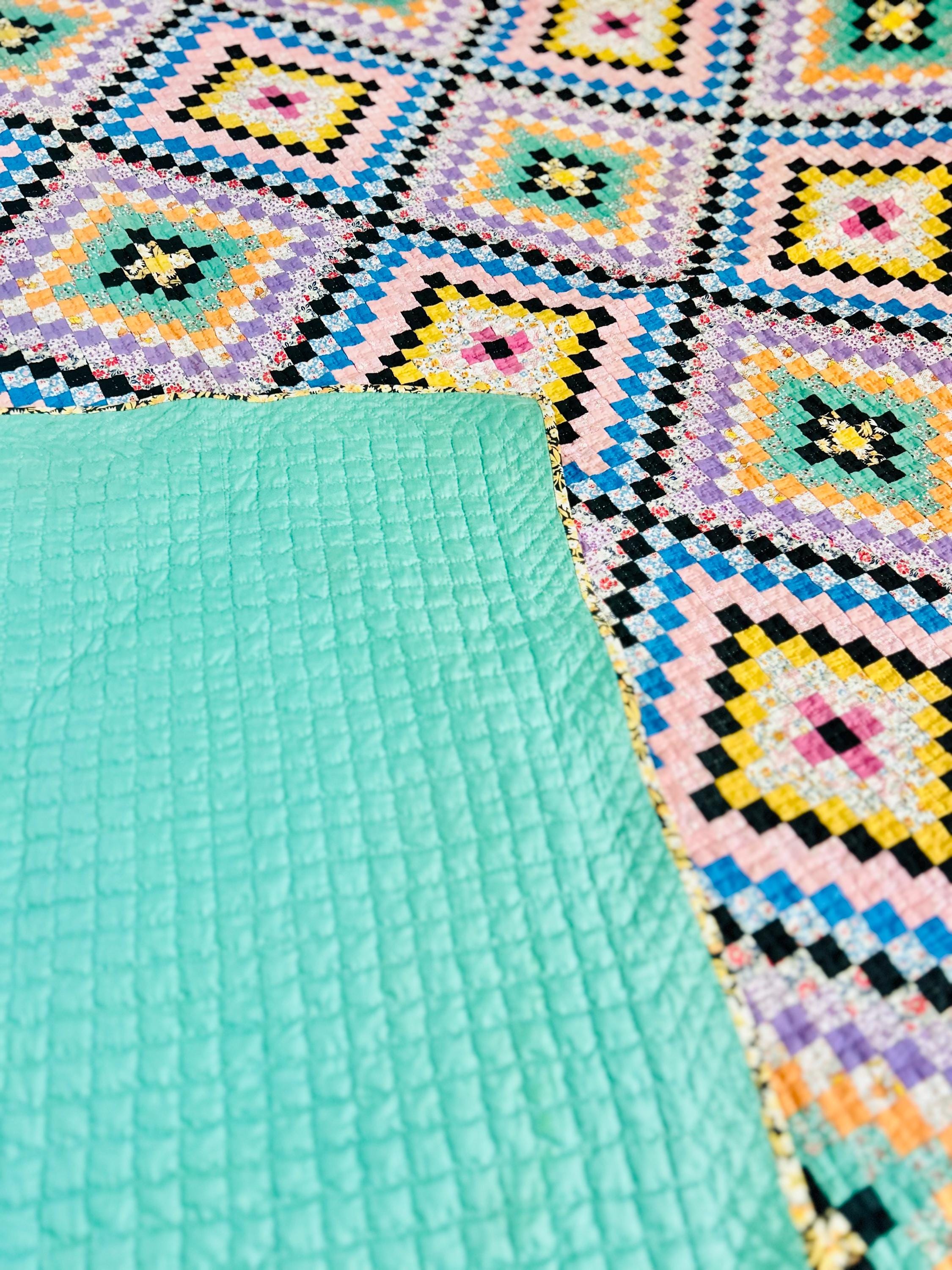 This is a lovely Granny Square Quilt, circa 1890-1910, and has been hand-stitched and hand-quilted. The patchwork squares are tiny - 3/4-inch -- and there are more than 4,000 of them. The hand-quilting is in tiny stitches in precise crisscrosses through the patchwork and in very small diamonds along the four-sided green border.