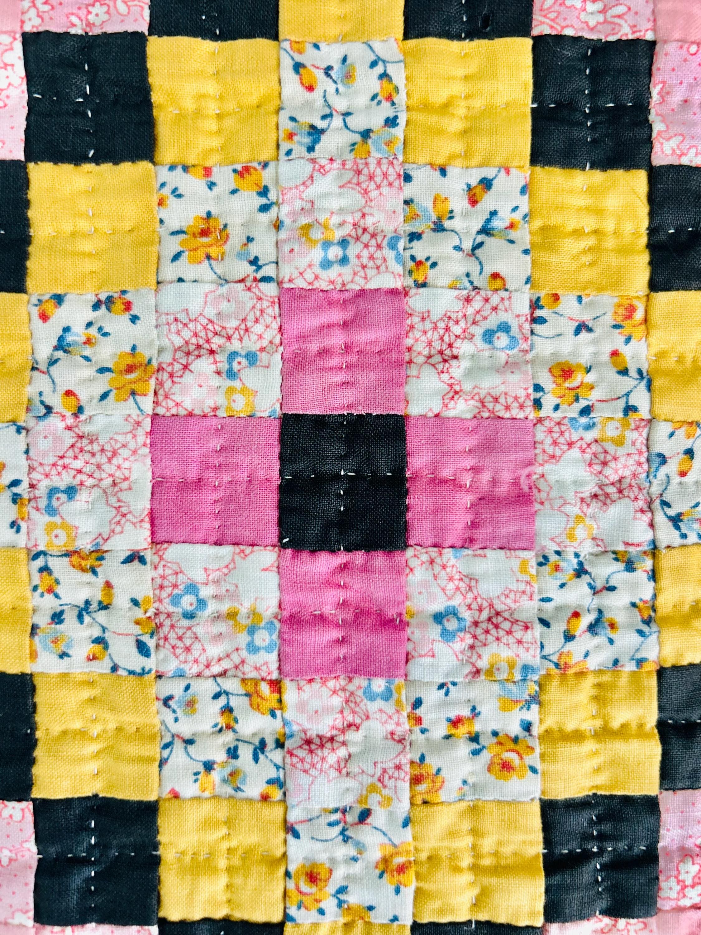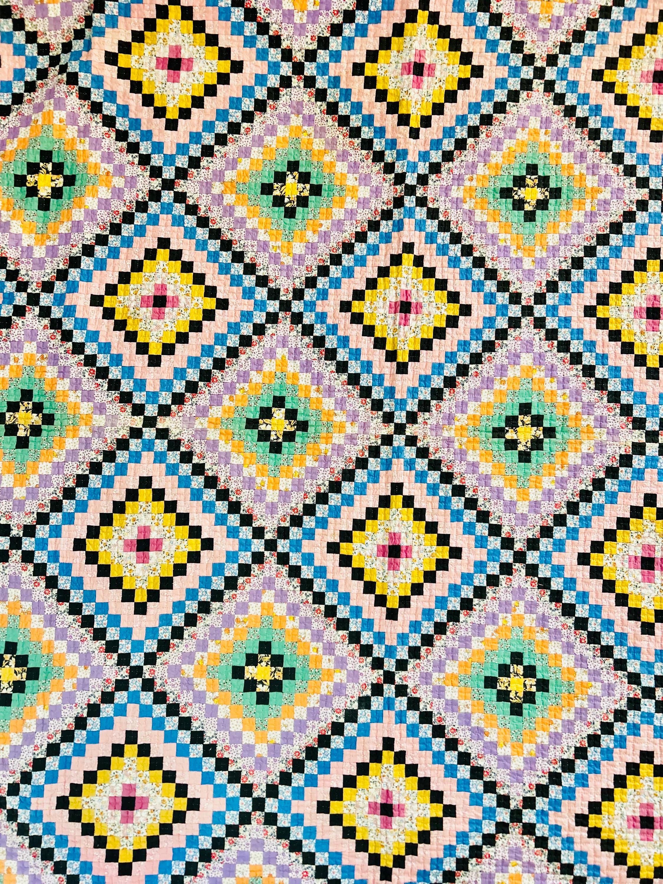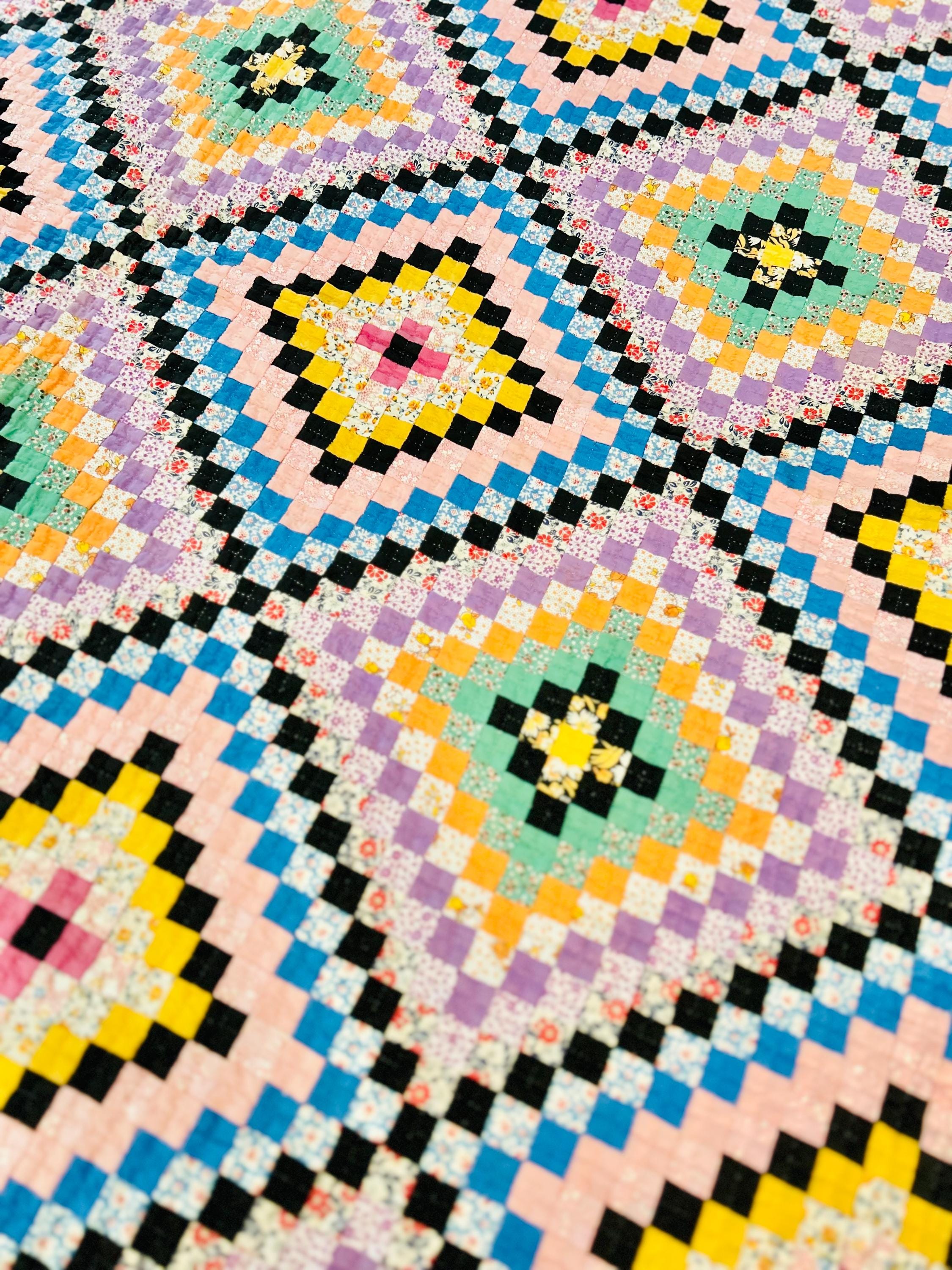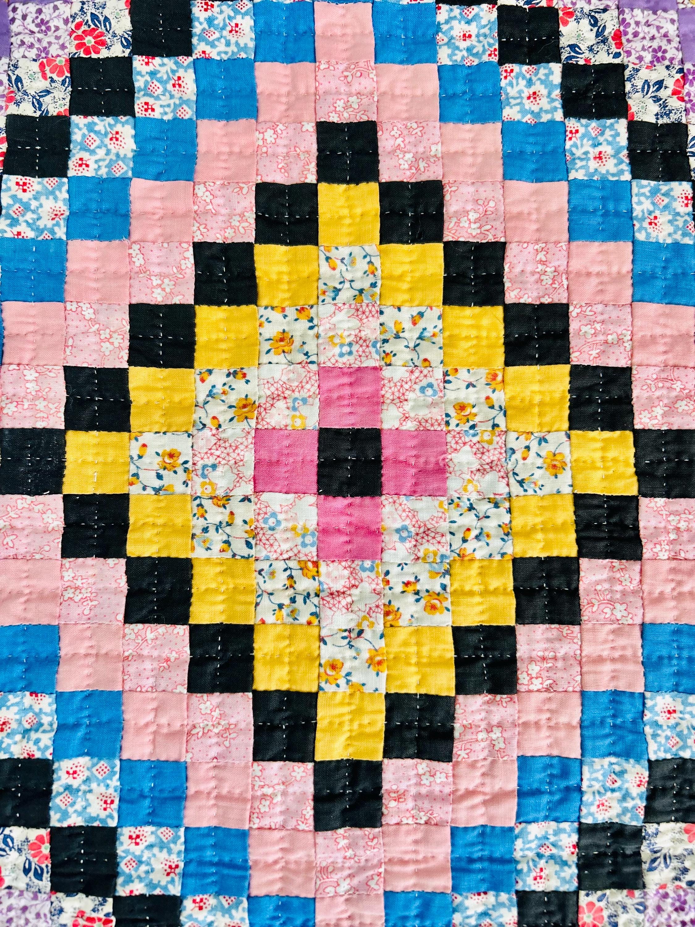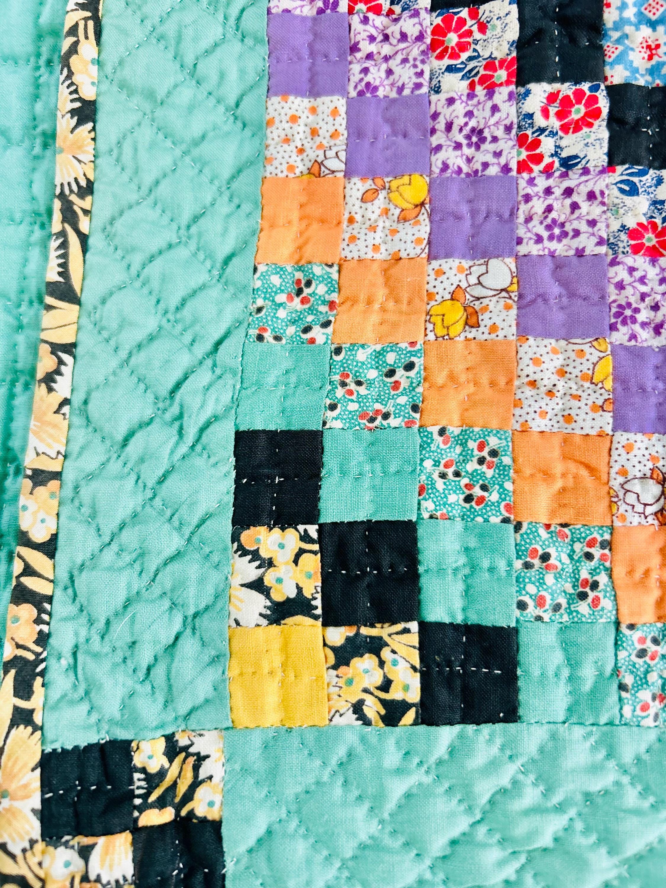 This is a lovely Granny Square Quilt, circa 1890-1910, and has been hand-stitched and hand-quilted. The patchwork squares are tiny - 3/4-inch -- and there are more than 4,000 of them. The hand-quilting is in tiny stitches in precise crisscrosses through the patchwork and in very small diamonds along the four-sided green border.