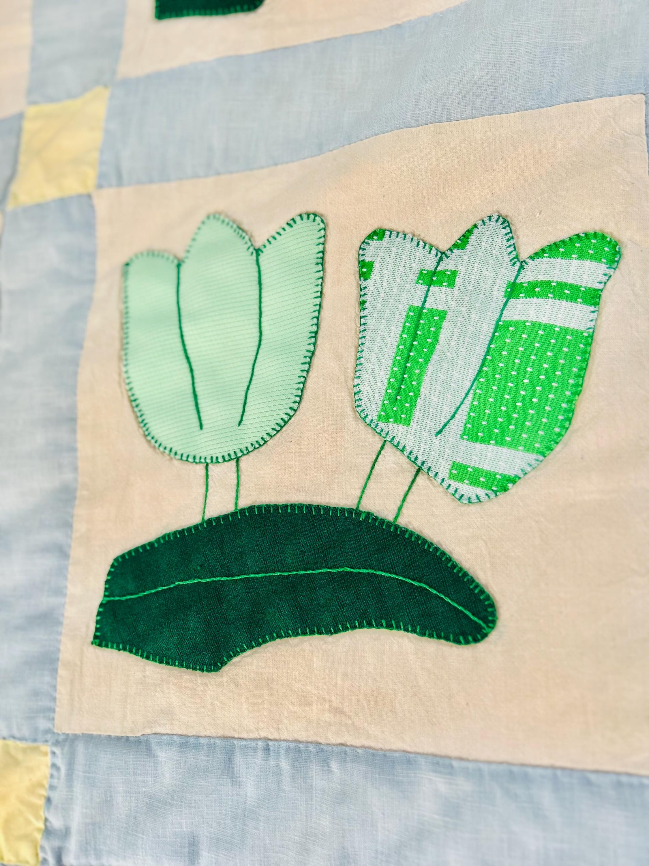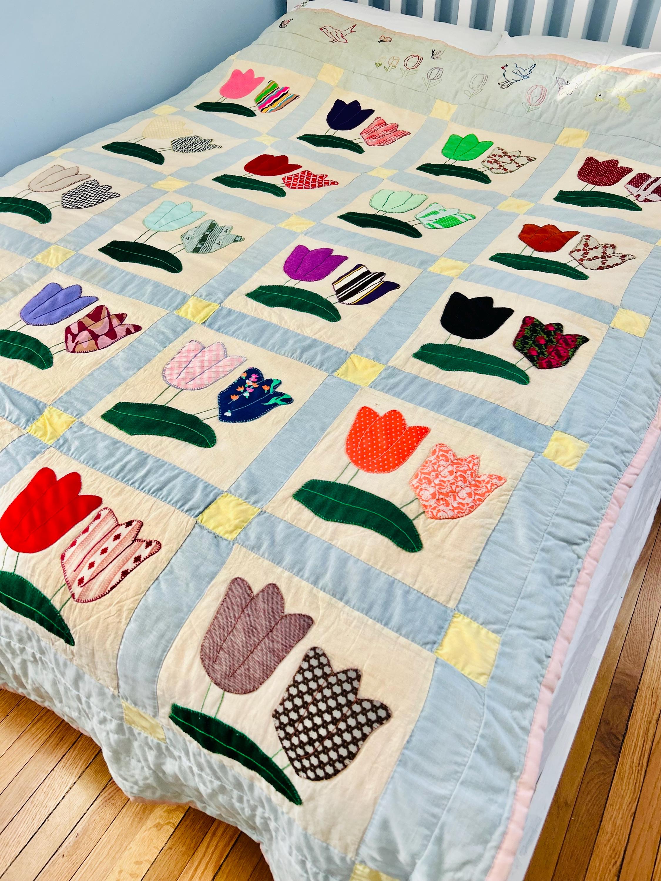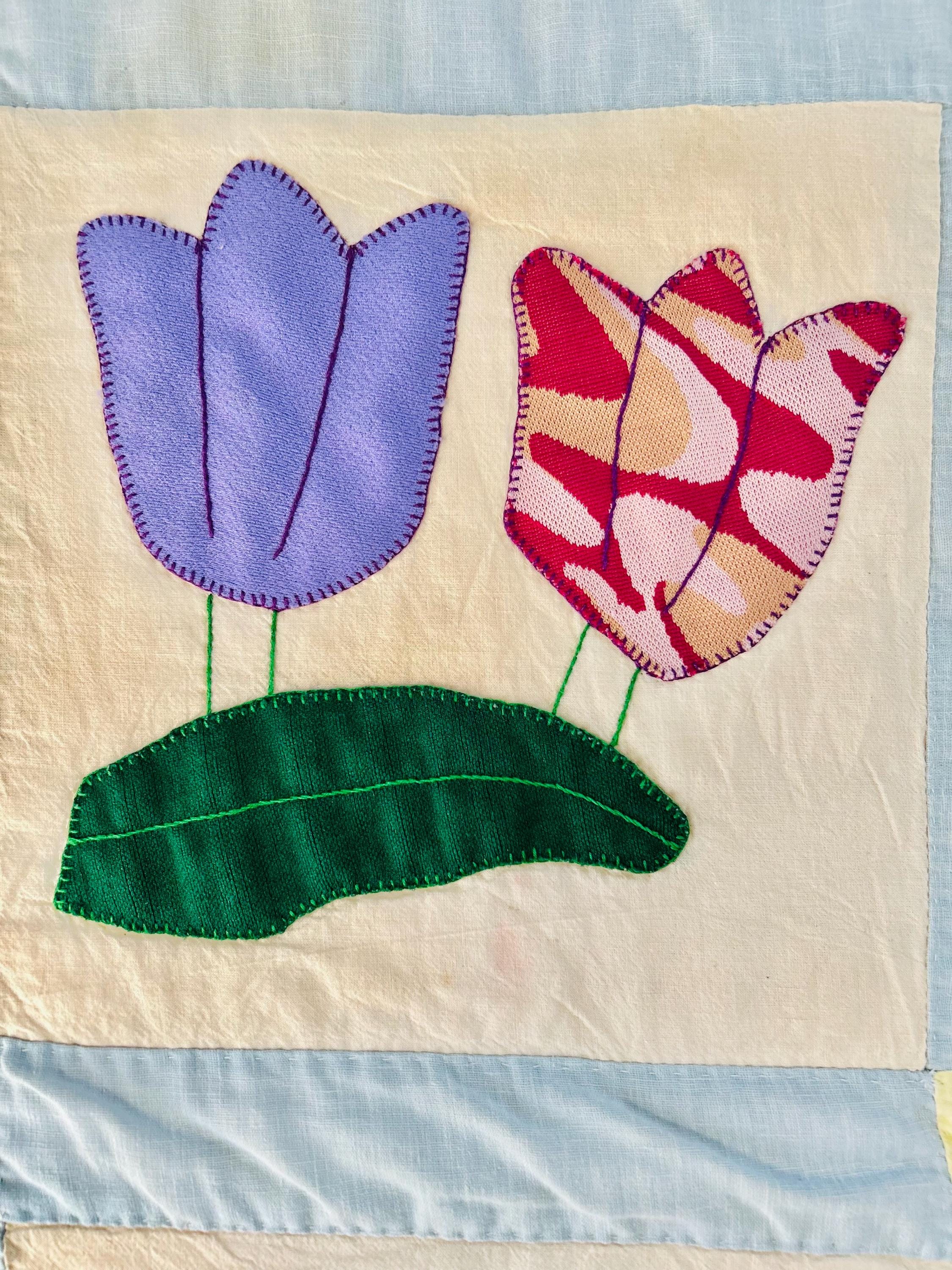 This Tulip Quilt has been signed and dated April 1983 and is made of cotton with polyester tulips that have been hand-appliqued and hand-embroidered. The quilting is also by hand and is in swirls along the top and bottom borders, in outlines of the applique squares and in straight lines all around the edging. The top border has also been embroidered with birds, butterflies and flowers.