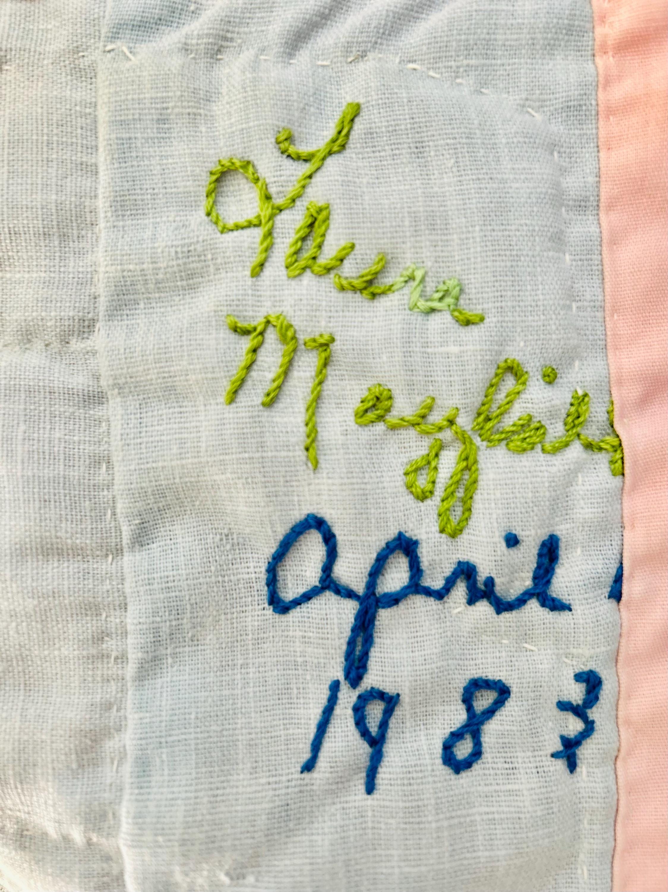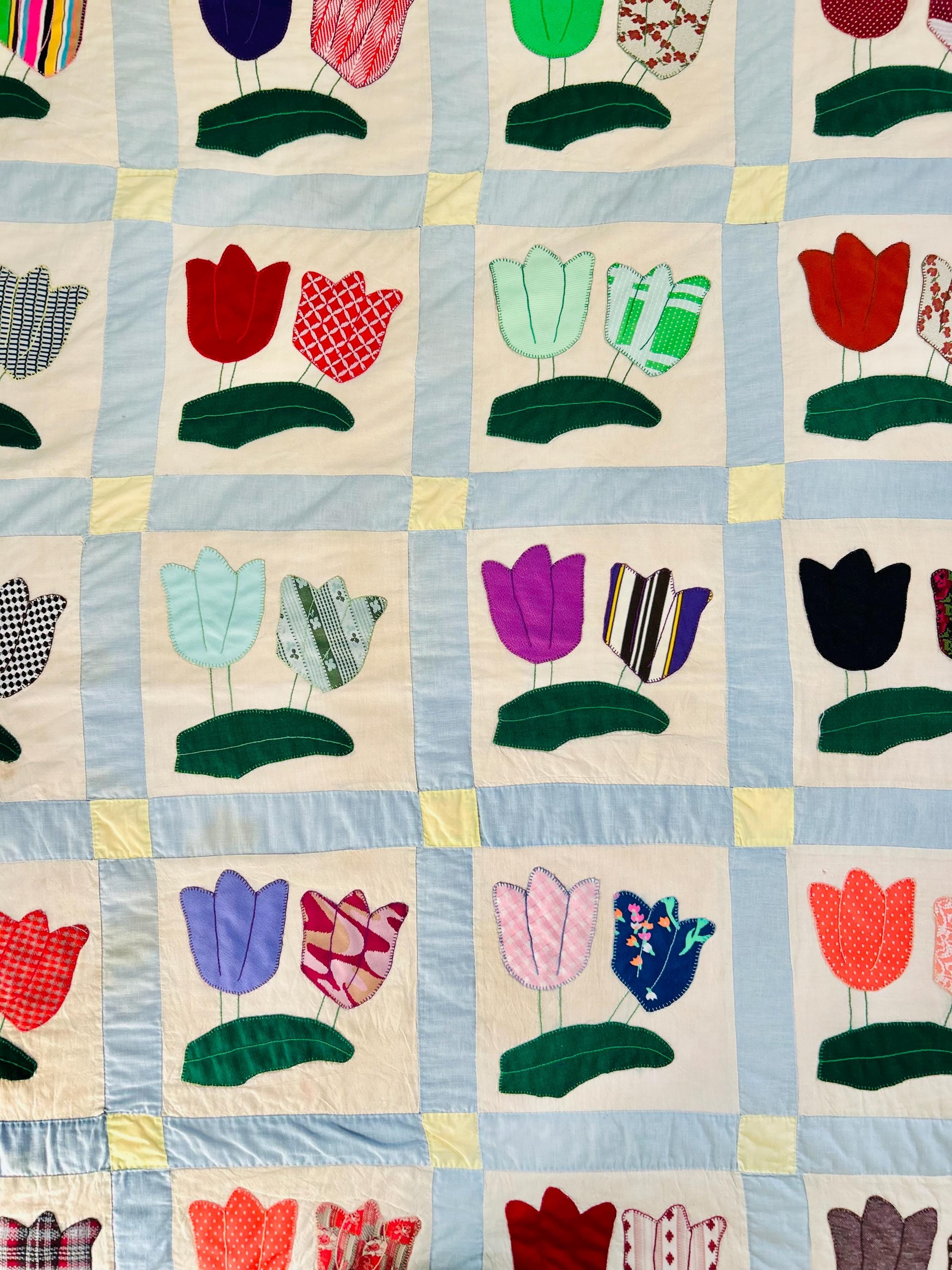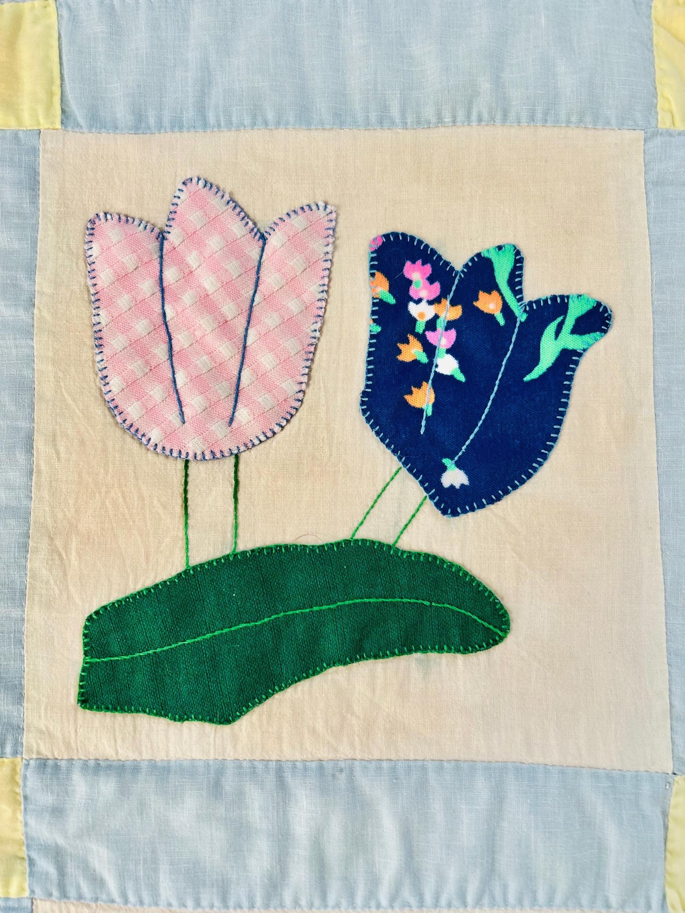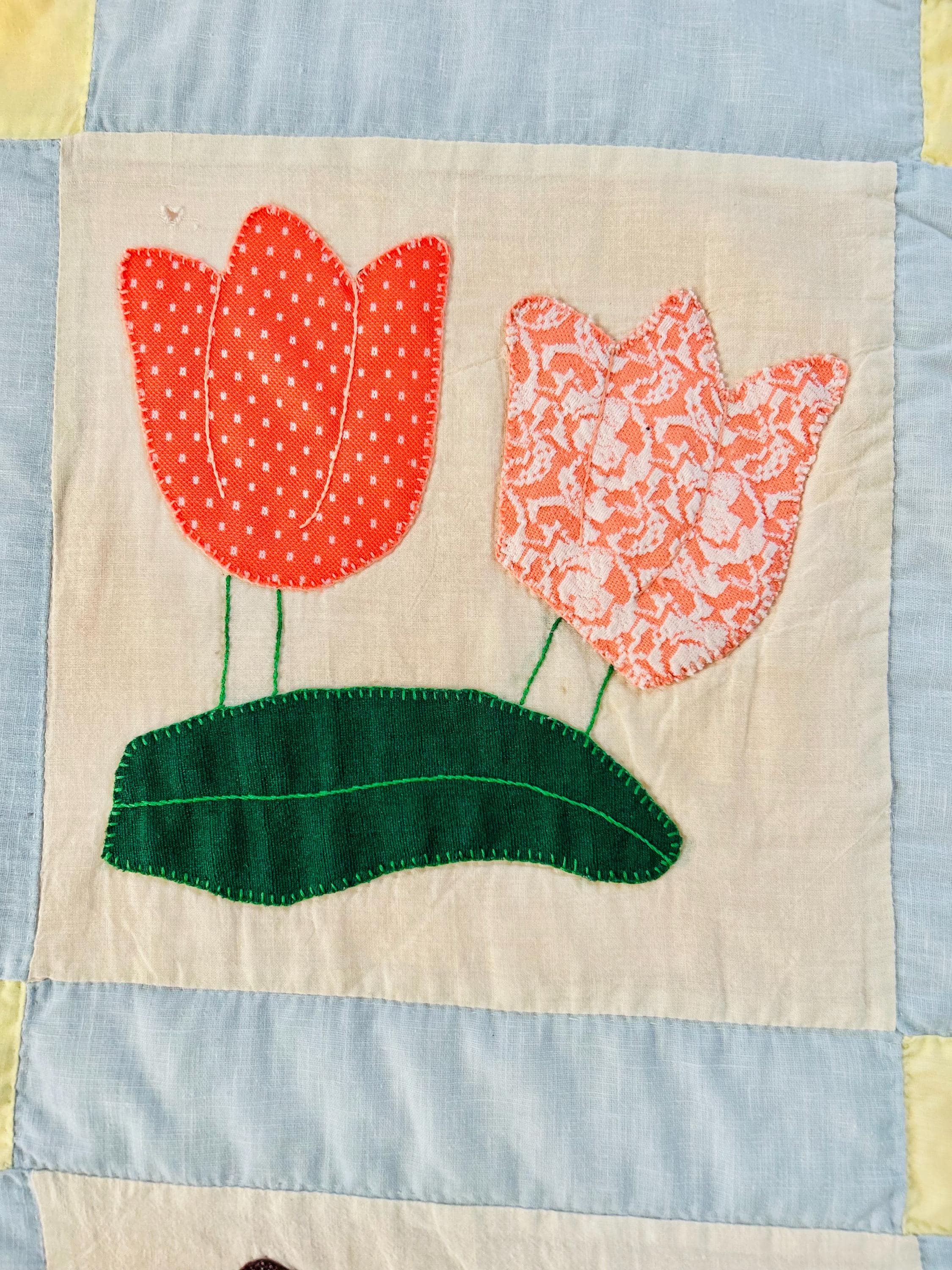 This Tulip Quilt has been signed and dated April 1983 and is made of cotton with polyester tulips that have been hand-appliqued and hand-embroidered. The quilting is also by hand and is in swirls along the top and bottom borders, in outlines of the applique squares and in straight lines all around the edging. The top border has also been embroidered with birds, butterflies and flowers.