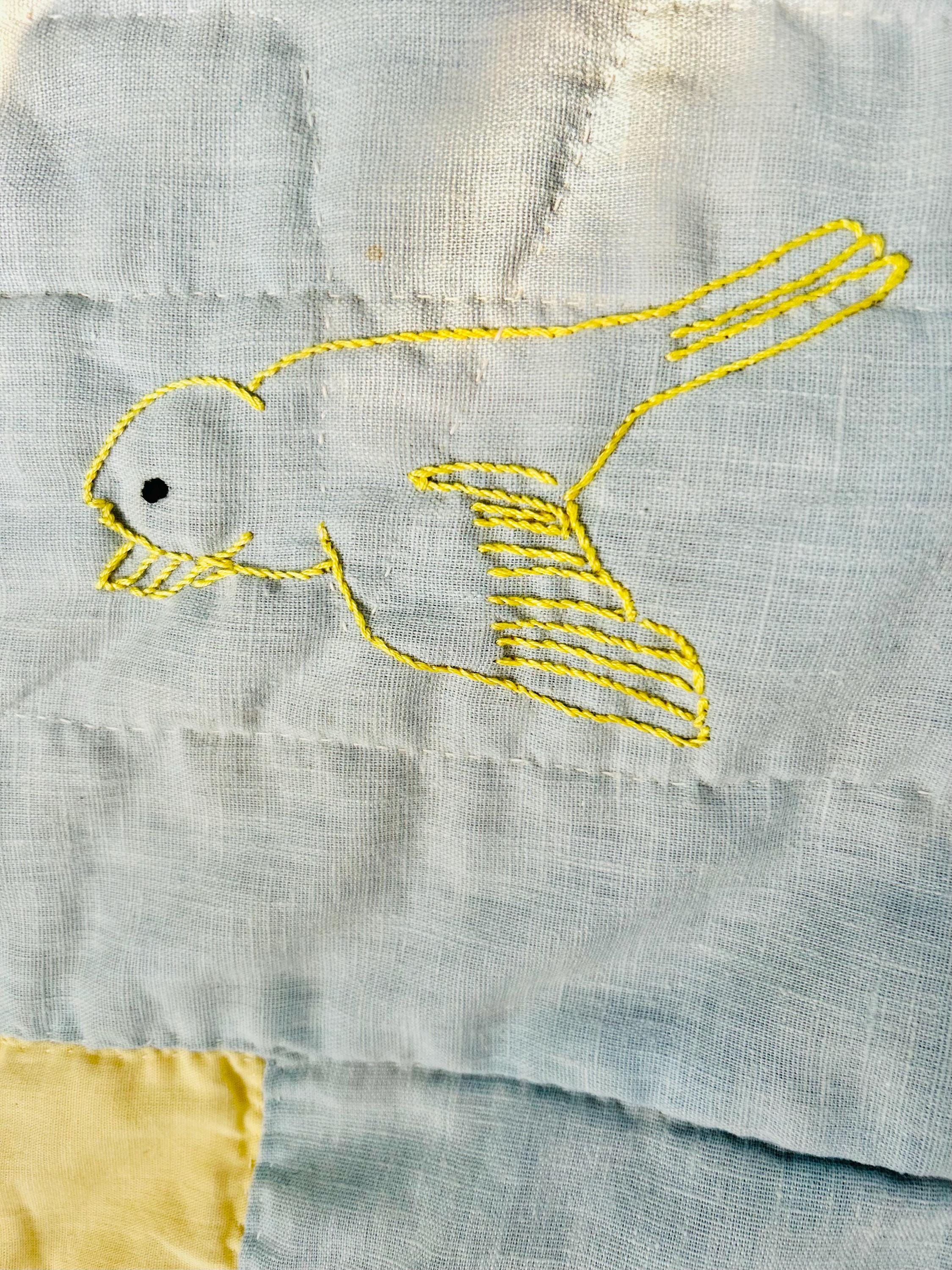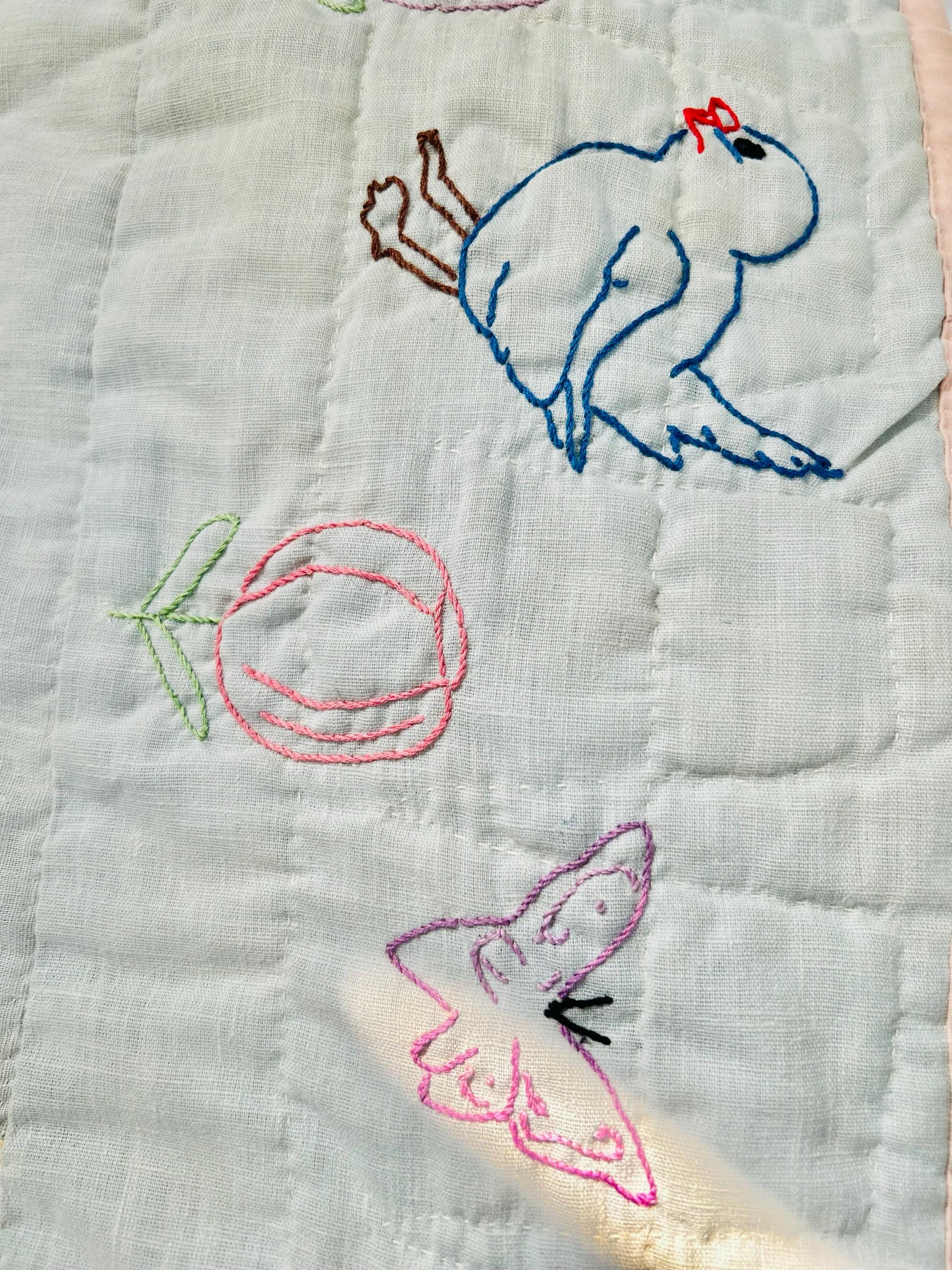 The back is pink cotton that has been turned to the front and hand-stitched to form the binding. The batting is very lightweight.