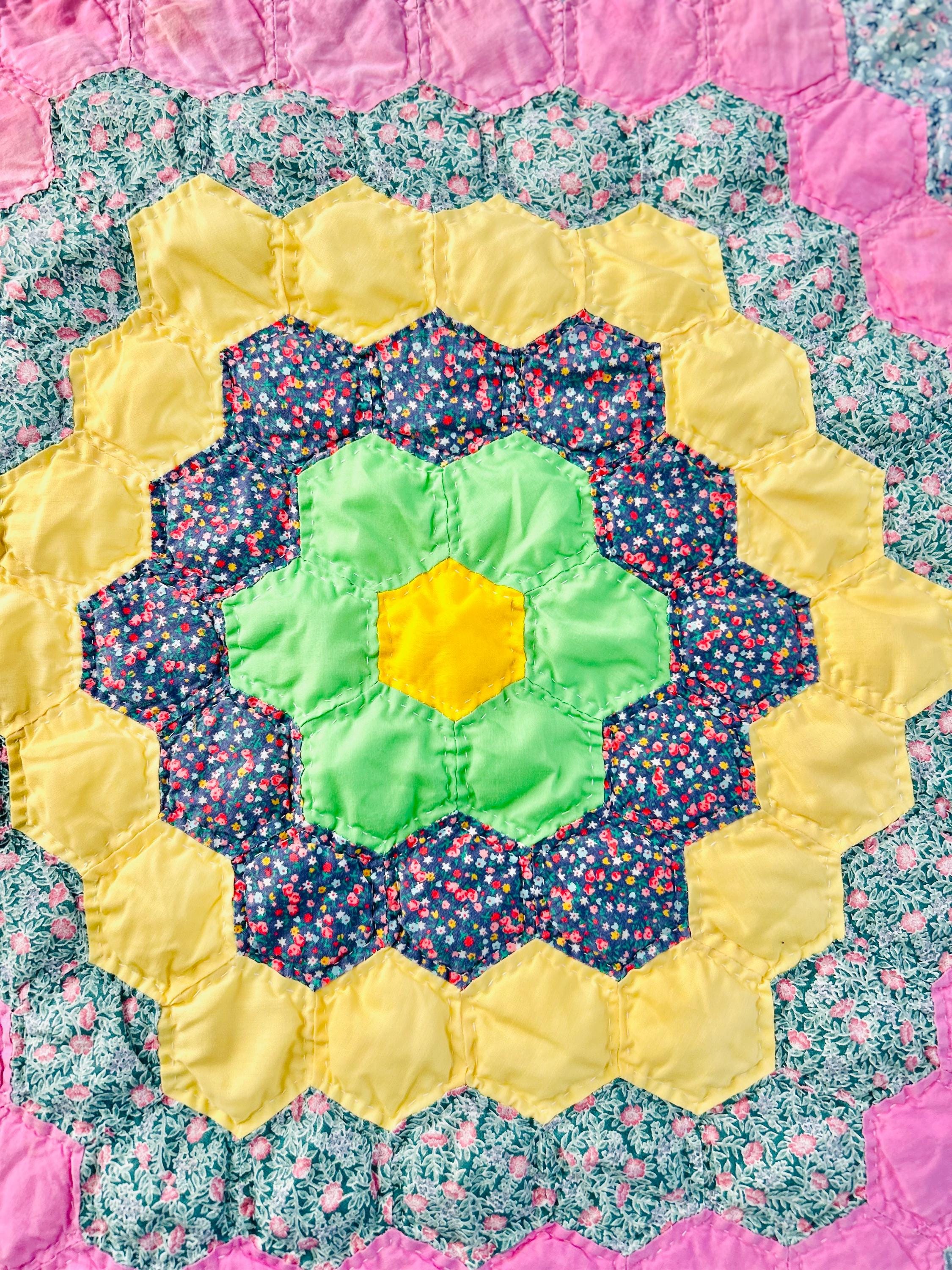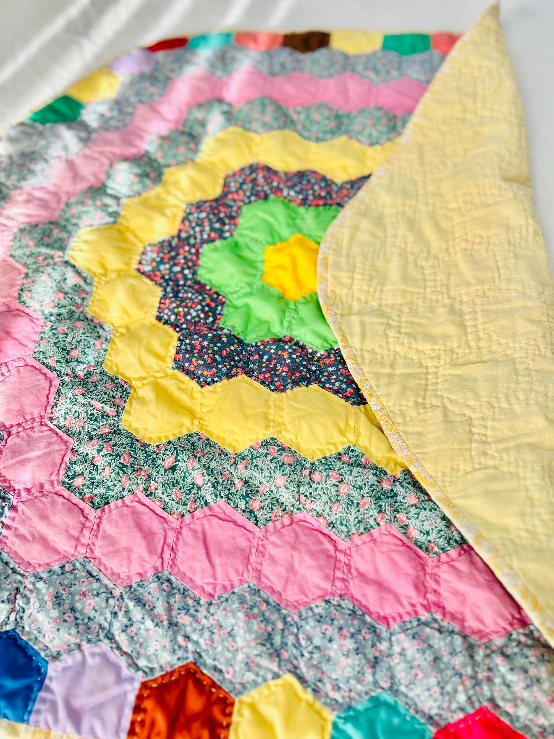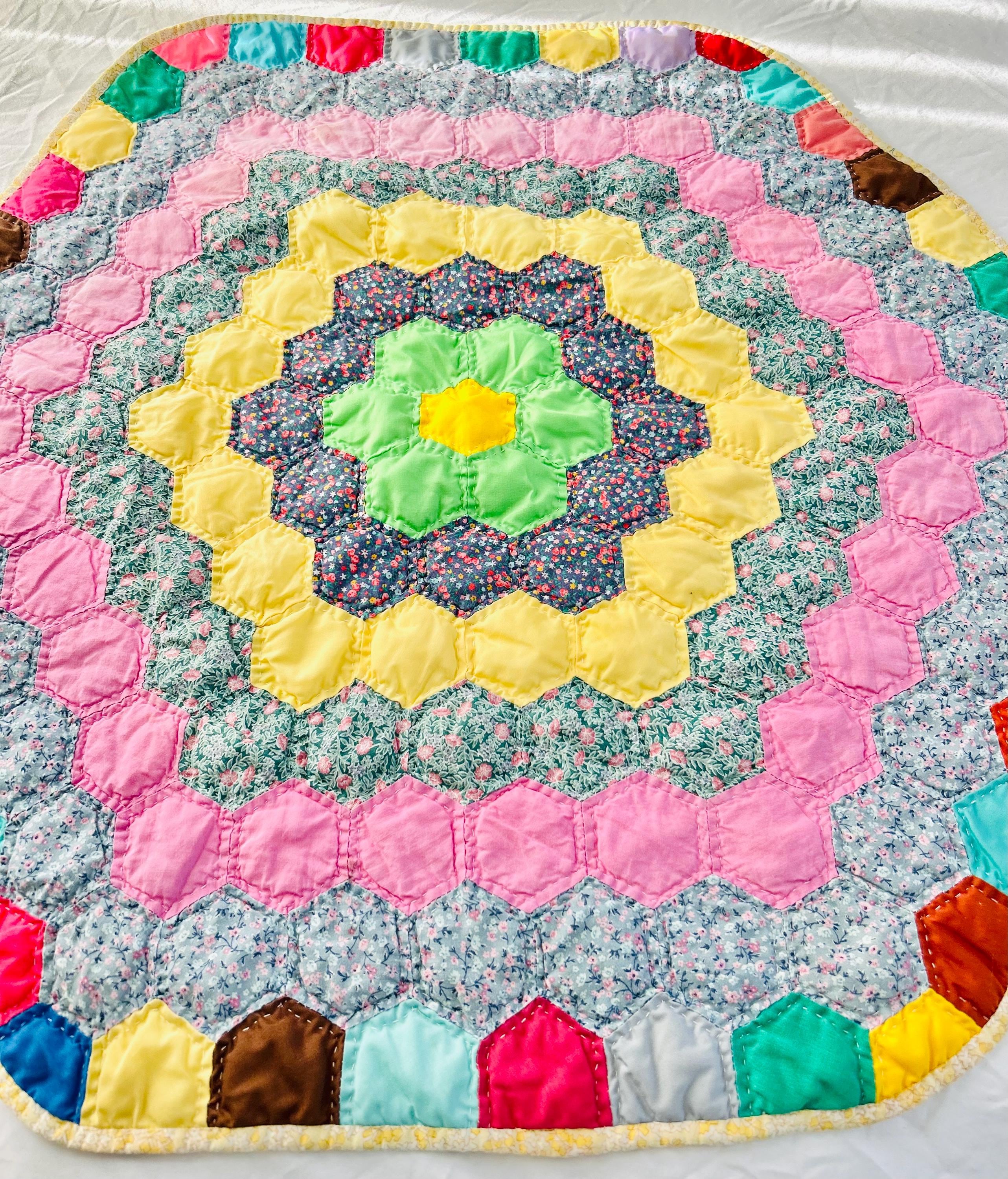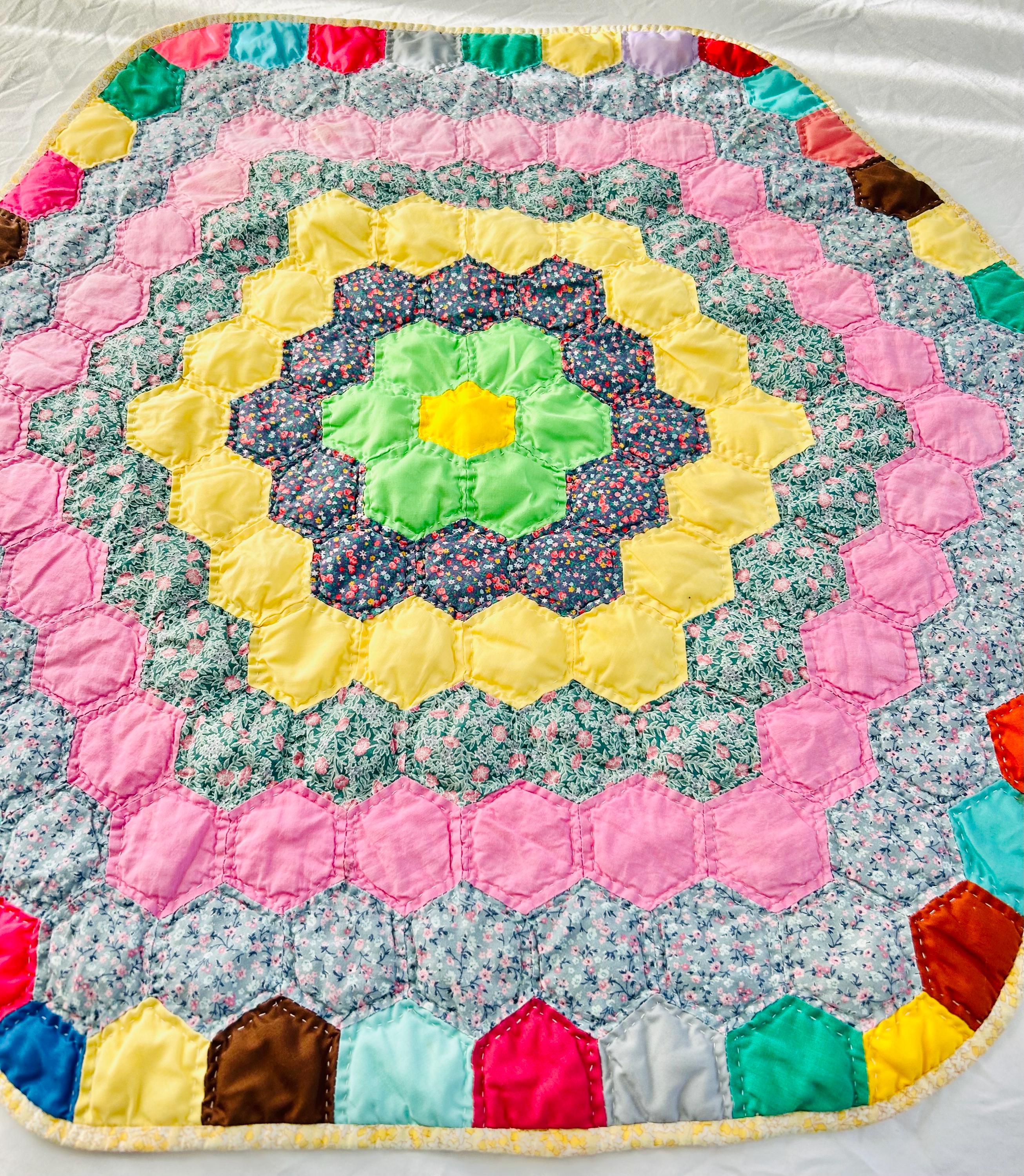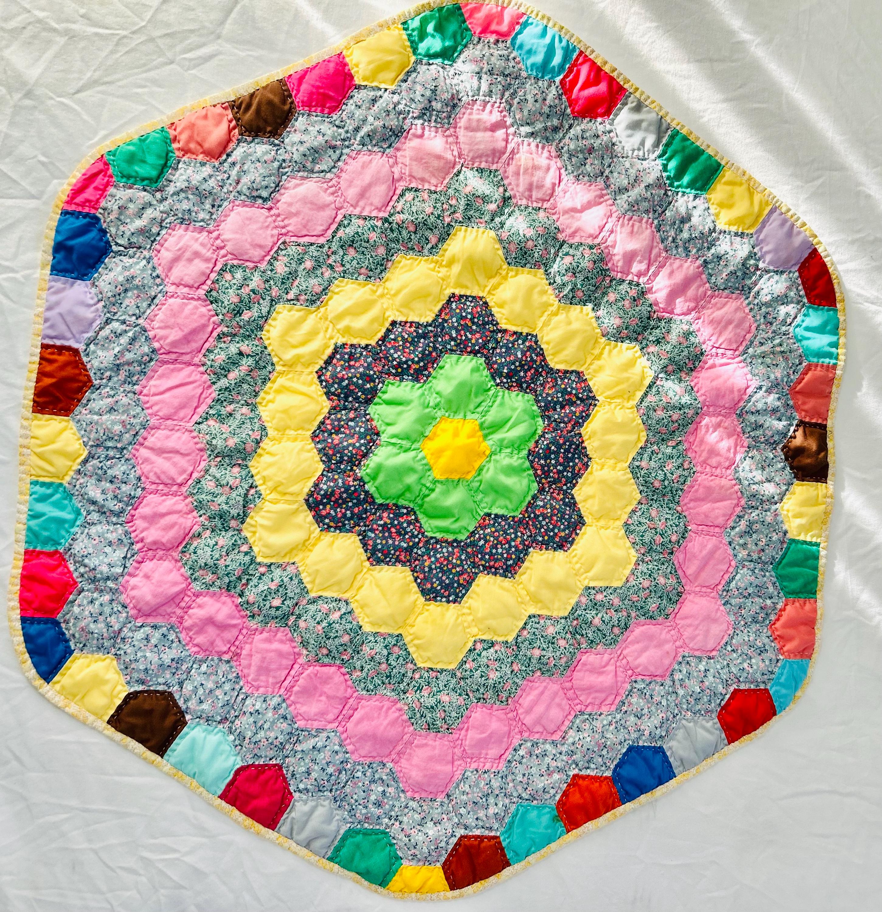 Vintage hand-stitched and hand-quilted Grandmother's Flower Garden, circa 1950s, for use as a table mat or accent piece. It has very lightweight batting and yellow cotton back. The binding is a yellow and white print that has been machine stitched to the back and hand-stitched to the front.