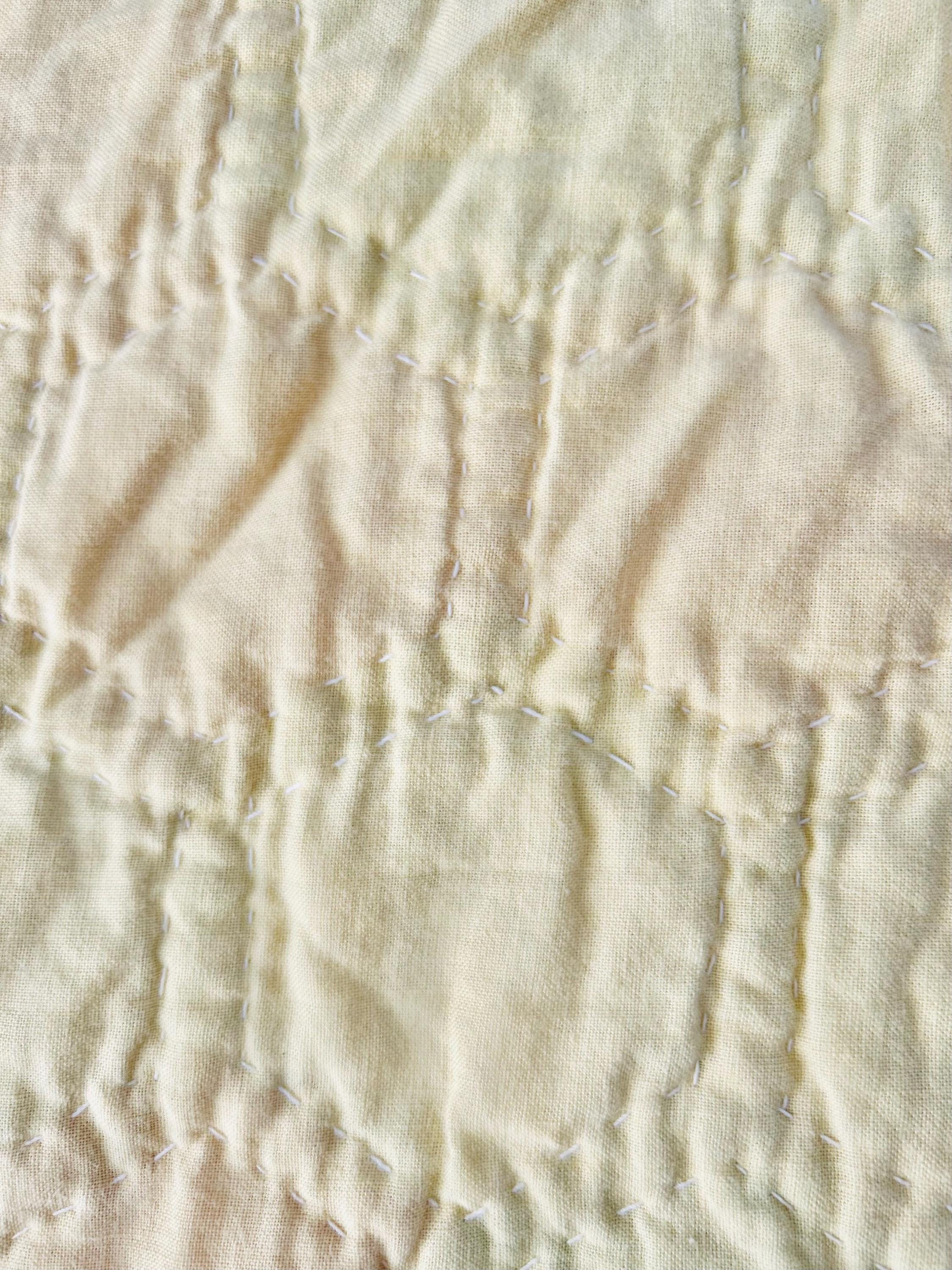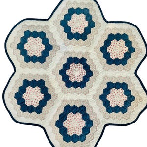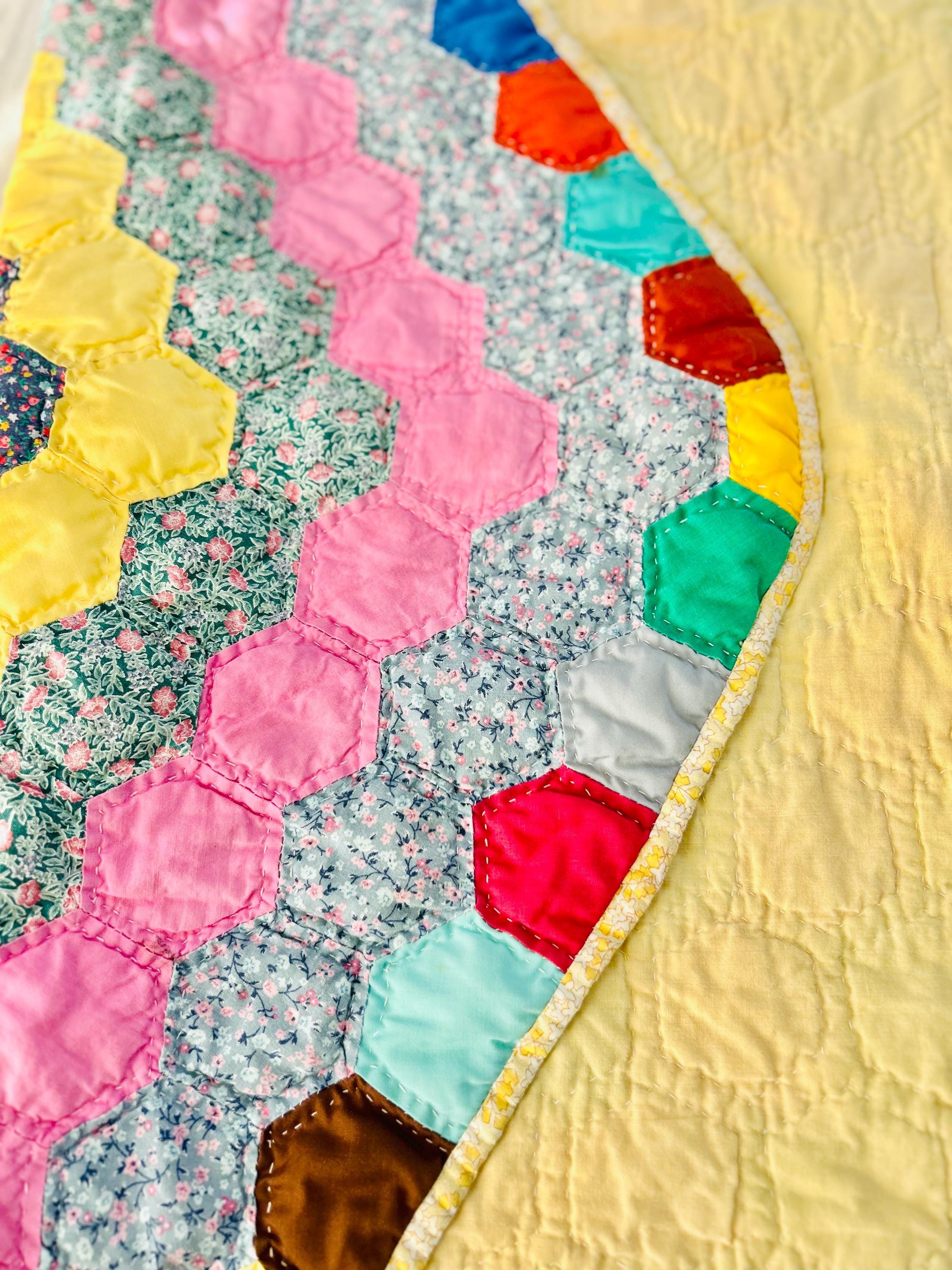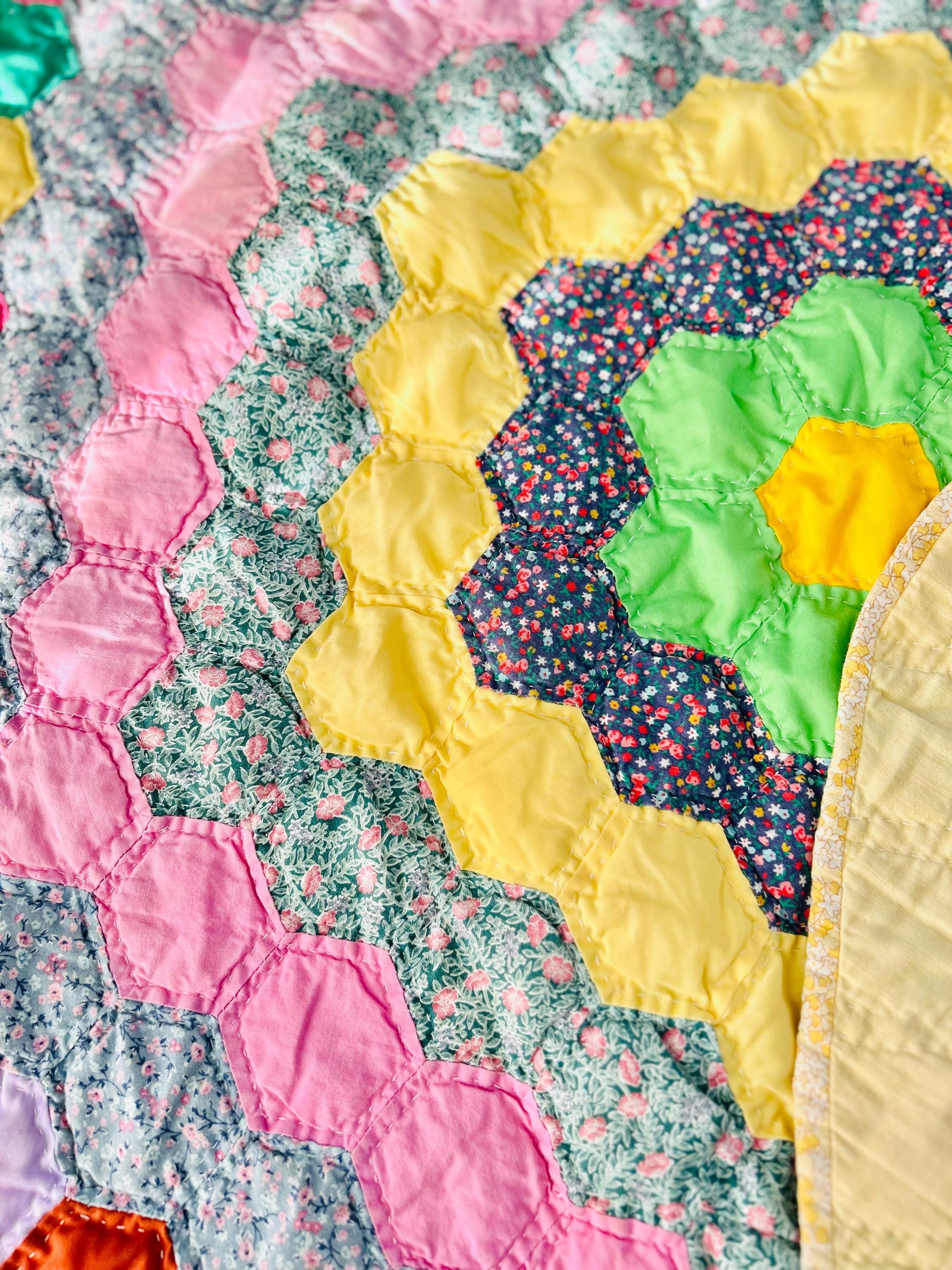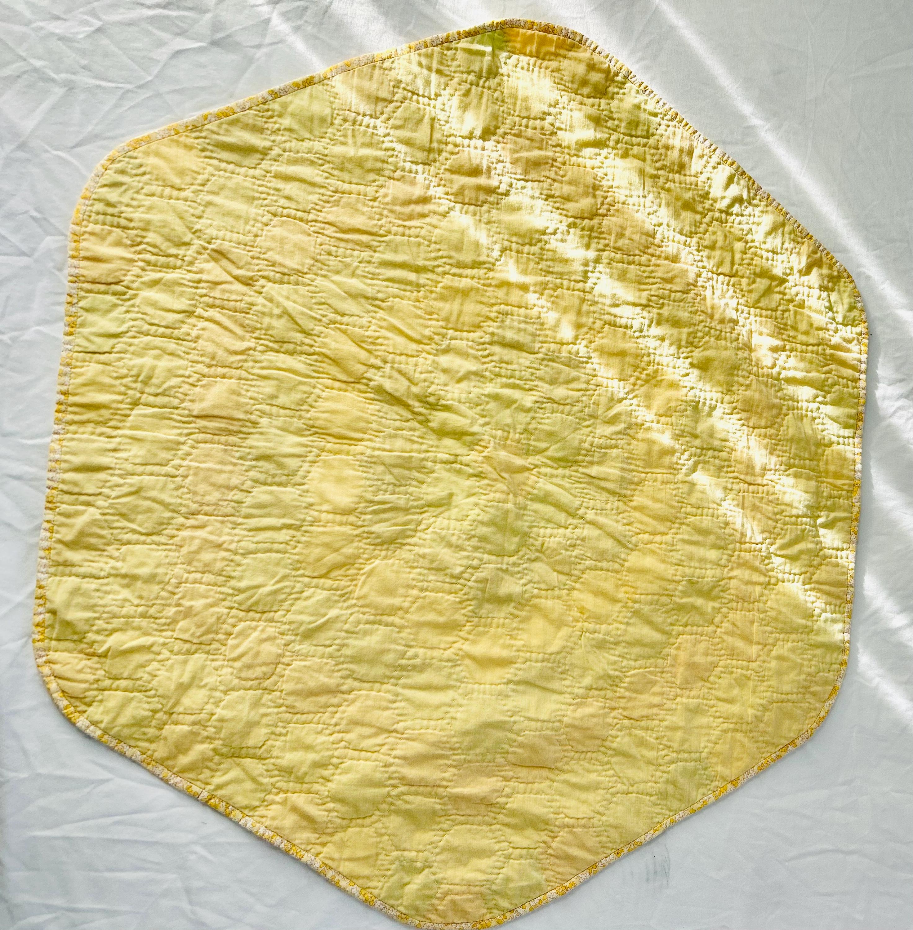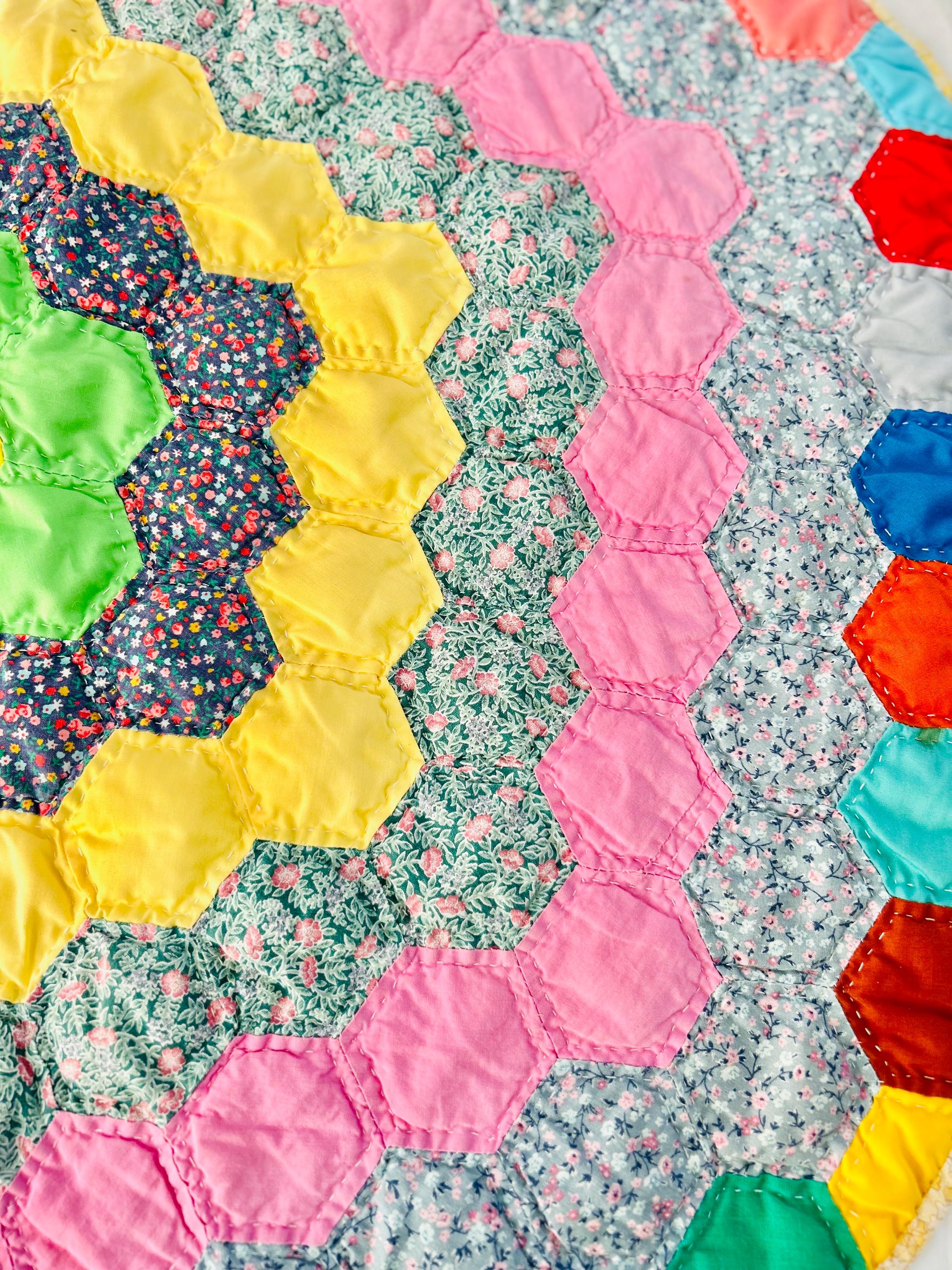 Vintage hand-stitched and hand-quilted Grandmother's Flower Garden, circa 1950s, for use as a table mat or accent piece. It has very lightweight batting and yellow cotton back. The binding is a yellow and white print that has been machine stitched to the back and hand-stitched to the front.