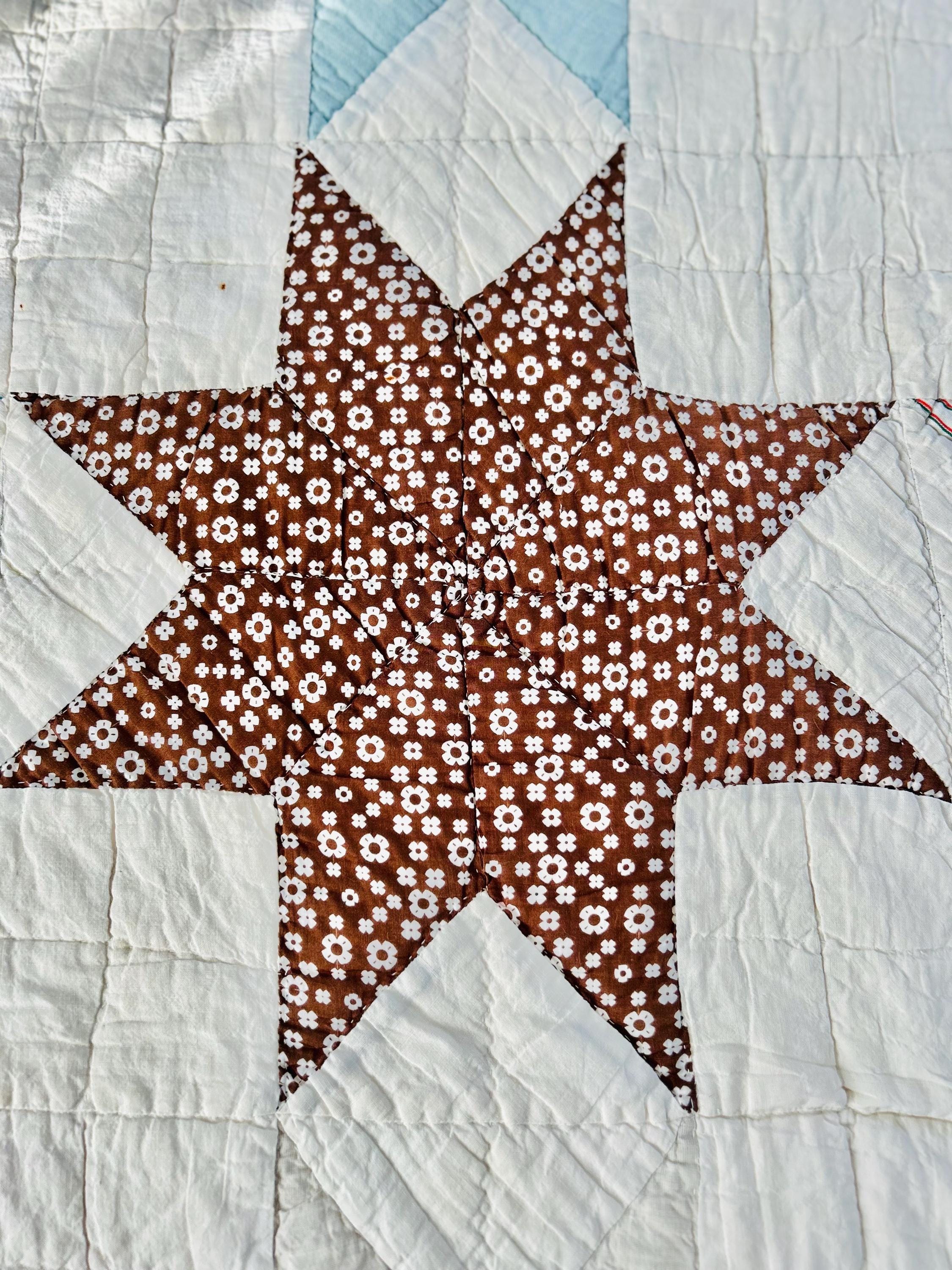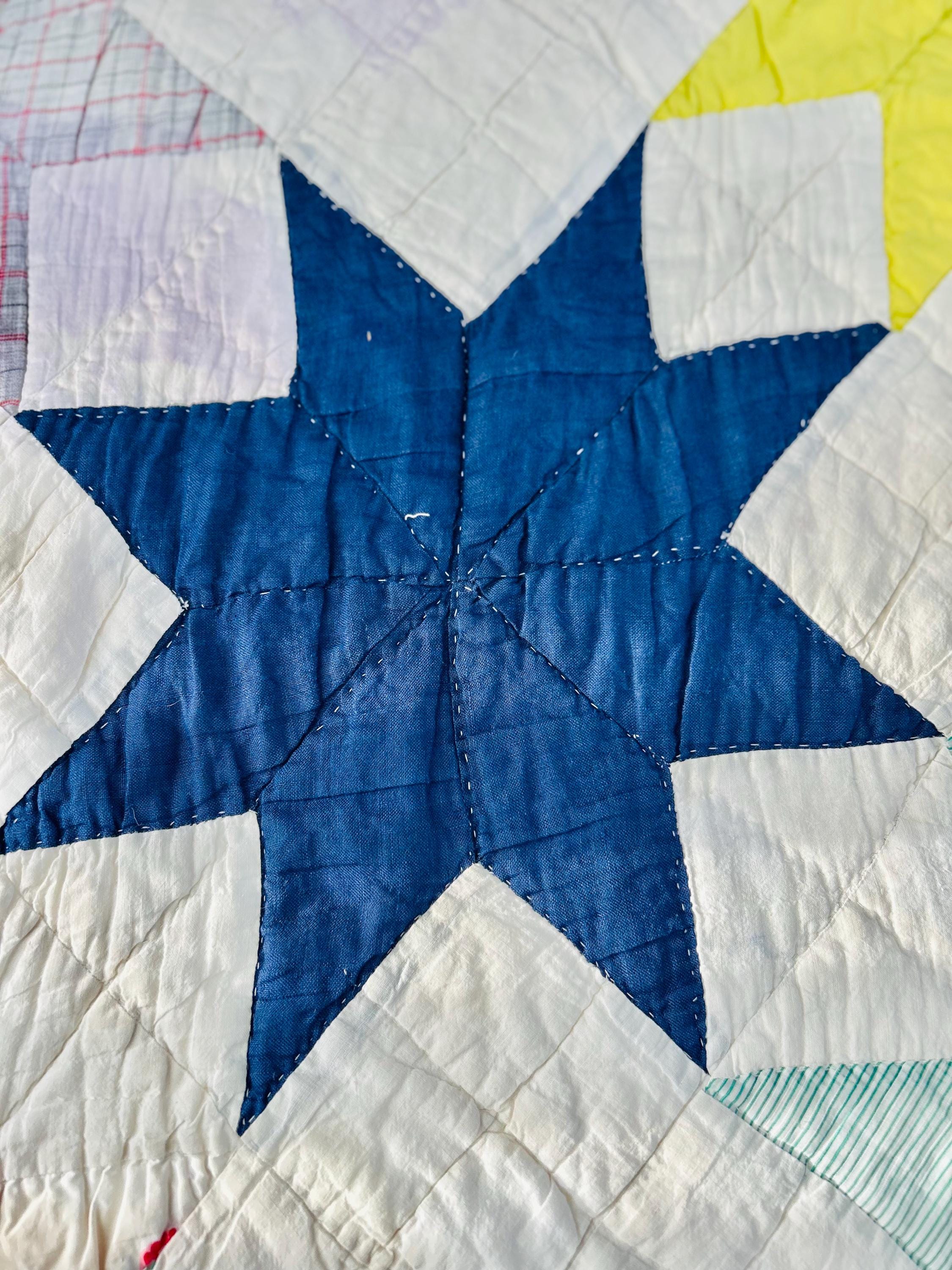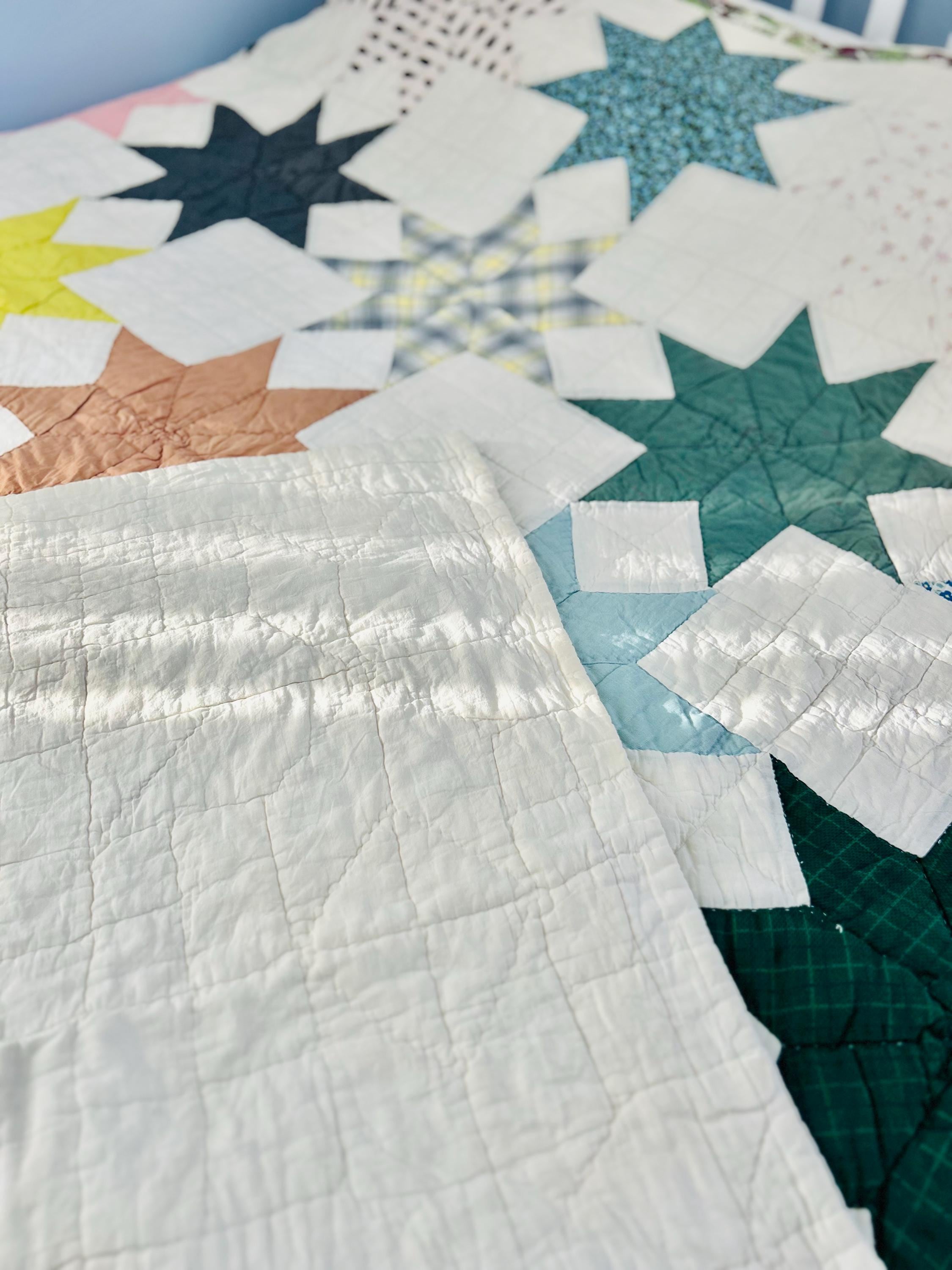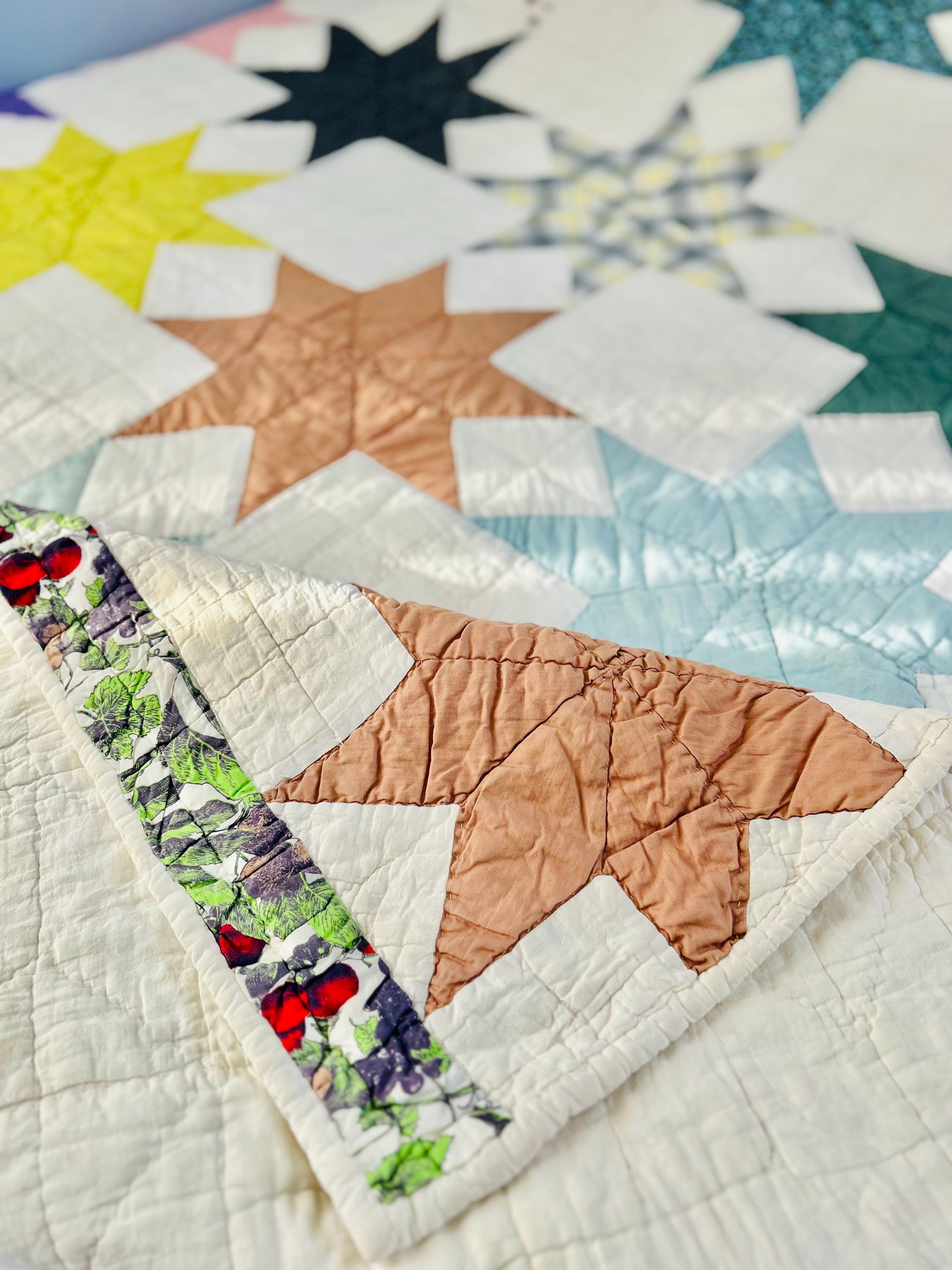 The quilt is in excellent condition with some color transfer around one of the black stars, with that color transfer showing on the back behind that star as well.