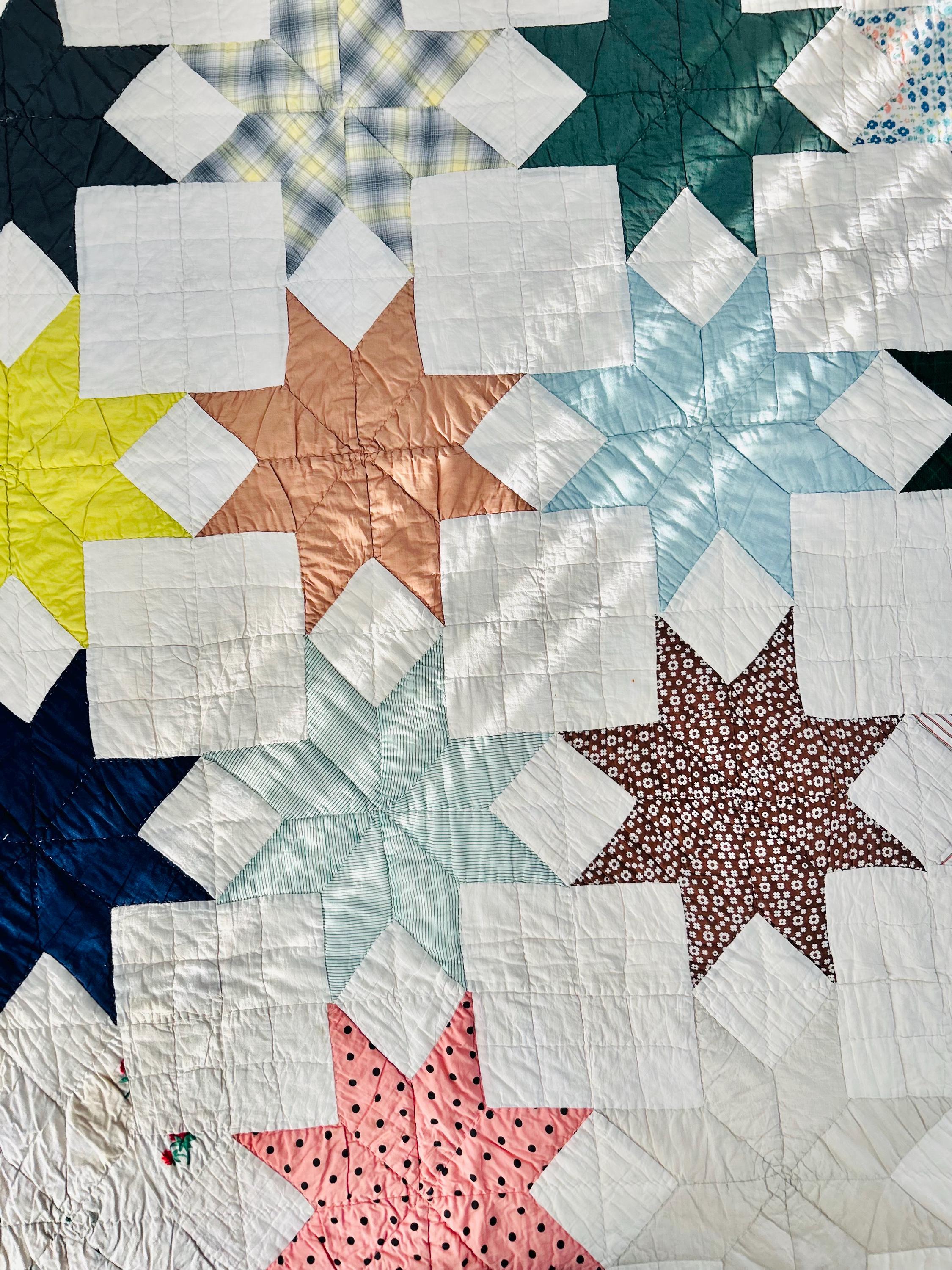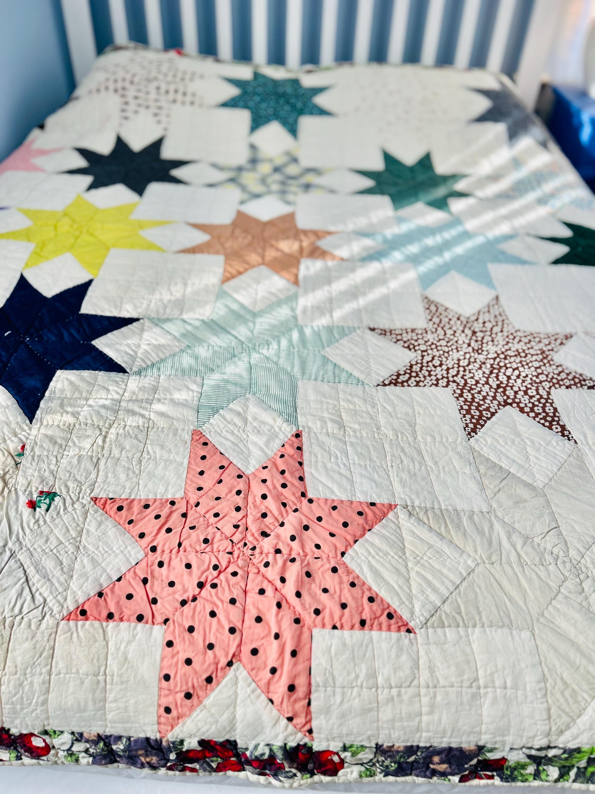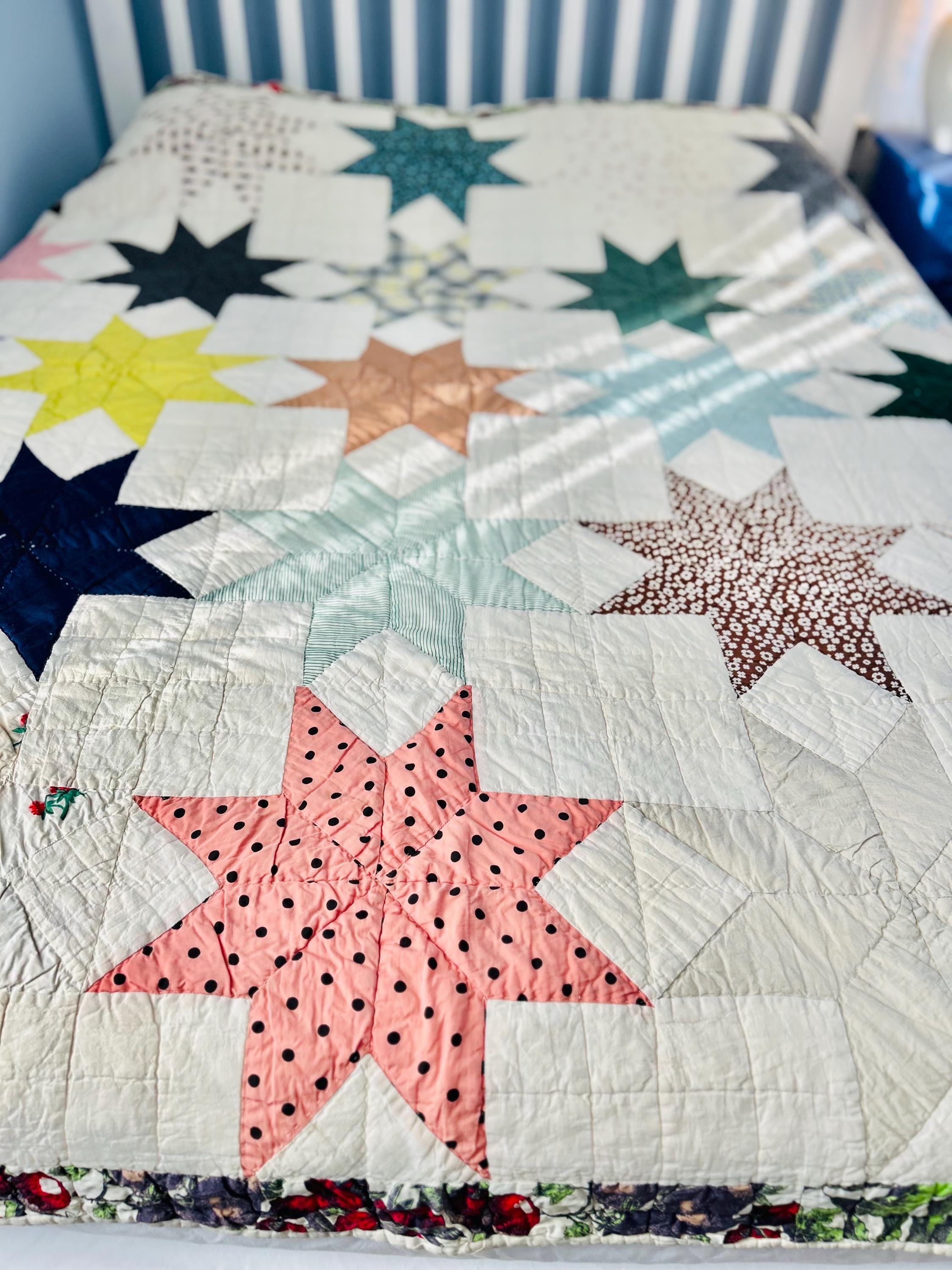 This is a very old Touching Stars Quilt, circa 1910-1920s, and has been hand-stitched and hand-quilted. The quilting is in outlines of the patchwork and in diagonals. There is a colorful green-print border along the top and bottom that has been quilted in large diamonds.