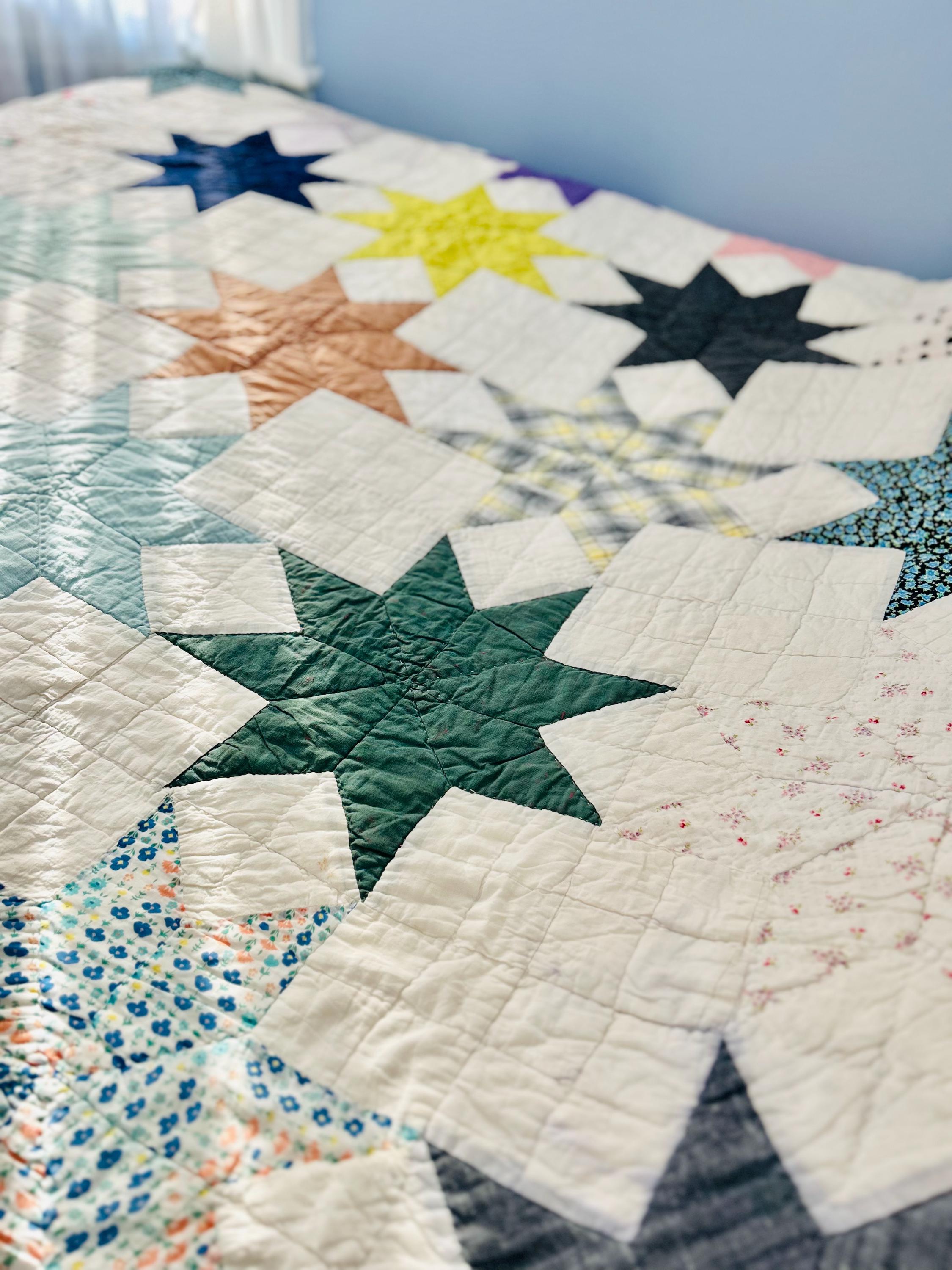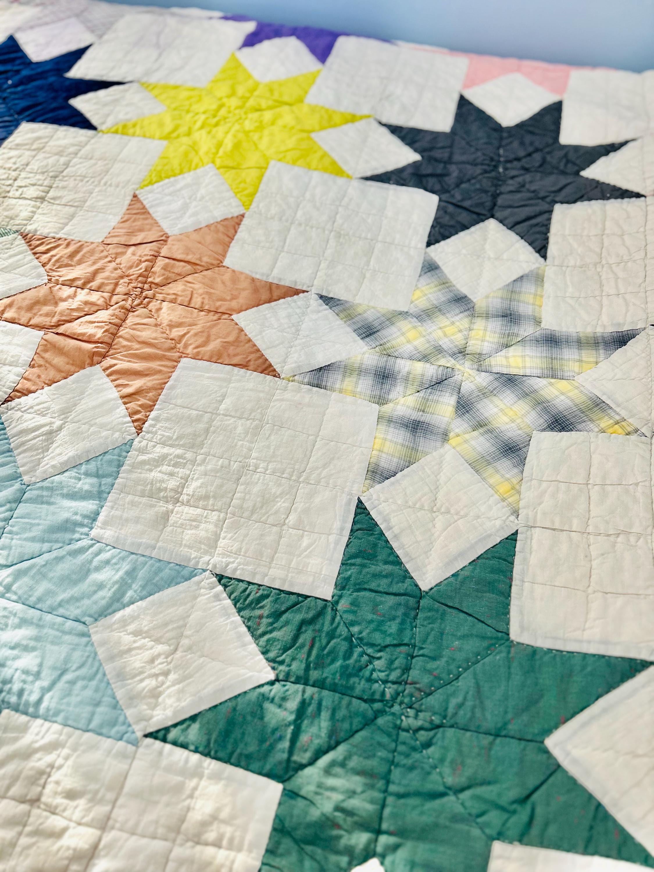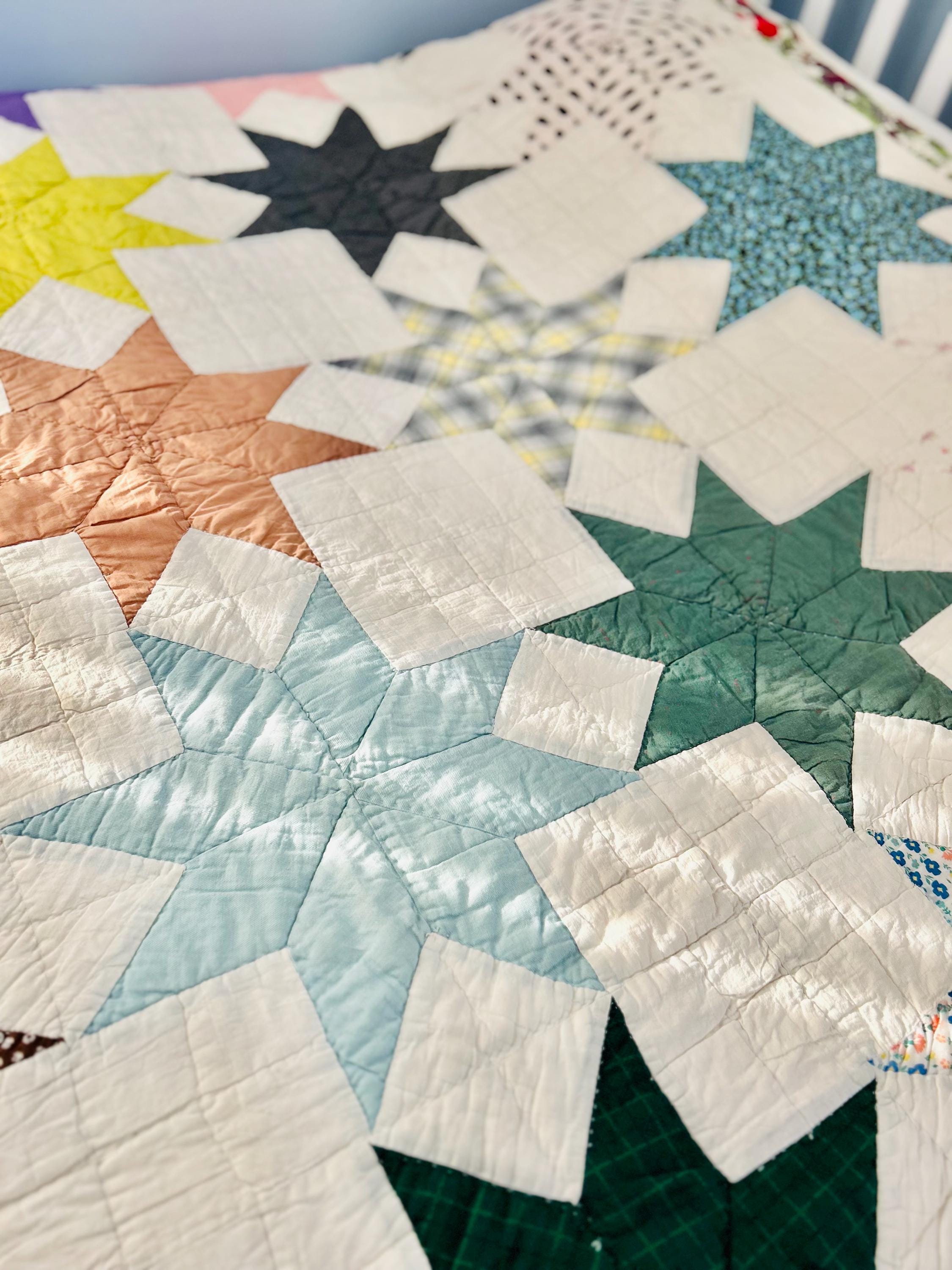This is a very old Touching Stars Quilt, circa 1910-1920s, and has been hand-stitched and hand-quilted. The quilting is in outlines of the patchwork and in diagonals. There is a colorful green-print border along the top and bottom that has been quilted in large diamonds.
