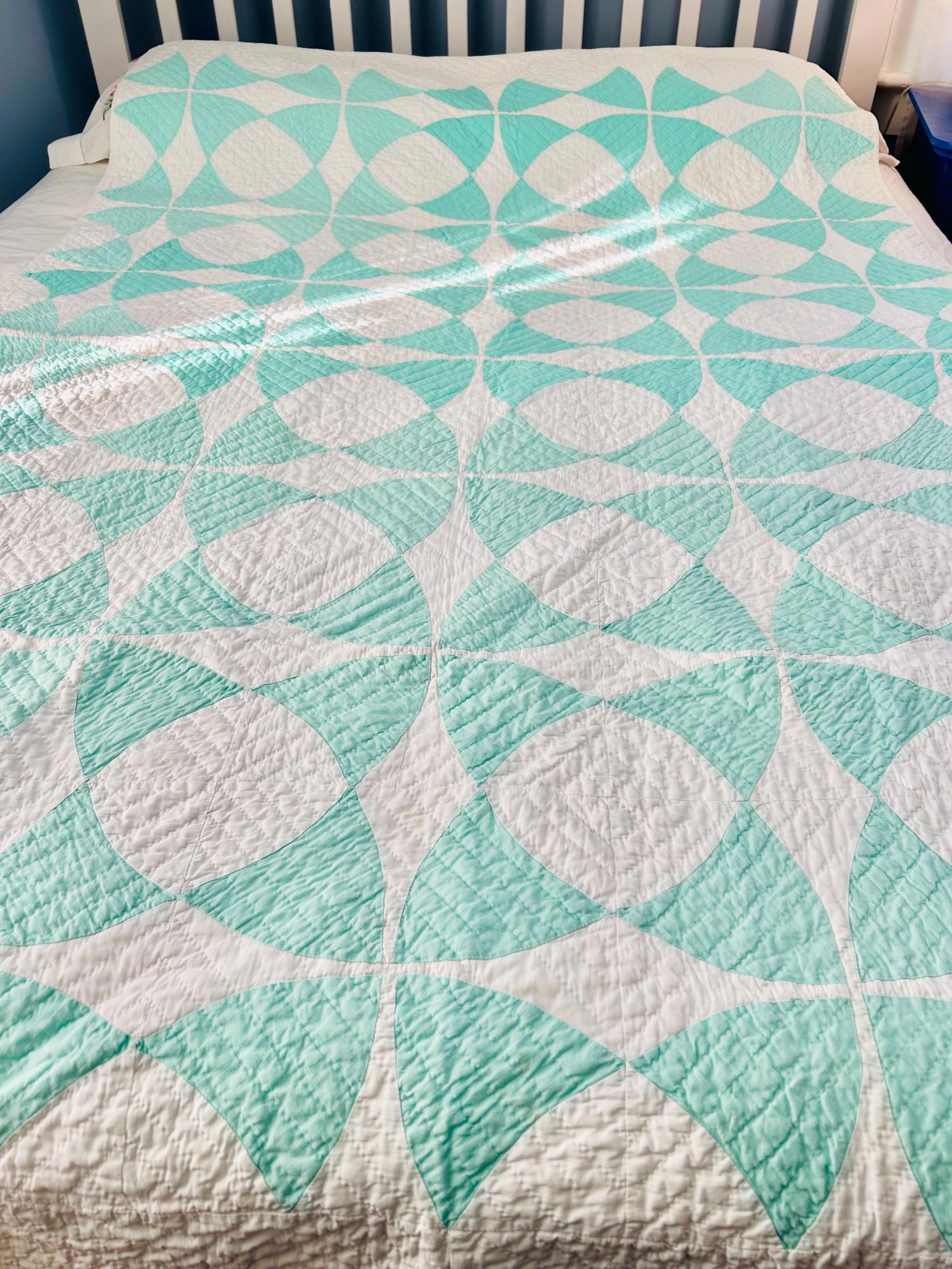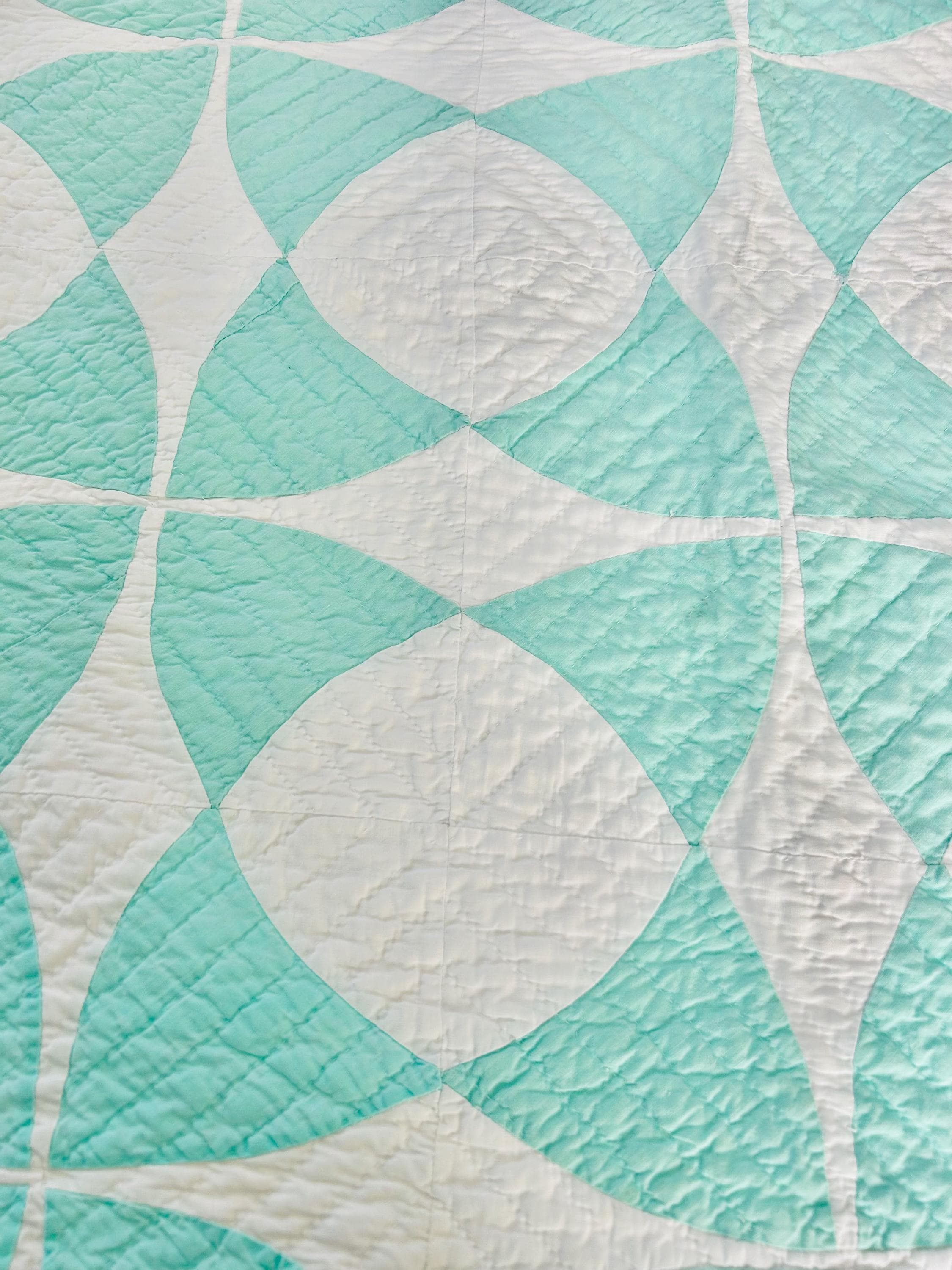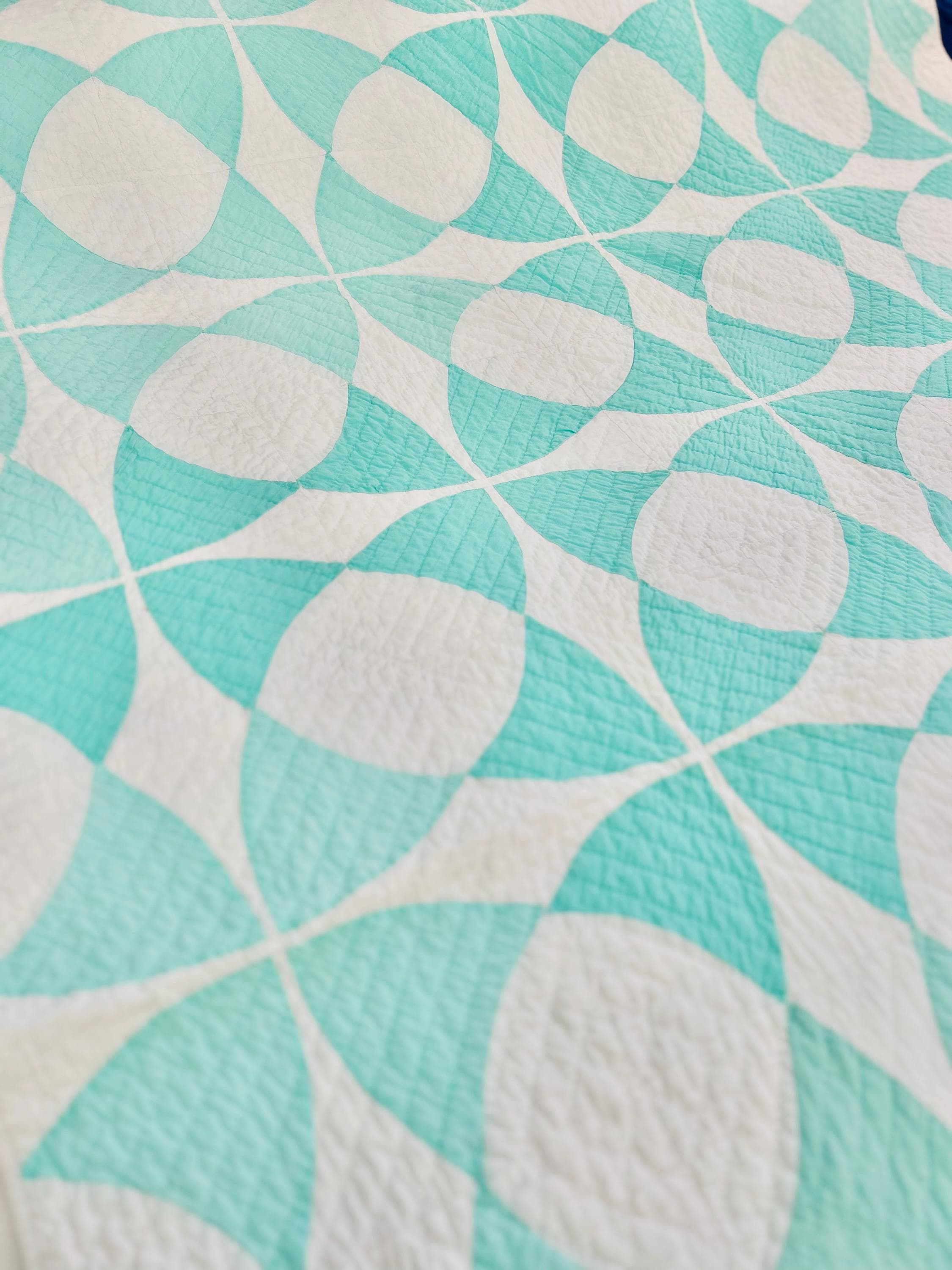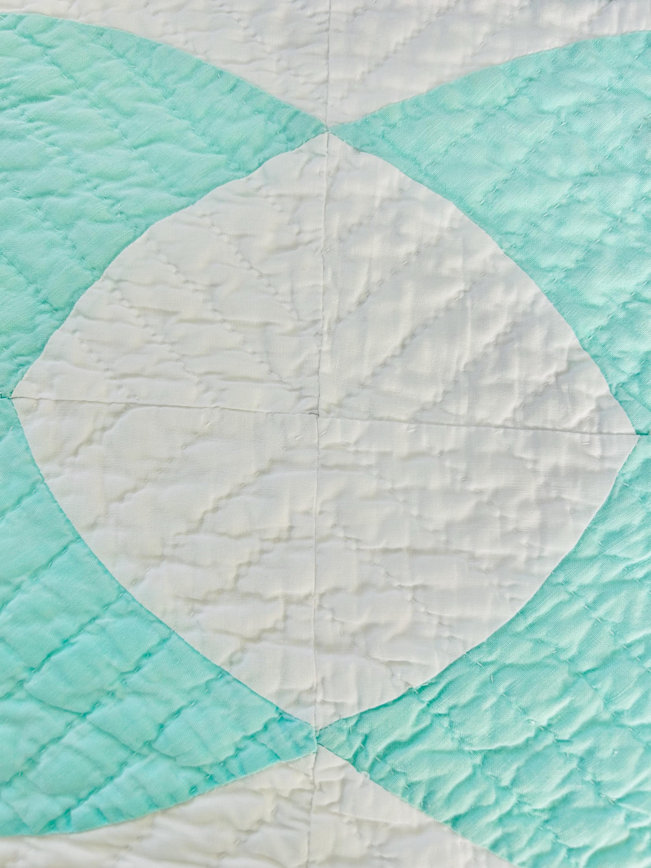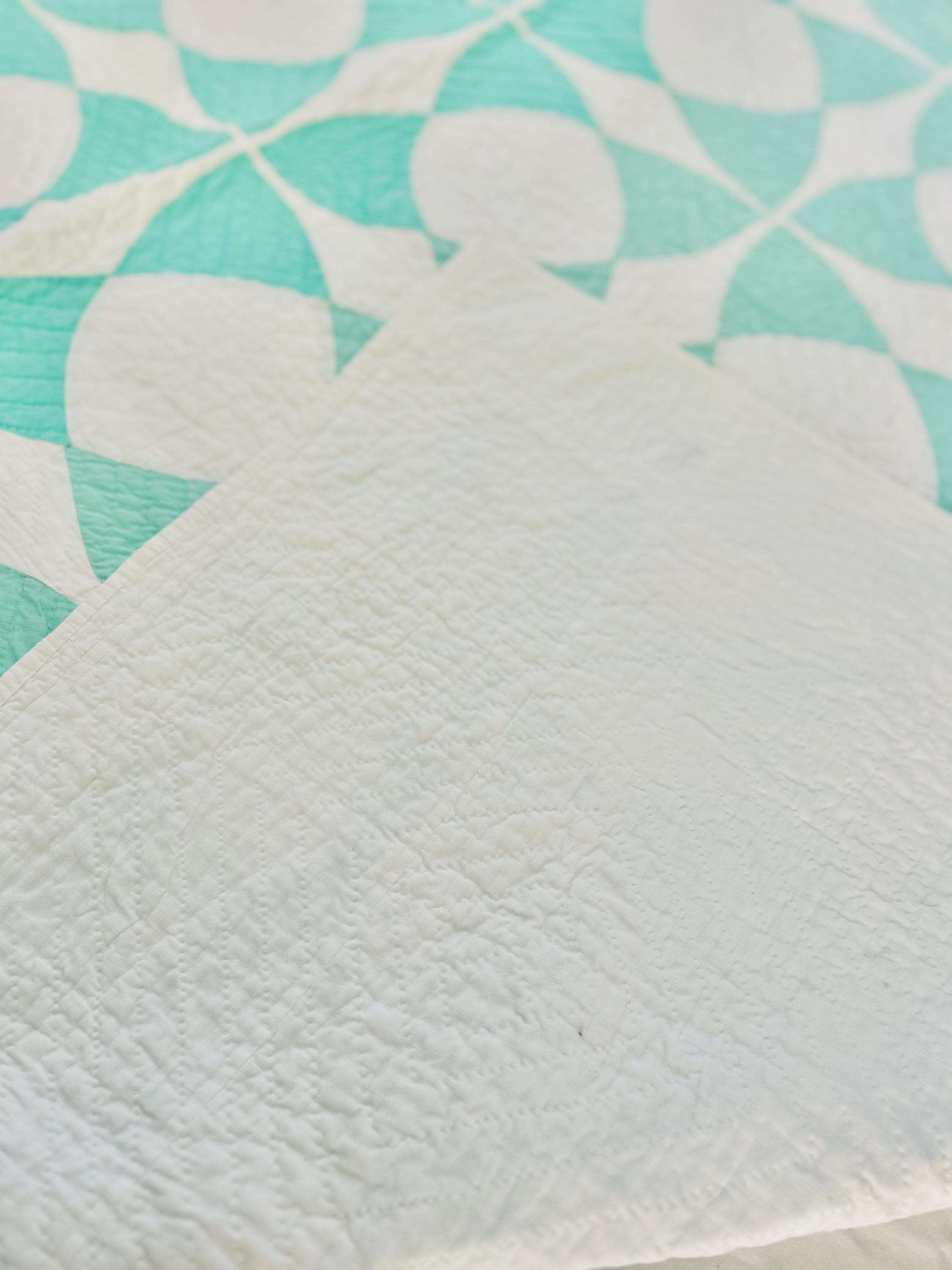 This is a rare and difficult pattern called "Wheel of Mysterie" or "Winding Ways", circa 1920-1930s, and on top of the expert piecing it has been beautifully quilted in tiny stitches. Some of the white blocks have been quilted in the middle with tiny flowers while others have been quilted in concentric mountain peaks. There is a four-inch white border on the top and bottom that is quilted in diagonal lines.