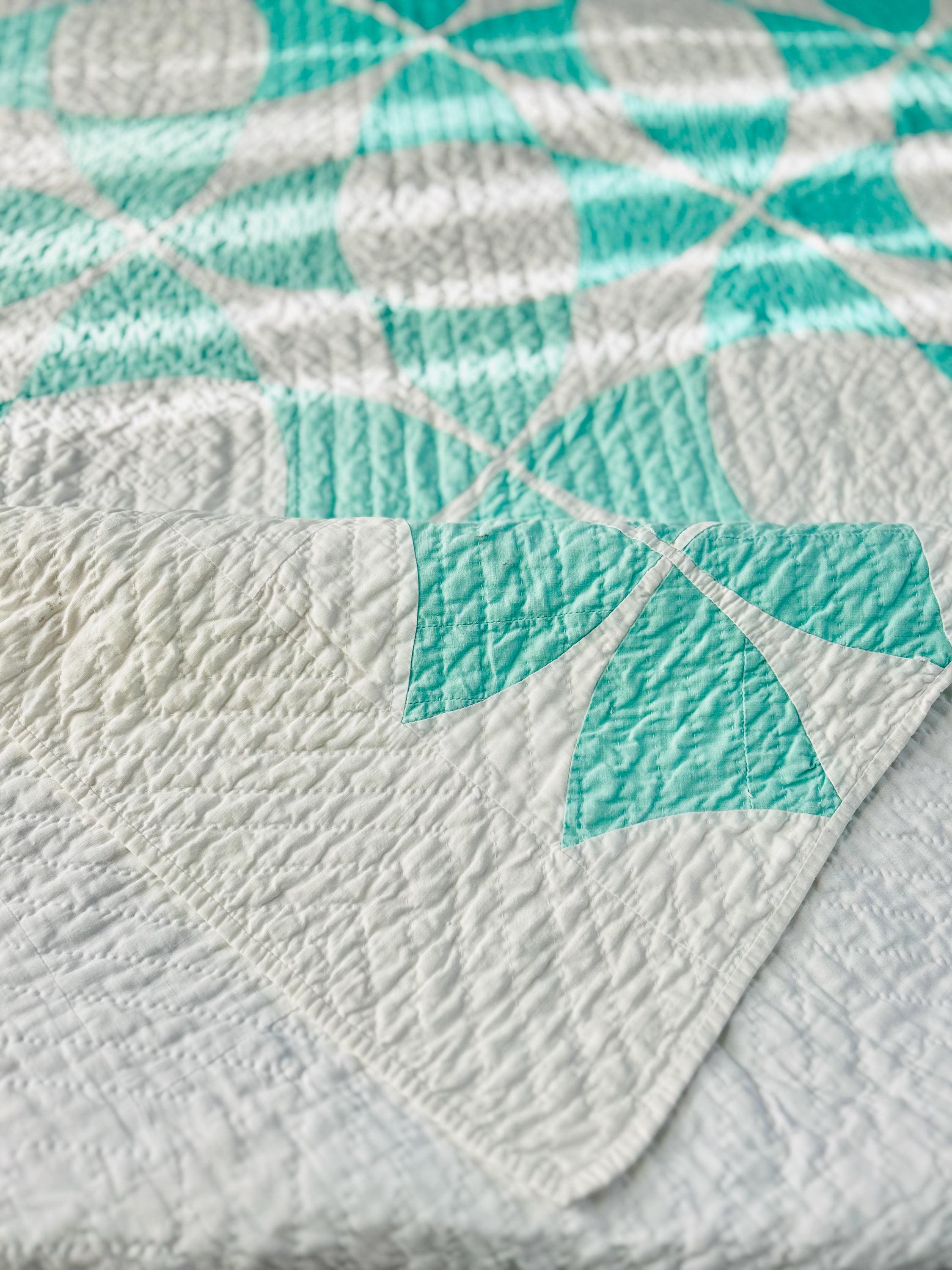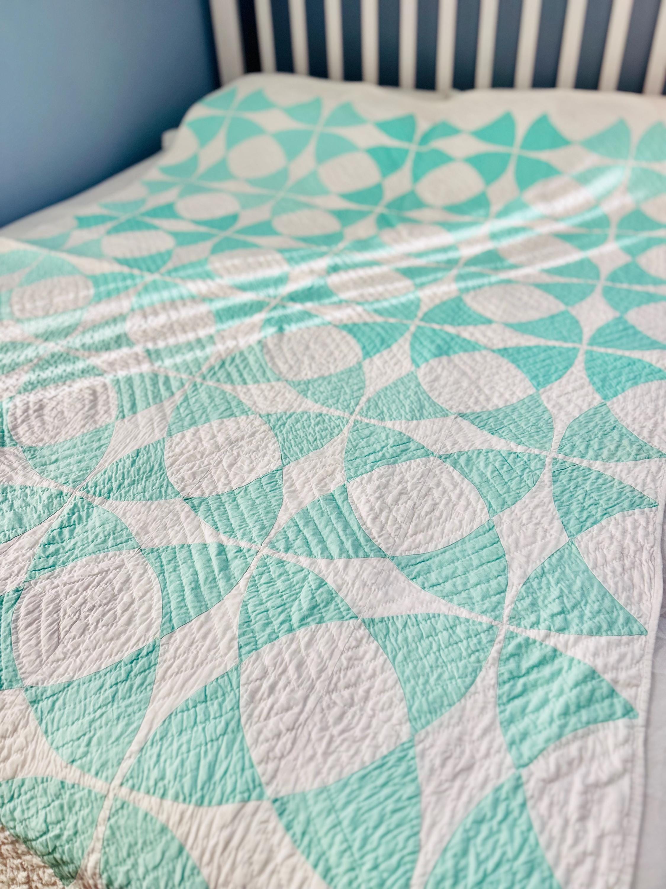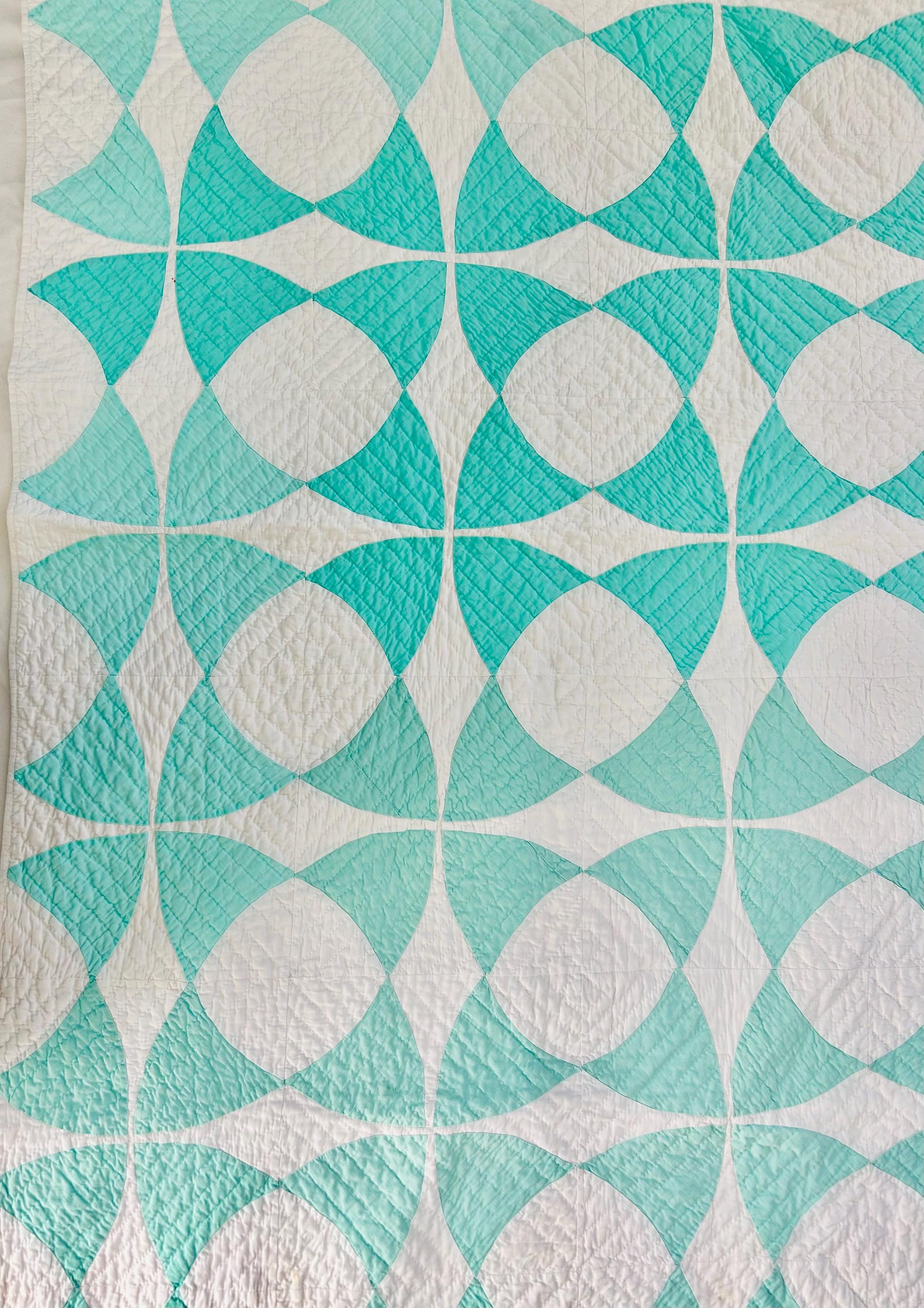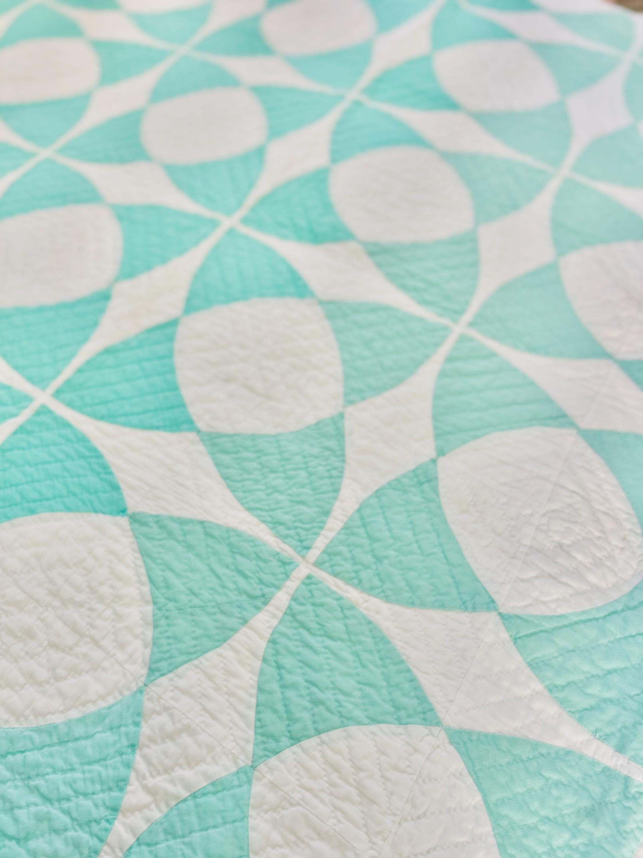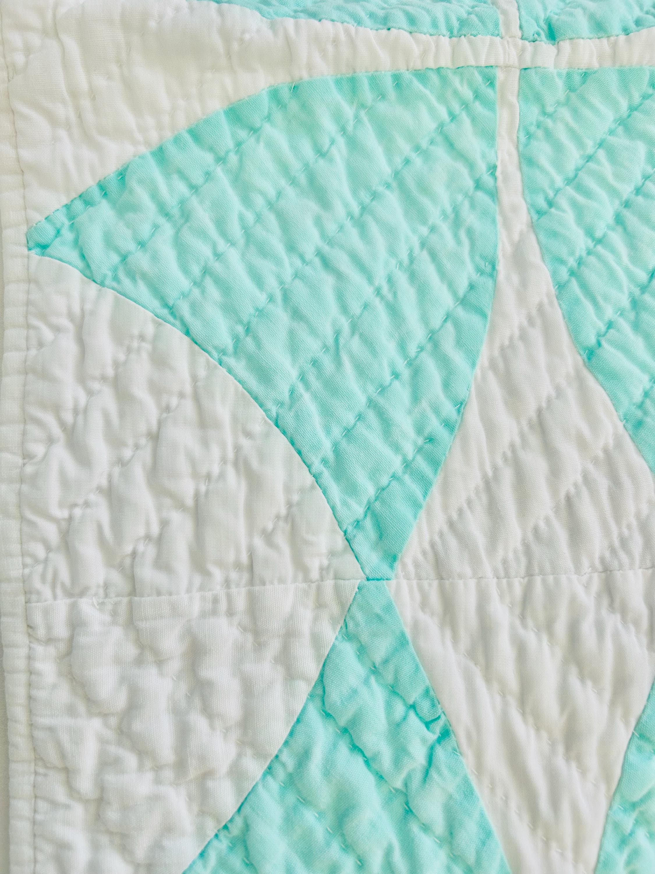 This is a rare and difficult pattern called "Wheel of Mysterie" or "Winding Ways", circa 1920-1930s, and on top of the expert piecing it has been beautifully quilted in tiny stitches. Some of the white blocks have been quilted in the middle with tiny flowers while others have been quilted in concentric mountain peaks. There is a four-inch white border on the top and bottom that is quilted in diagonal lines.