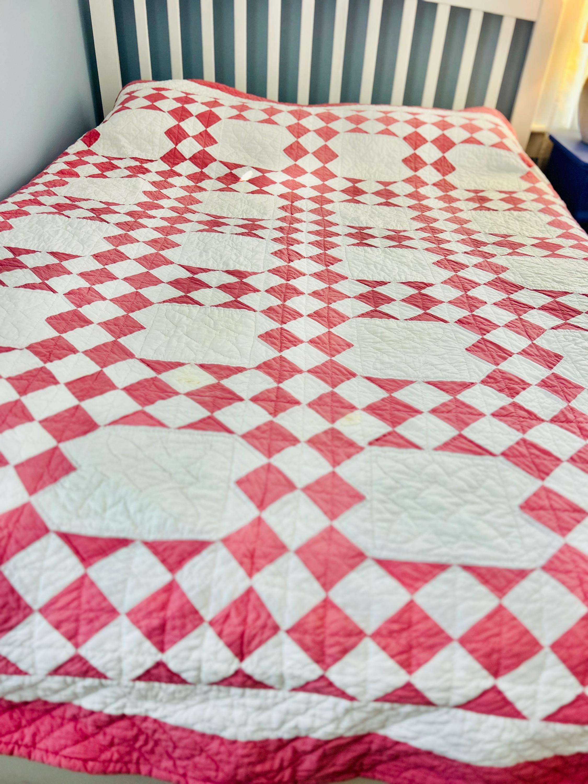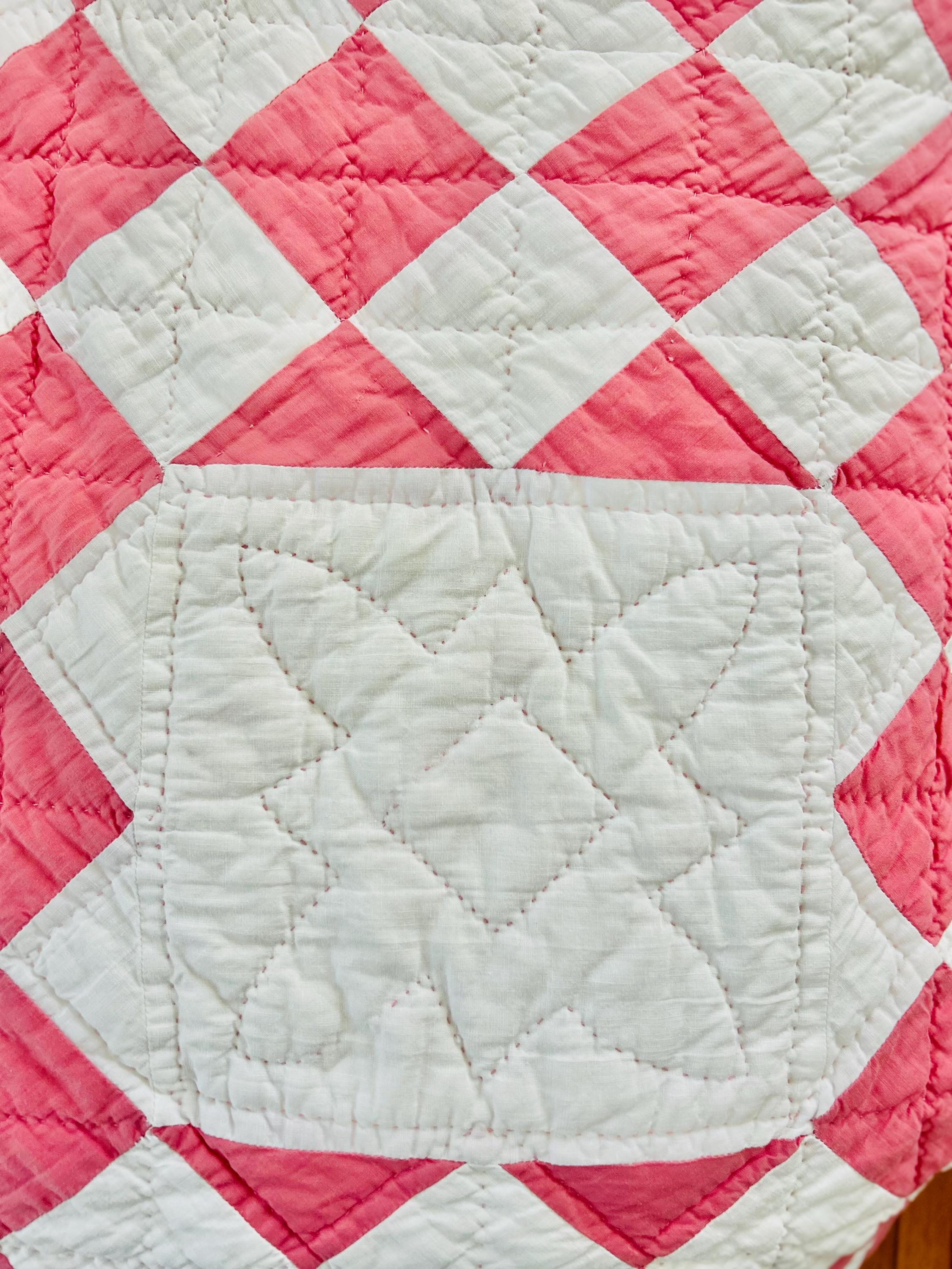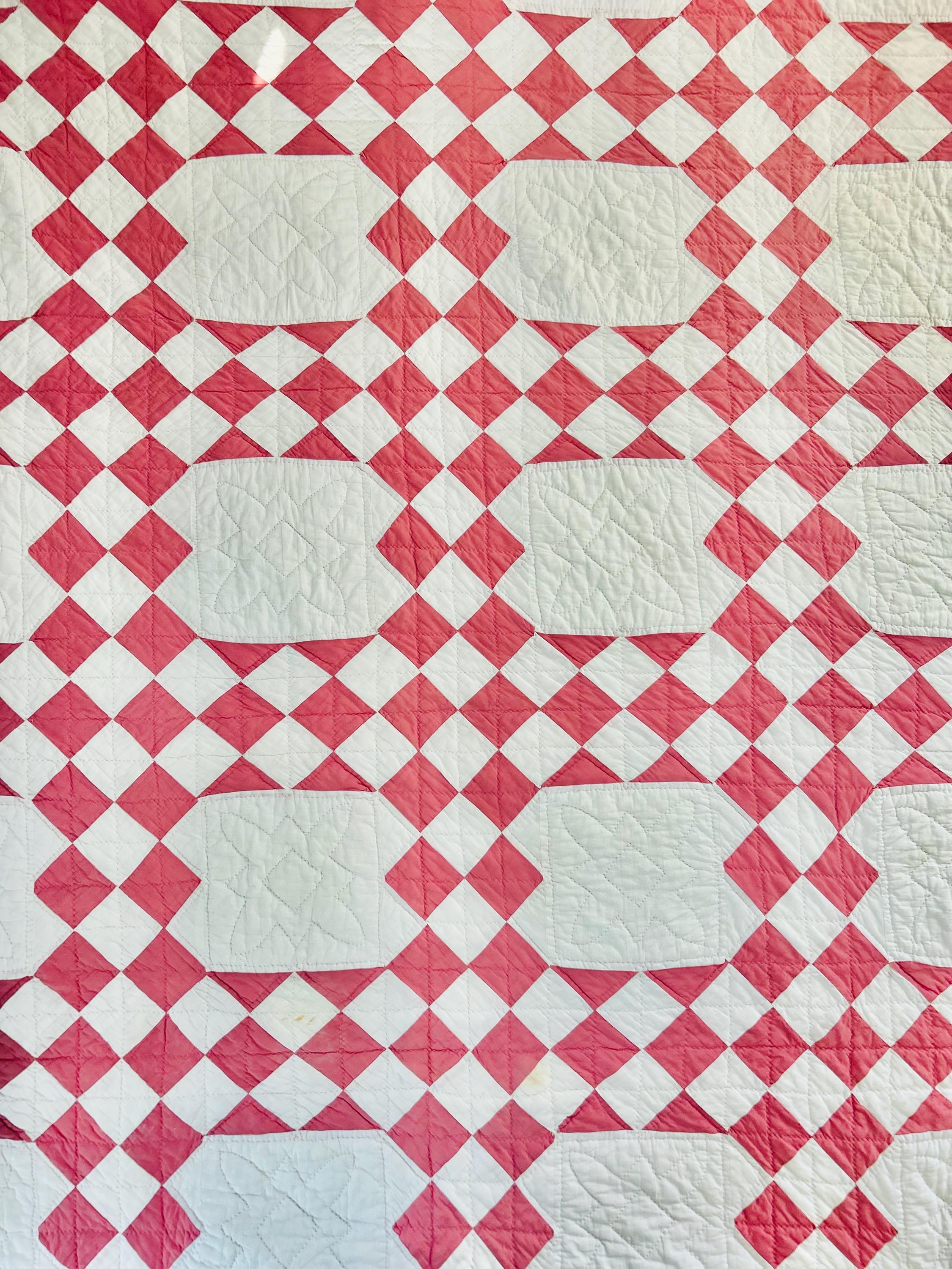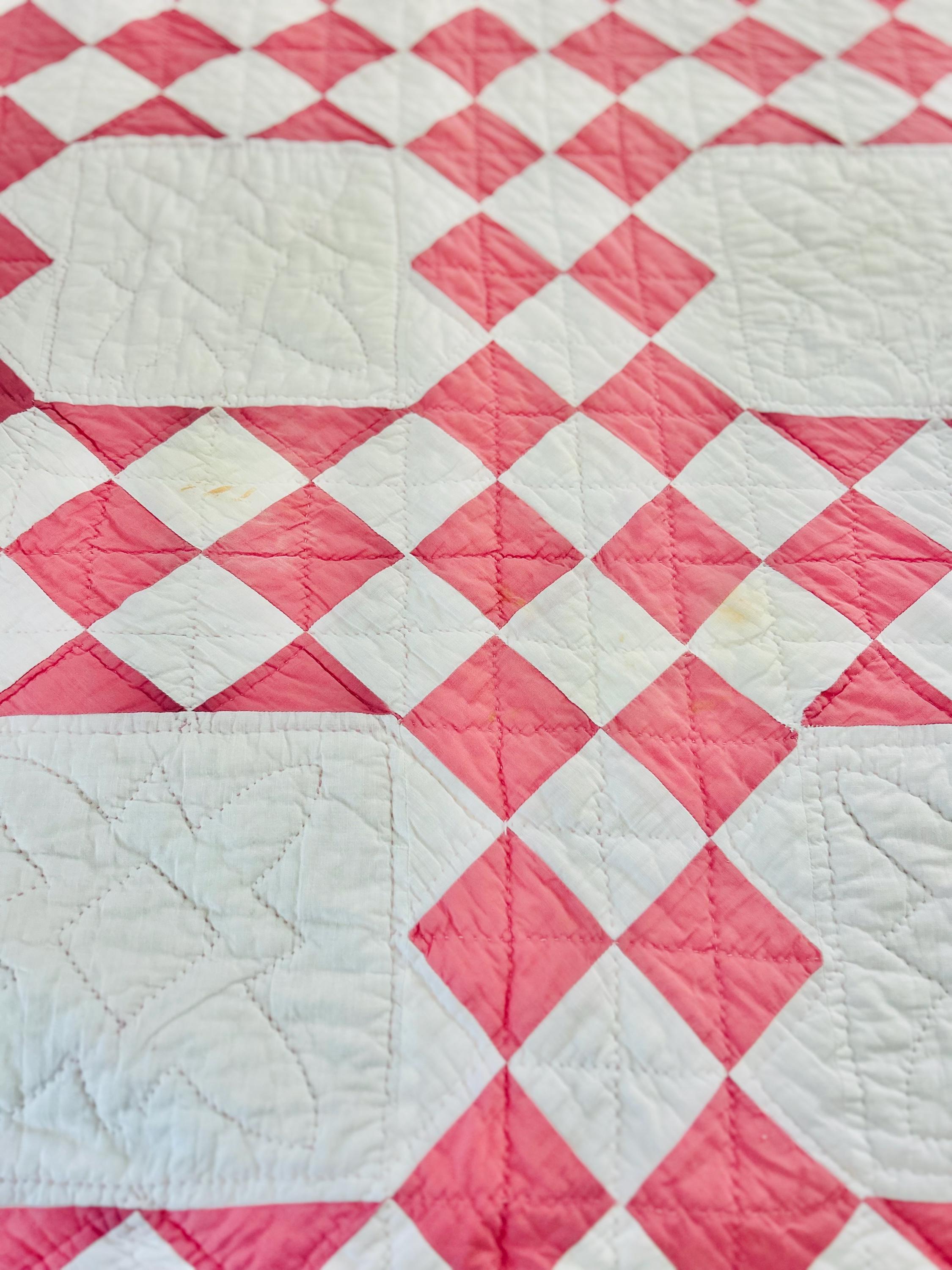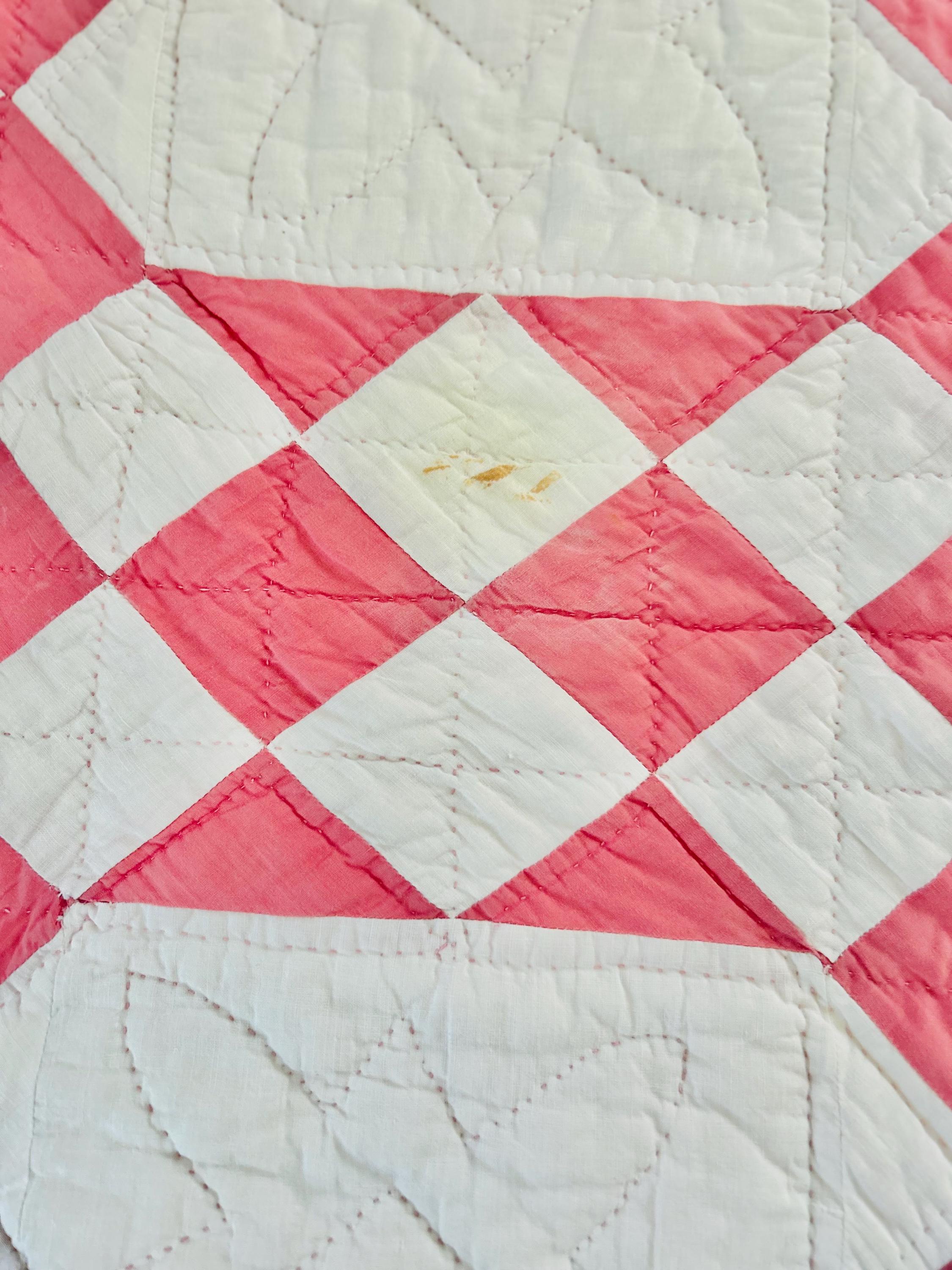 This lovely quilt is a Federal Chain pattern, circa 1930-1940s, and has been quilted in dark pink thread to match the fabric. The quilting is in geometric patterns and diagonal lines. There is a four-sided double border which is also quilted in geometric patterns and twisted ropes.