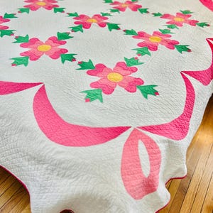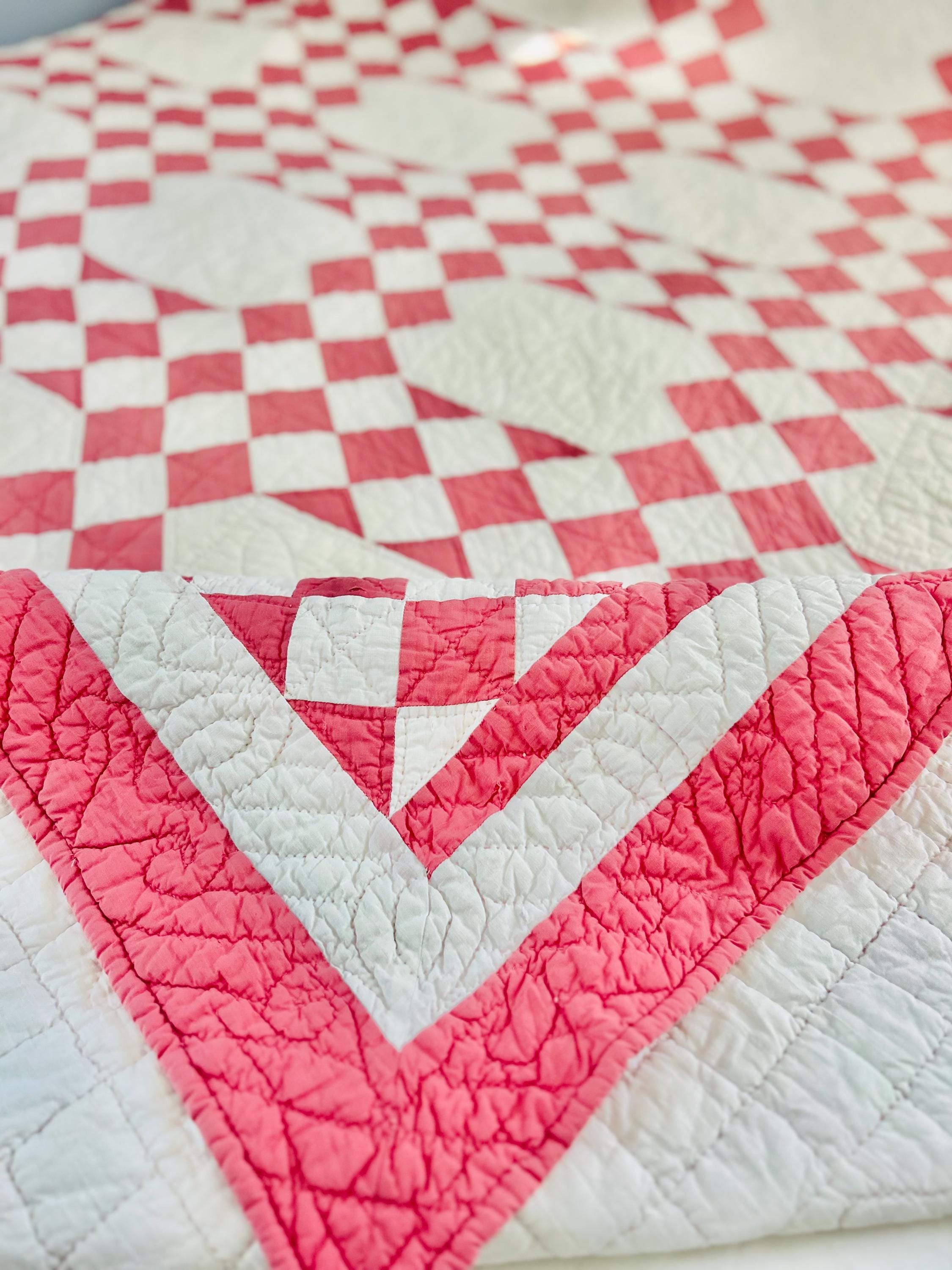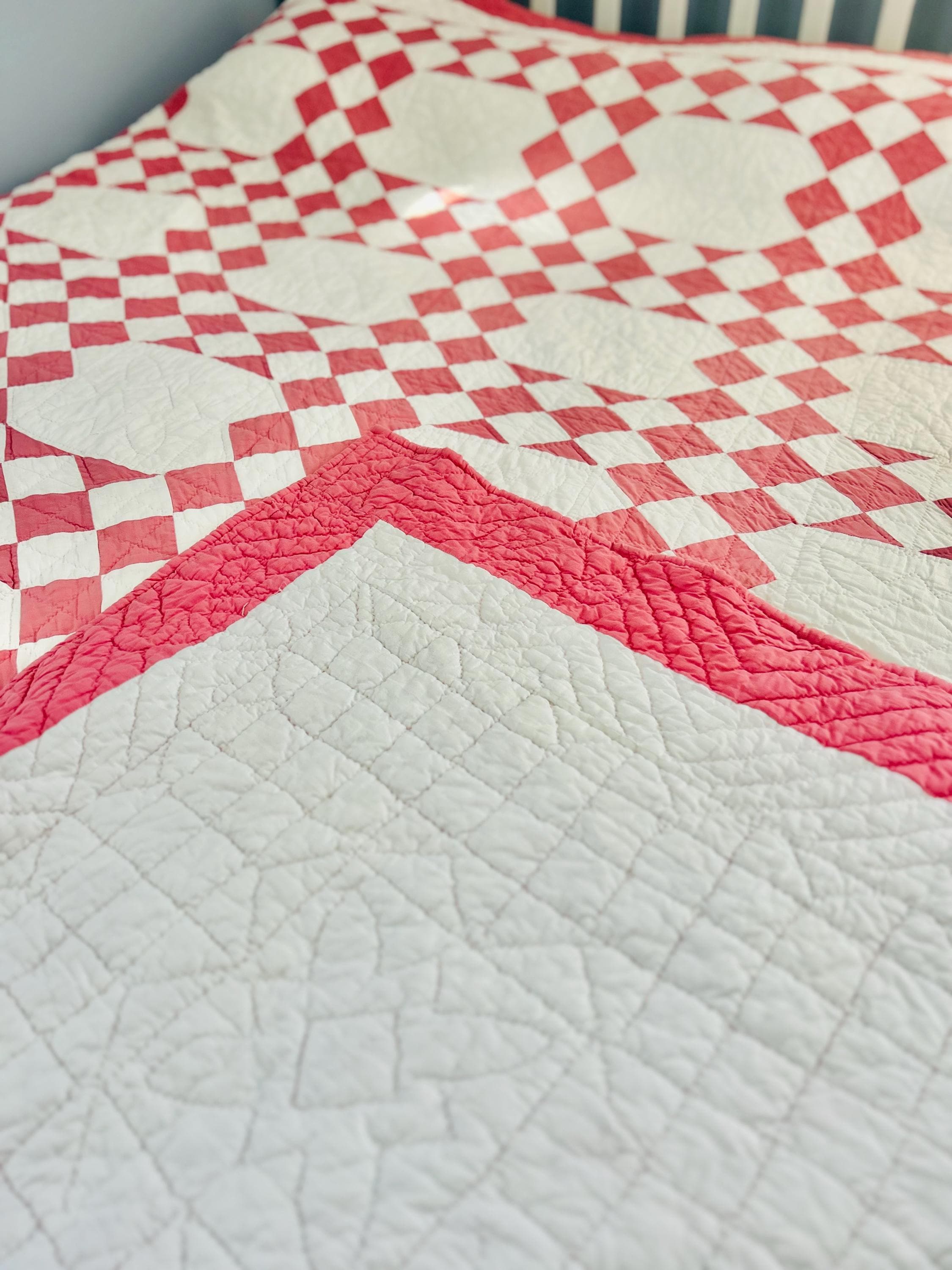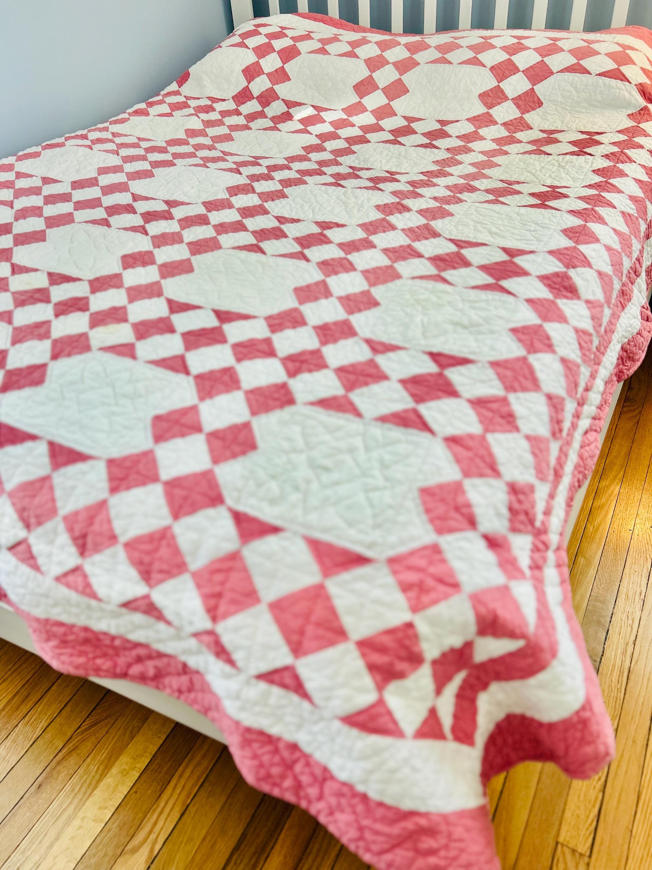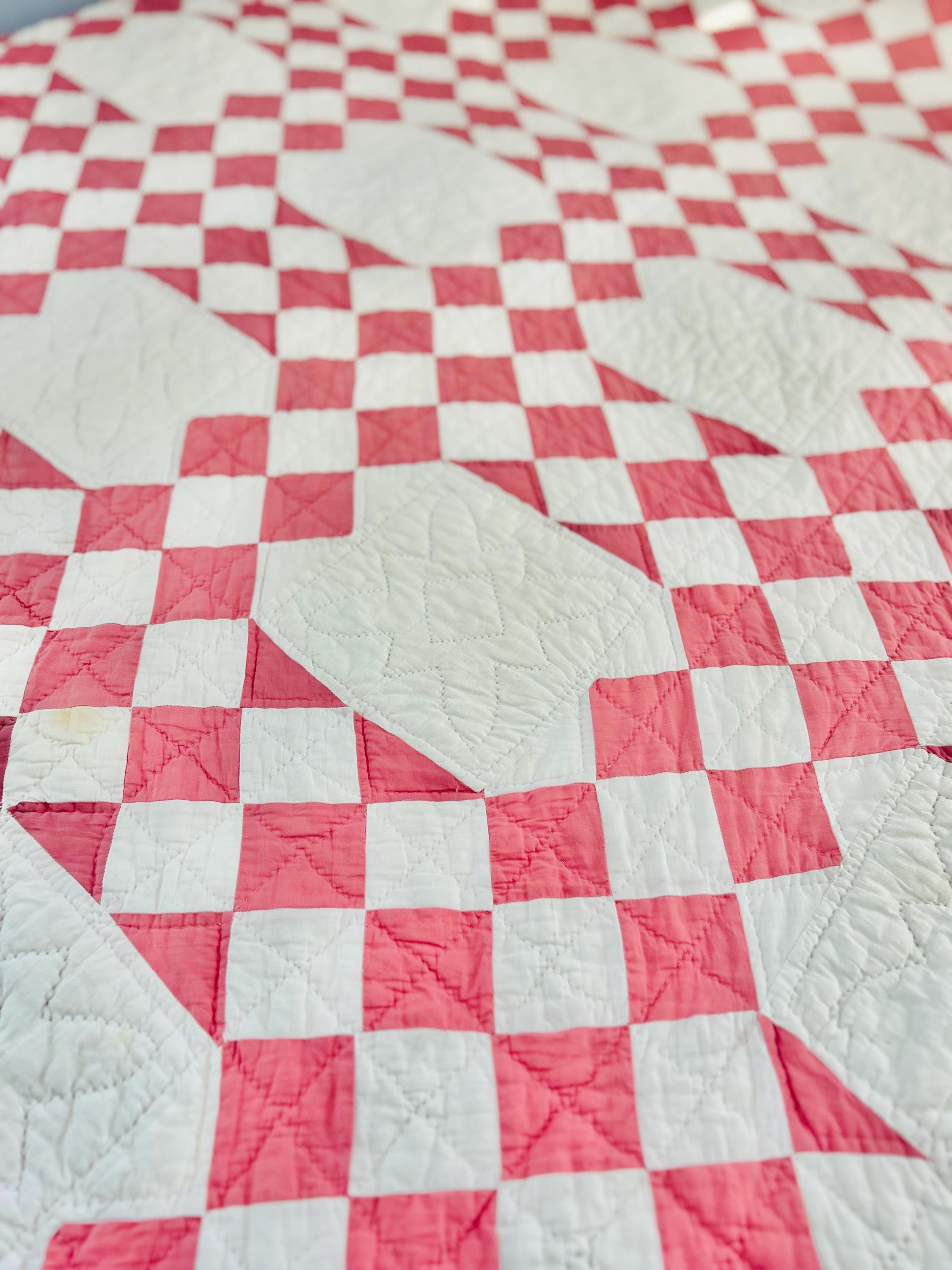 This lovely quilt is a Federal Chain pattern, circa 1930-1940s, and has been quilted in dark pink thread to match the fabric. The quilting is in geometric patterns and diagonal lines. There is a four-sided double border which is also quilted in geometric patterns and twisted ropes.