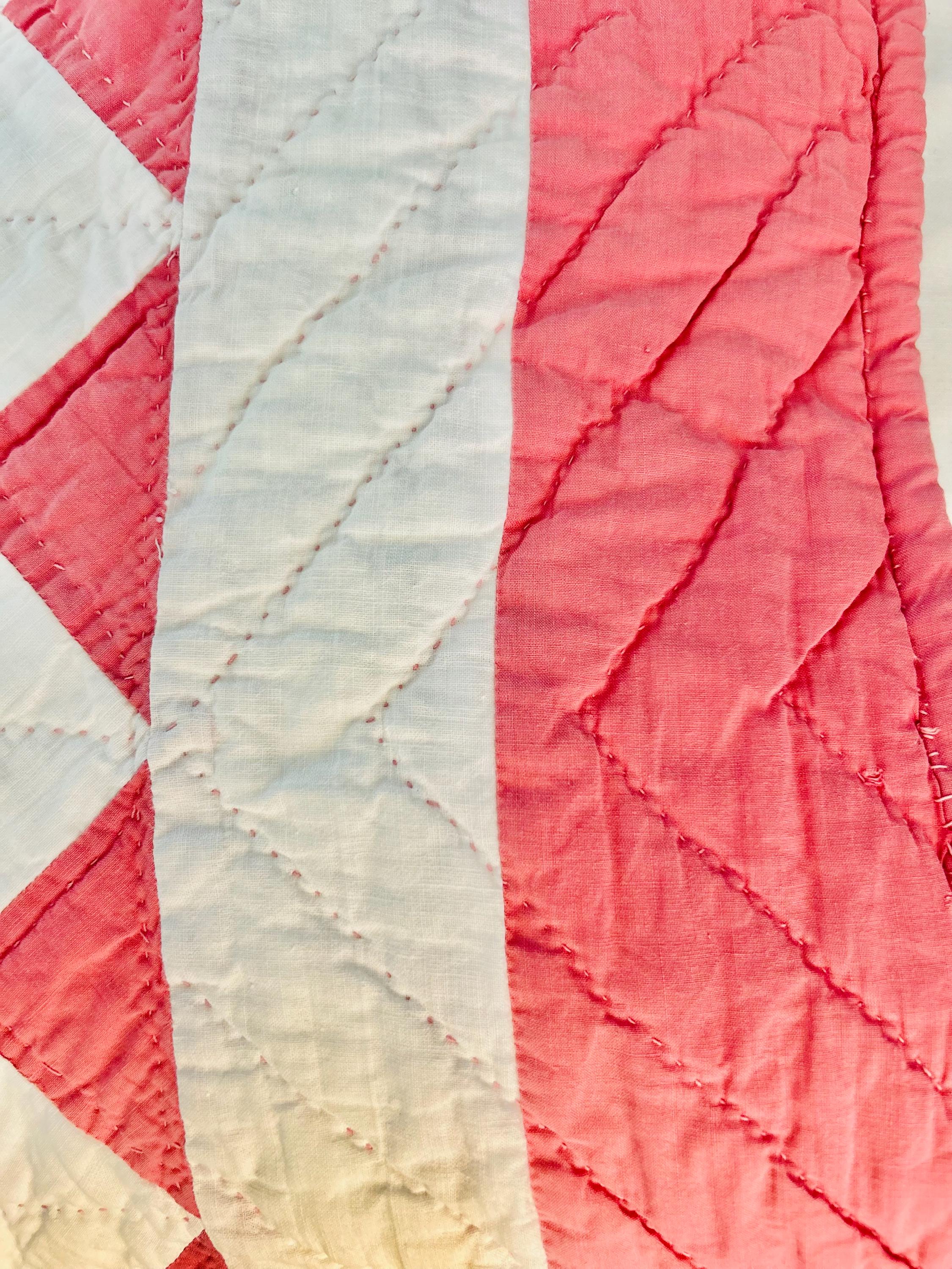 The back is white cotton bordered on four sides by pink cotton which has been turned to the front and hand-stitched to form the binding. The cotton batting is light-to-medium weight.