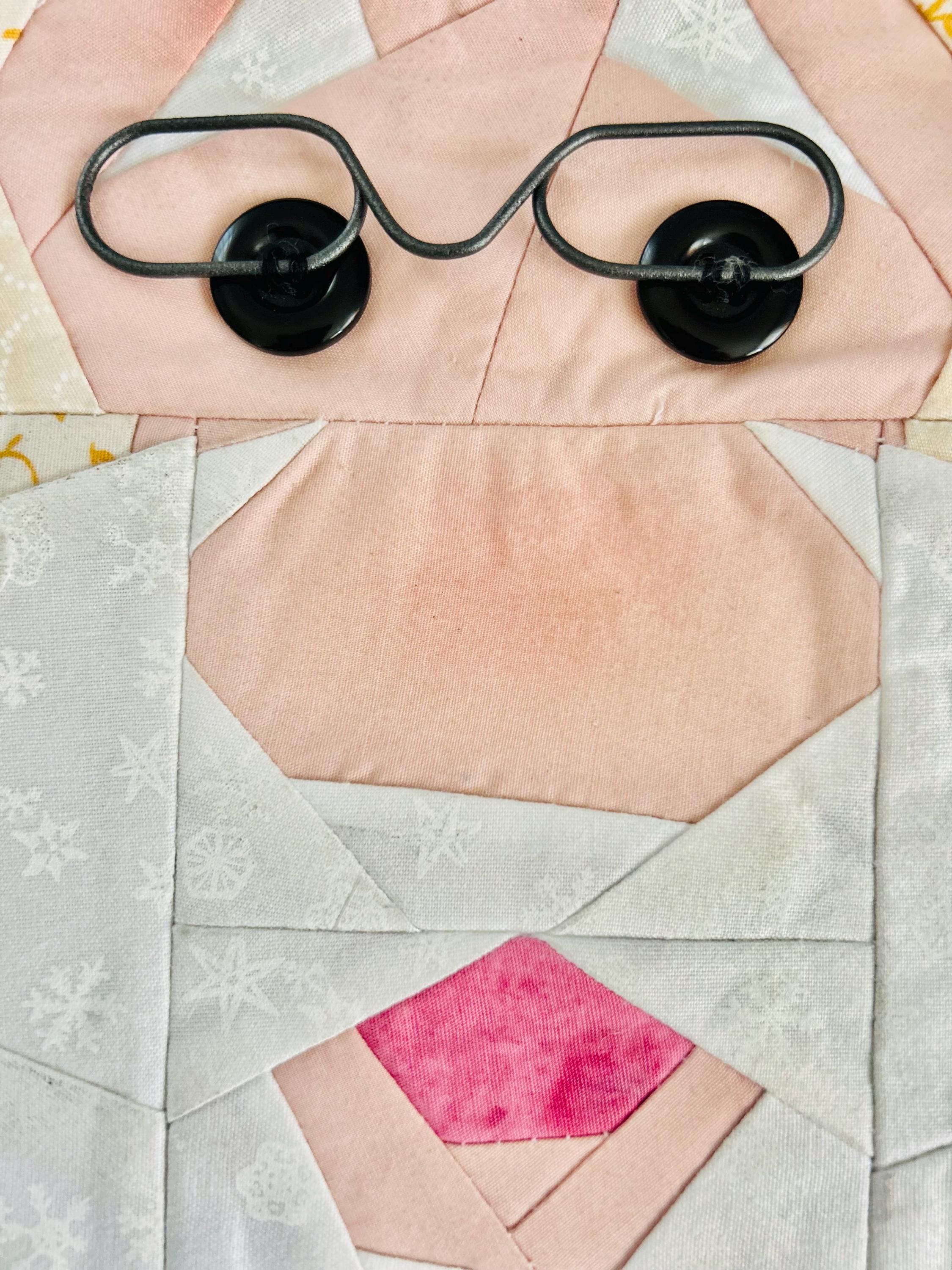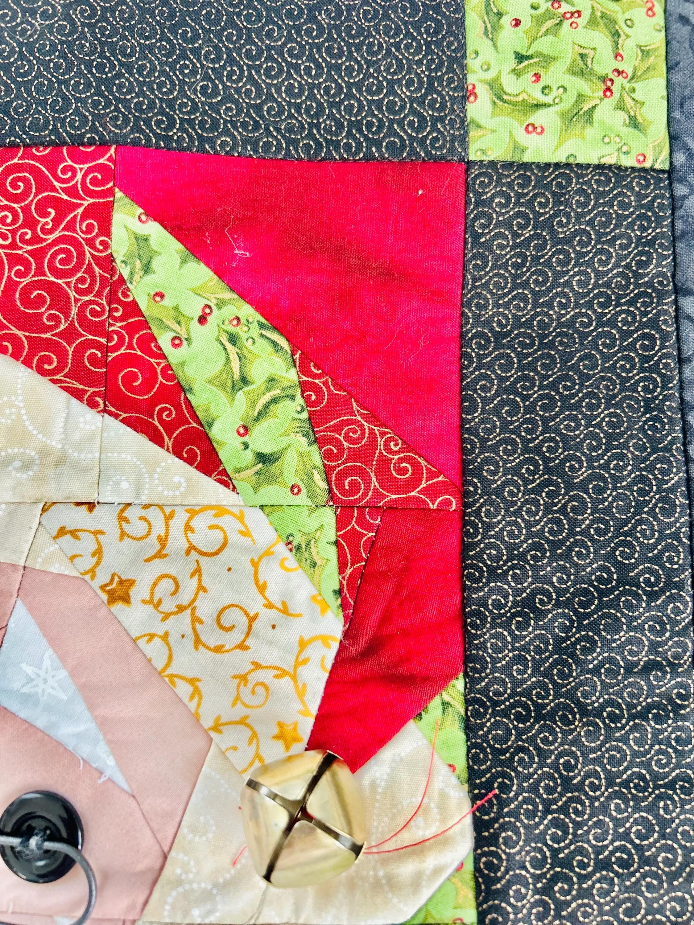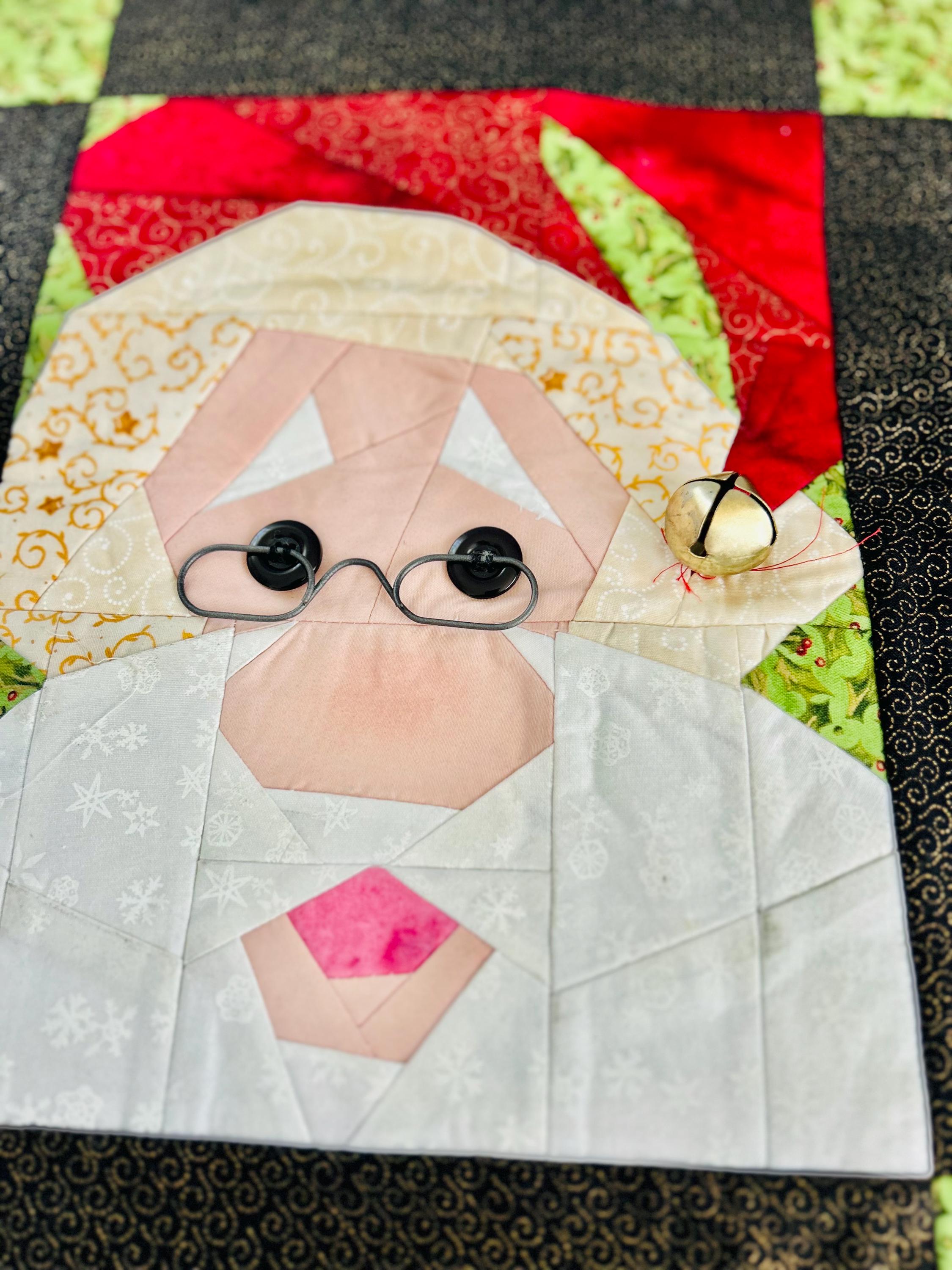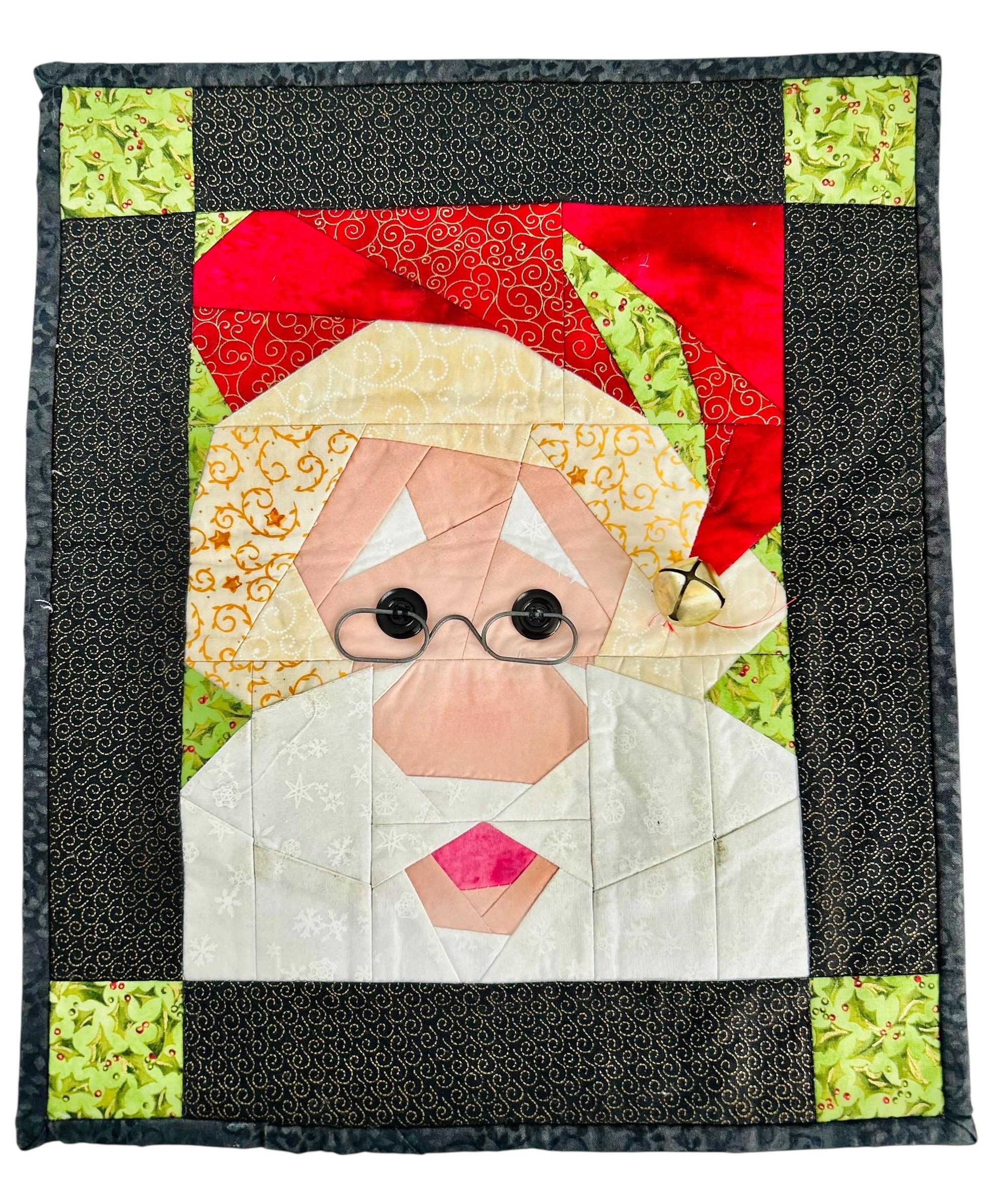 This Santa Claus Table Mat or accent piece has button eyes, metal spectacles and one jingle bell. It has been pieced from high-quality cottons and machine quilted.