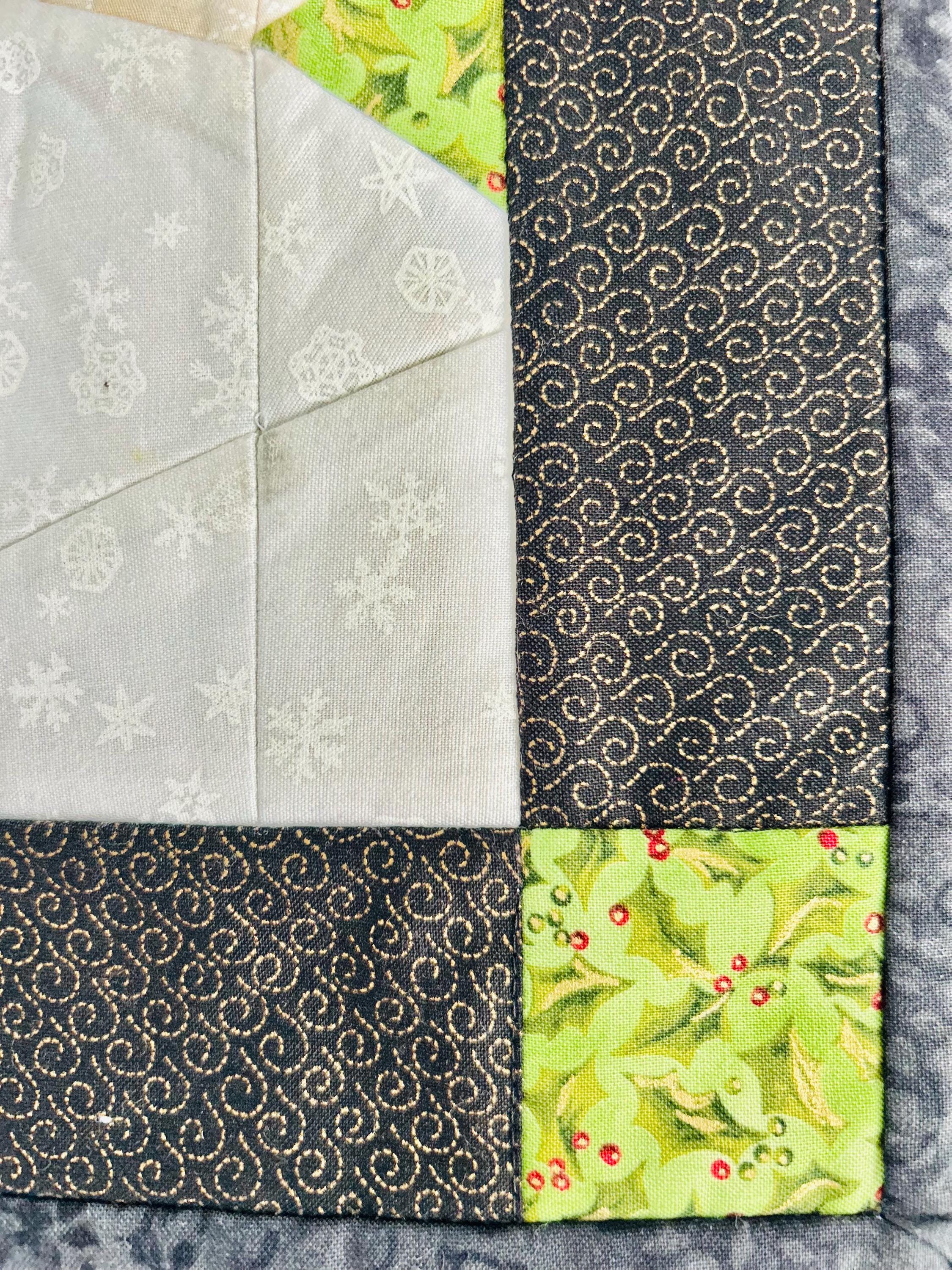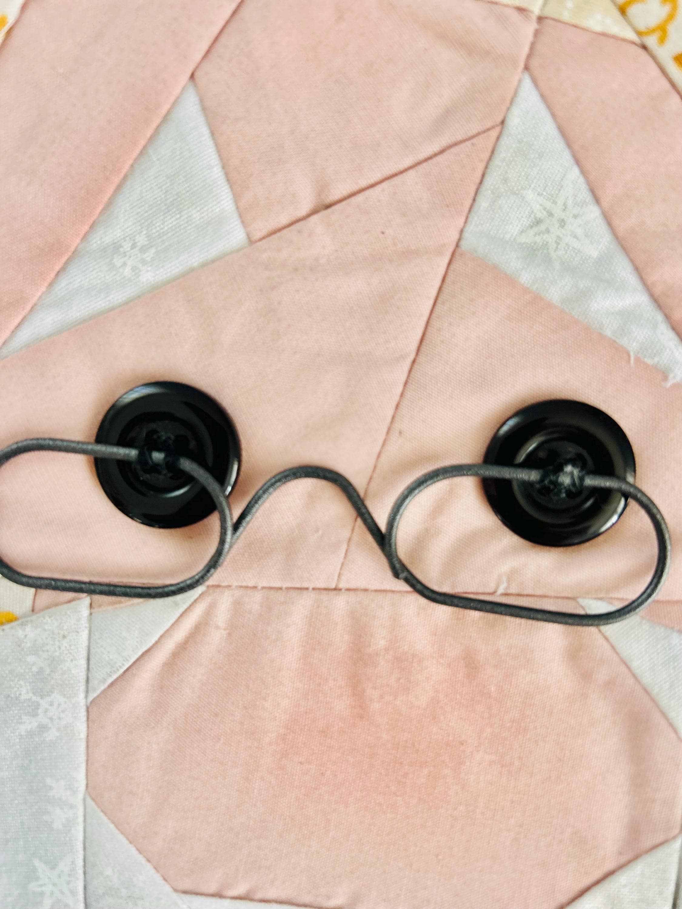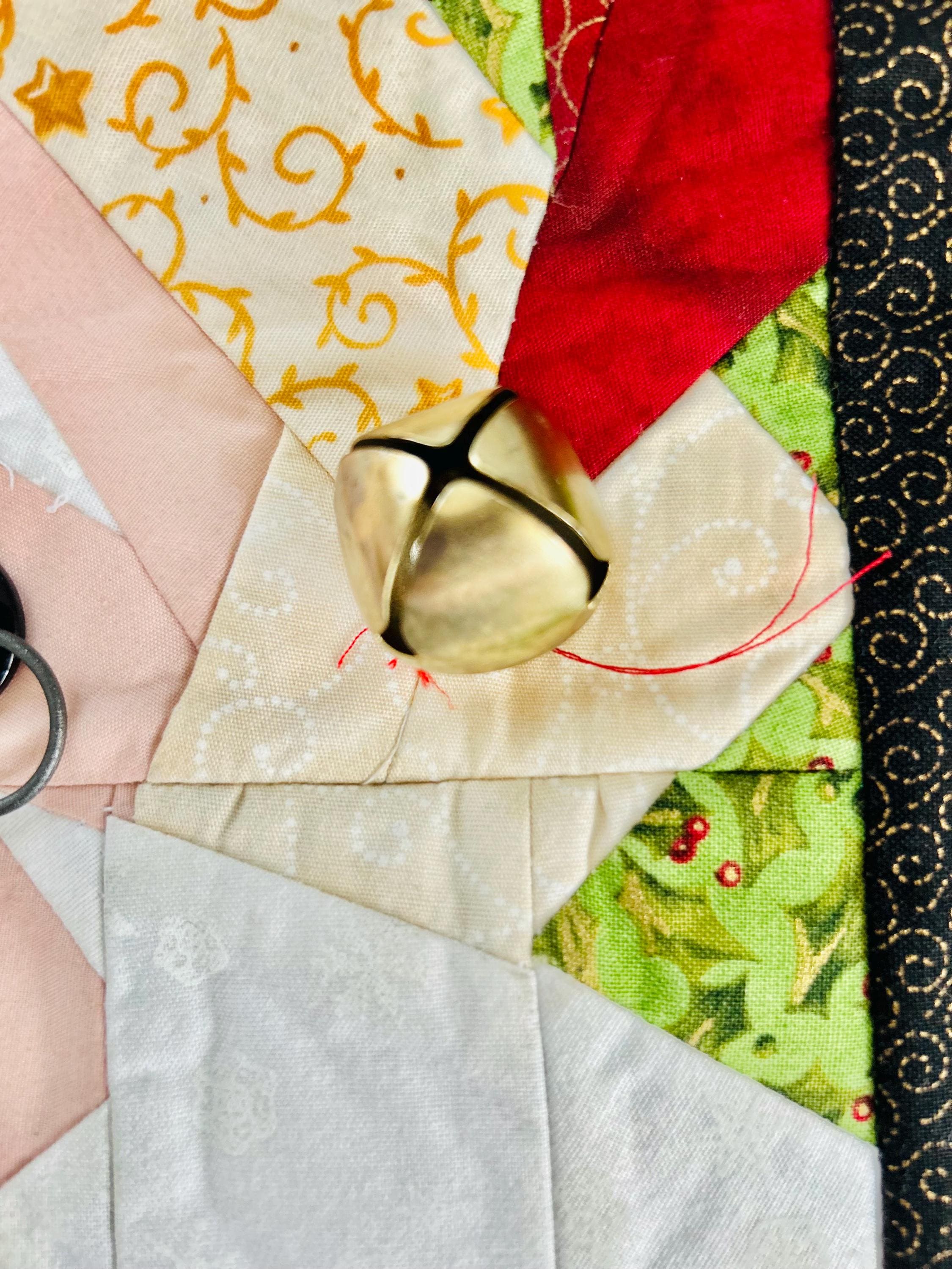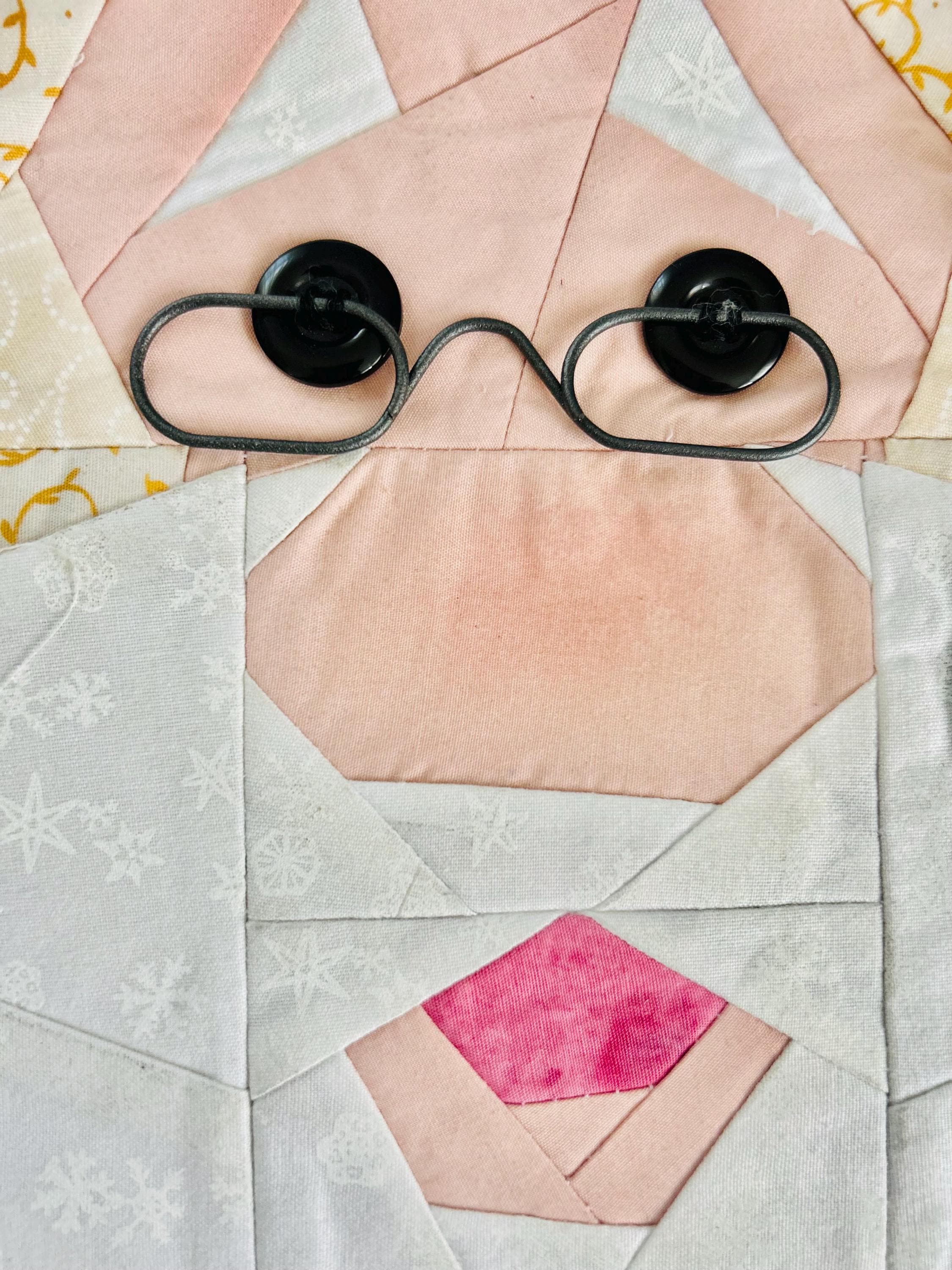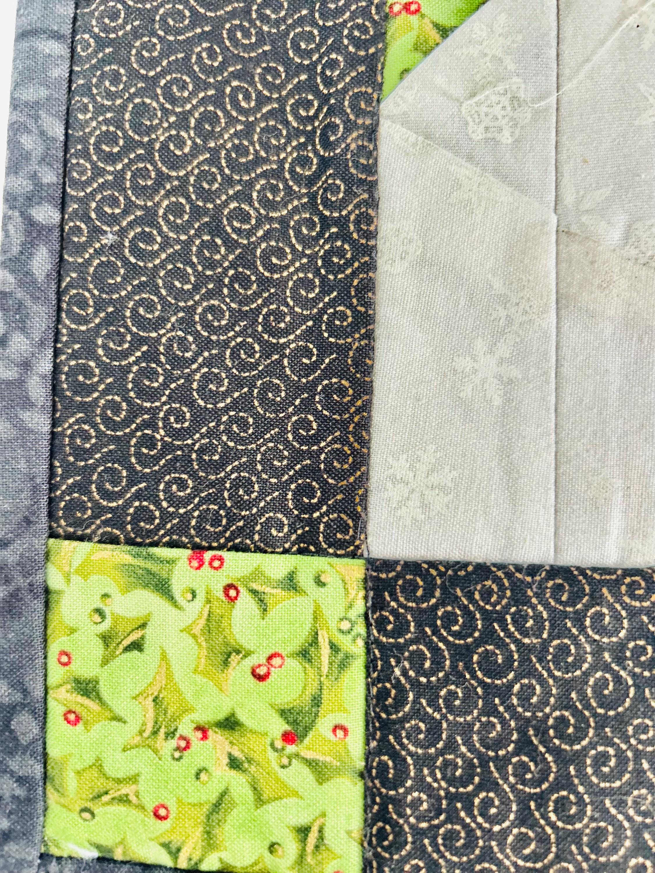 This Santa Claus Table Mat or accent piece has button eyes, metal spectacles and one jingle bell. It has been pieced from high-quality cottons and machine quilted.