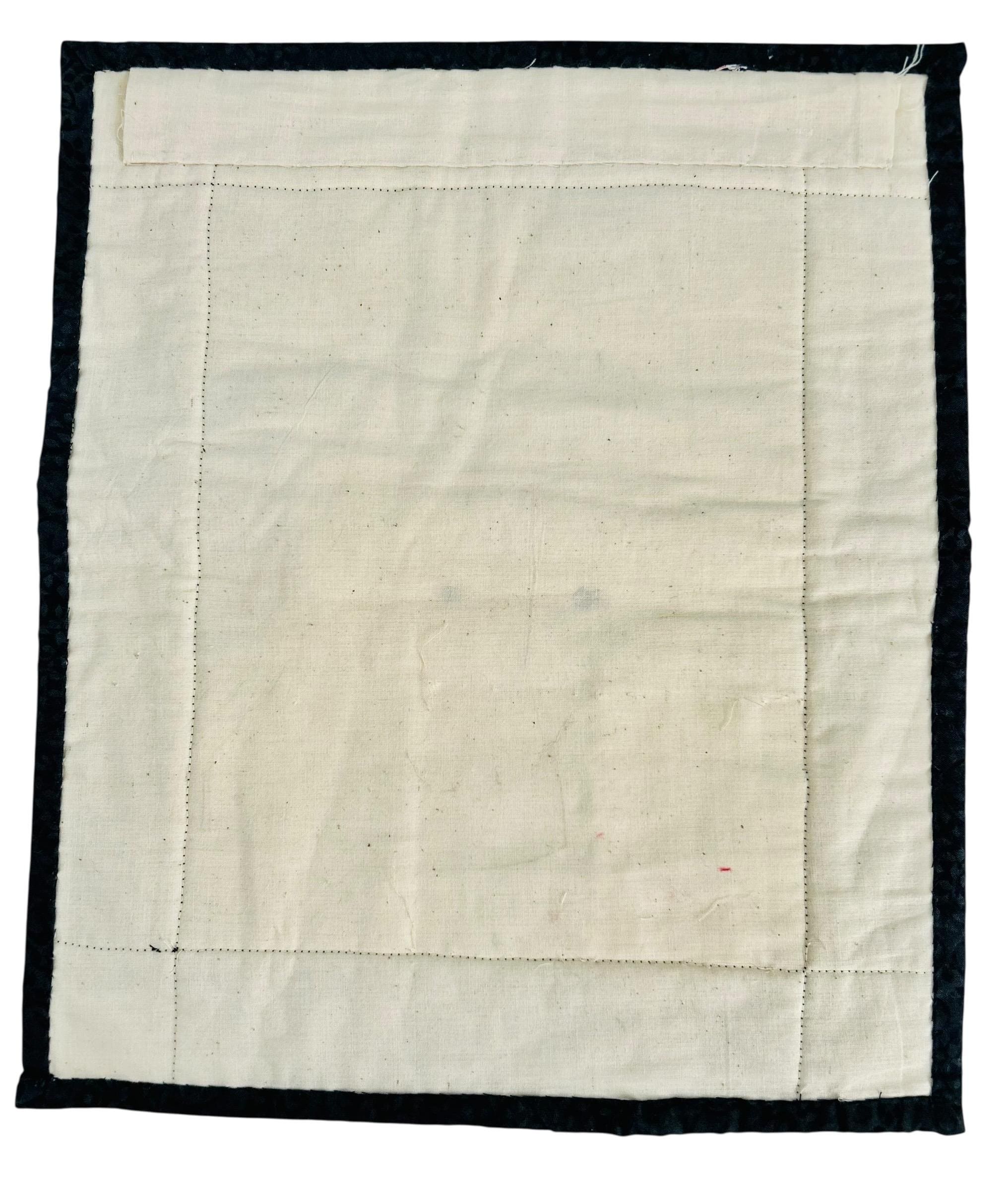 It measures 13 inches by 15 inches and has a display sleeve sewn into the back.
