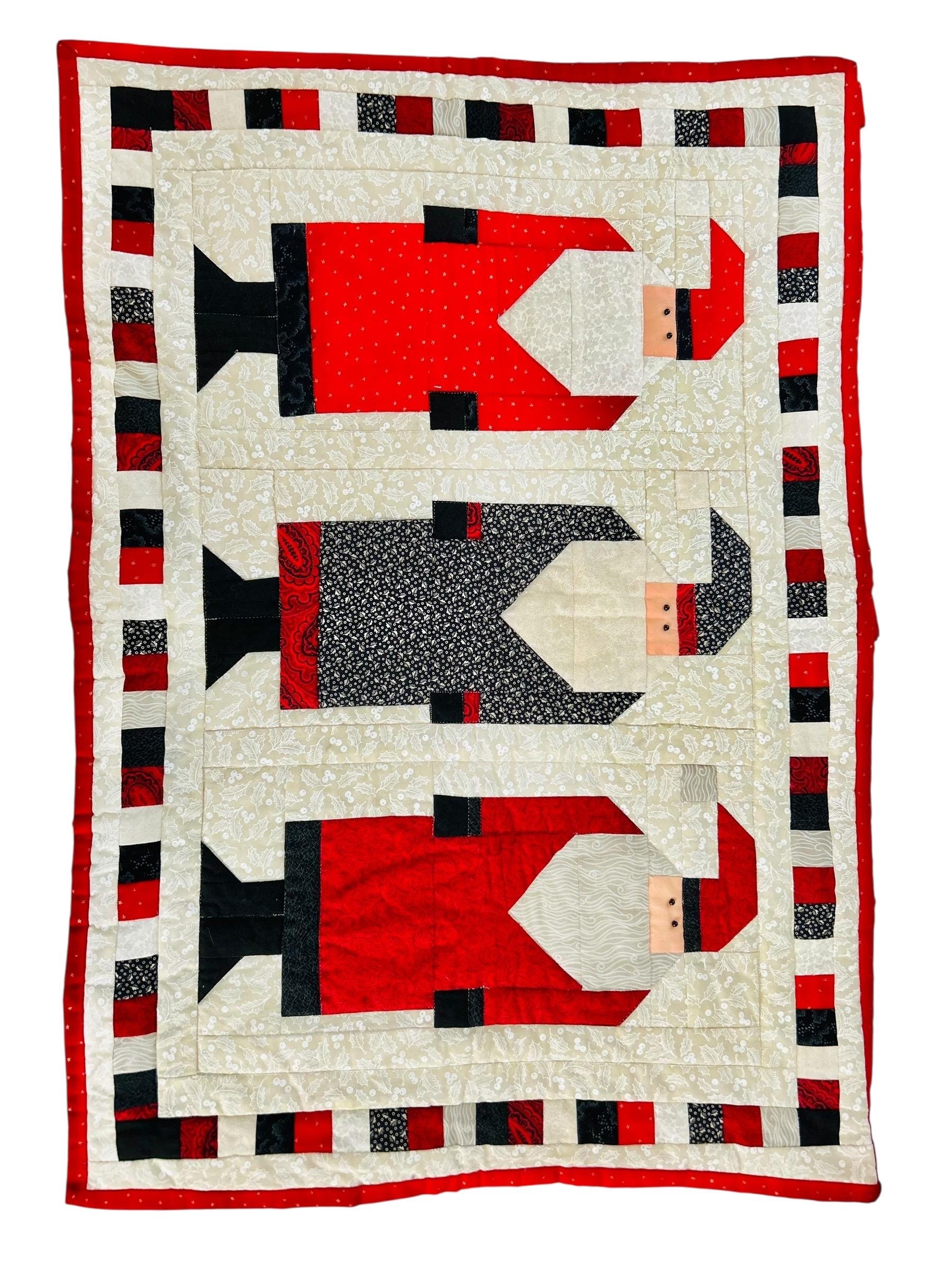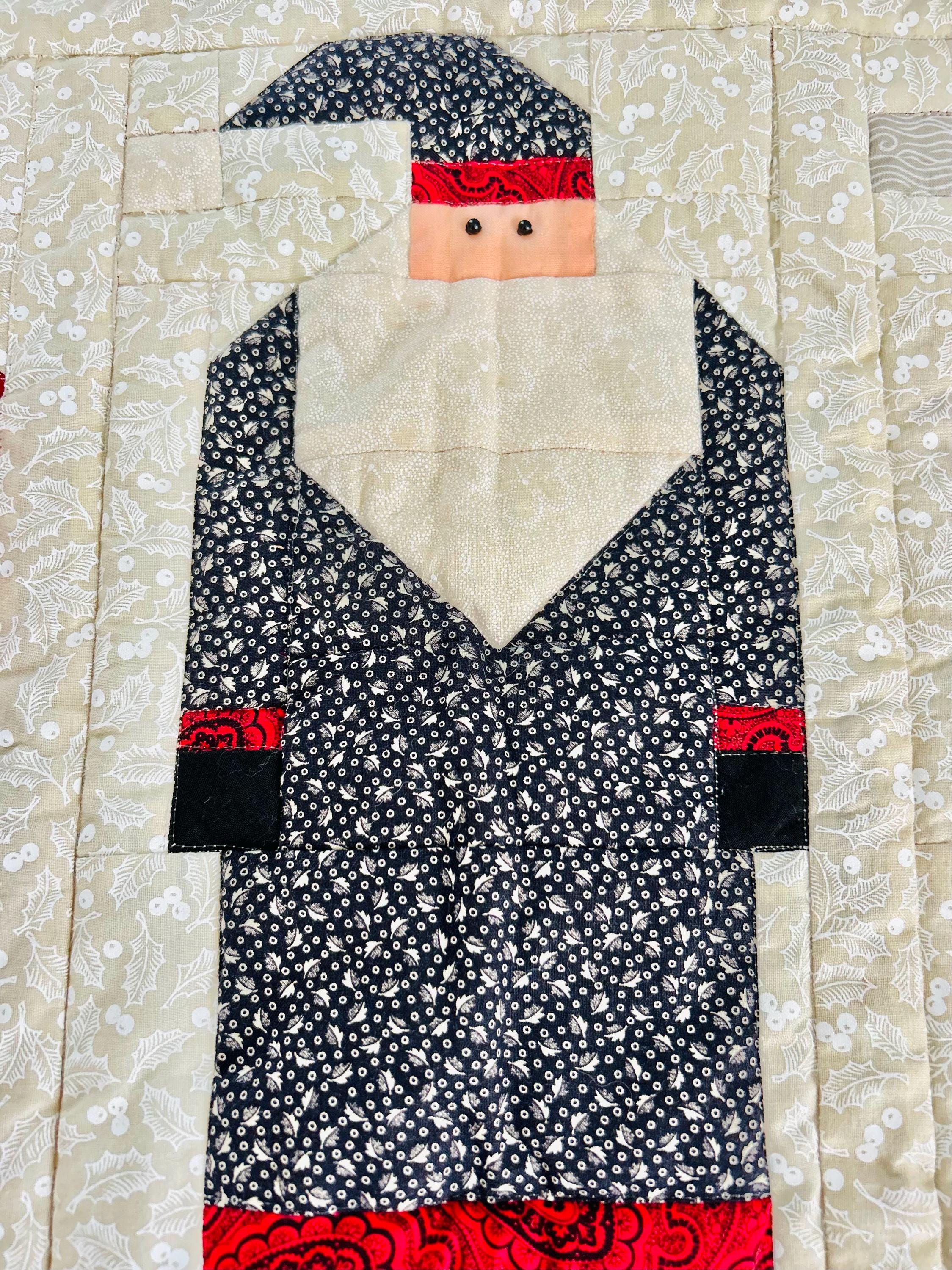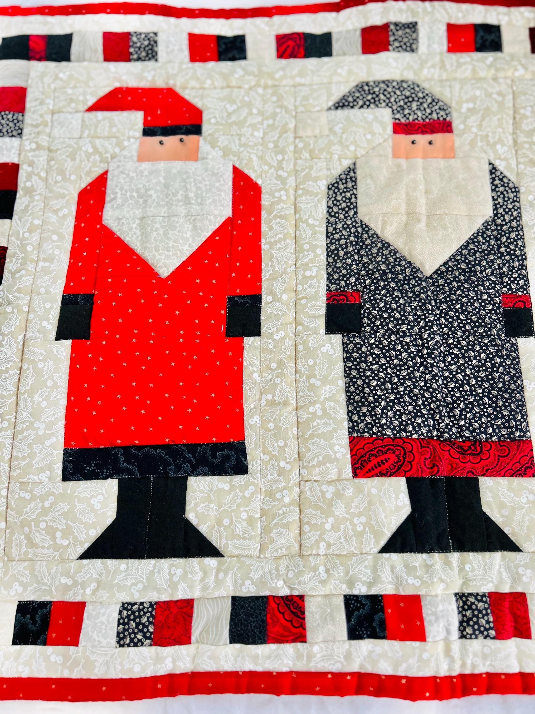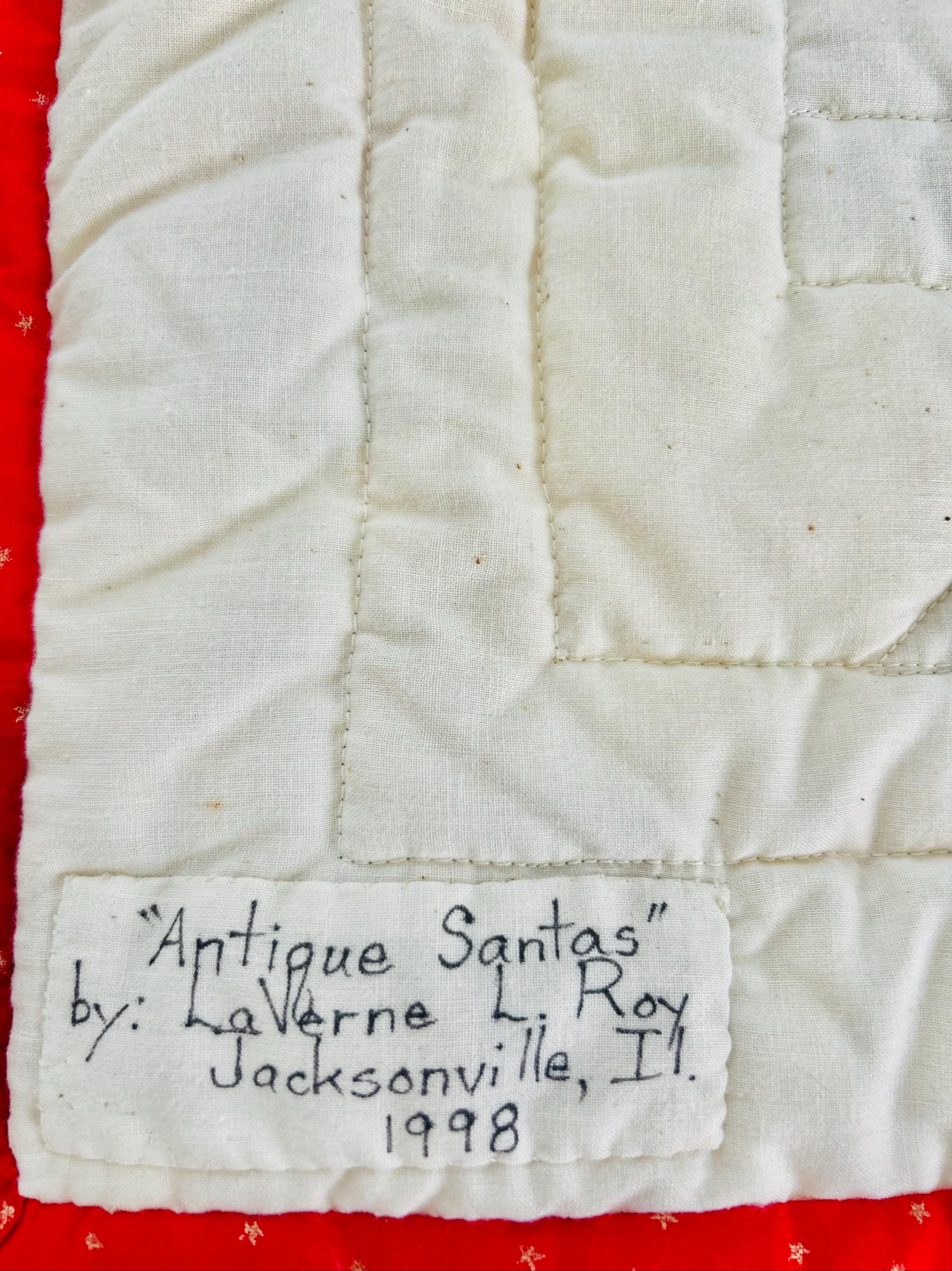 "Antique Santas" Table Runner, Table Mat or Display piece with display tabs. Machine pieced and quilted, it is made from high-quality cottons and is signed "LaVerne Roy" and dated 1998. The back is a off-white cotton and the batting is very lightweight.
