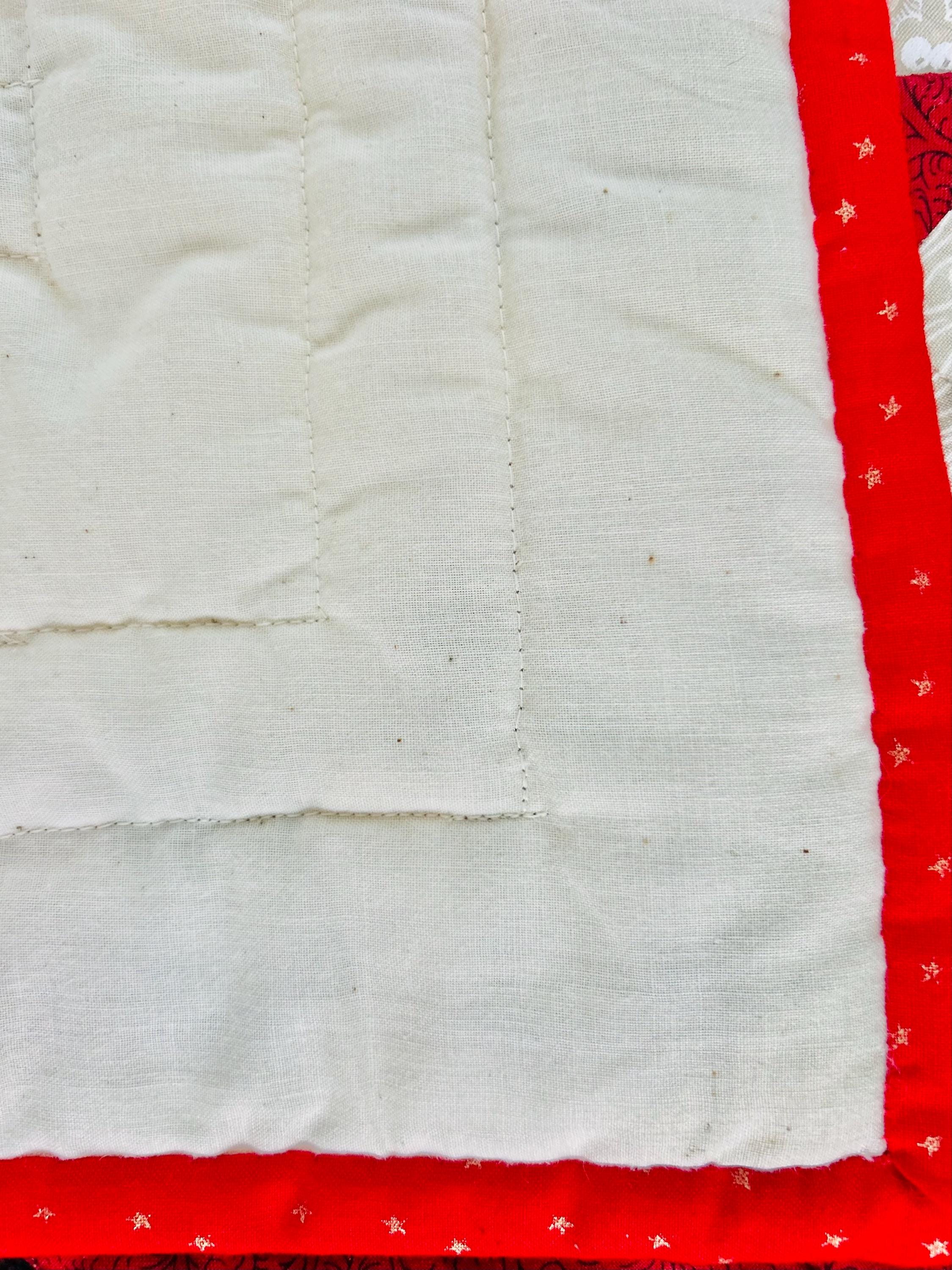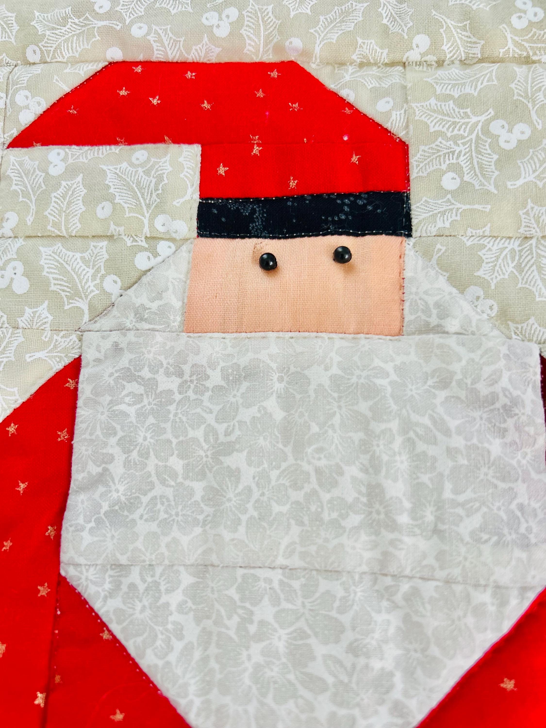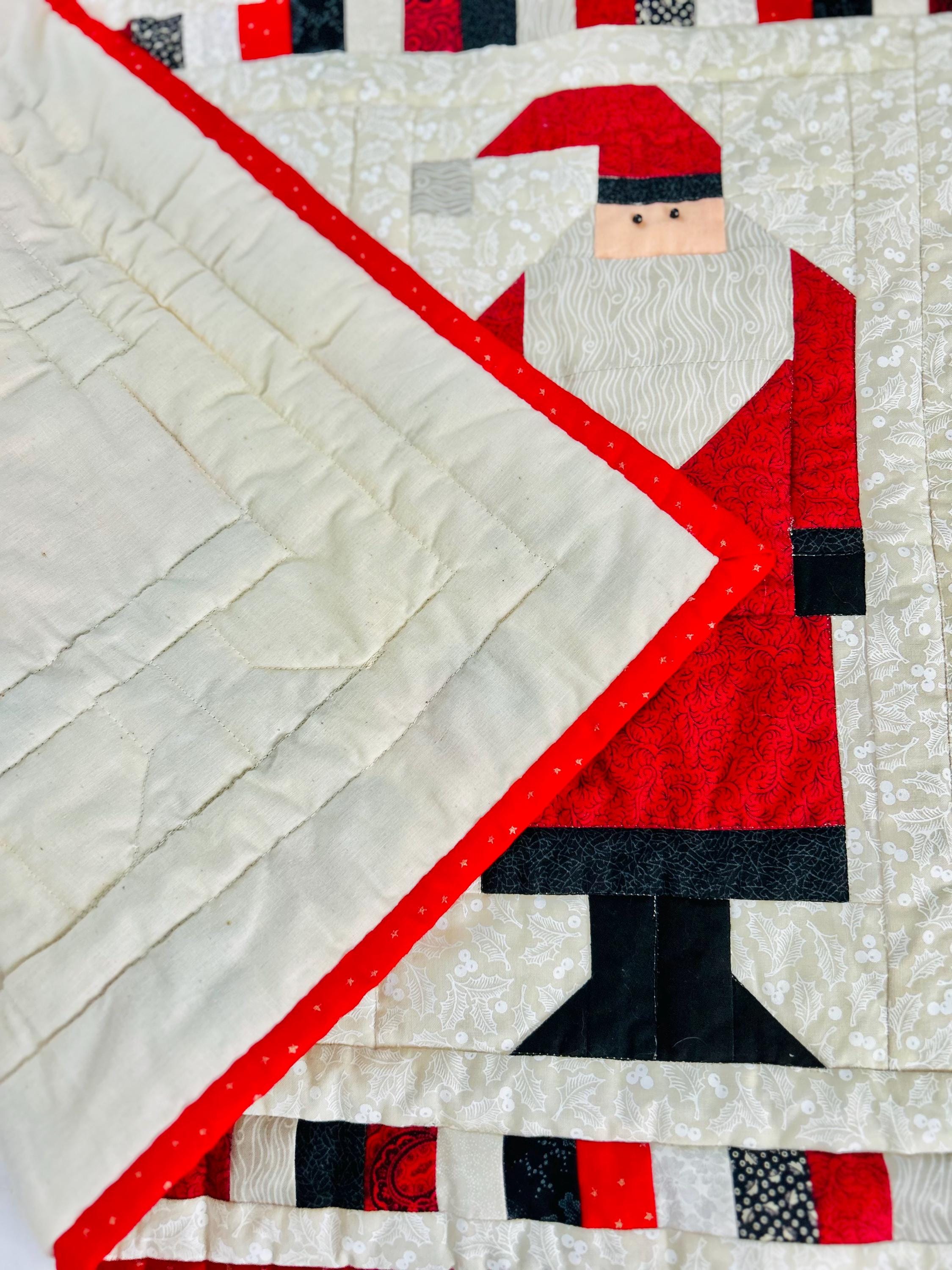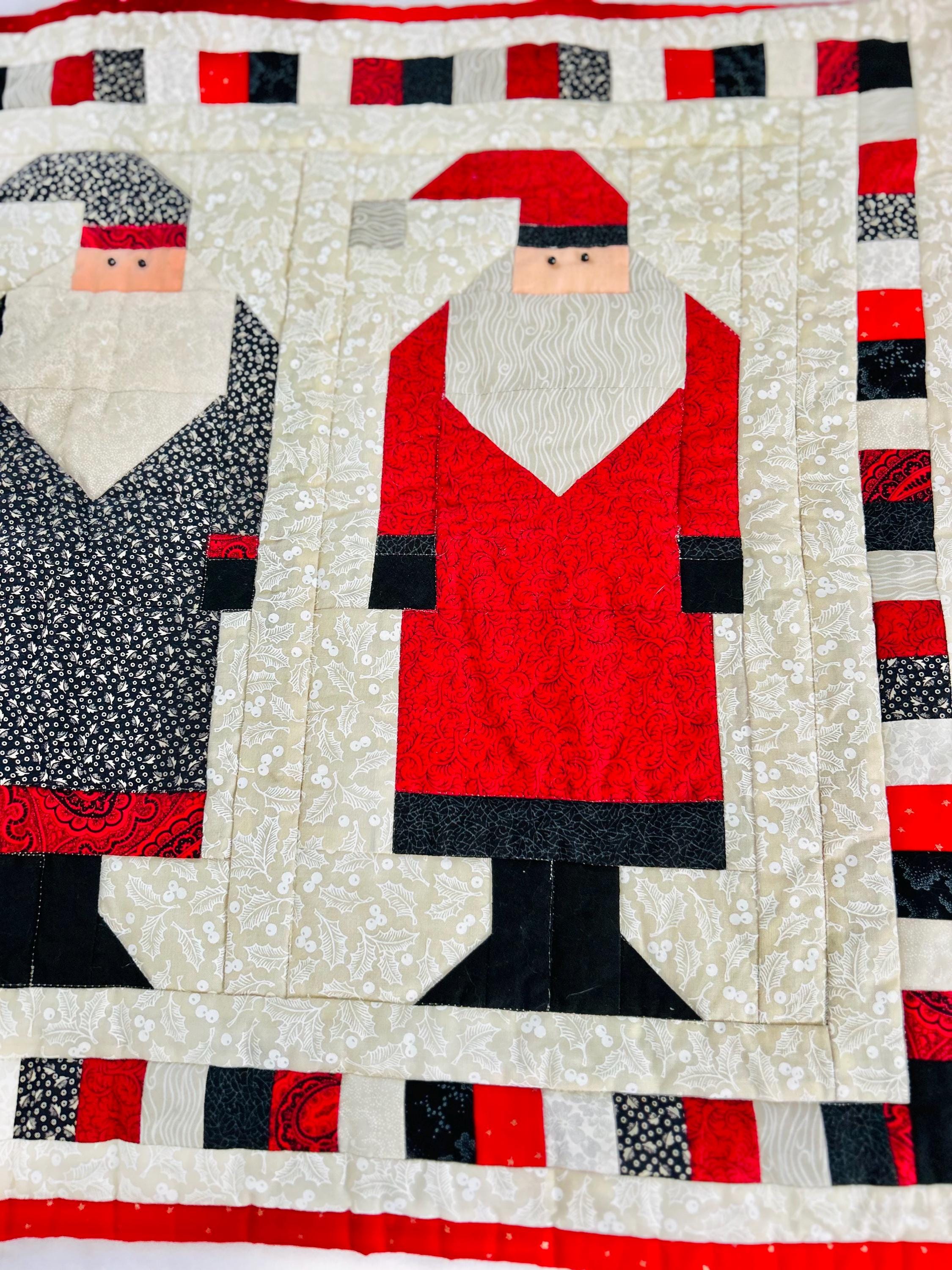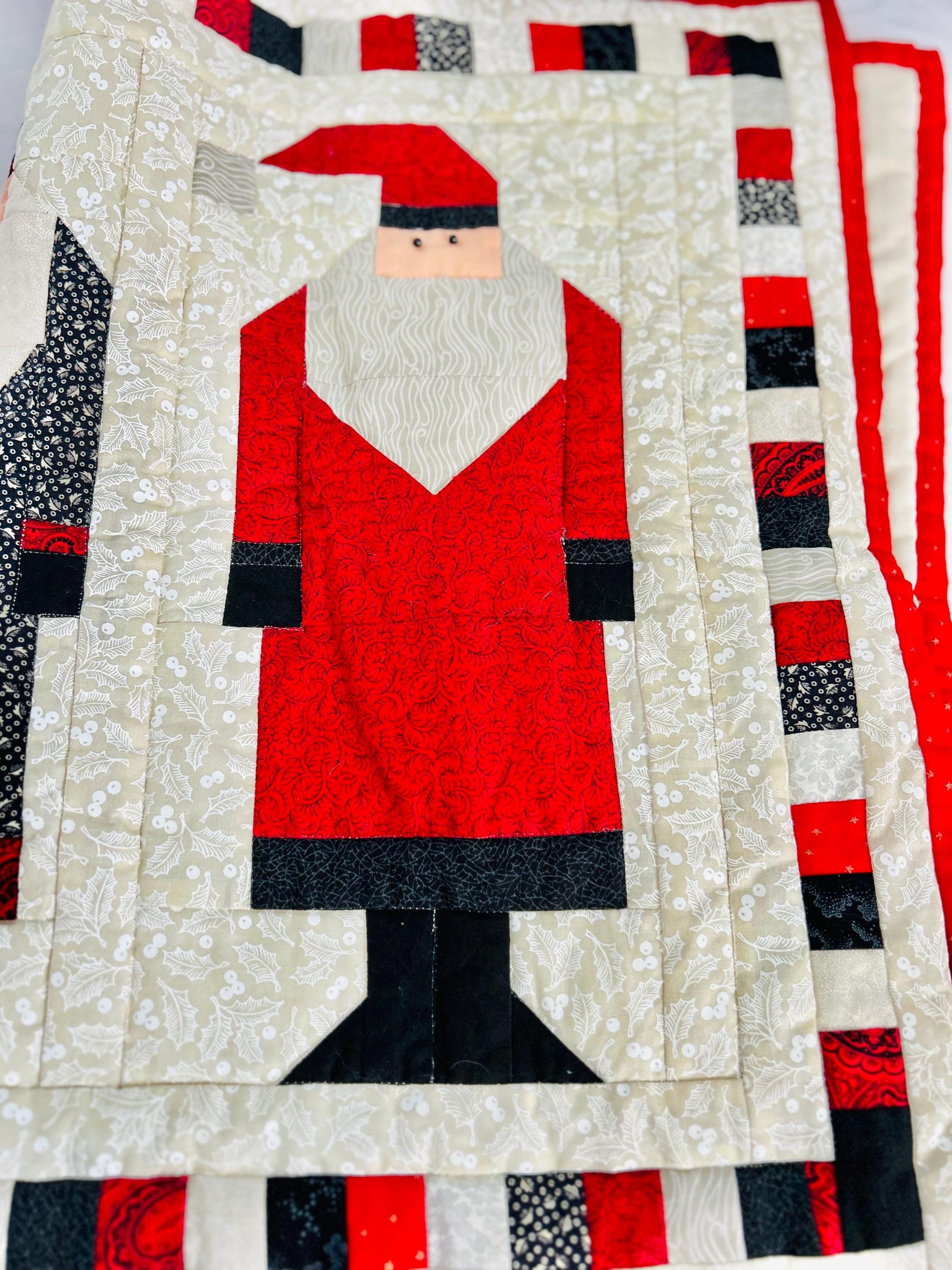 "Antique Santas" Table Runner, Table Mat or Display piece with display tabs. Machine pieced and quilted, it is made from high-quality cottons and is signed "LaVerne Roy" and dated 1998. The back is a off-white cotton and the batting is very lightweight.
