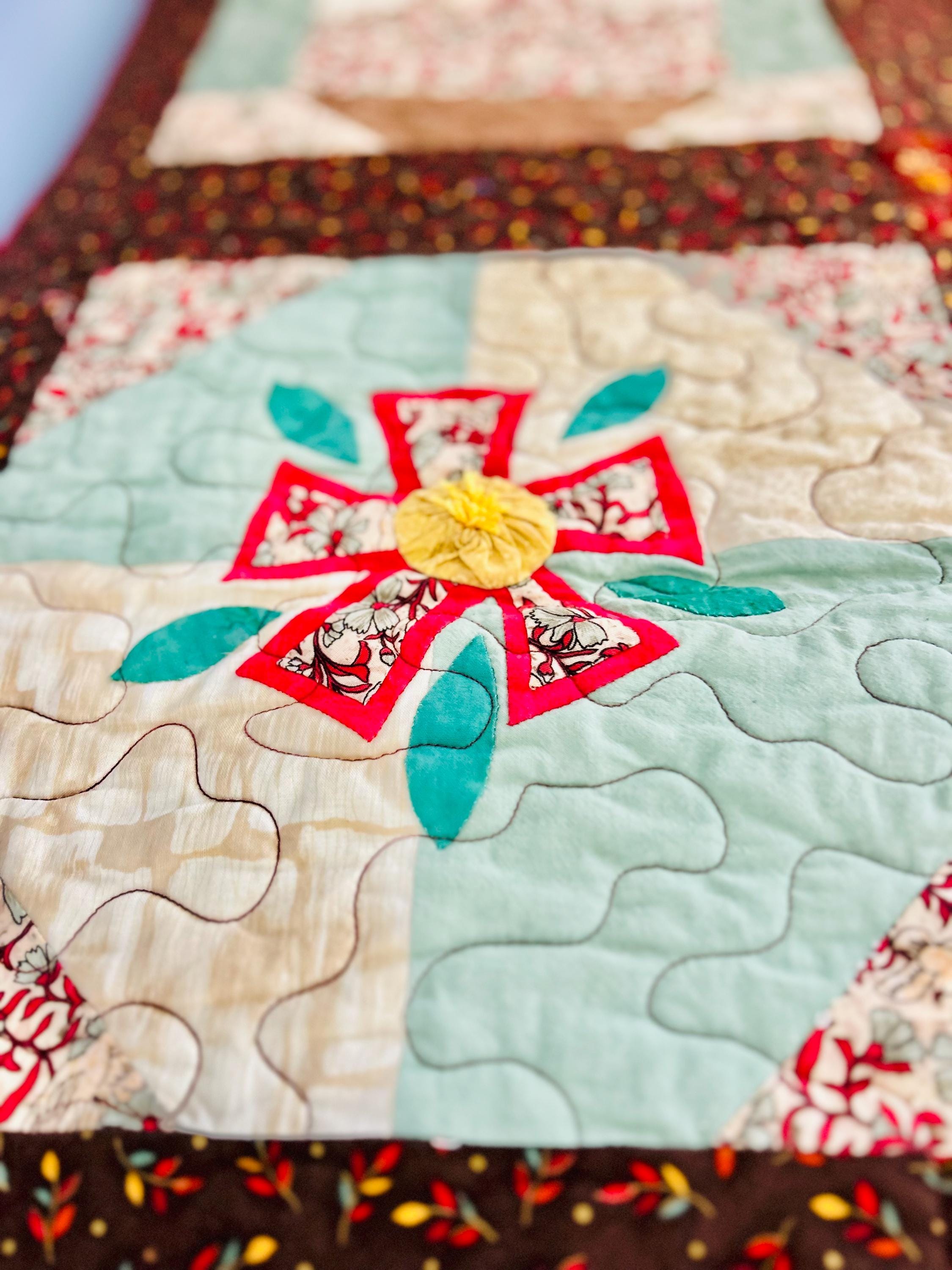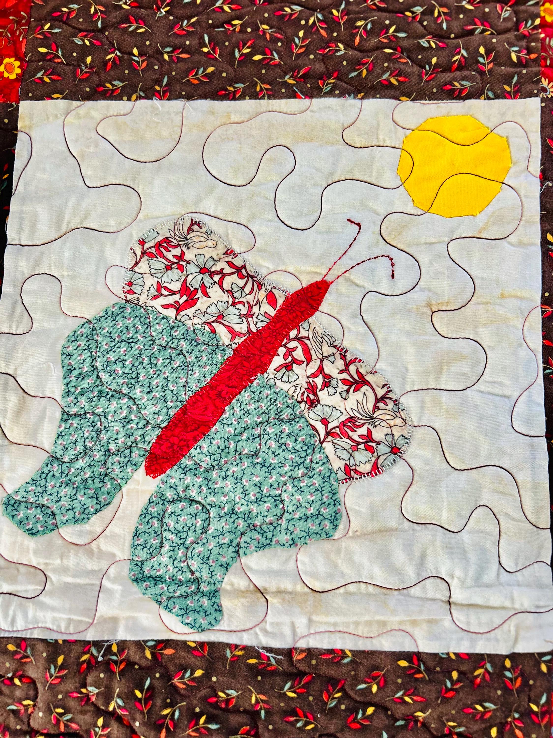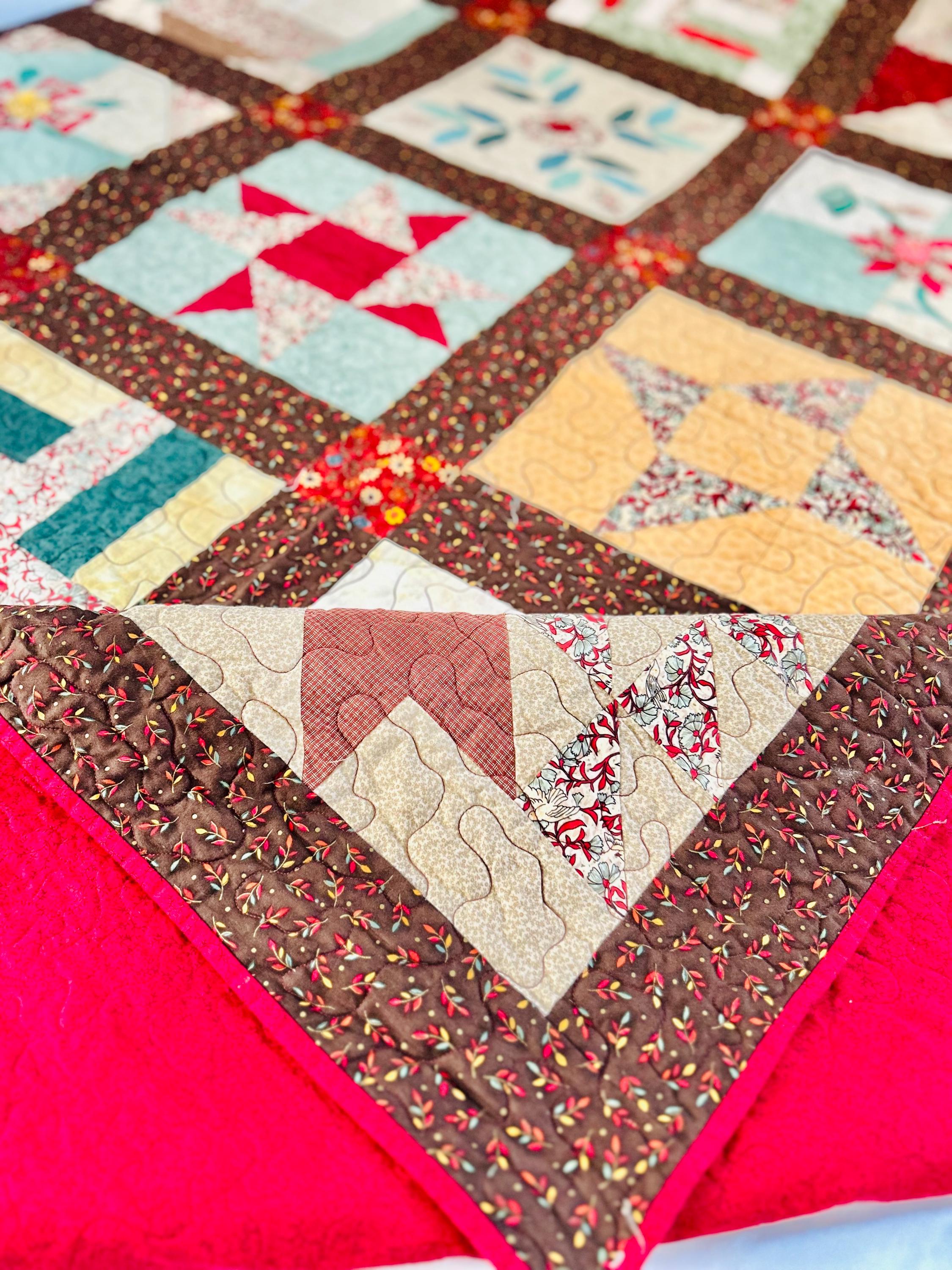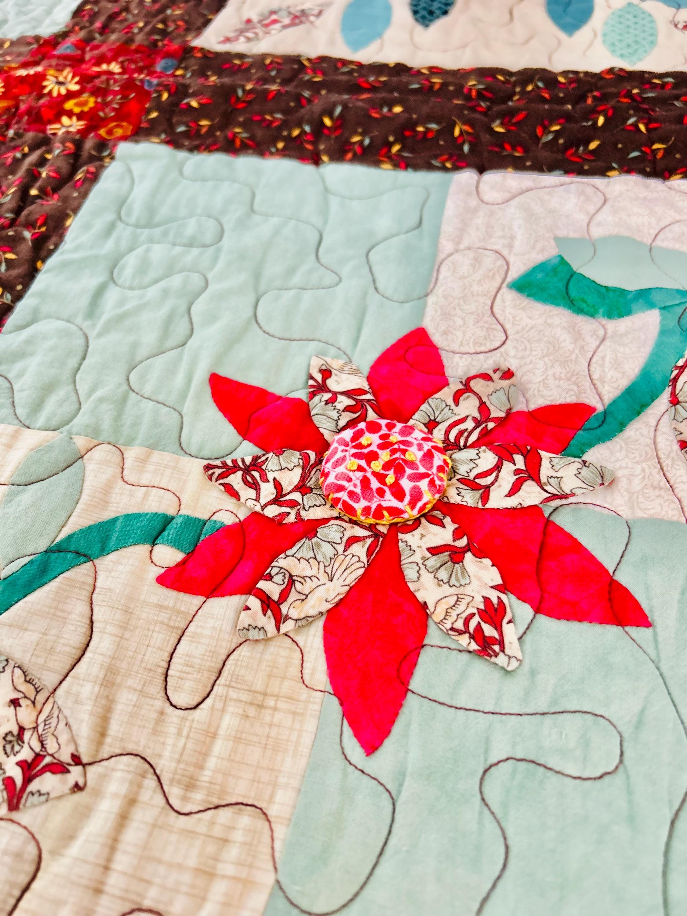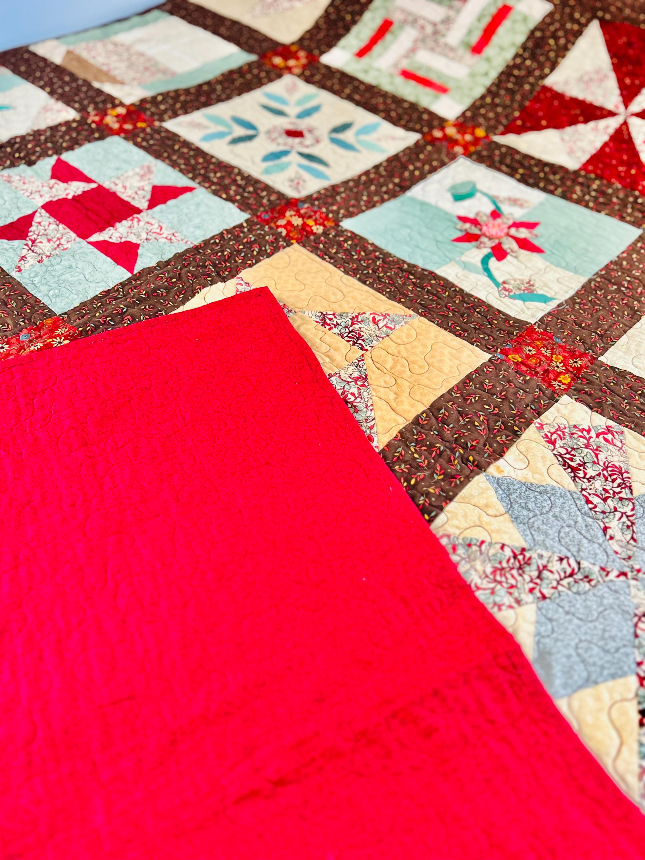 The back is a deep red and black cotton print as is the binding which has been machine stitched to the front and hand-stitched to the back. The batting is lightweight.