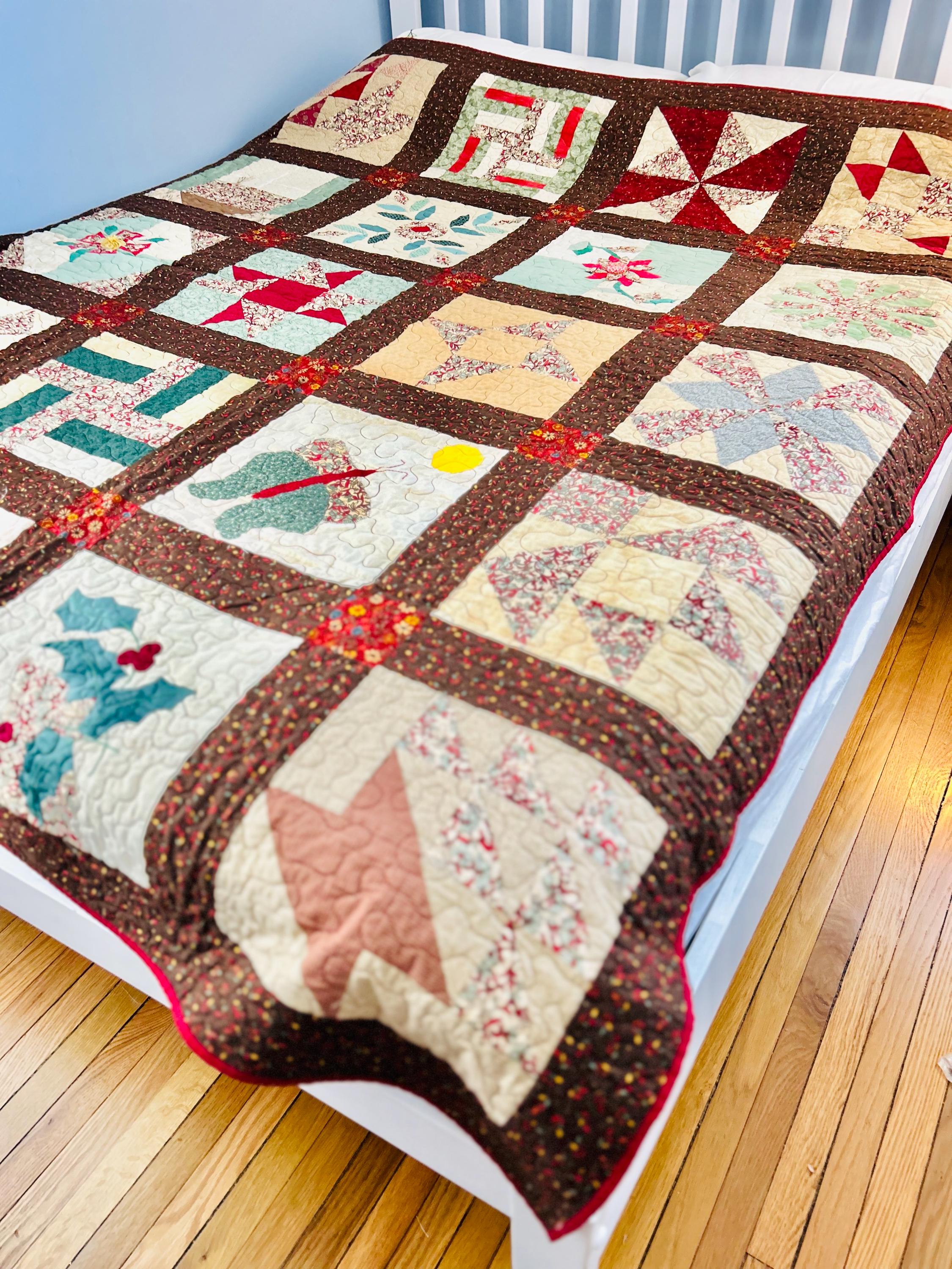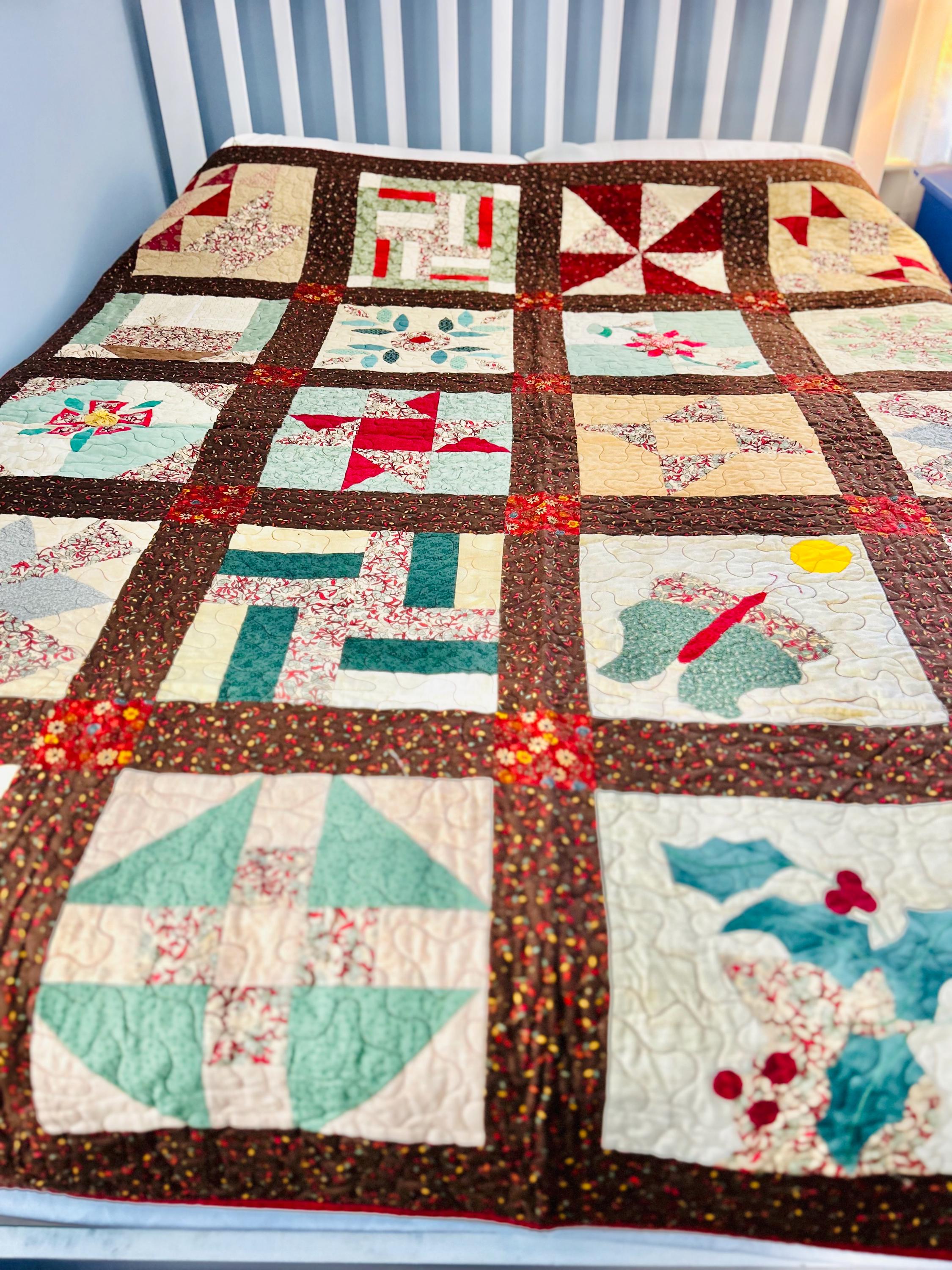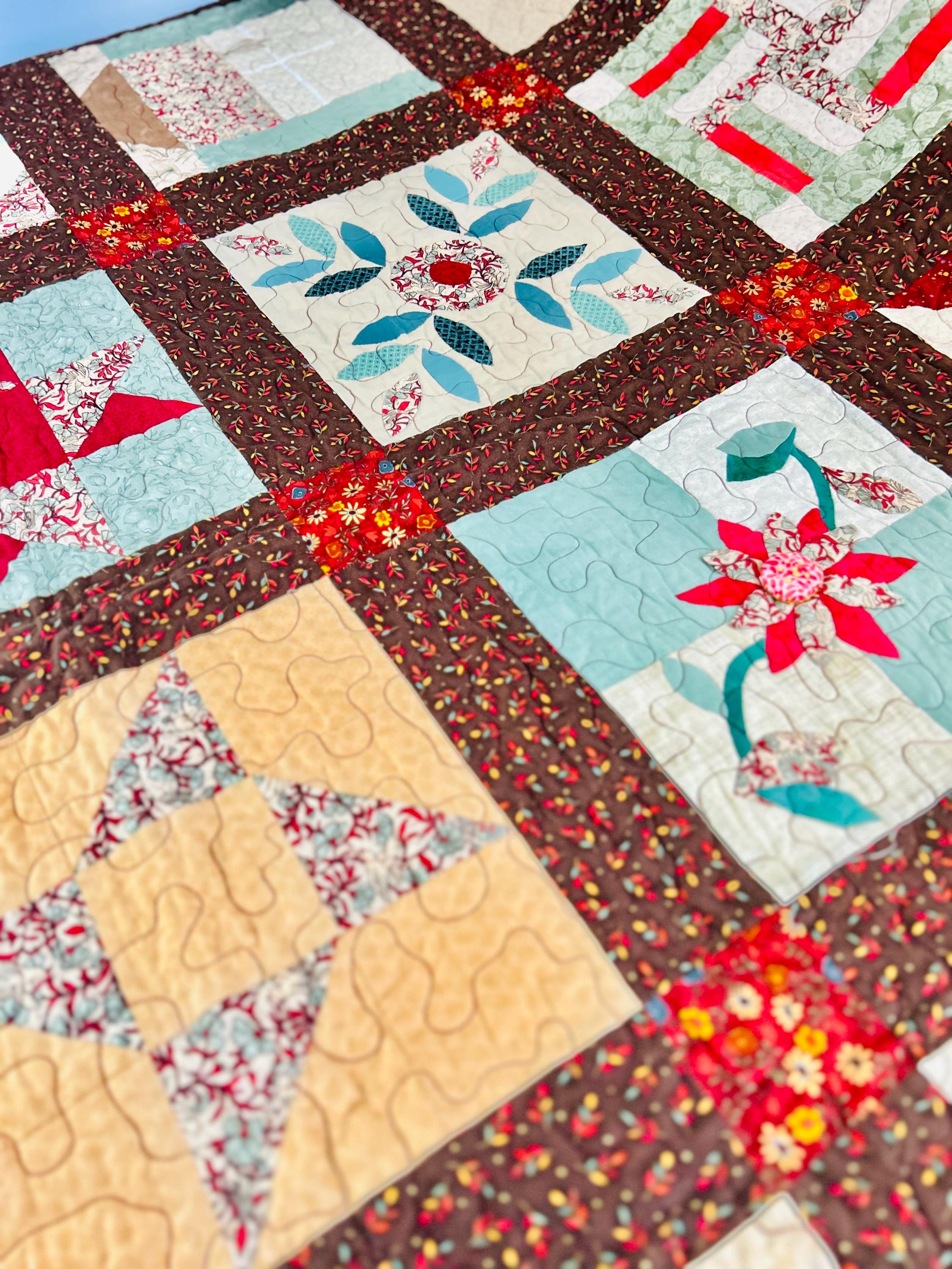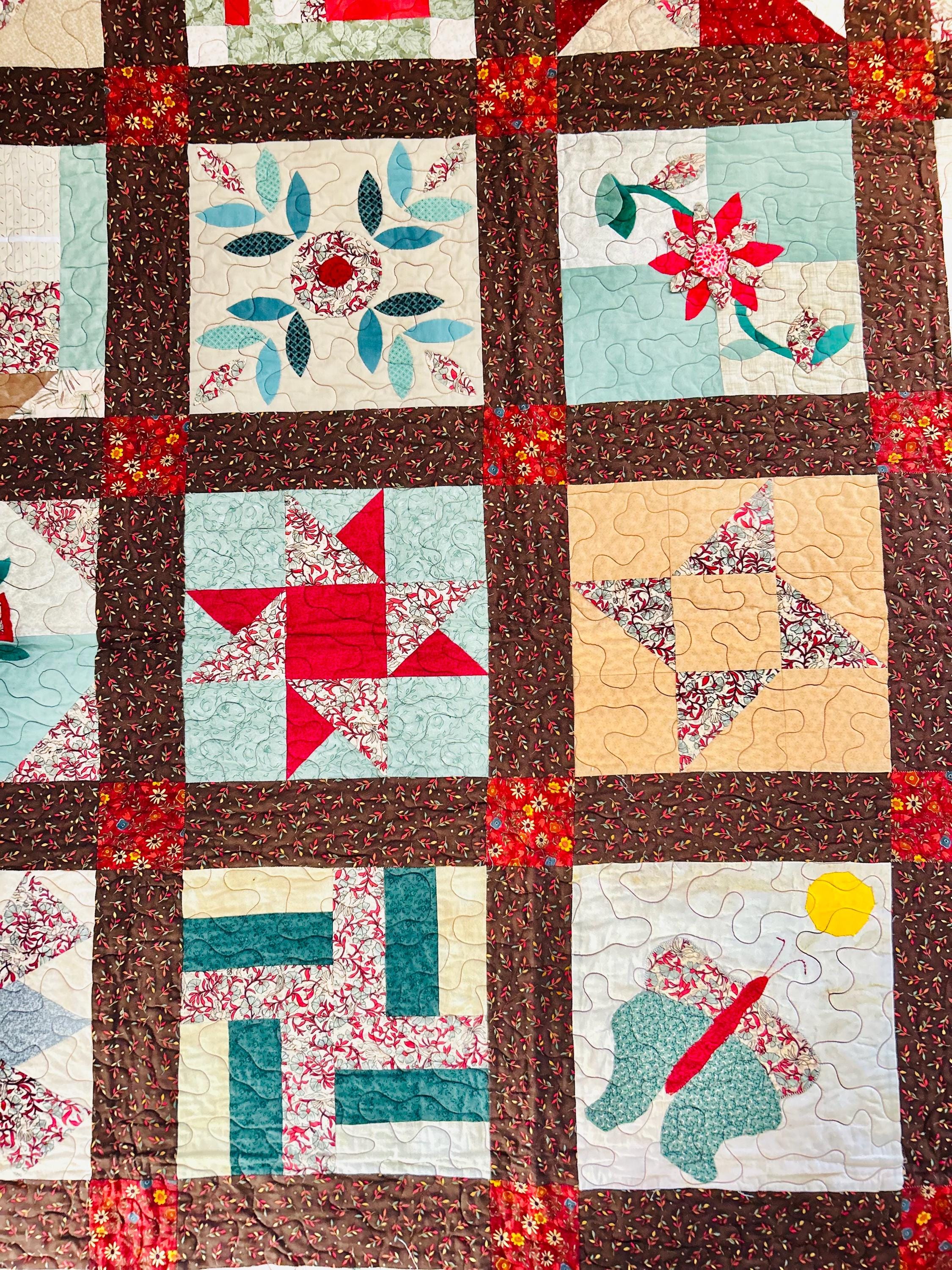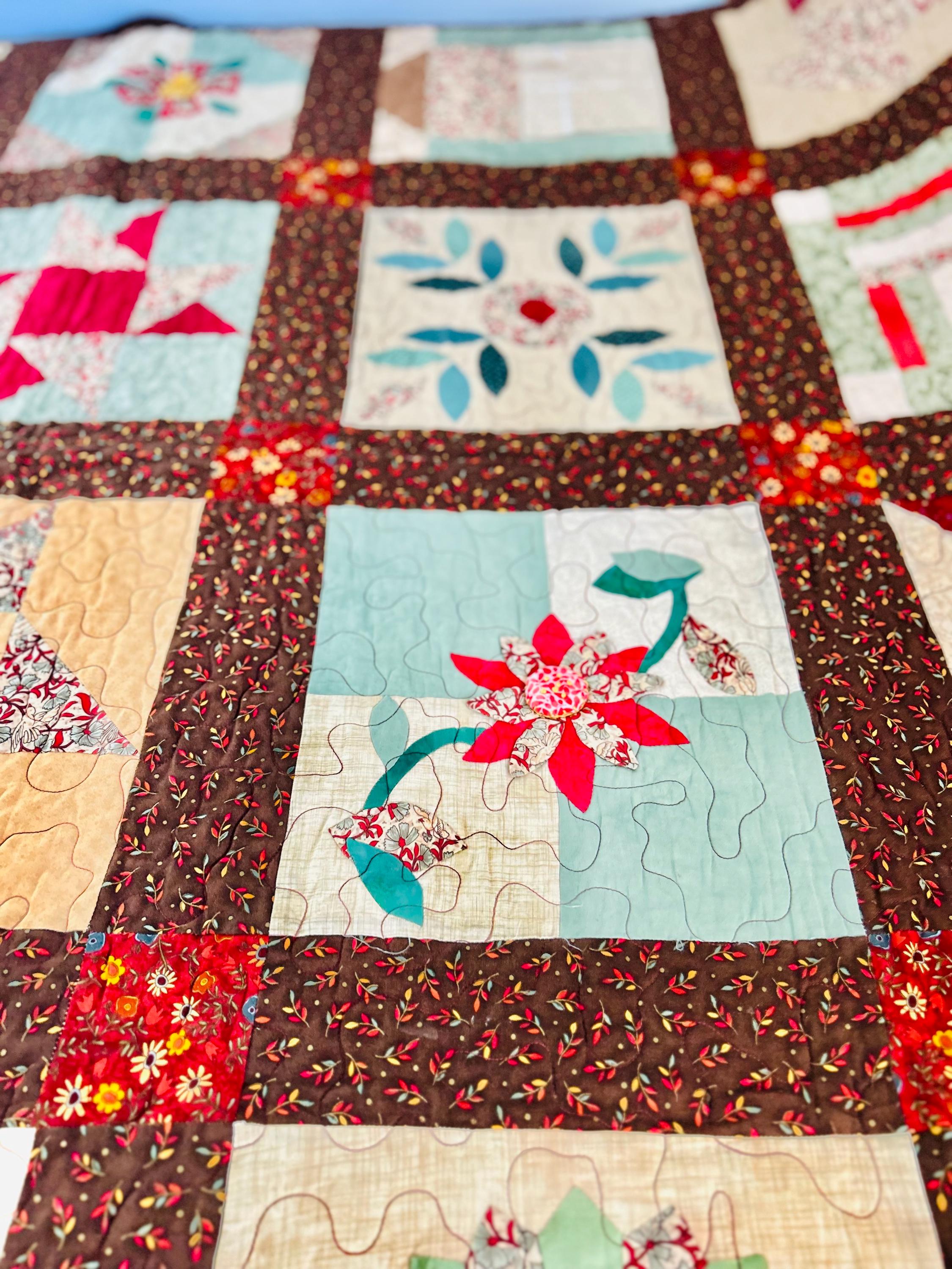 This Album Quilt is circa 2000 and has been beautifully pieced from high-quality cottons and expertly long-arm quilted. The album is made from 20 different blocks with 20 different designs and includes stuffed applique work in the applique flower blocks.