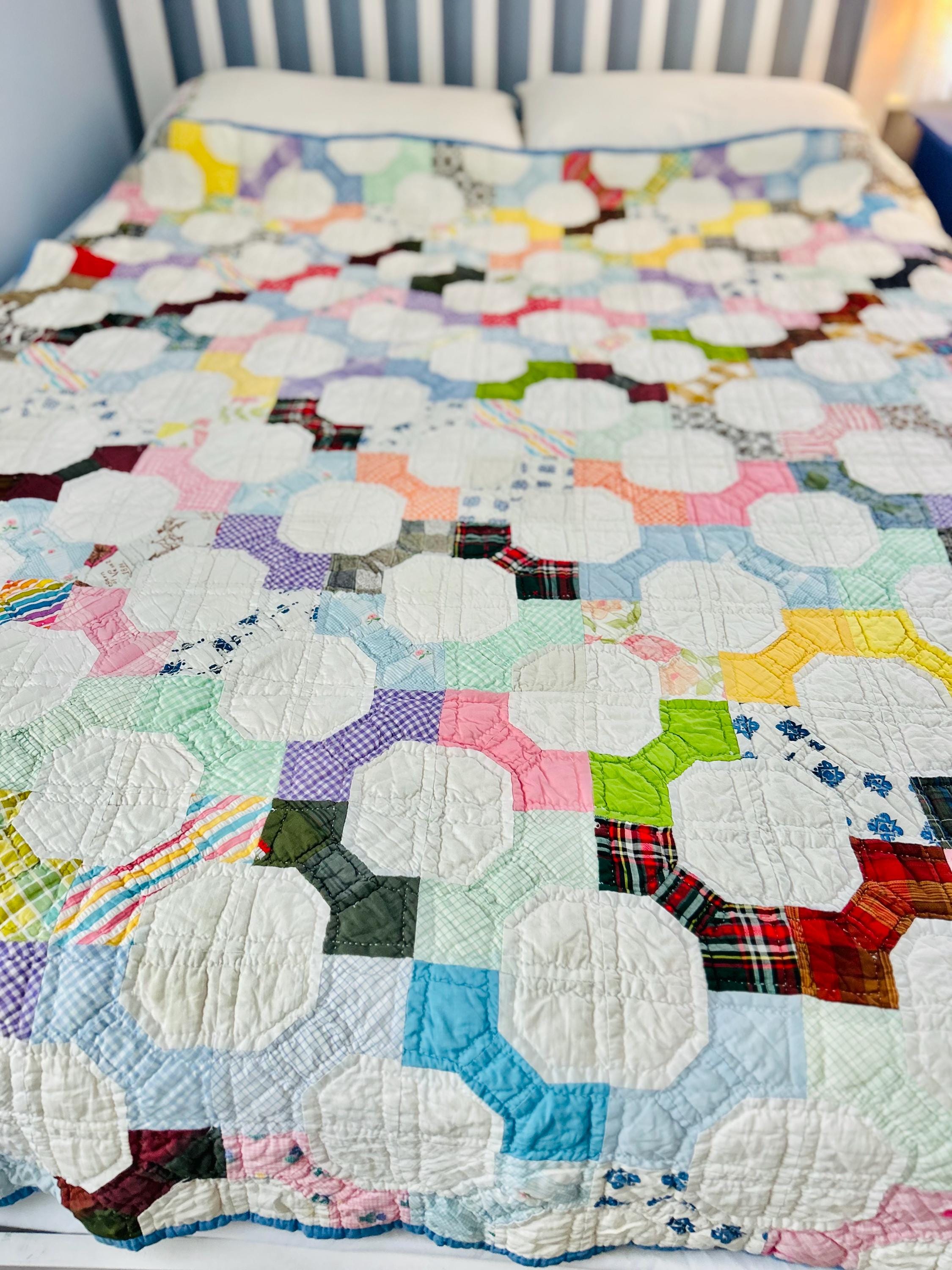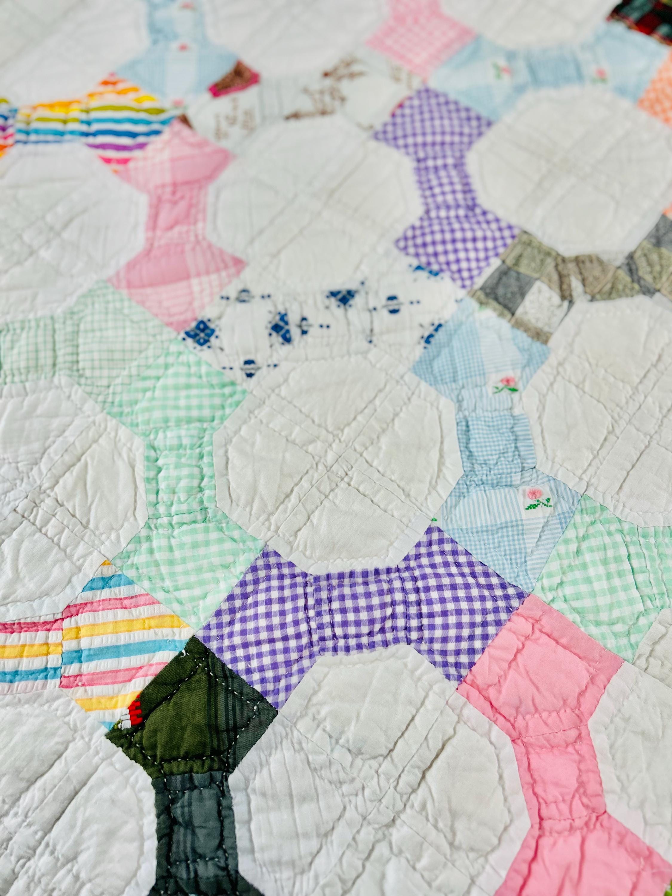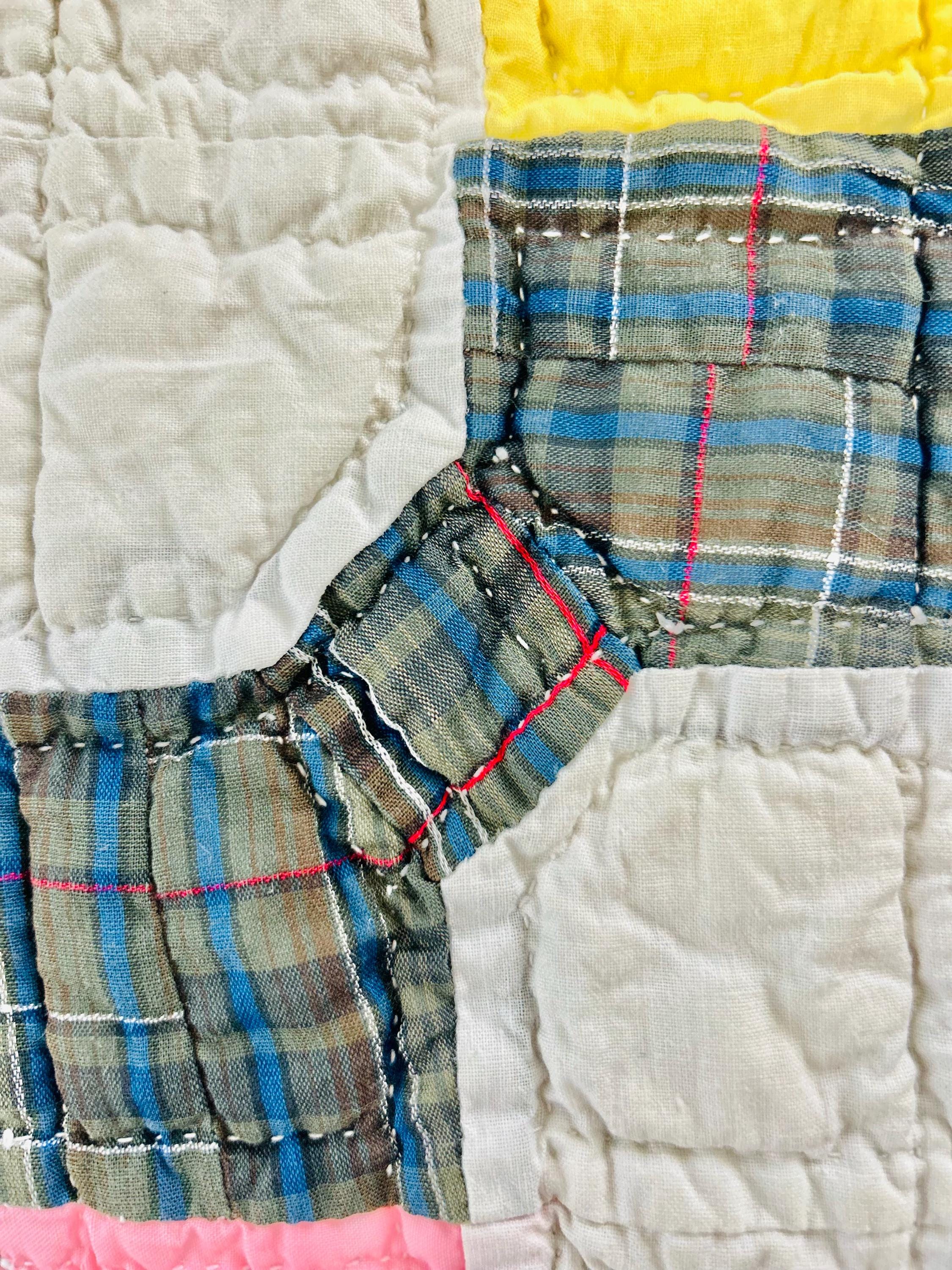 This Bowtie Quilt, circa 1930s, has been hand-stitched and hand-quilted in outlines of the patchwork.