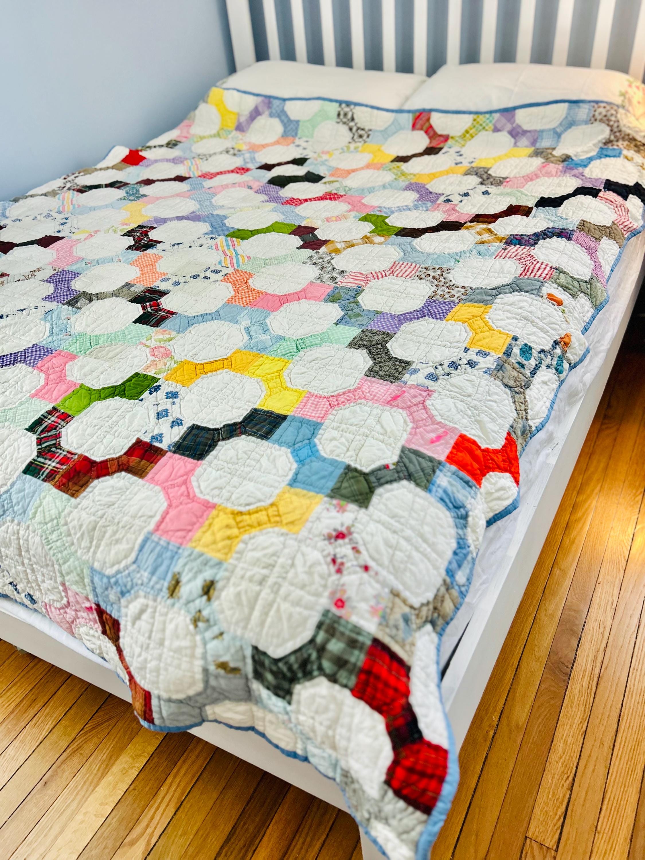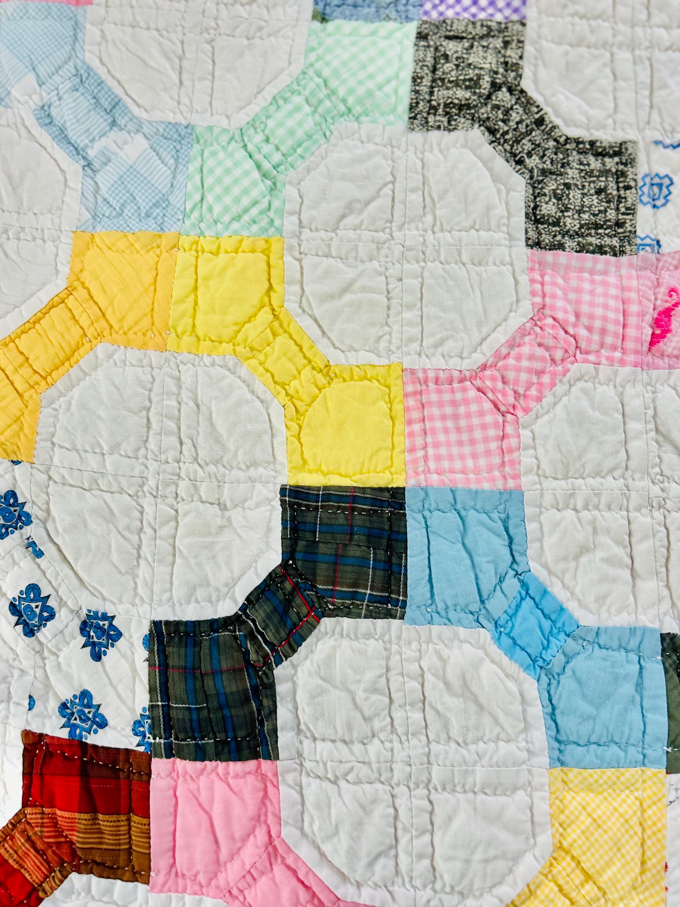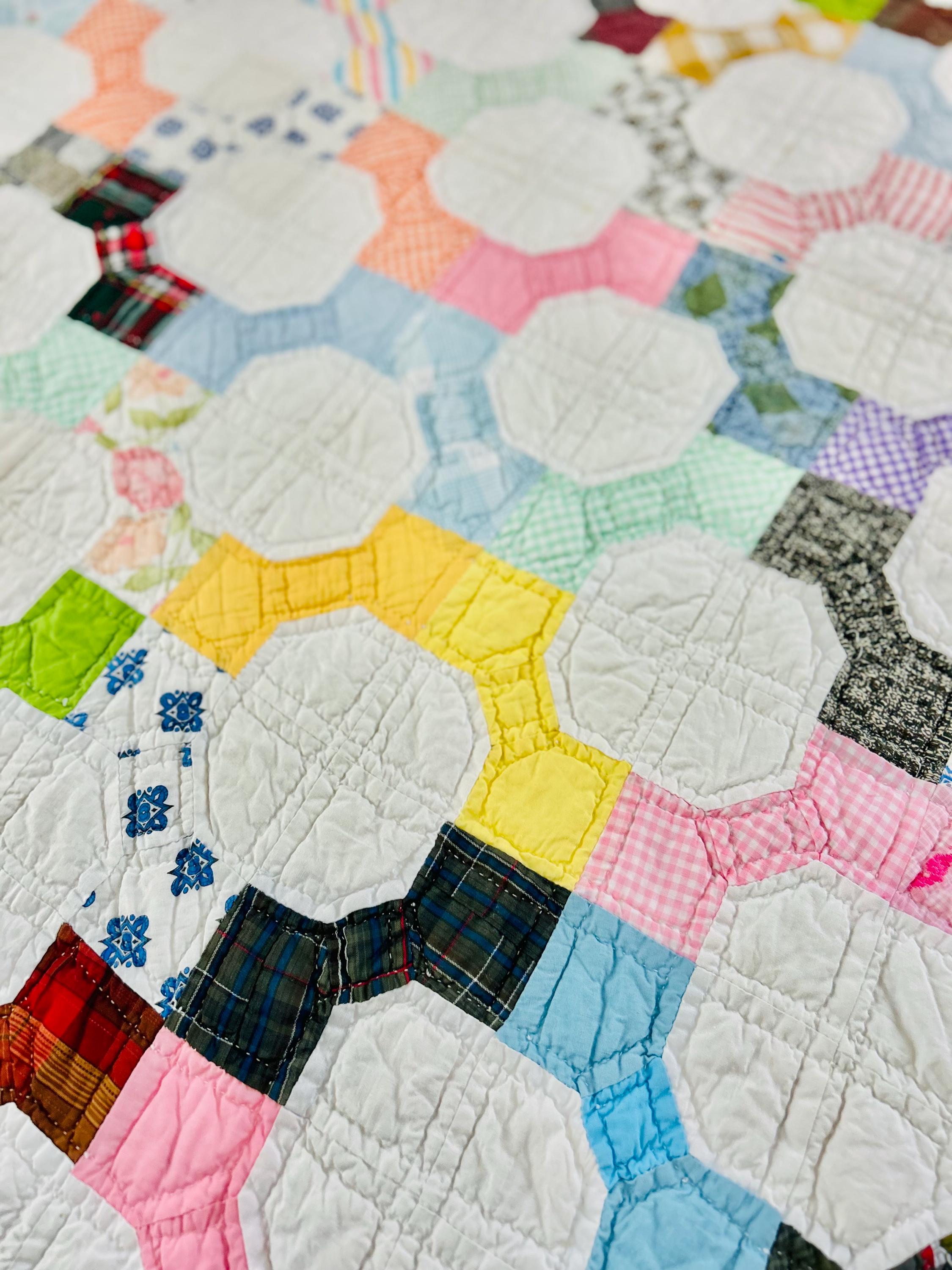 This Bowtie Quilt, circa 1930s, has been hand-stitched and hand-quilted in outlines of the patchwork.